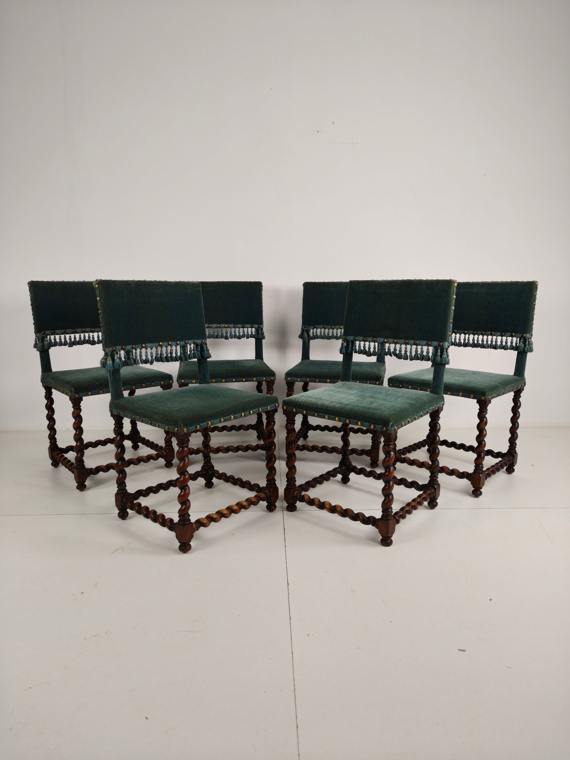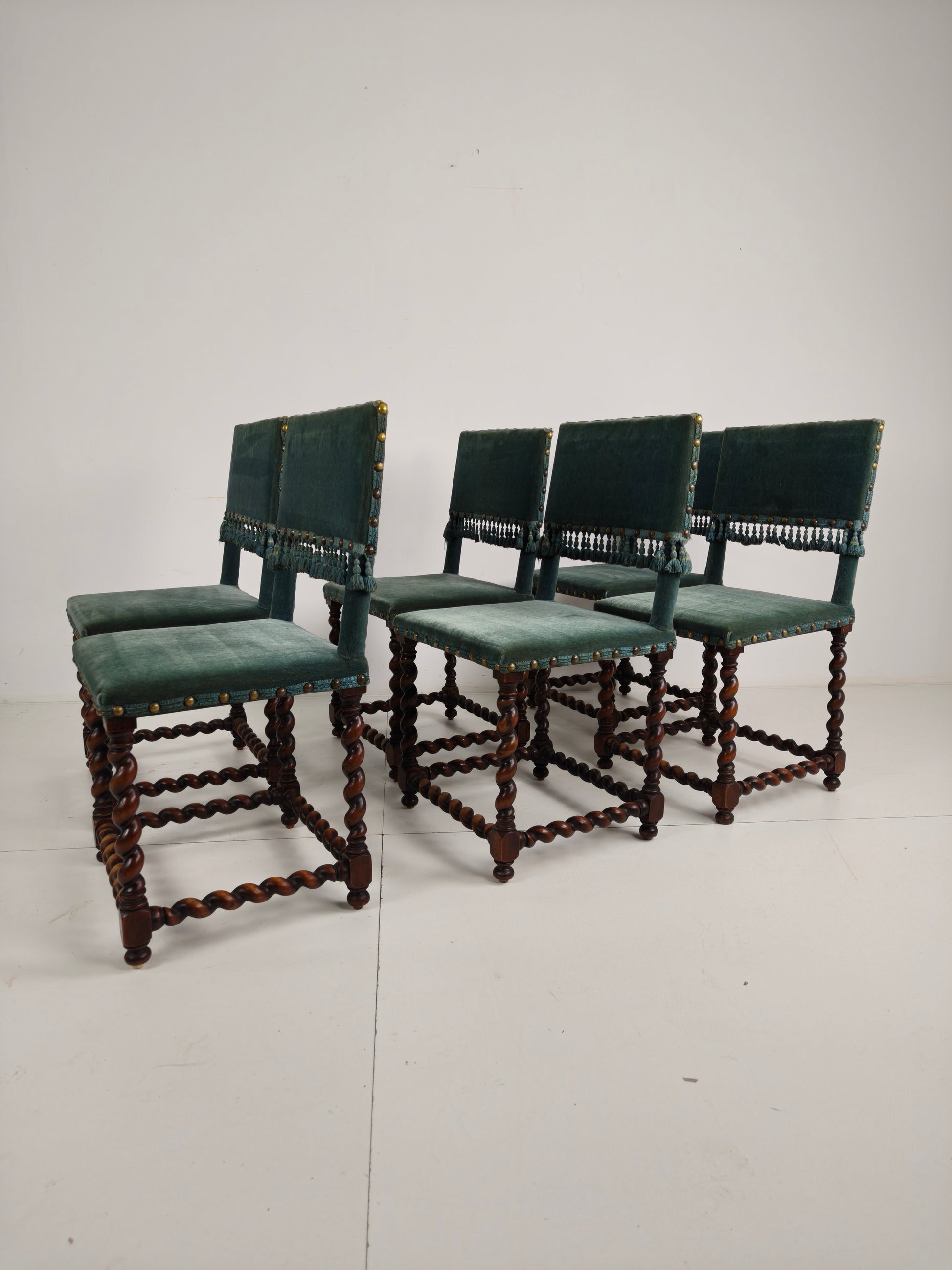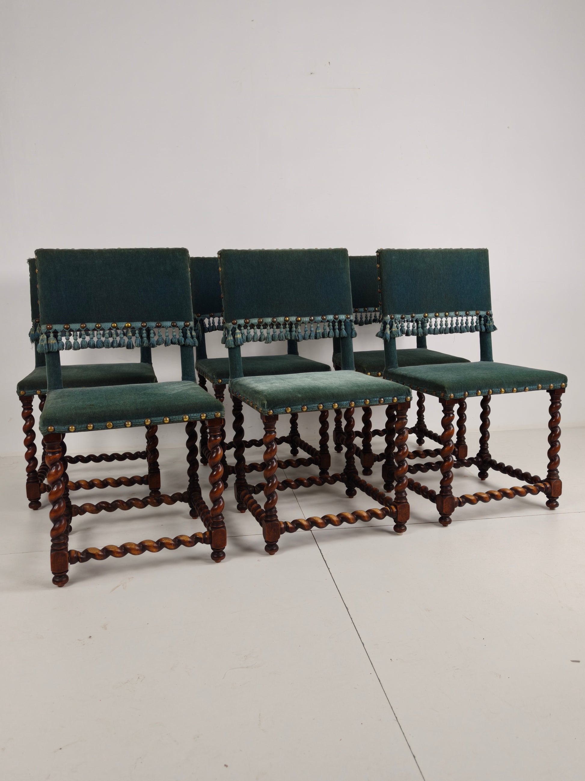 A rare and elegant set of six 18th-century chairs, featuring classic twisted (barley twist) legs and original character. Upholstered in blue fabric with decorative tassels, these chairs are full of period charm.