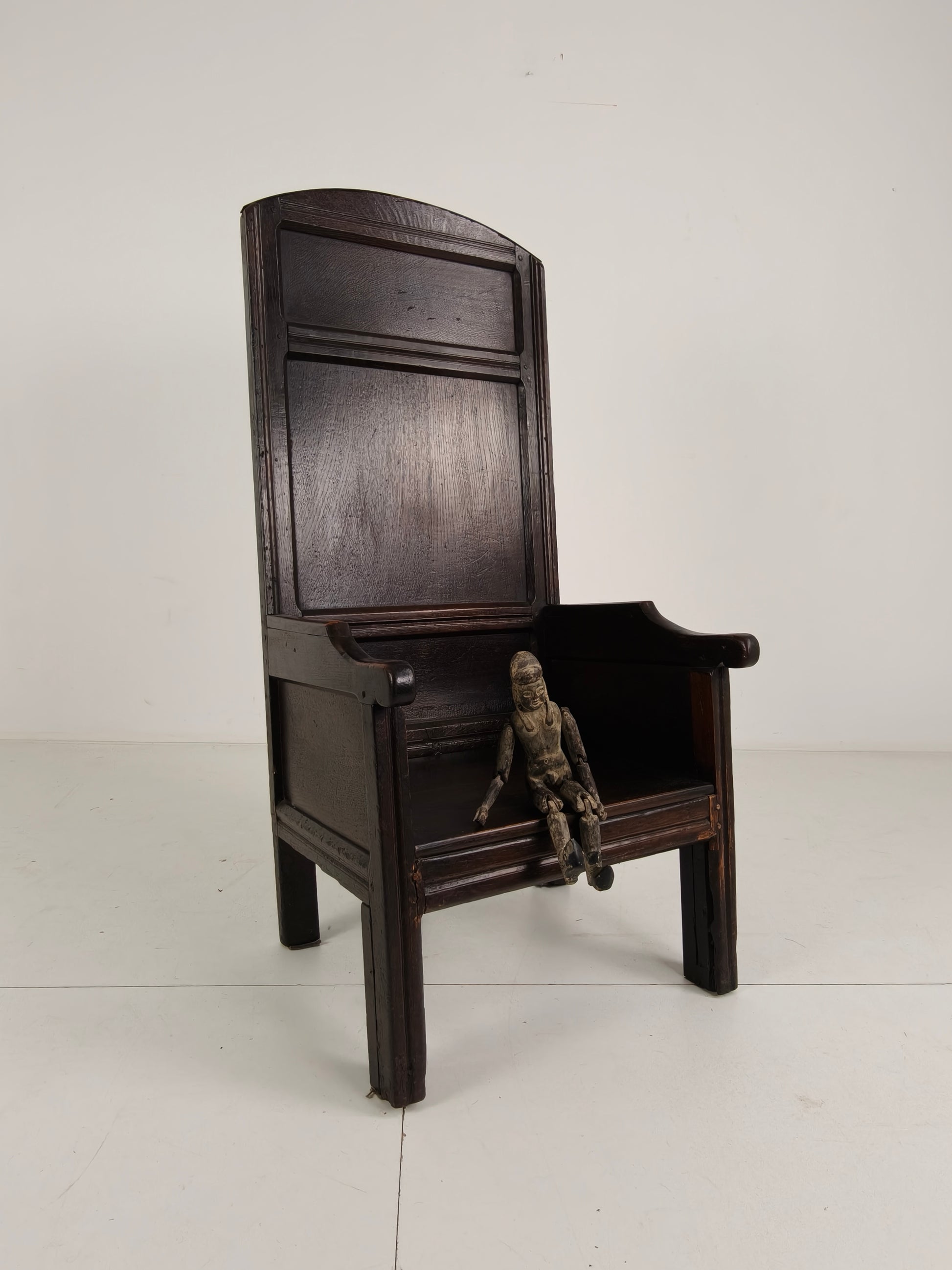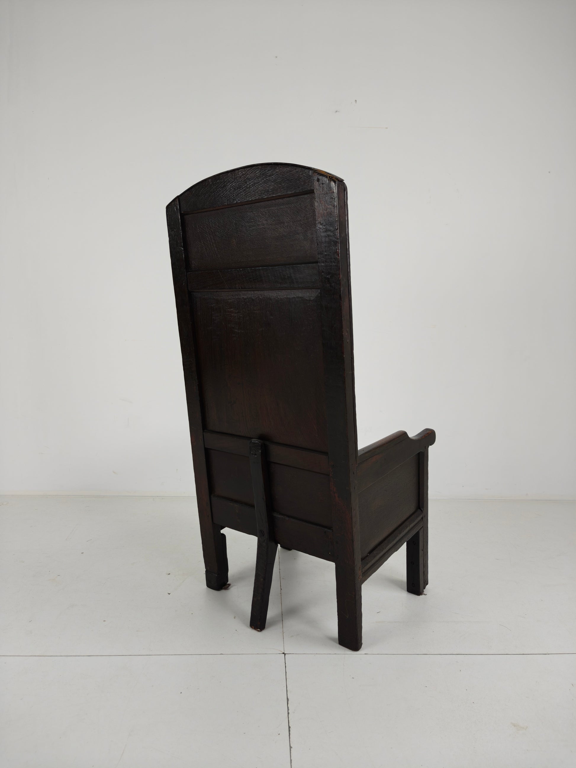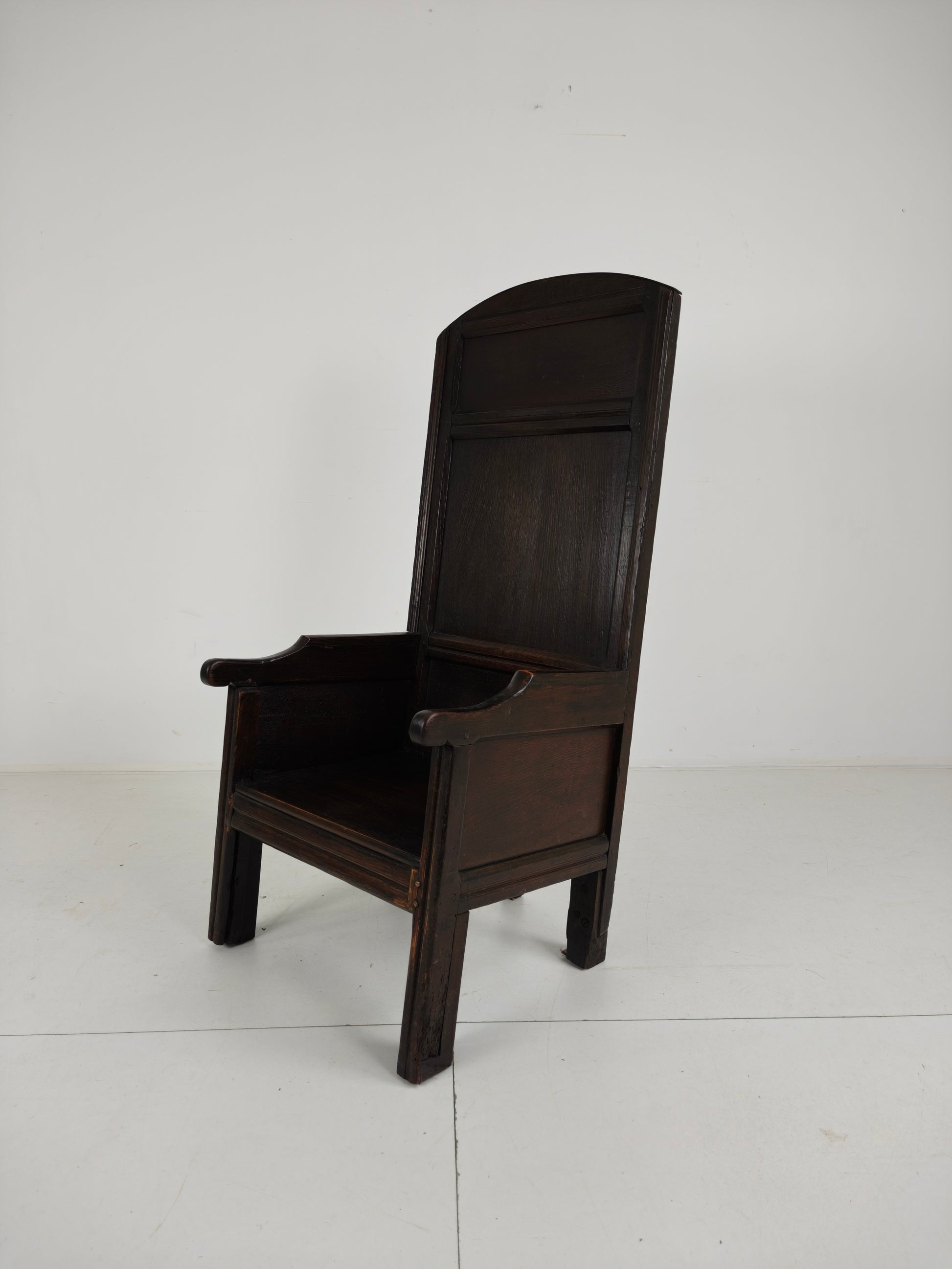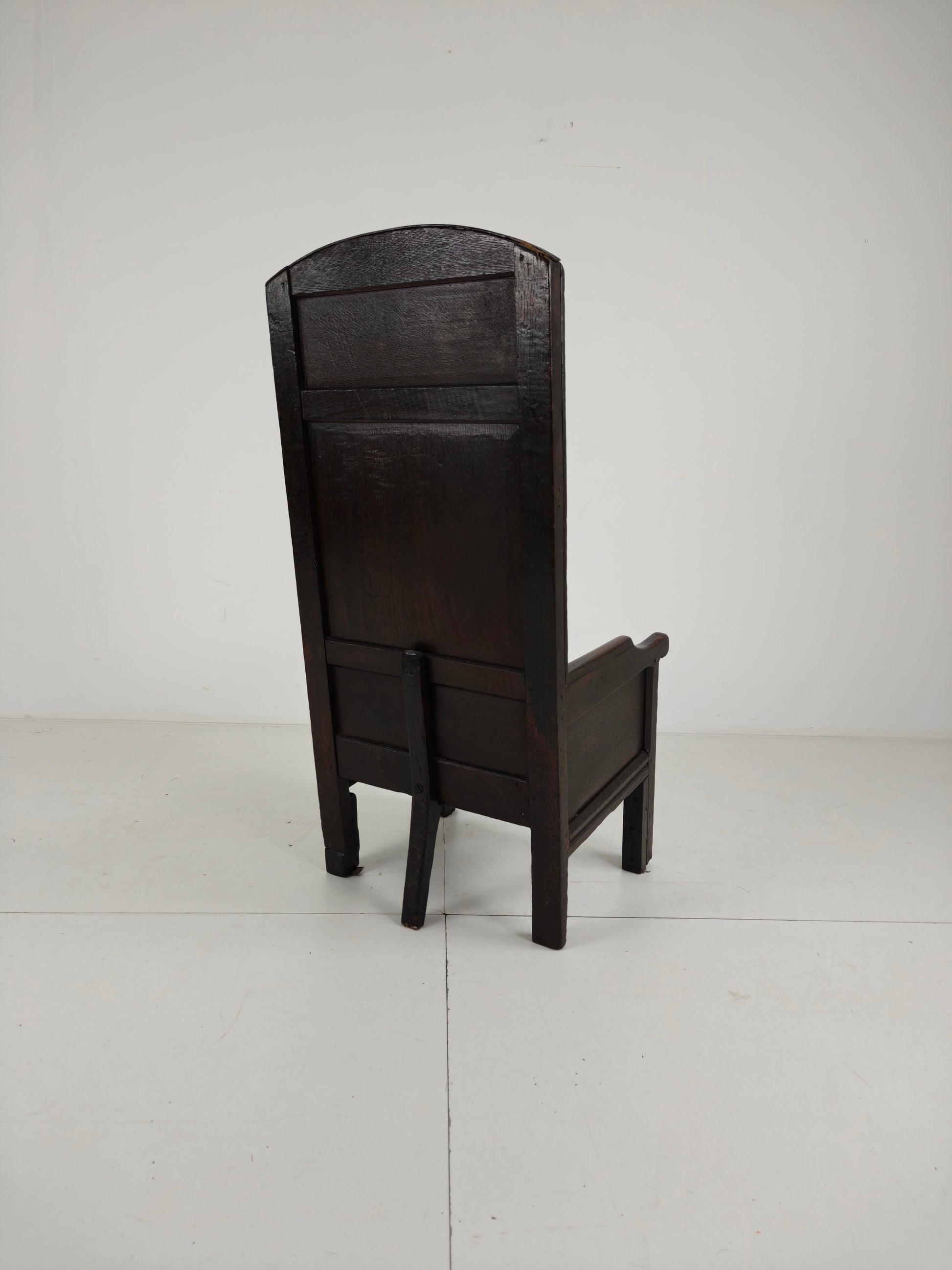 A characterful and well-preserved 18th-century wooden fireplace chair (hearth chair), made in England. This tall, high-back armchair features an uncommon five-leg design for extra stability, making it ideal for use near the hearth. Crafted from solid wood, the chair has developed a rich patina over the centuries, enhancing its authentic appearance.