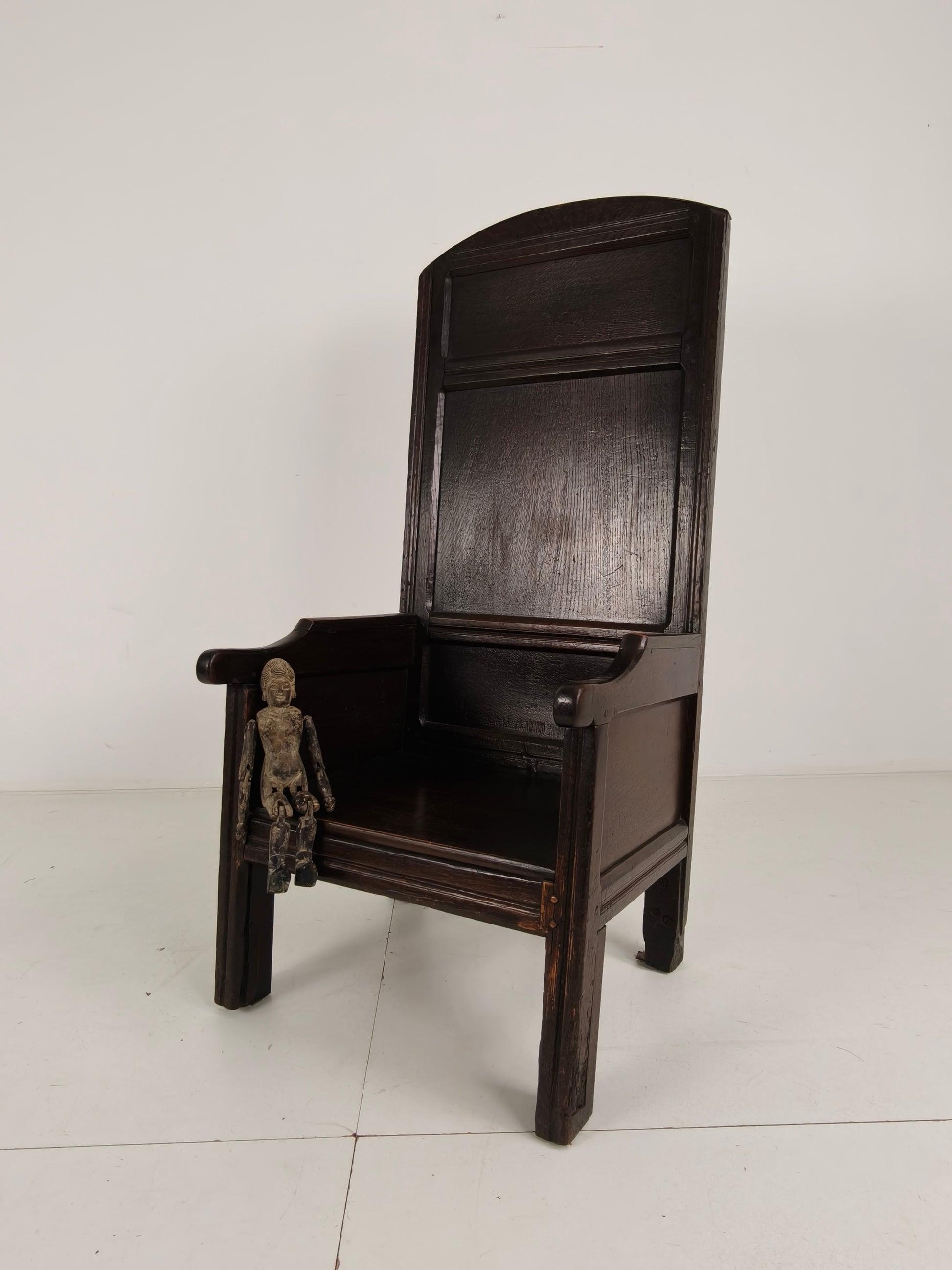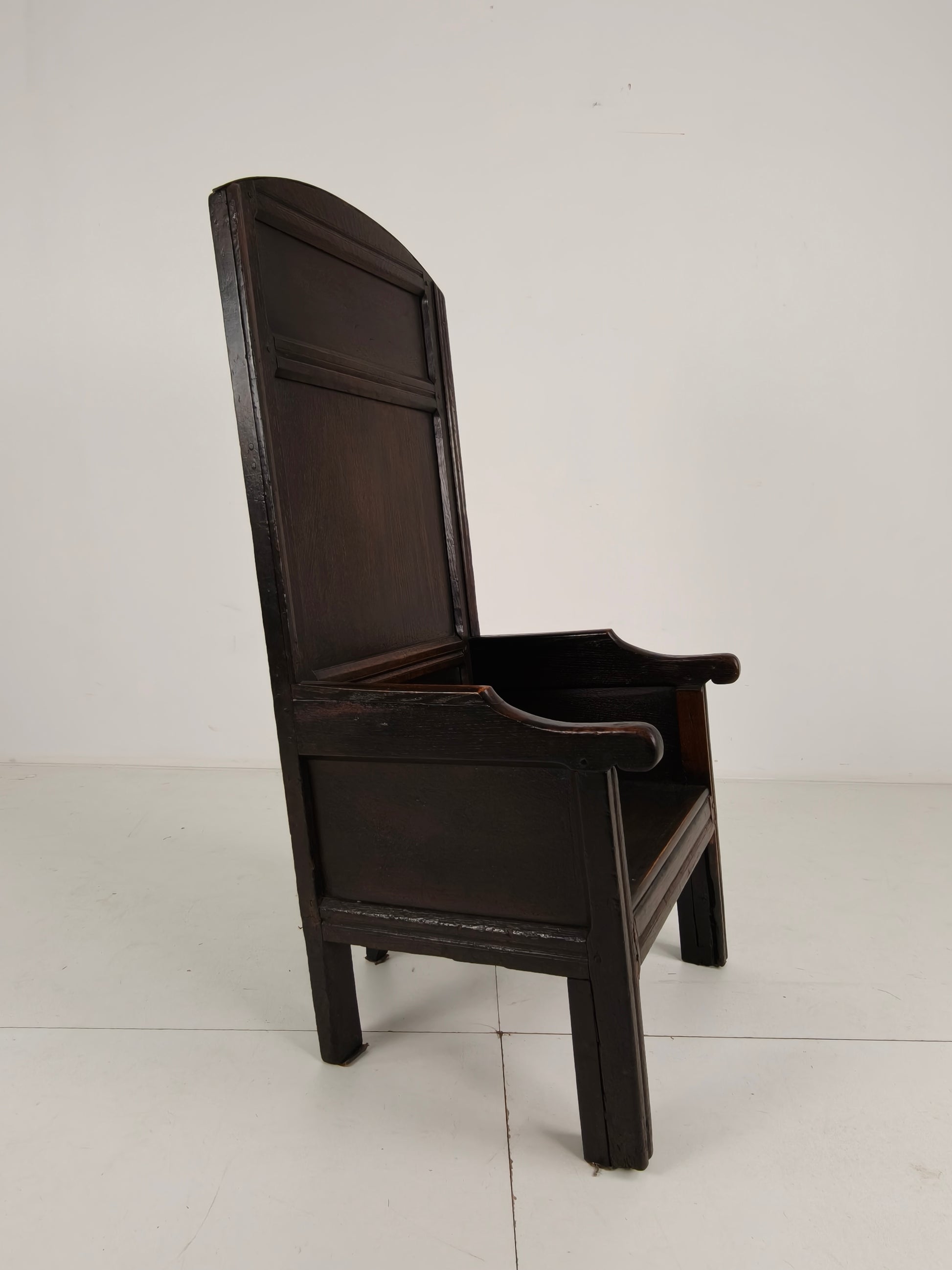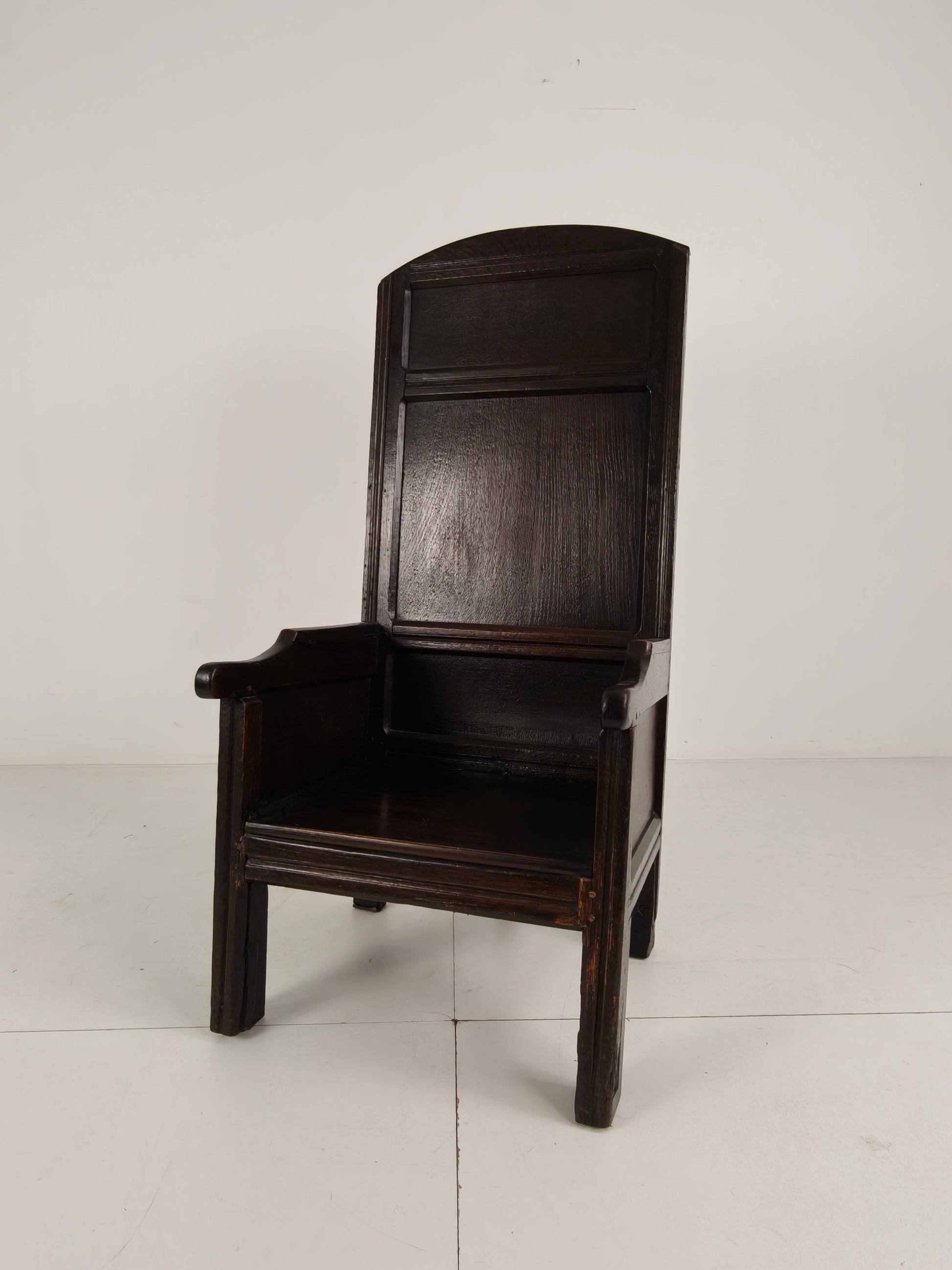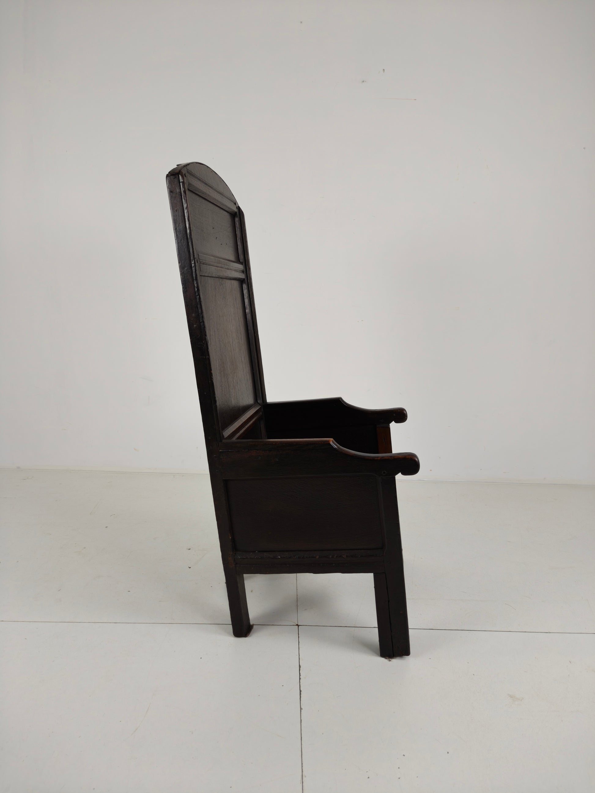 A characterful and well-preserved 18th-century wooden fireplace chair (hearth chair), made in England. This tall, high-back armchair features an uncommon five-leg design for extra stability, making it ideal for use near the hearth. Crafted from solid wood, the chair has developed a rich patina over the centuries, enhancing its authentic appearance.