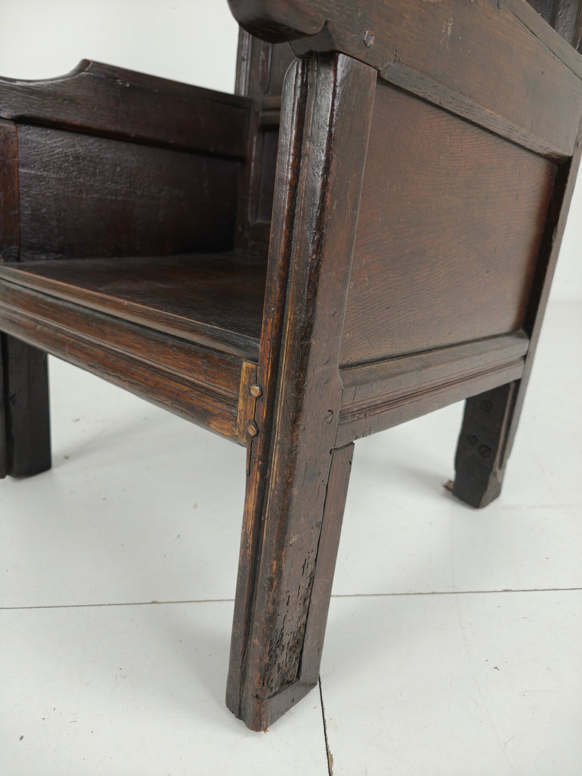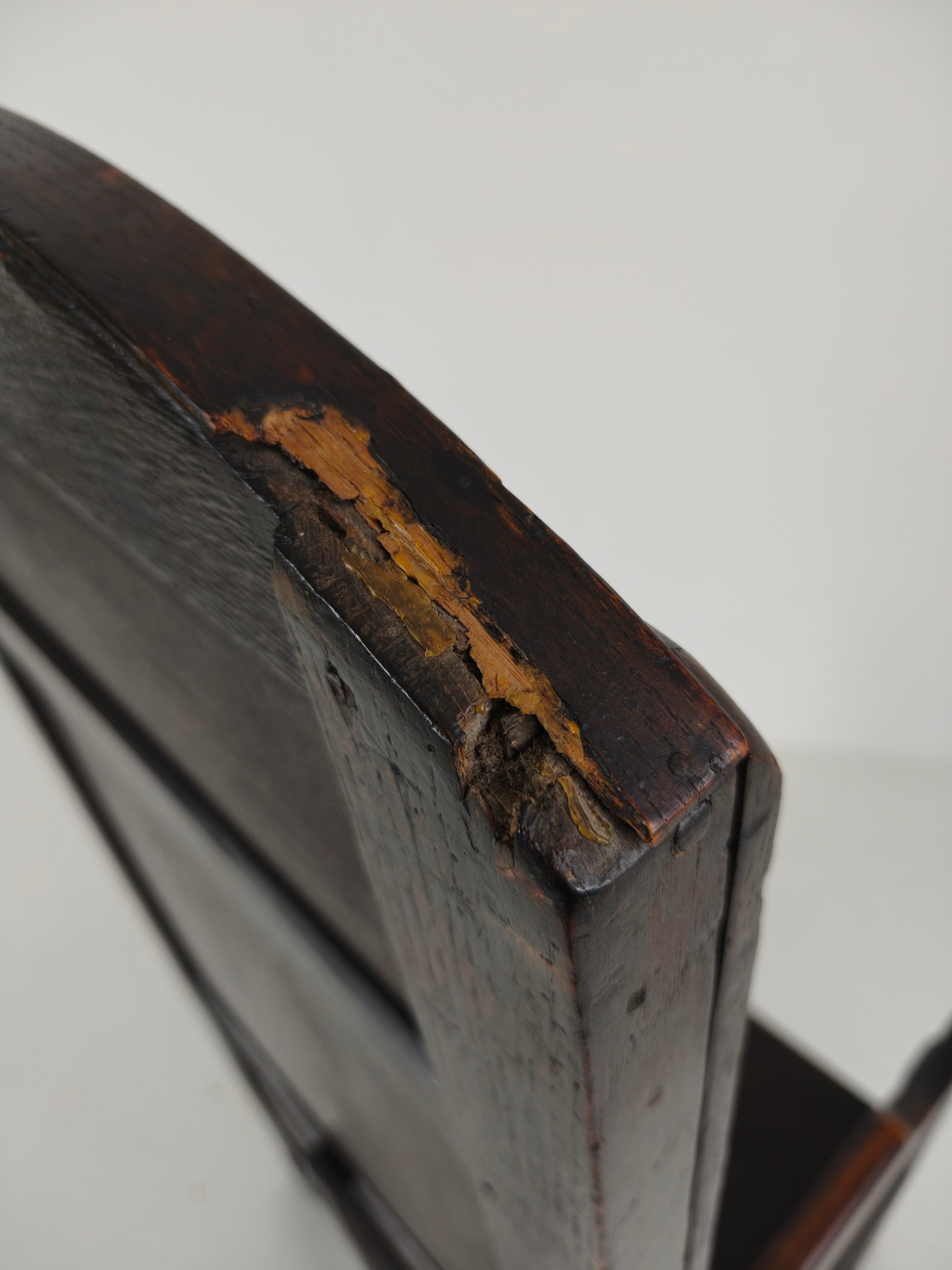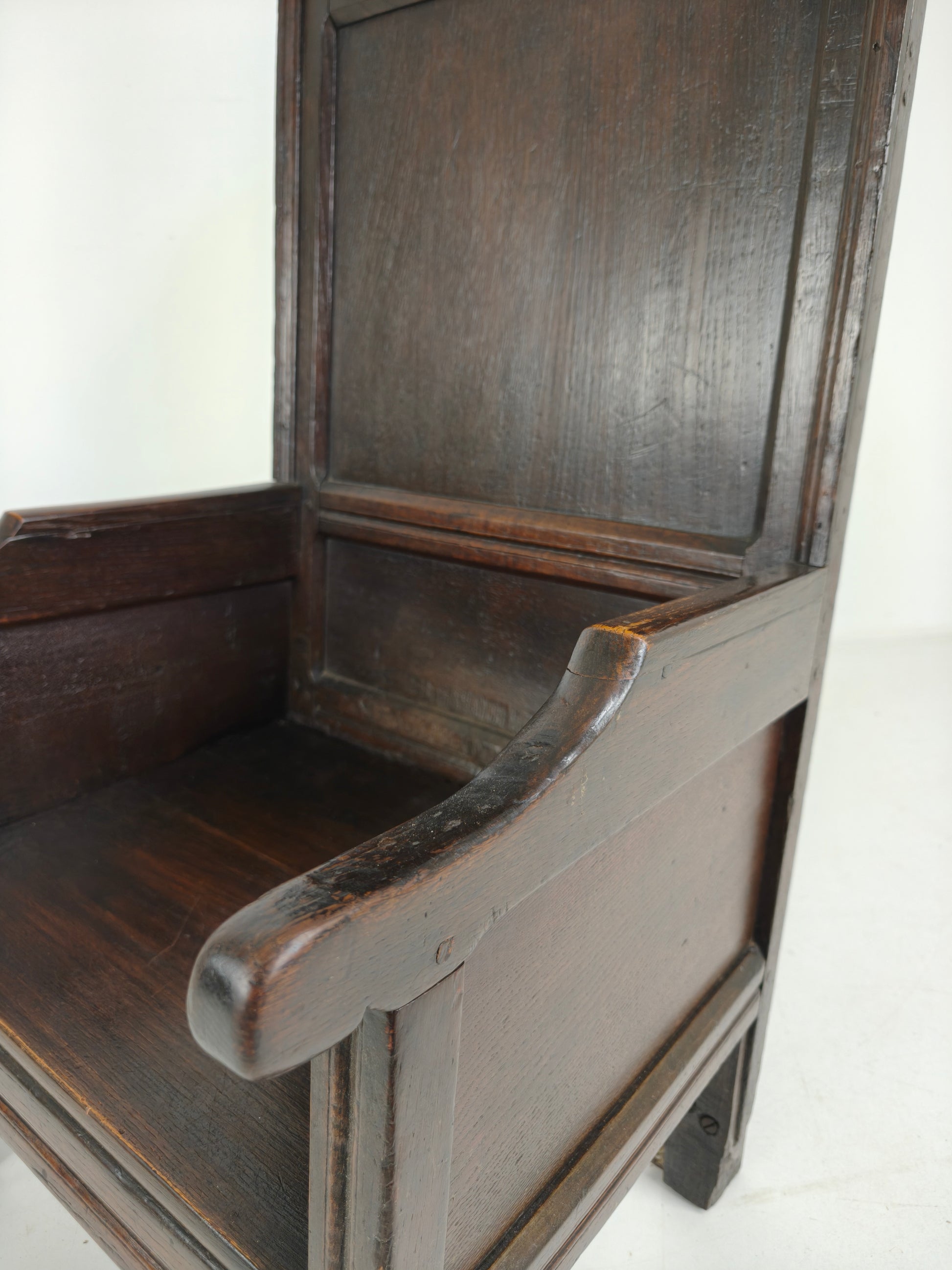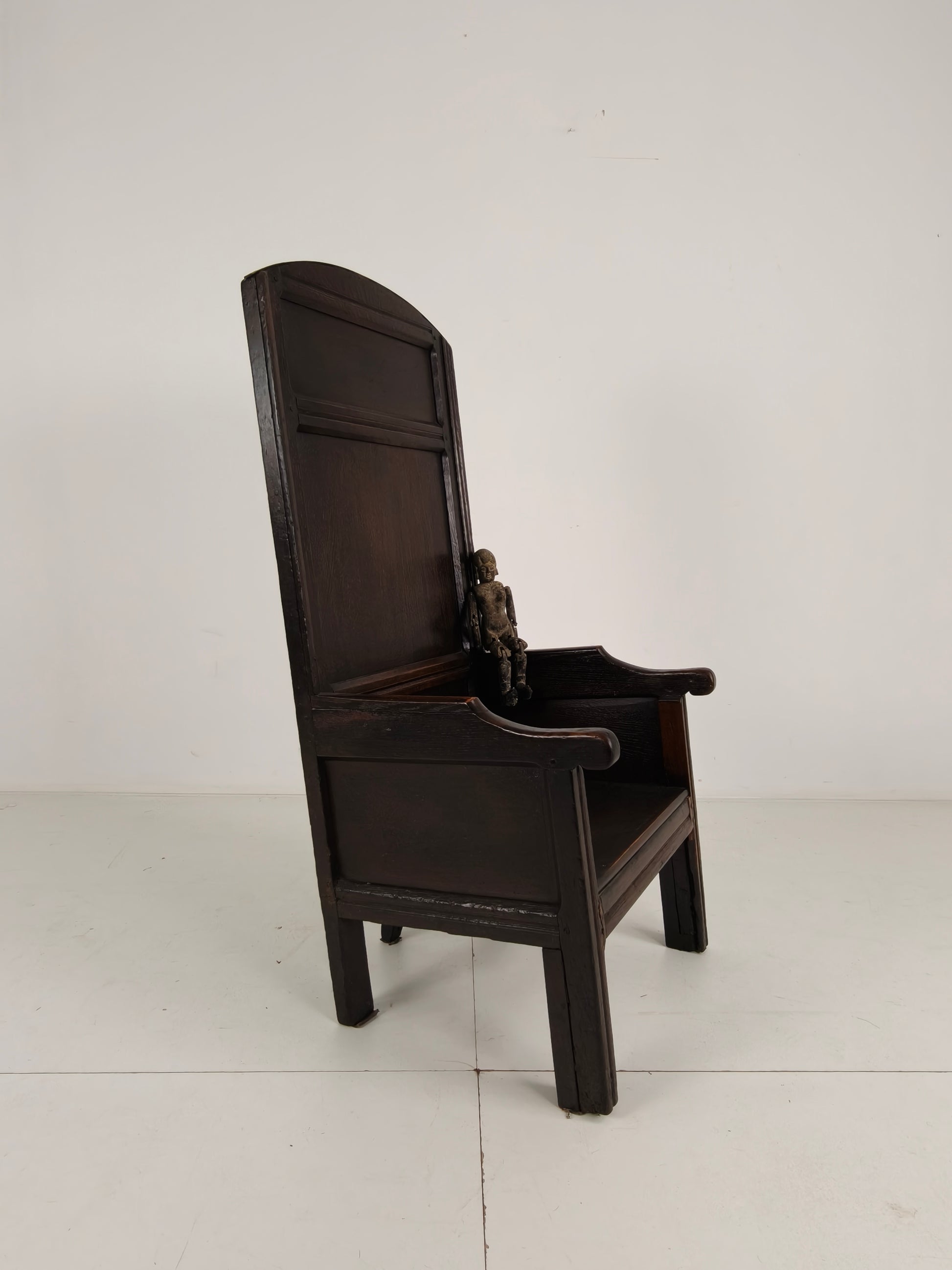 A characterful and well-preserved 18th-century wooden fireplace chair (hearth chair), made in England. This tall, high-back armchair features an uncommon five-leg design for extra stability, making it ideal for use near the hearth. Crafted from solid wood, the chair has developed a rich patina over the centuries, enhancing its authentic appearance.