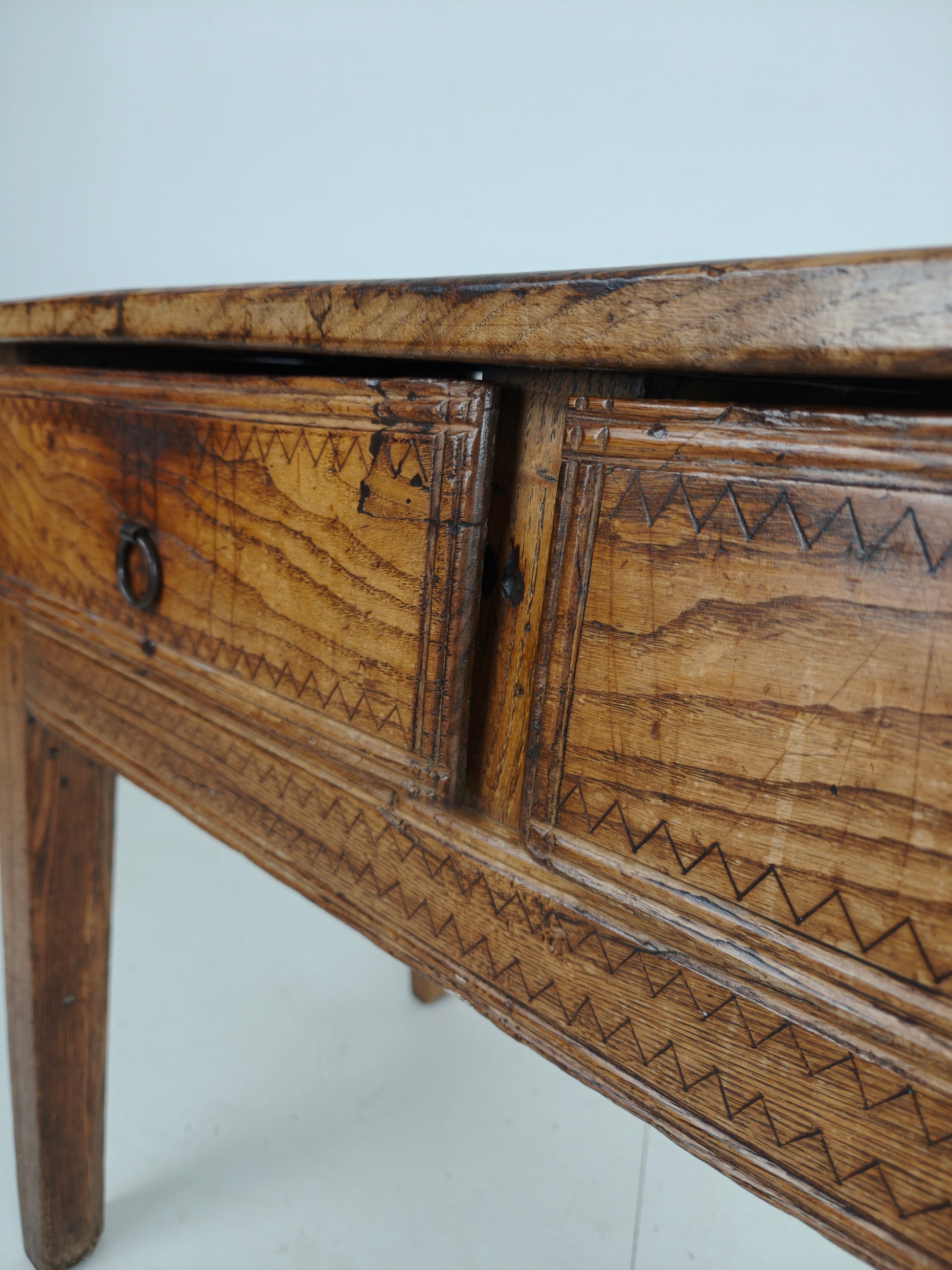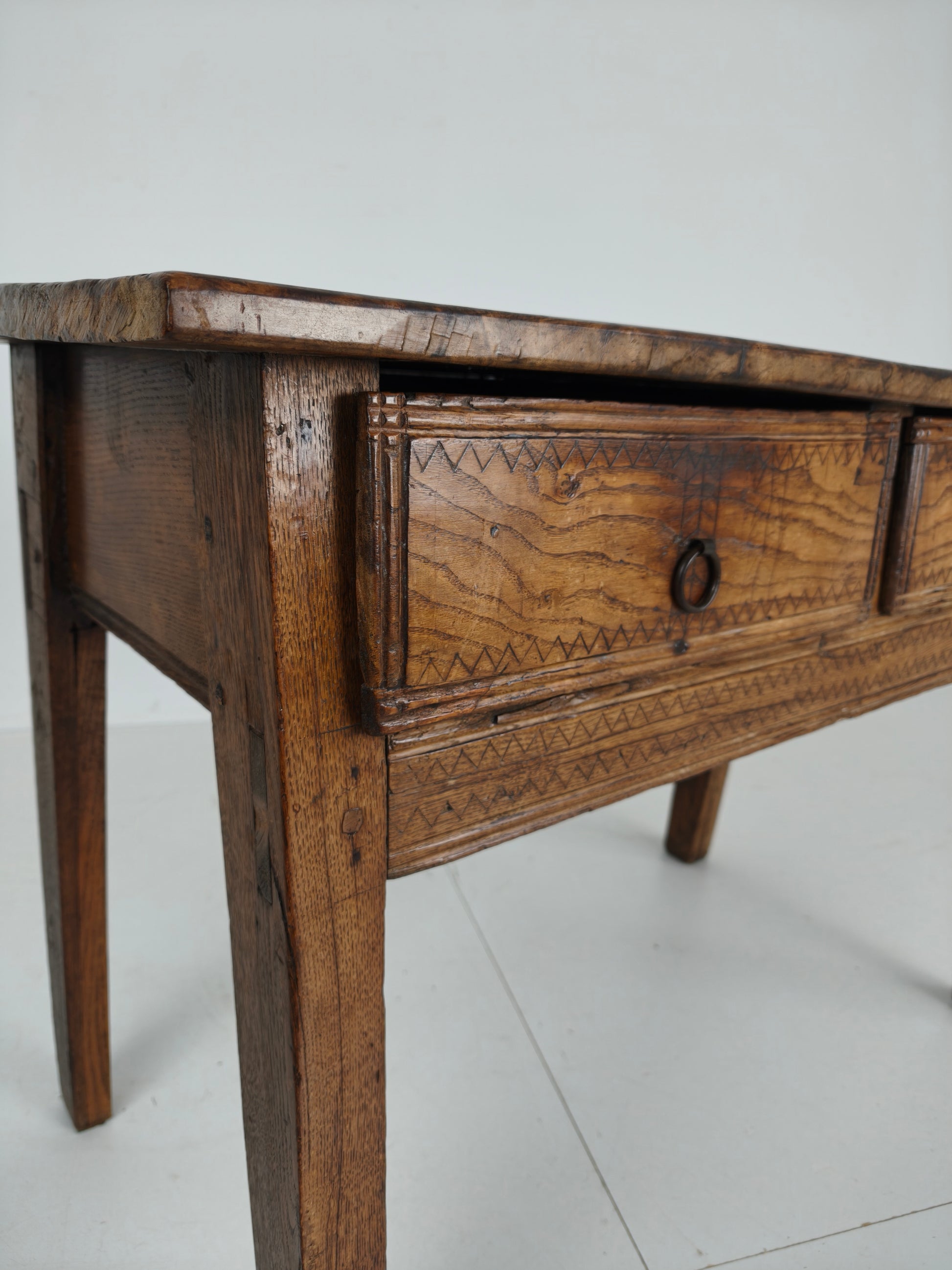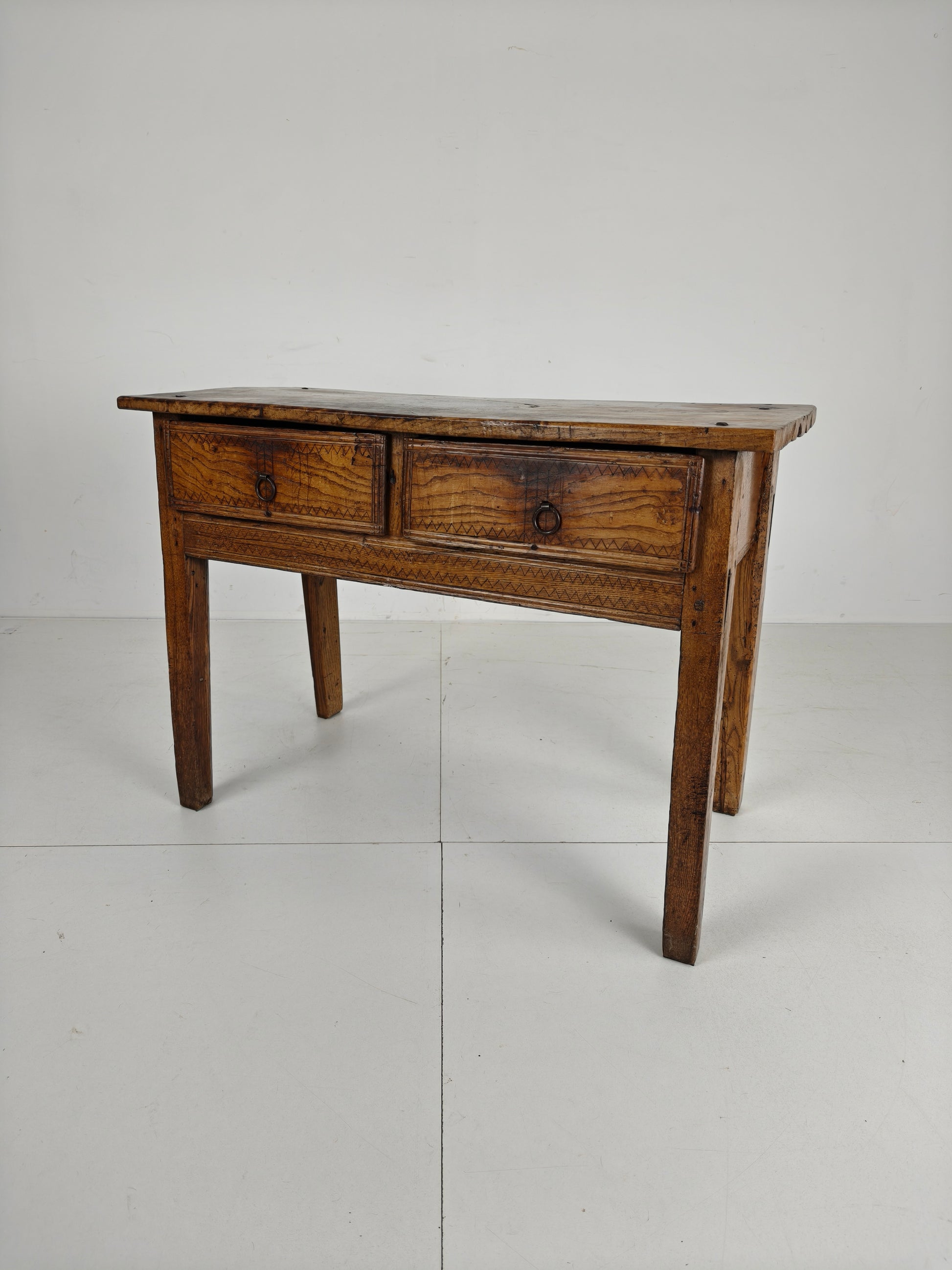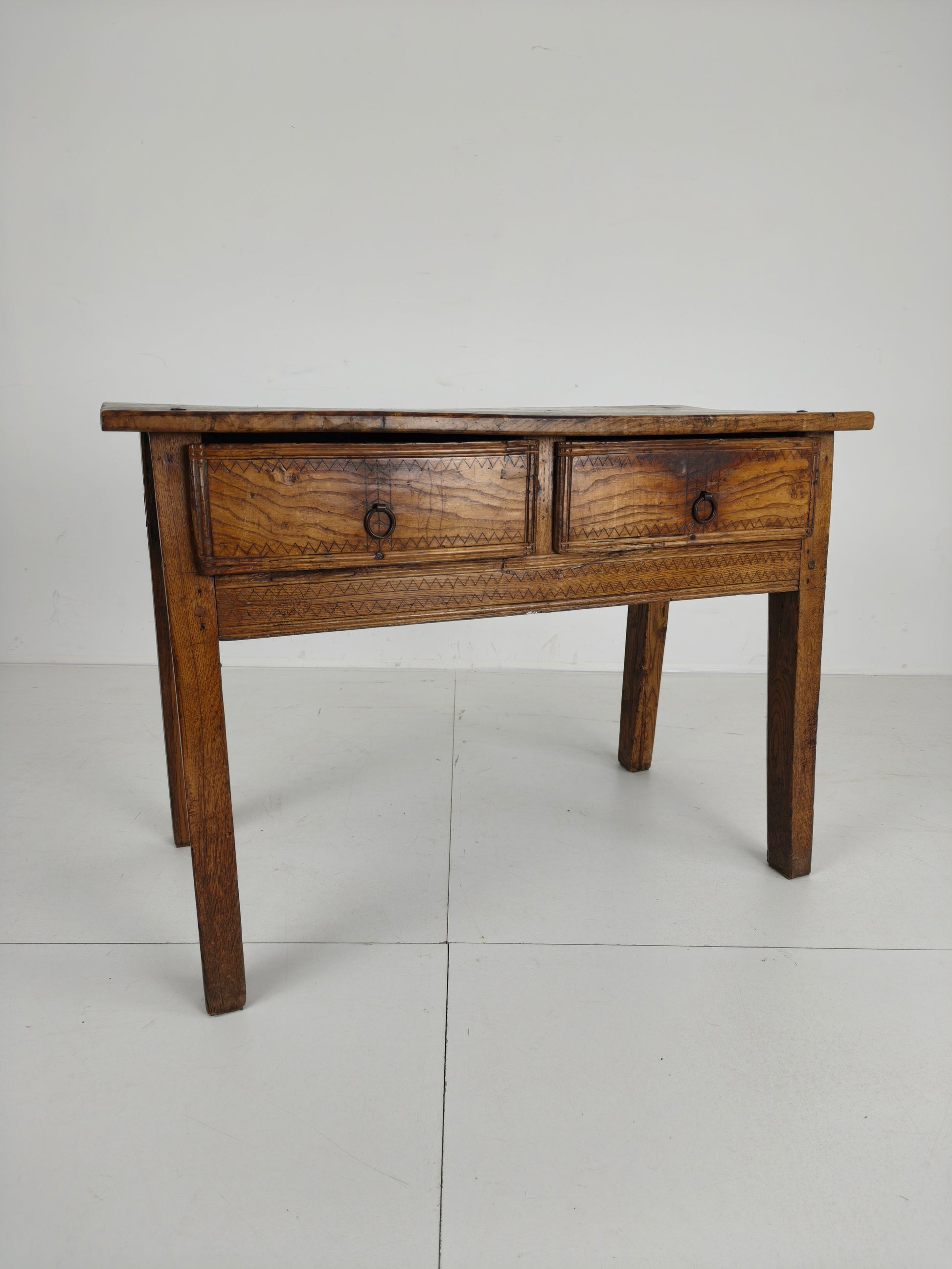 This stunning 18th-century Spanish table/side table boasts a beautiful design, highlighted by the warm tones of chestnut wood and a distinctive zigzag motif. It features three practical and well-functioning drawers, combining elegance with functionality. Signs of use are visible, as shown in the photos, adding to the piece's unique character and charm. Signs of wear consistant with age and use.