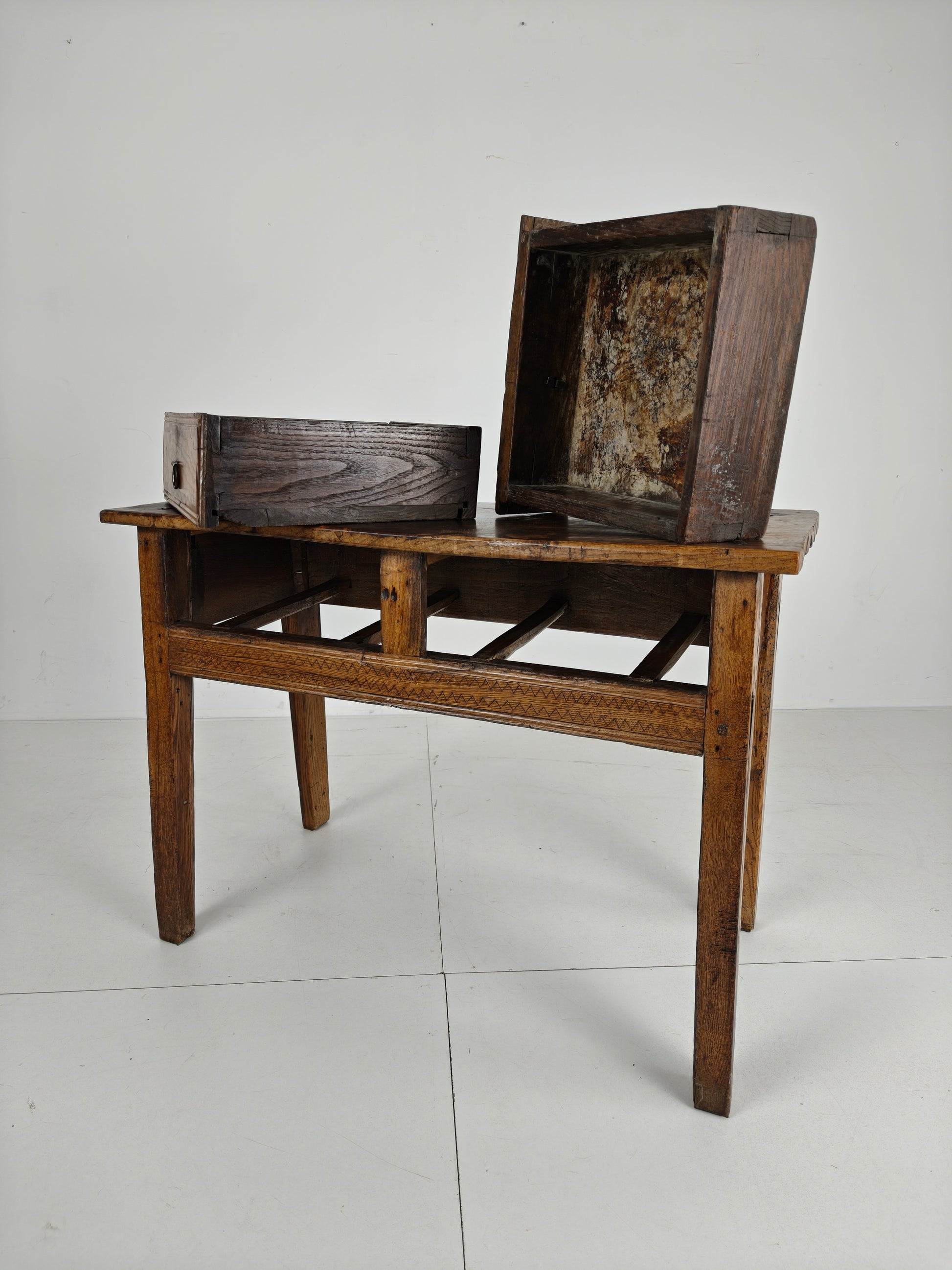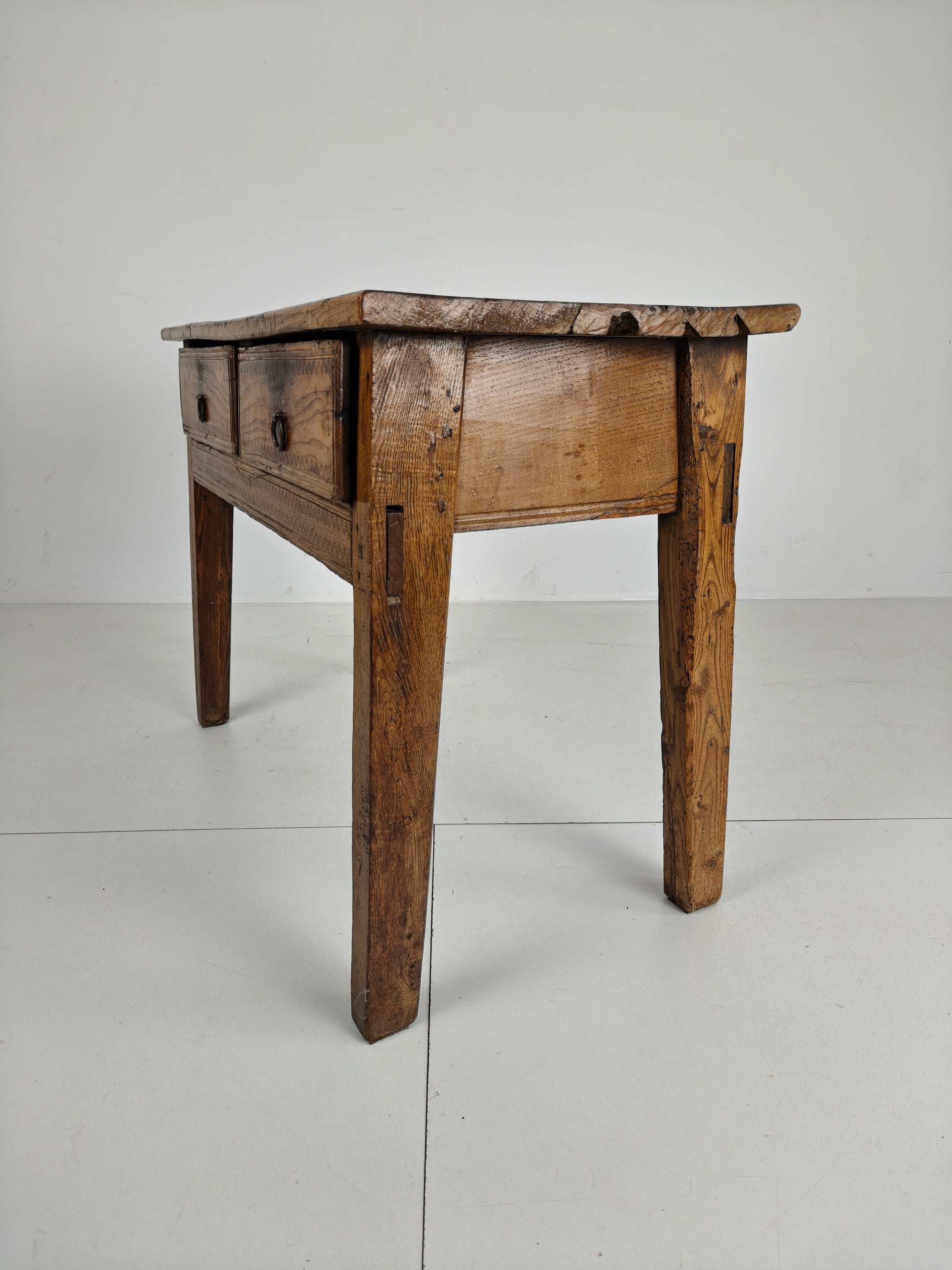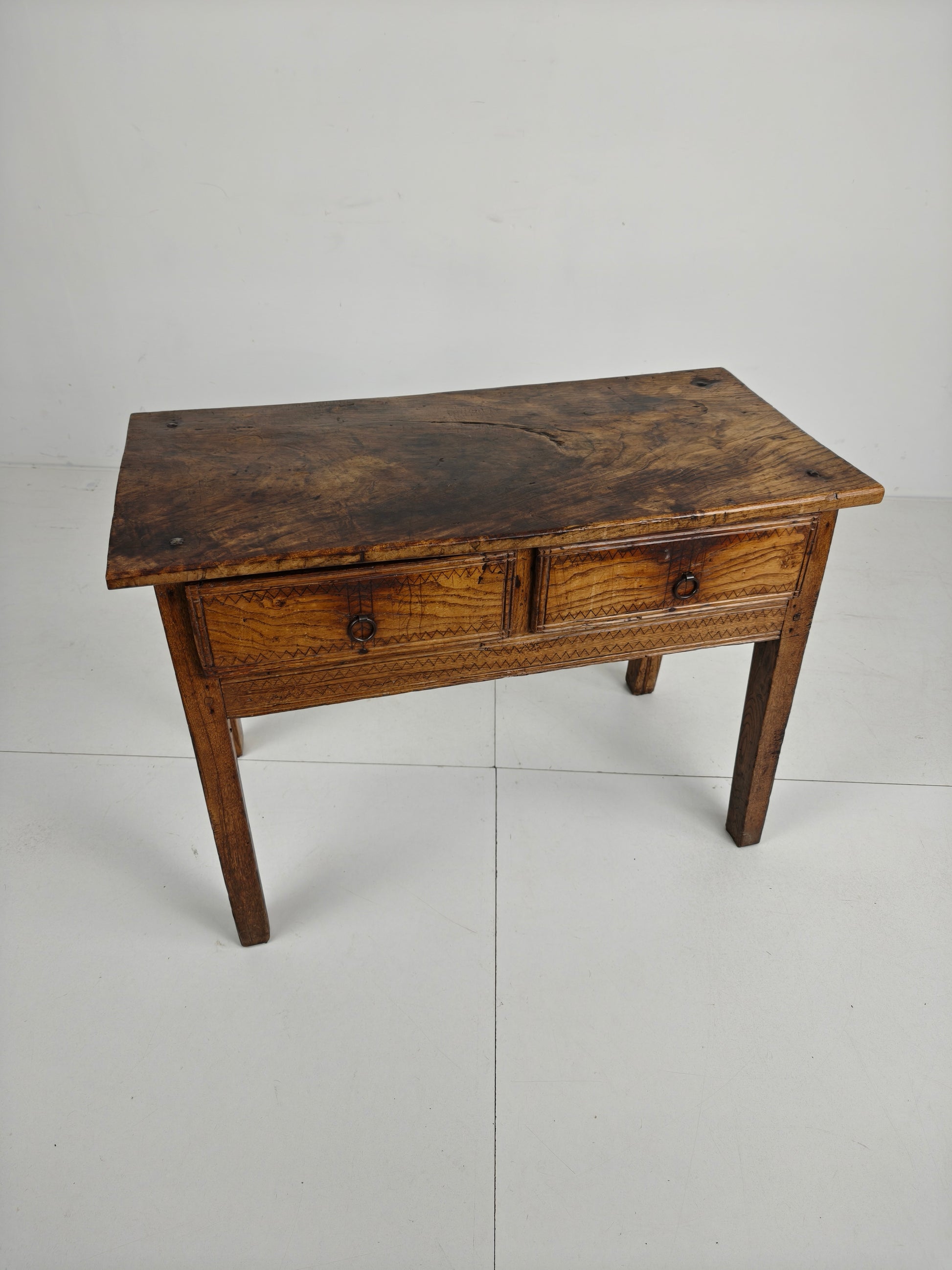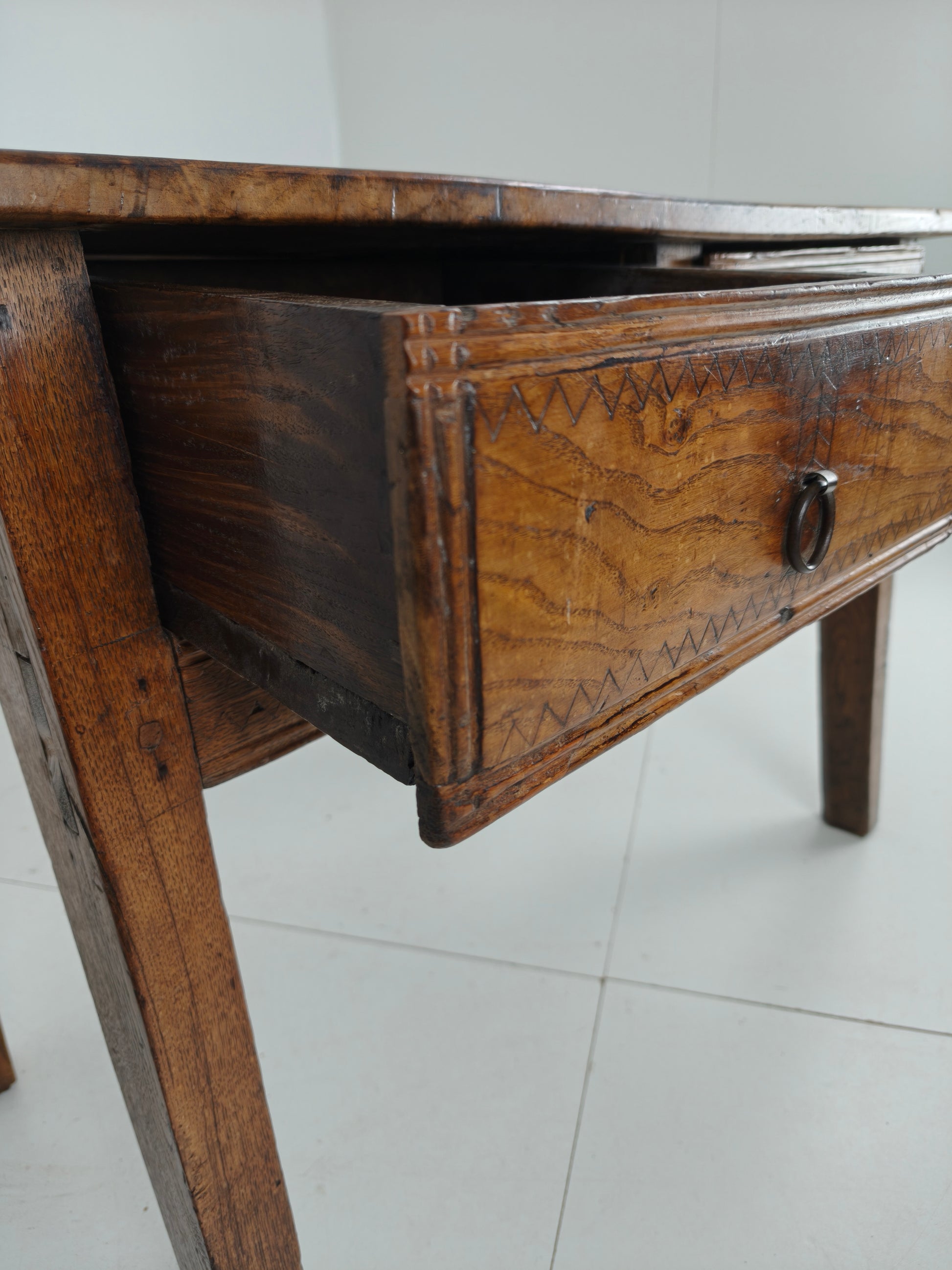 This stunning 18th-century Spanish table/side table boasts a beautiful design, highlighted by the warm tones of chestnut wood and a distinctive zigzag motif. It features three practical and well-functioning drawers, combining elegance with functionality. Signs of use are visible, as shown in the photos, adding to the piece's unique character and charm. Signs of wear consistant with age and use.