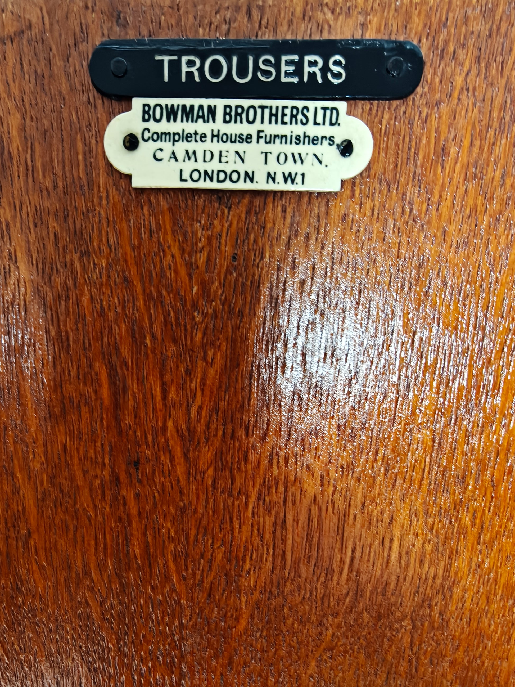 A highly distinctive light oak Compactom gentleman’s wardrobe in an exceptionally practical size. Crafted in the 1920s, this wardrobe was retailed by Bowman Brothers and designed to provide a well-organized storage solution for a gentleman’s attire.