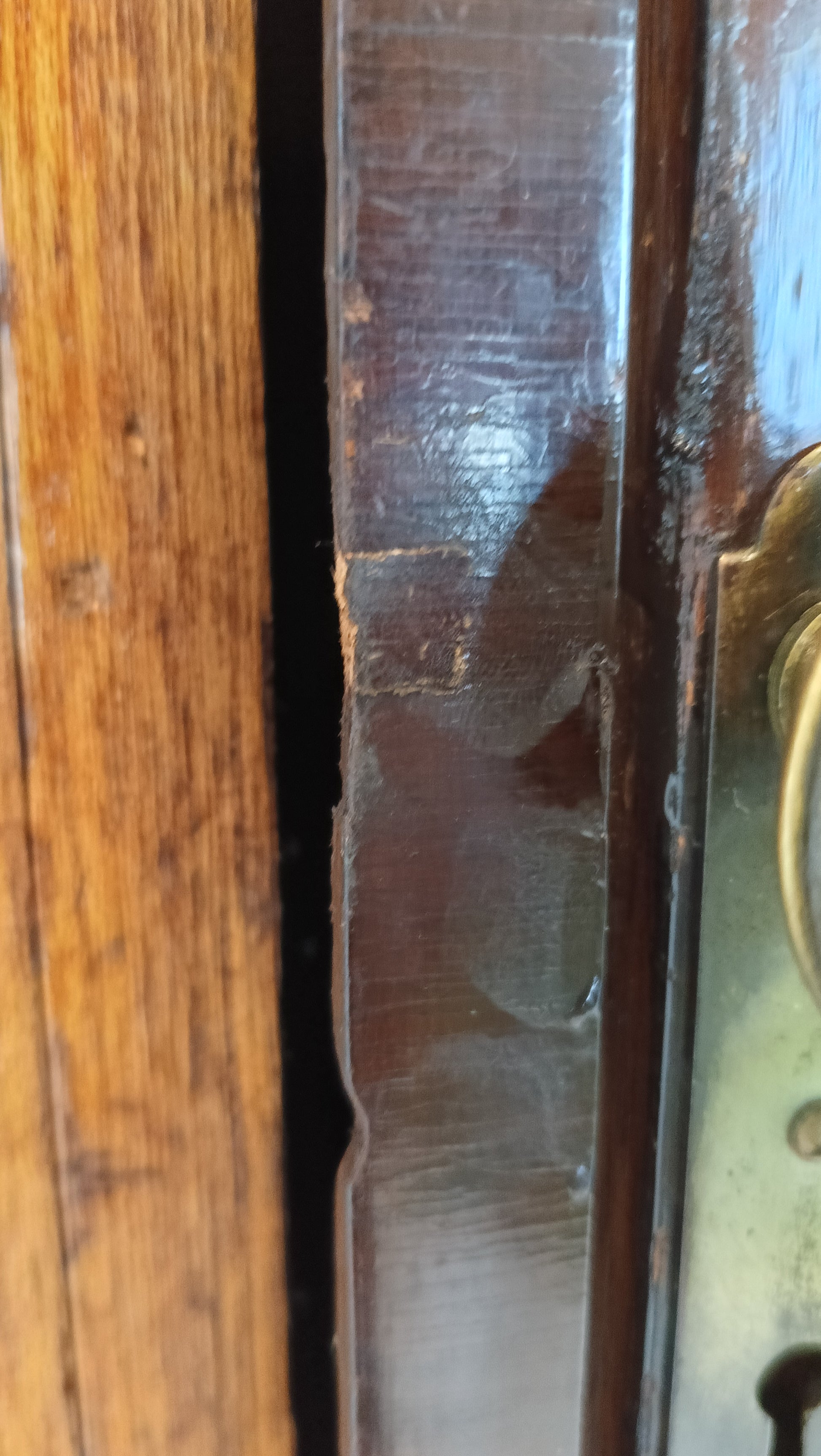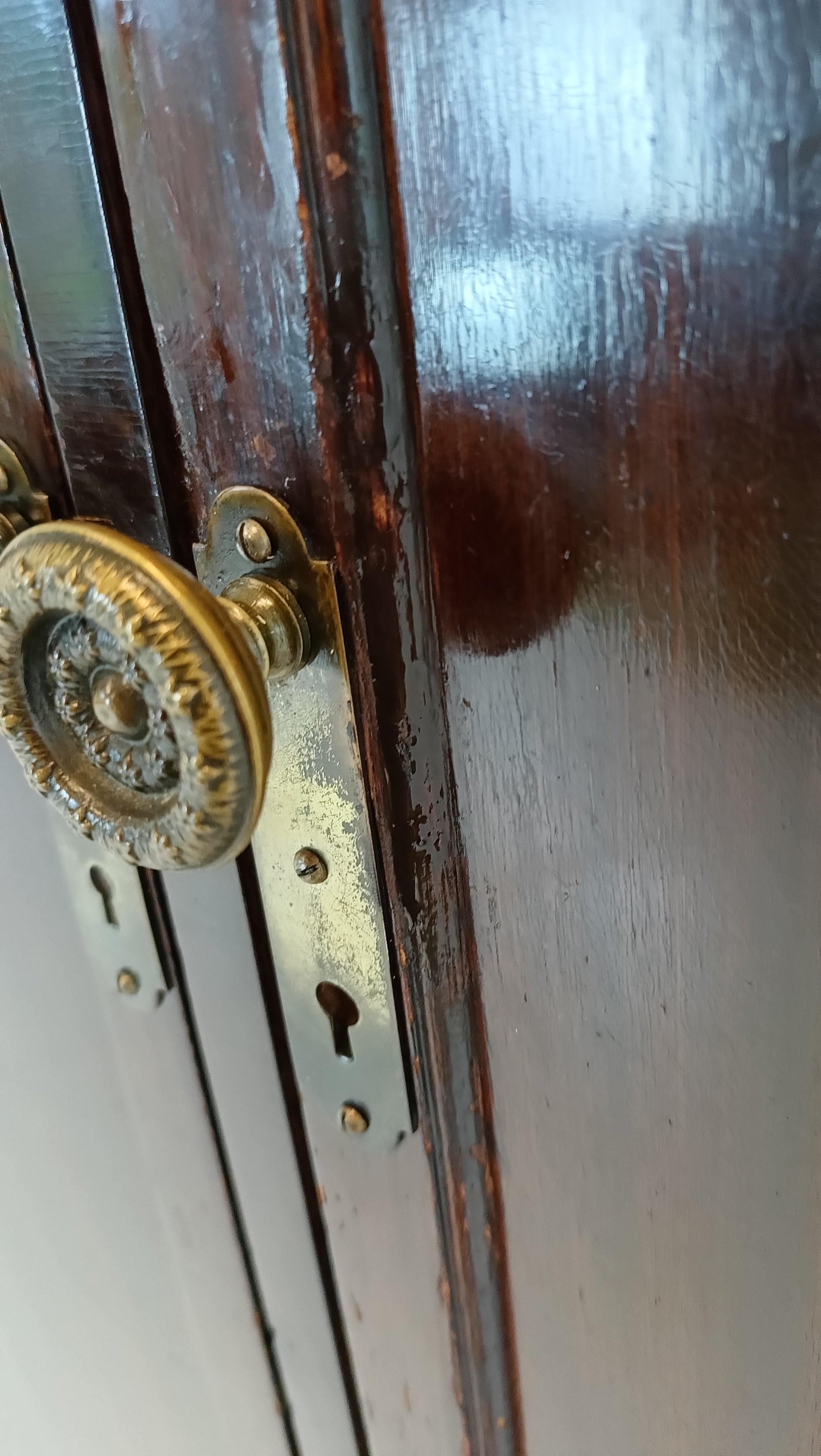 This closet is perfectly fitted inside. On the right hand side, it has got an articulated hanging section for hangers and on the left hand side it has got a series of shelves. Inside the door, there are multiple different kind of starage spaces. . The inside also contains some smaller shelves for socks, scarves and smaller objects. In the top there is a compartment for more storage. It has got beautiful copper mahogany exterior with a very warm patina.