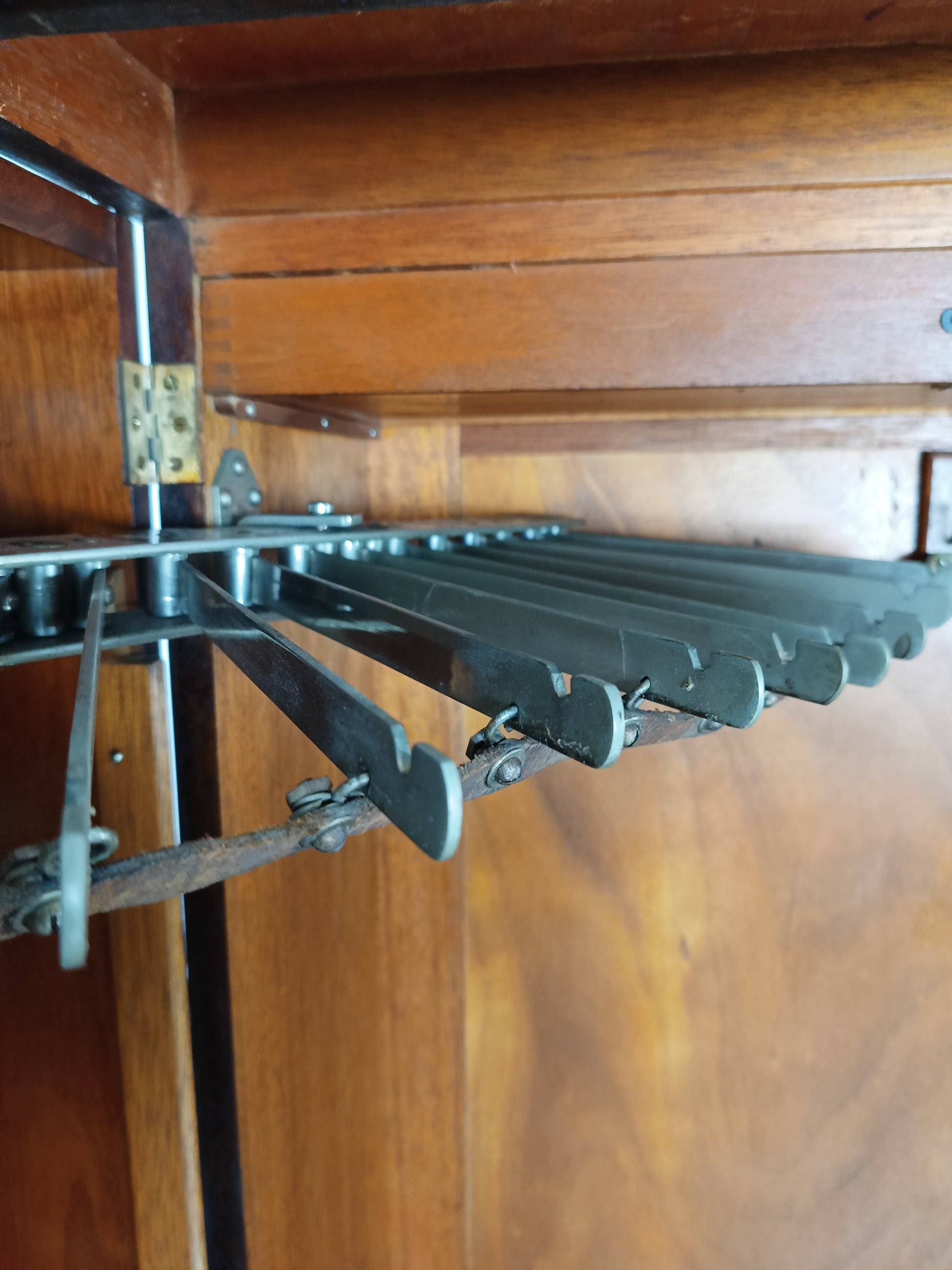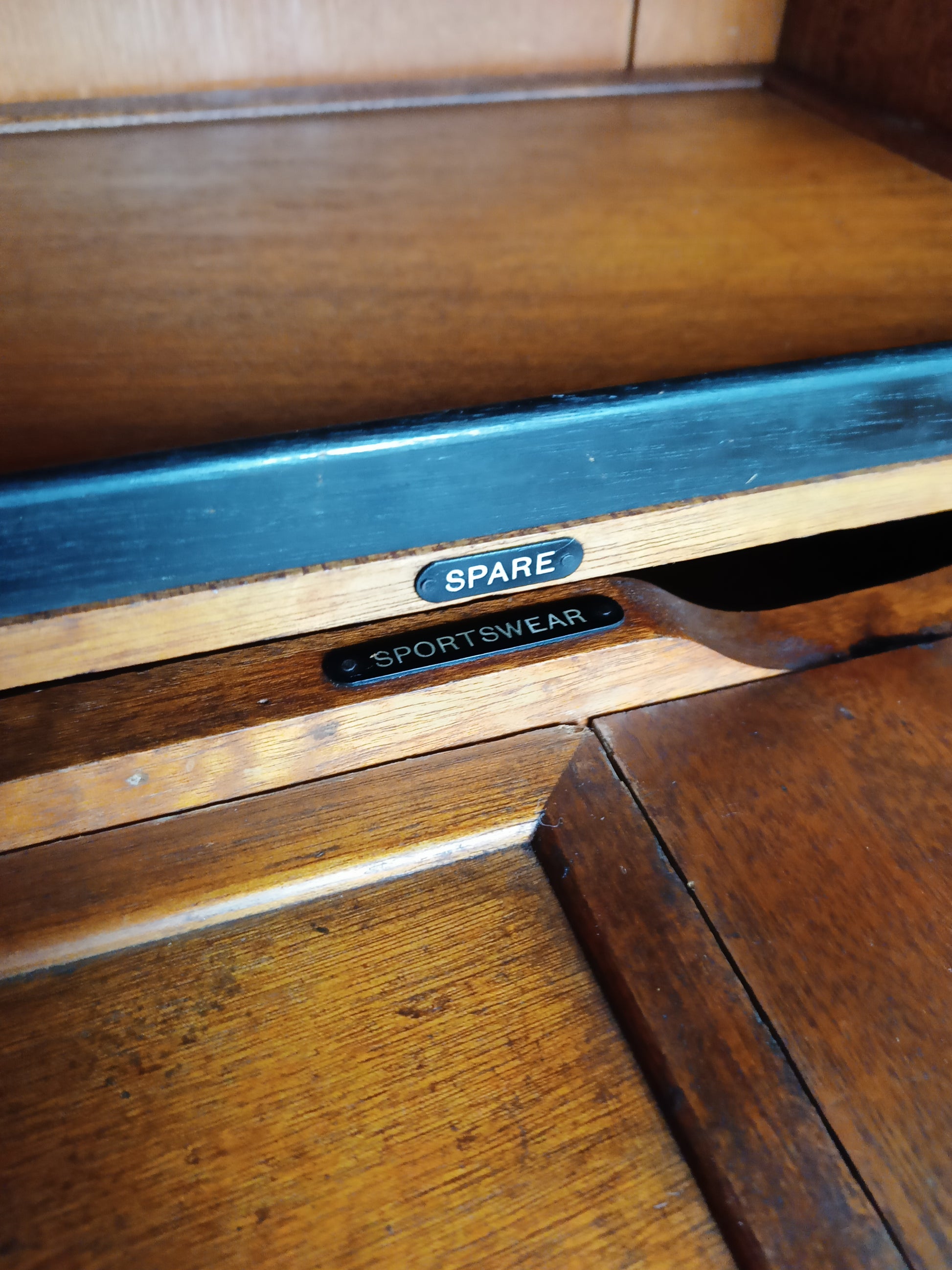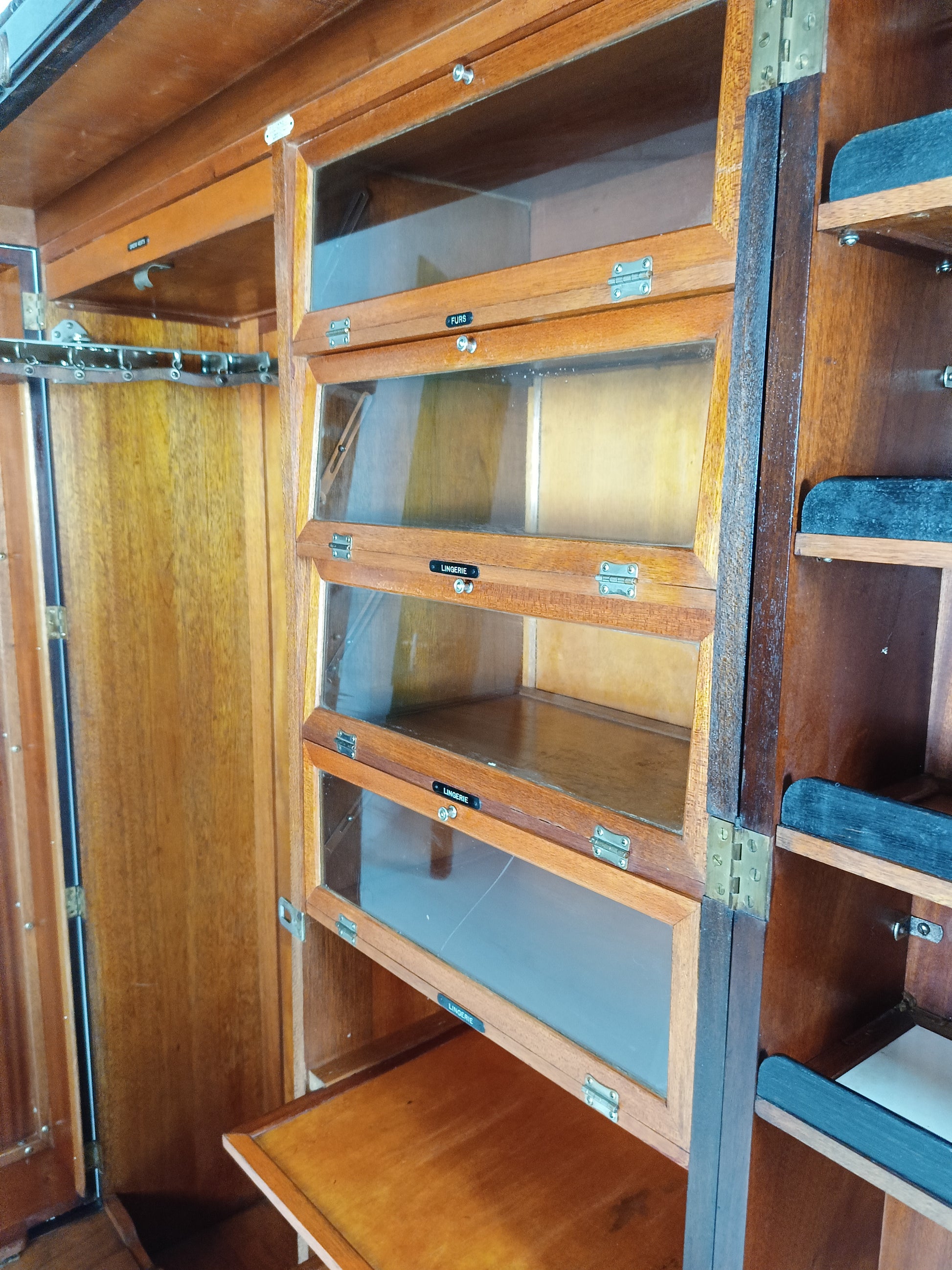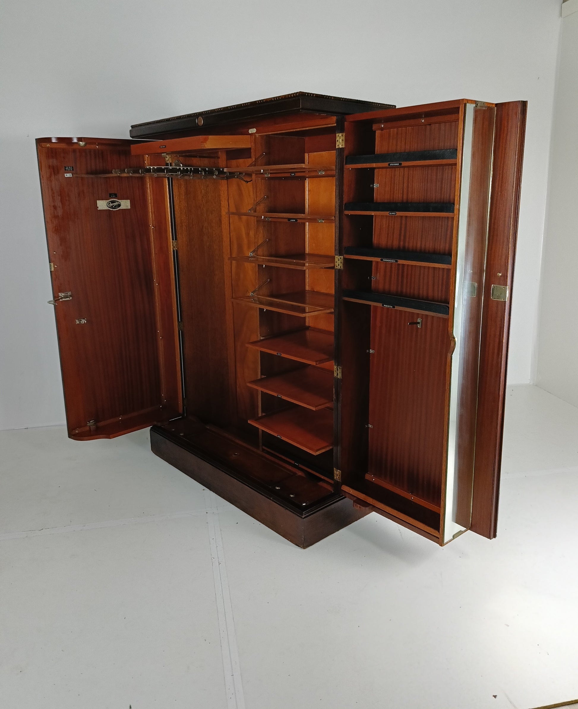 This 1920s Compactom Ltd ladies' wardrobe is a beautifully crafted piece, made from rich mahogany and oak. Compactom wardrobes were designed with innovative, organized interiors tailored for storage, allowing for easy access to everything from clothing to accessories. Inside, it features compartments, sliding trays, and drawers, each meticulously designed to hold specific items, ensuring that every item has a designated space. The warm tones of mahogany and the sturdiness of oak make this wardrobe both elegant and durable, a true representation of the luxury and functionality valued in the early 20th century. With labels including hats, hankerchiefs, lingerie, furs, scarves, shoes etc.