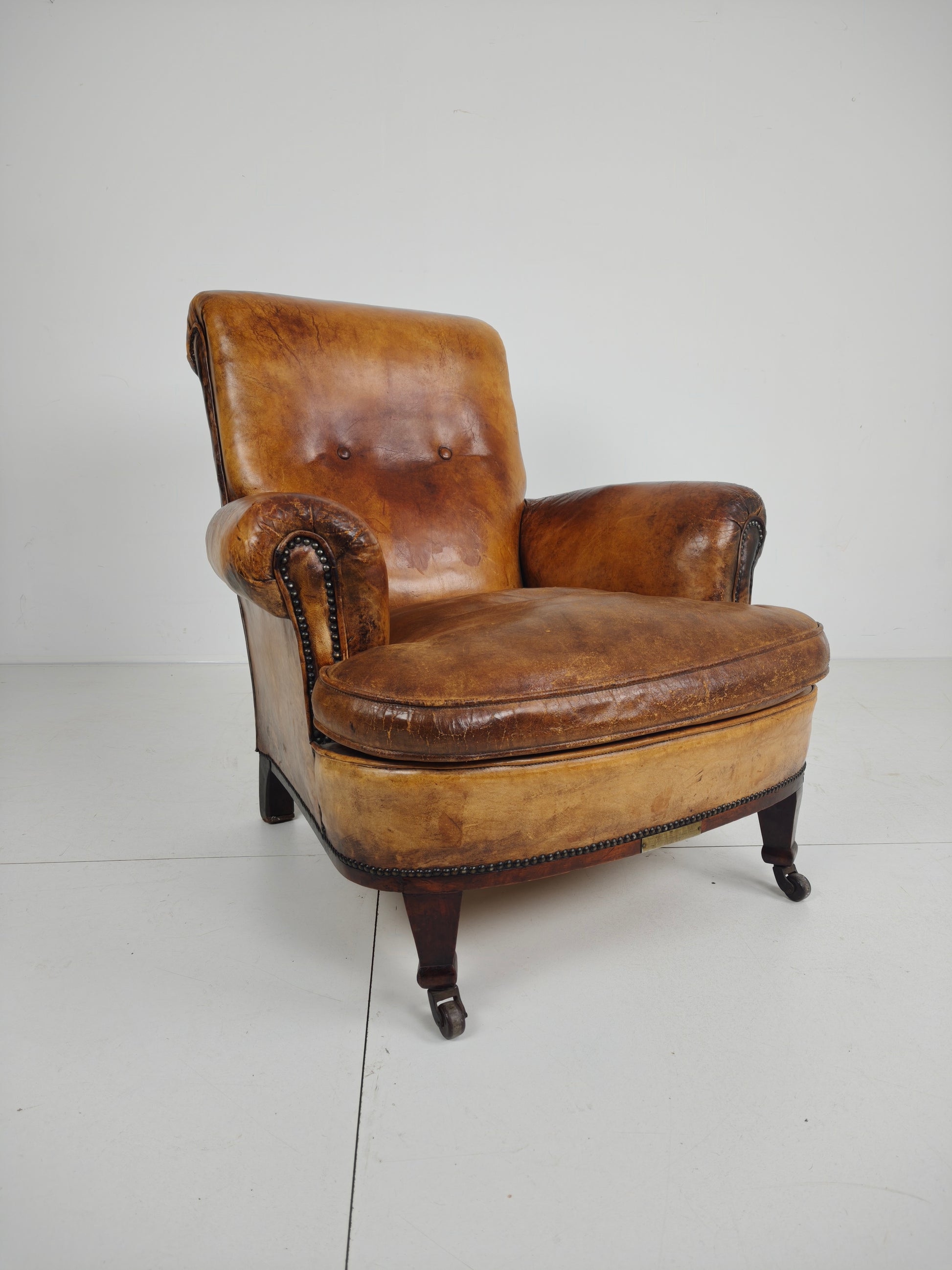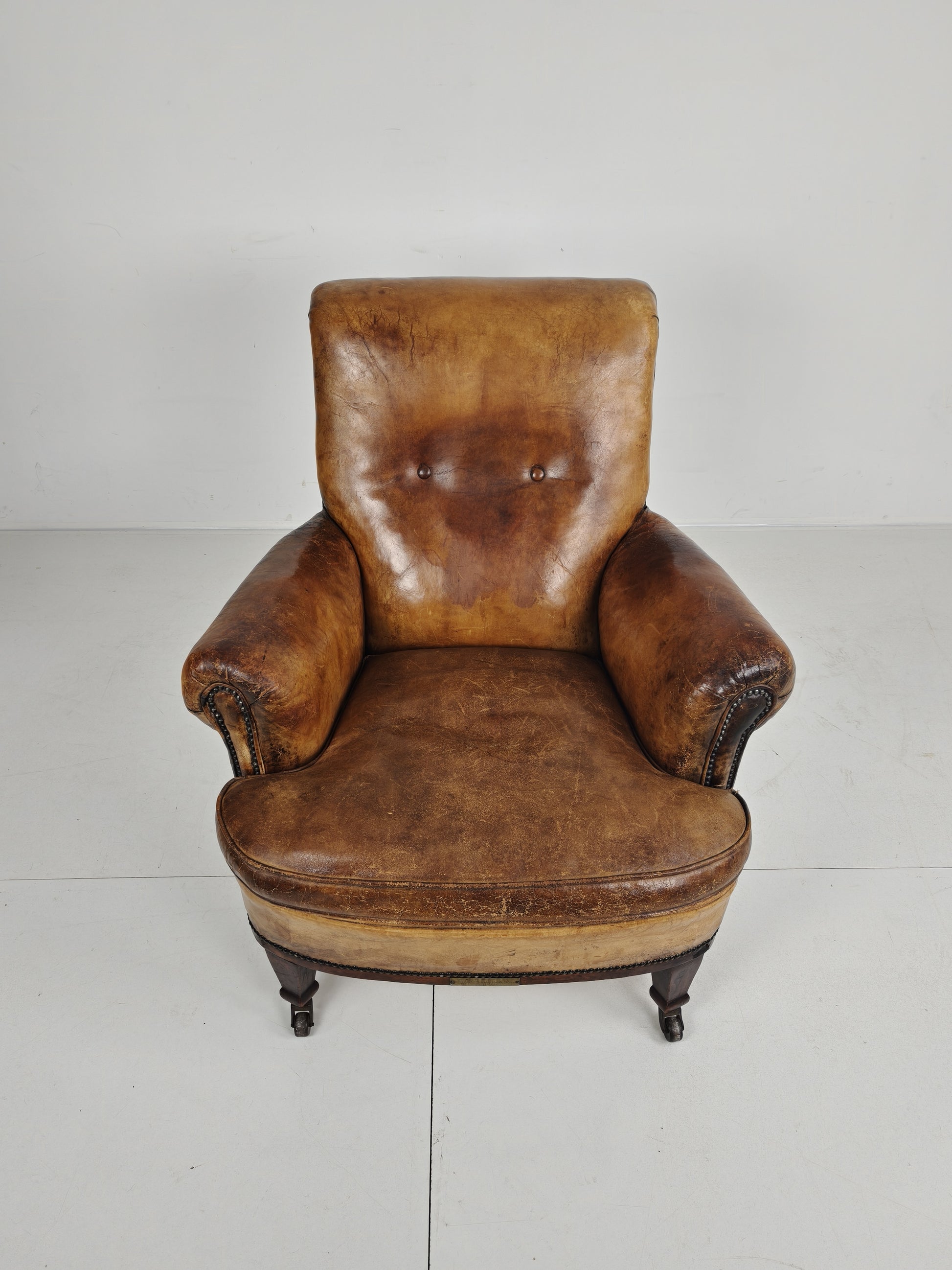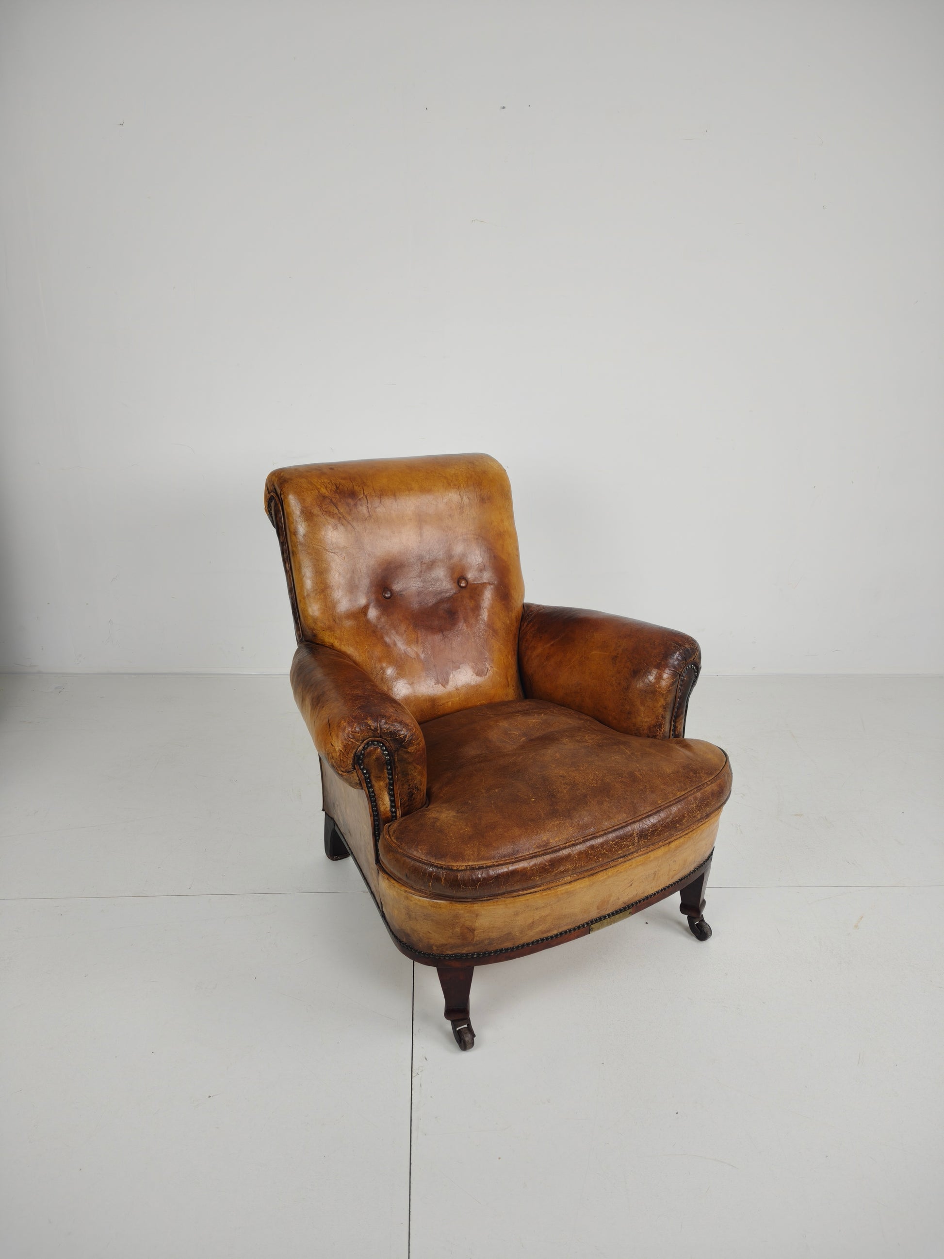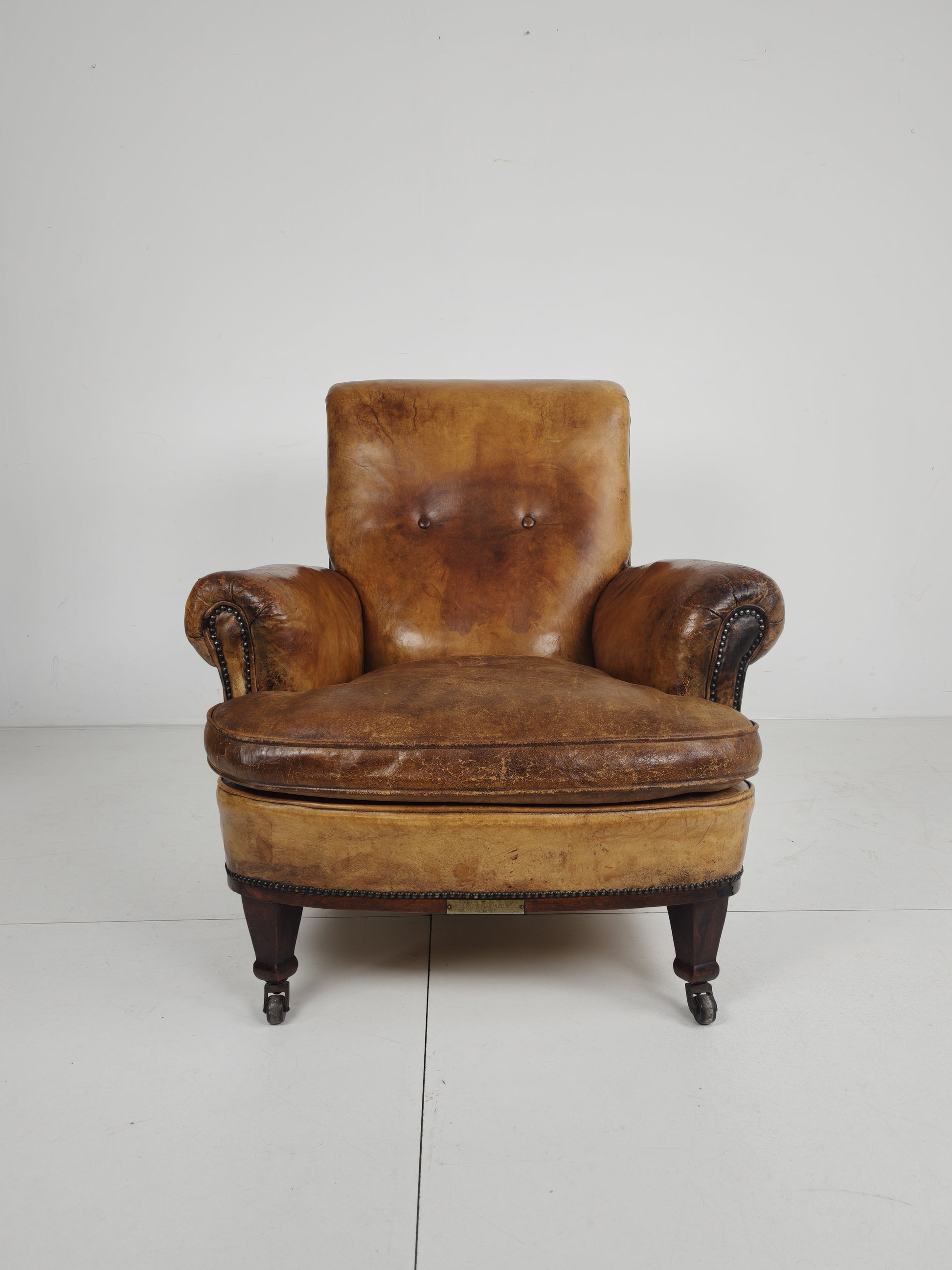 A truly remarkable piece with history, this chair offers exceptional comfort and a fine seating experience. The leather upholstery, naturally aged over time, bears signs of use consistent with its 113-year history, enhancing its authentic character. Despite its age, it remains in good condition and well-preserved for its time.