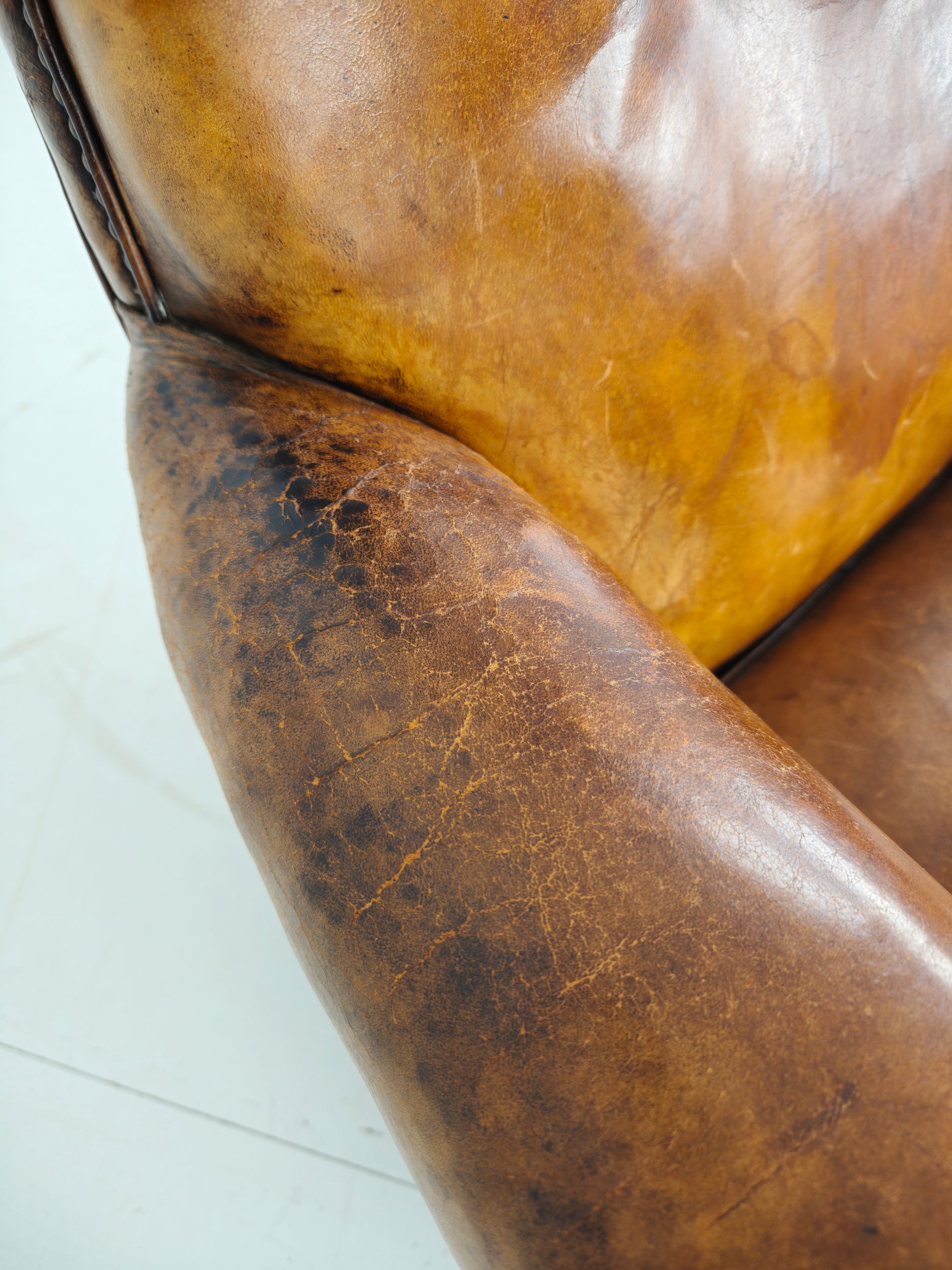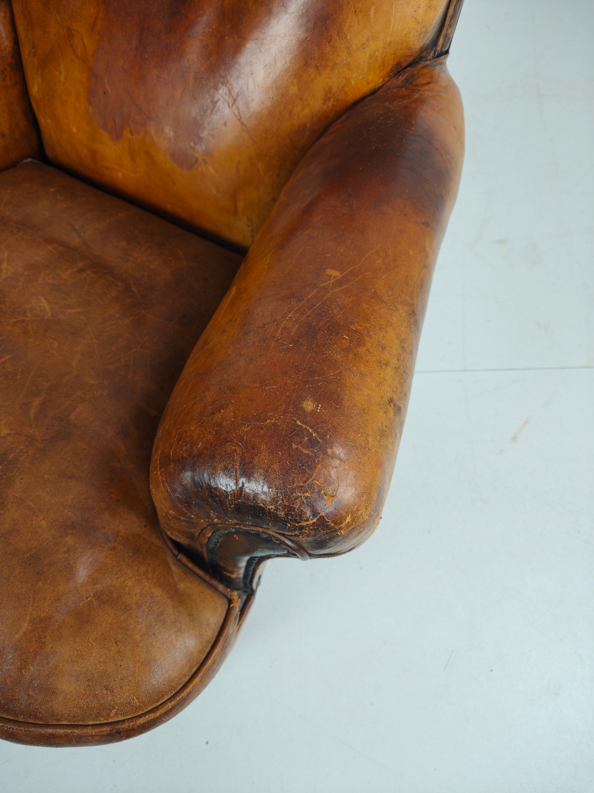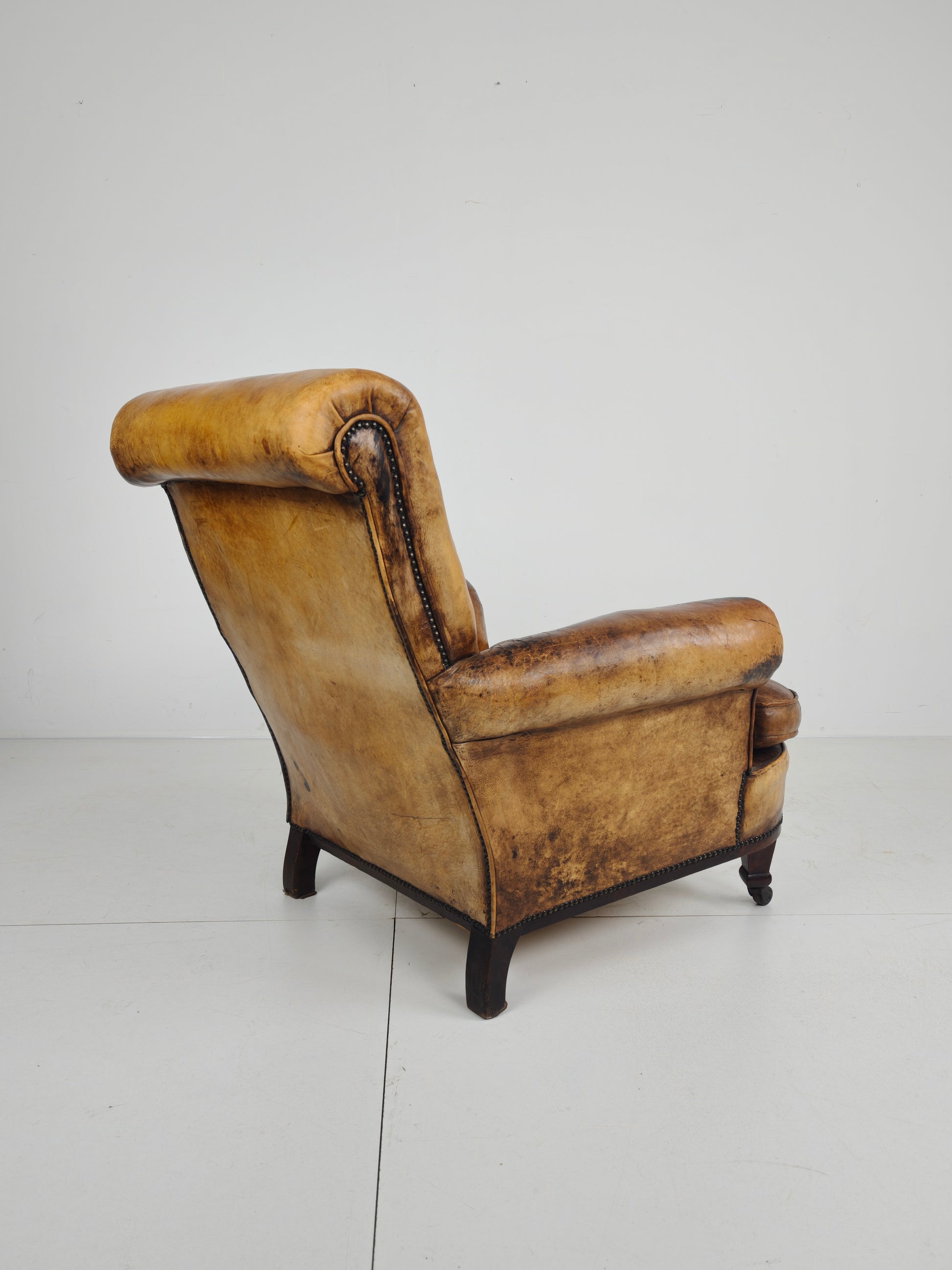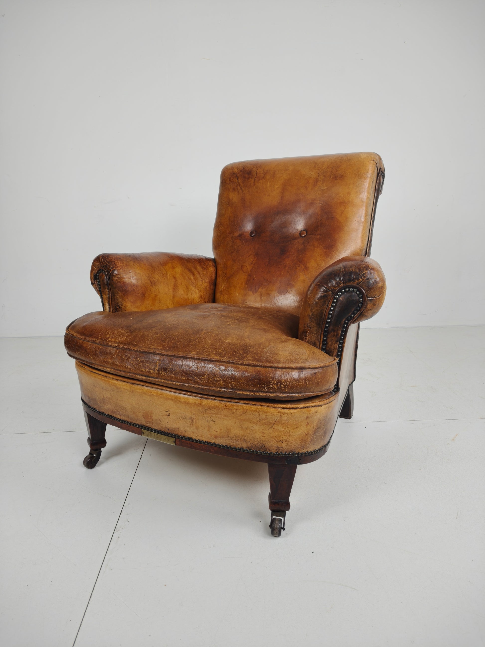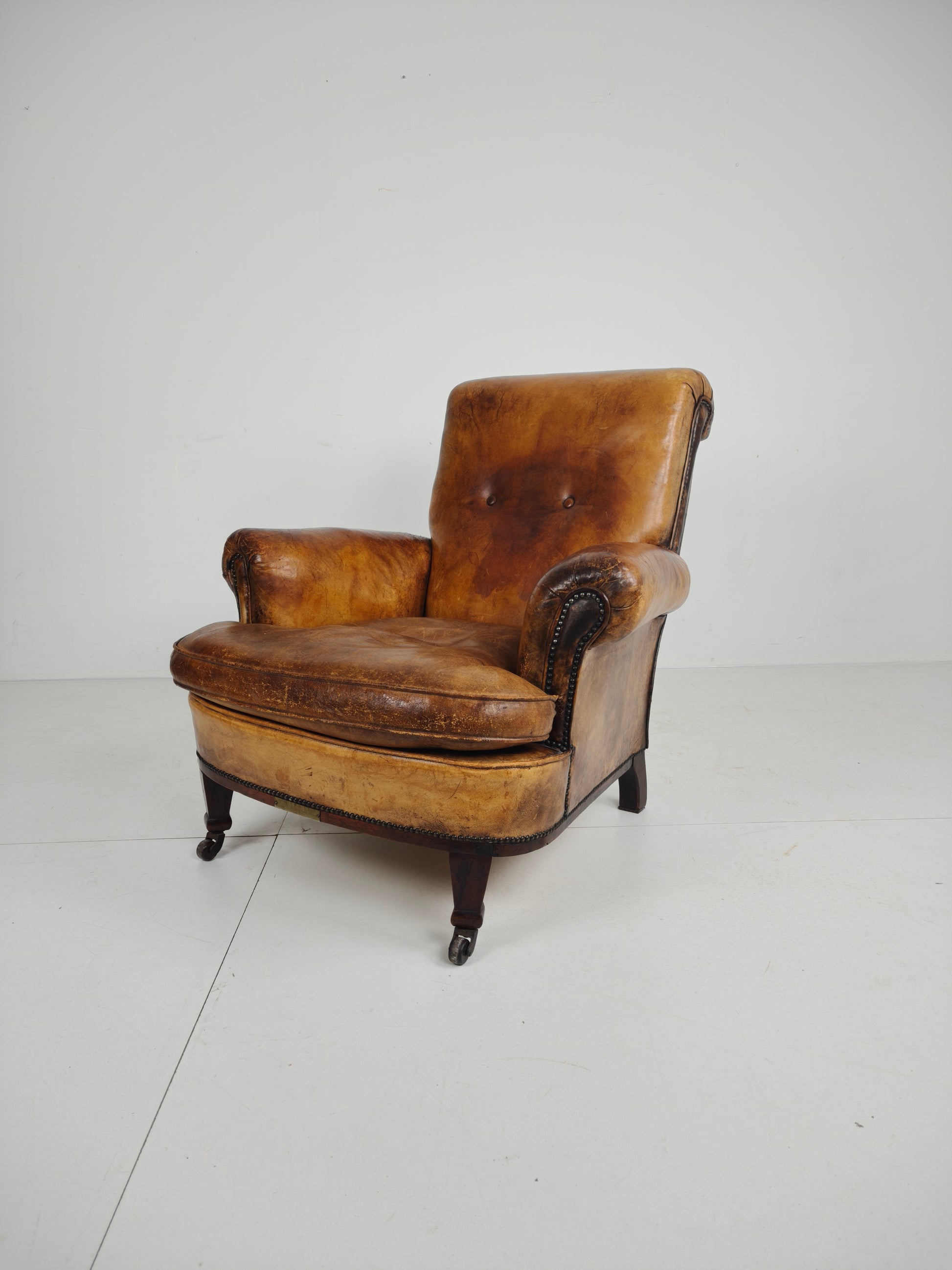 A truly remarkable piece with history, this chair offers exceptional comfort and a fine seating experience. The leather upholstery, naturally aged over time, bears signs of use consistent with its 113-year history, enhancing its authentic character. Despite its age, it remains in good condition and well-preserved for its time.