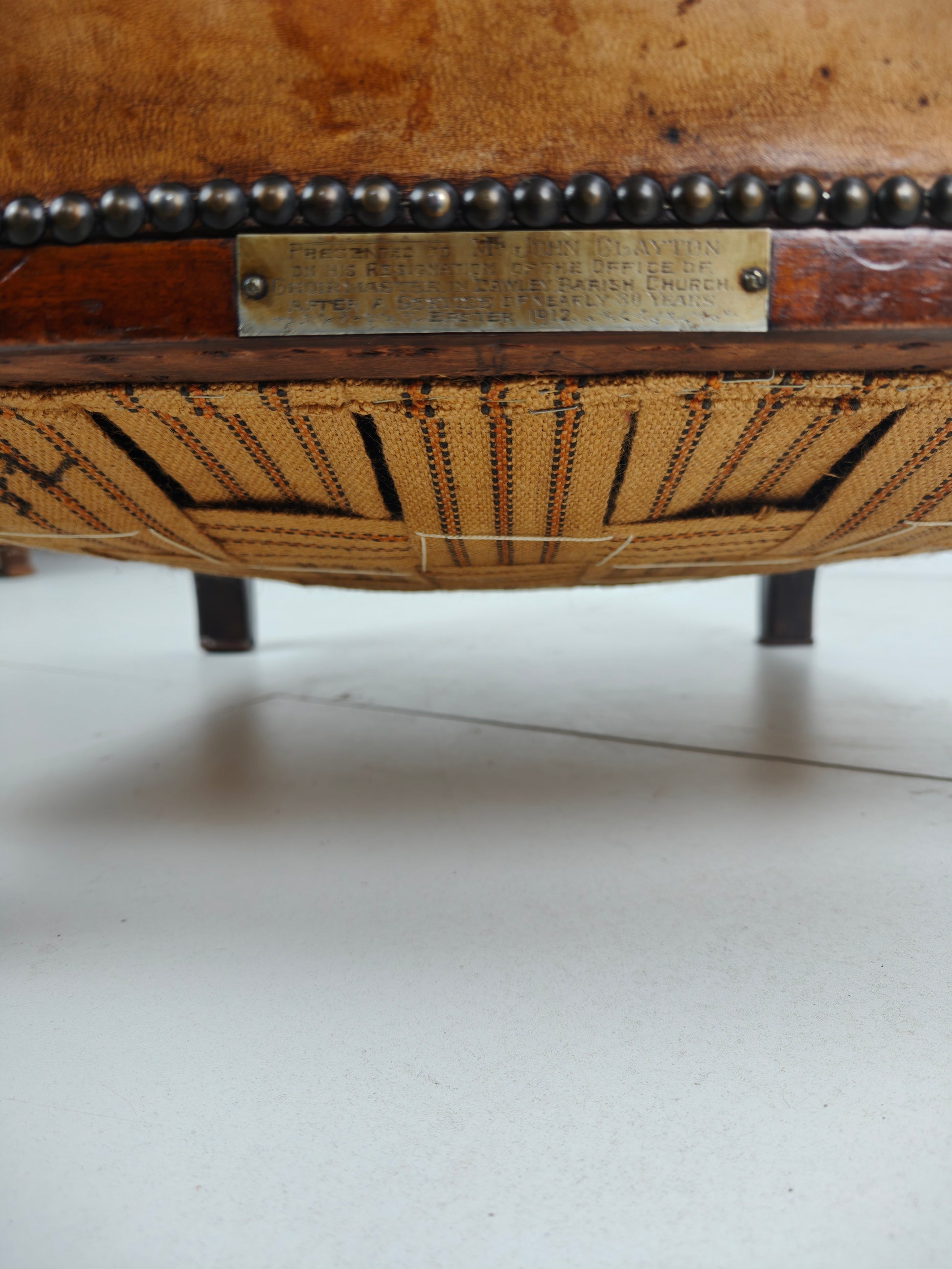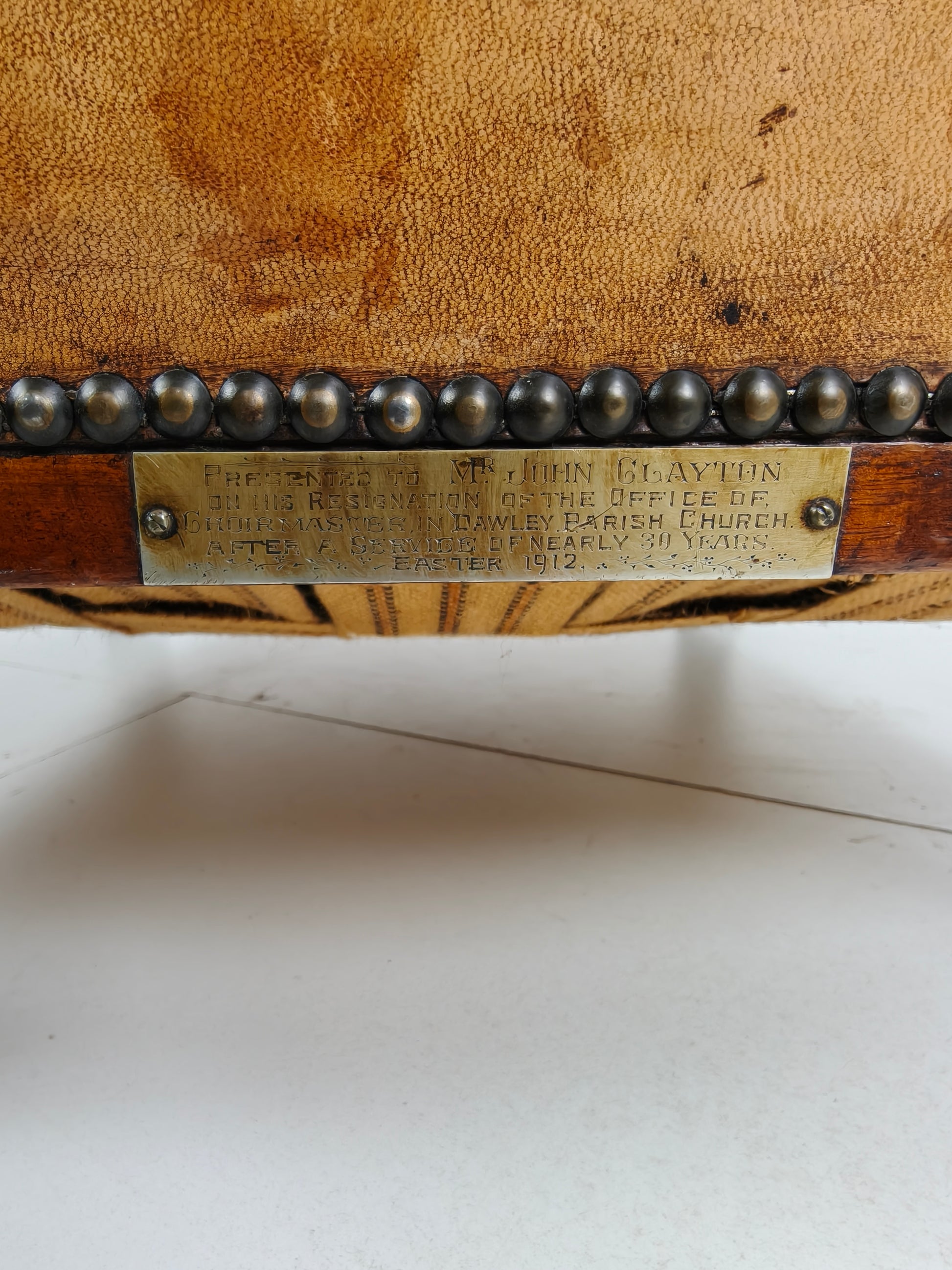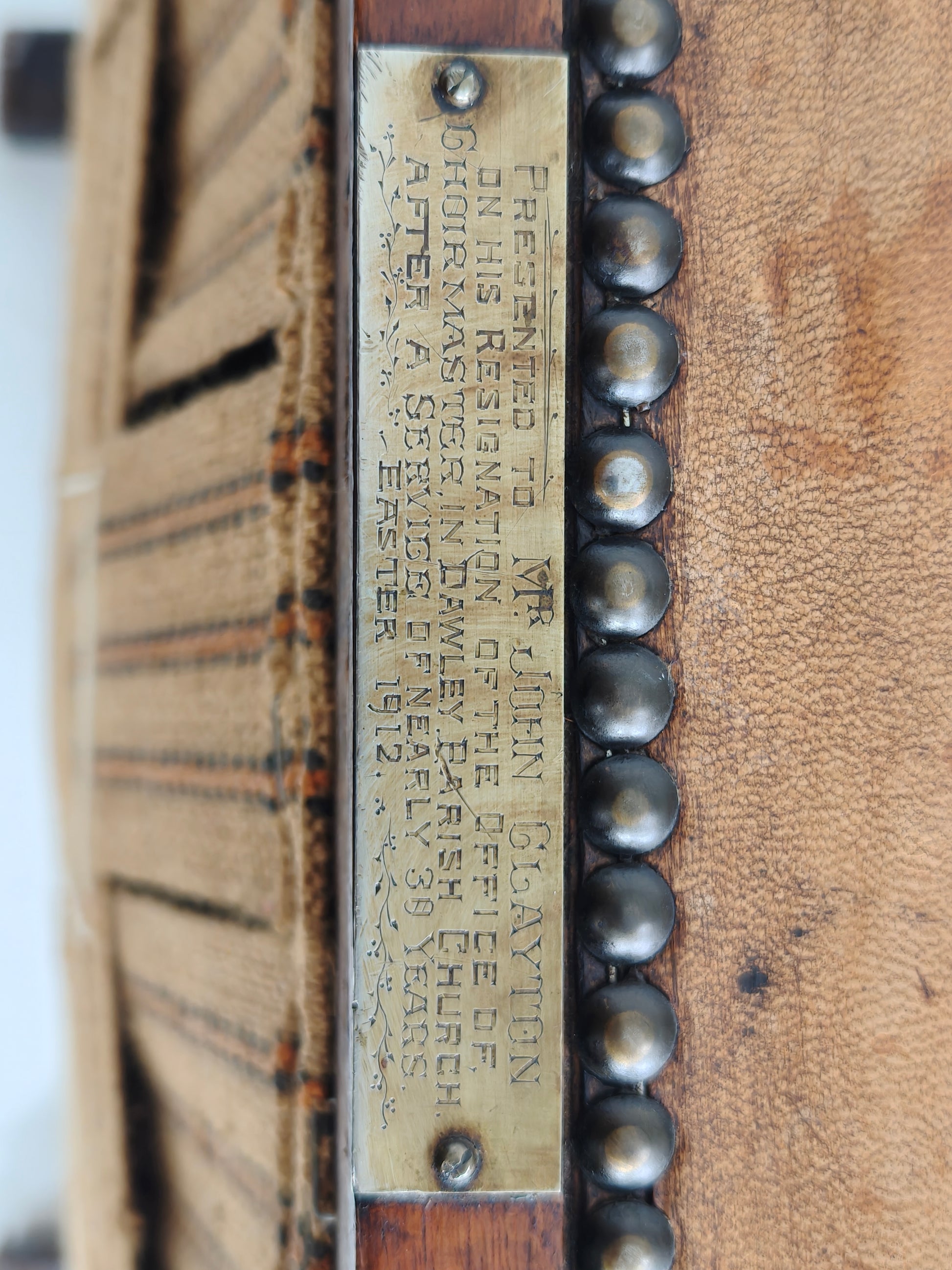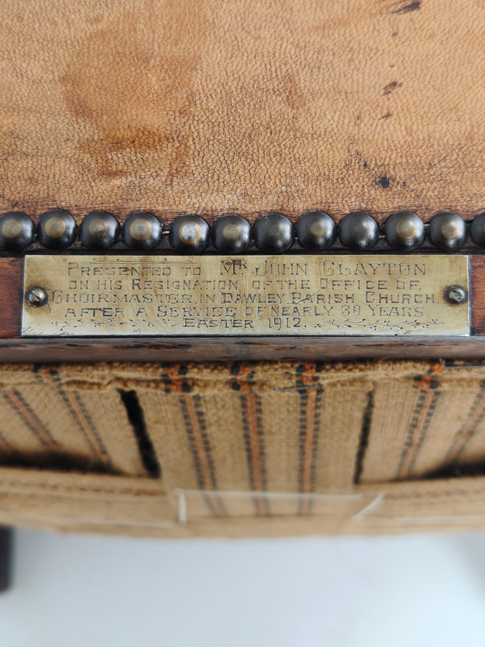 This English leather club chair from 1912 holds a fascinating story. It was presented to John Clayton by the parish of Dawley Parish Church as a tribute for his 30 years of dedicated service as a choirmaster. A beautiful brass plaque on the front of the chair marks this special dedication.
