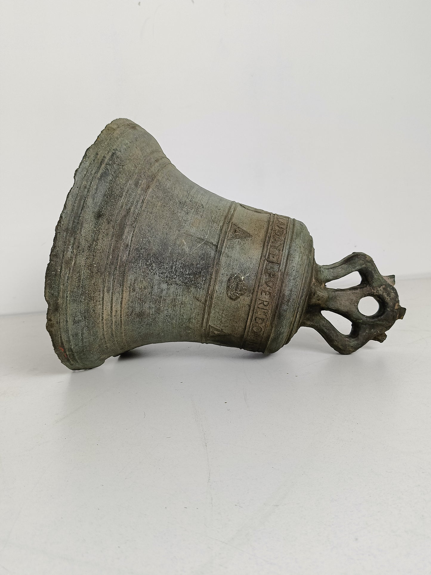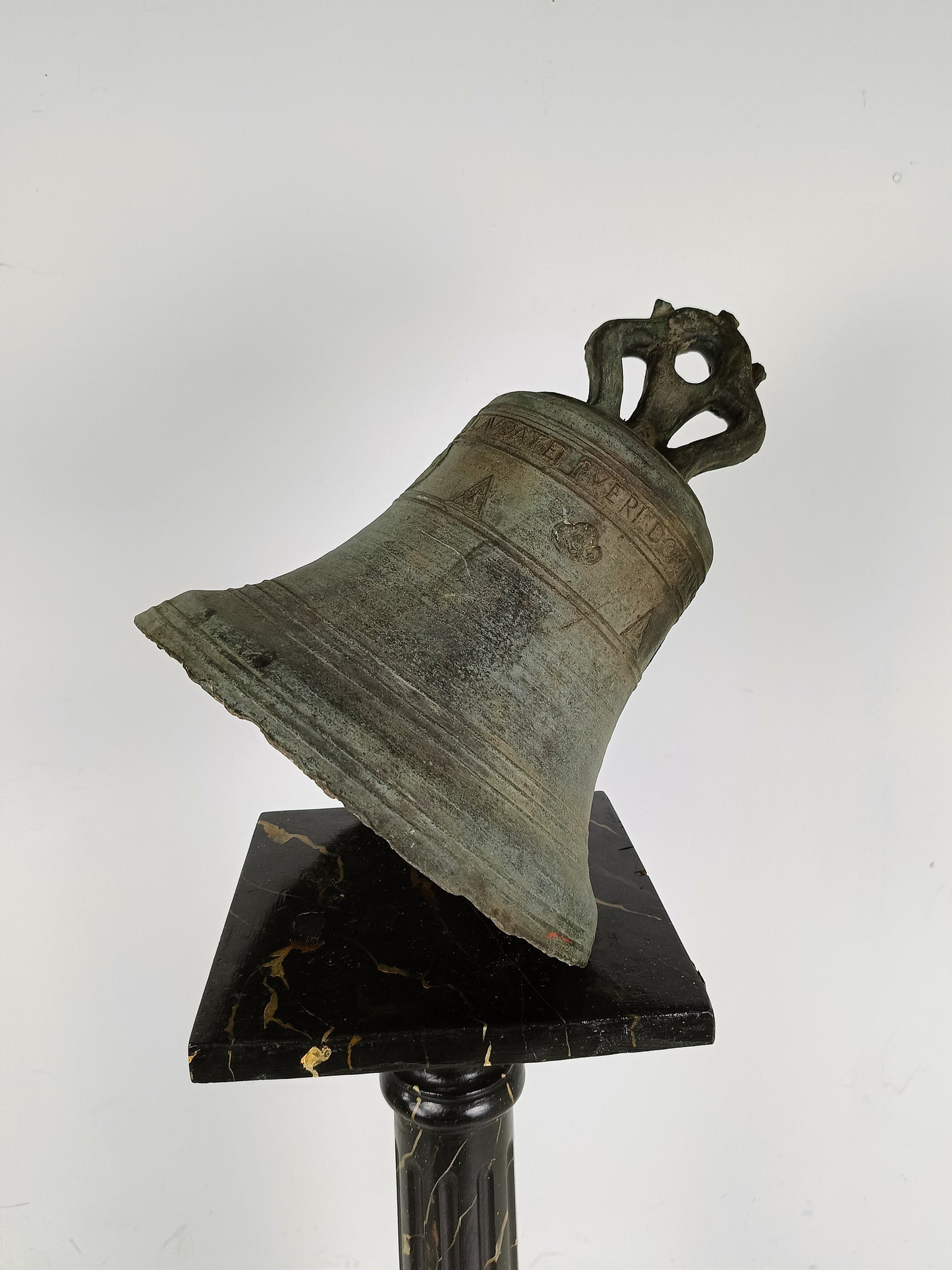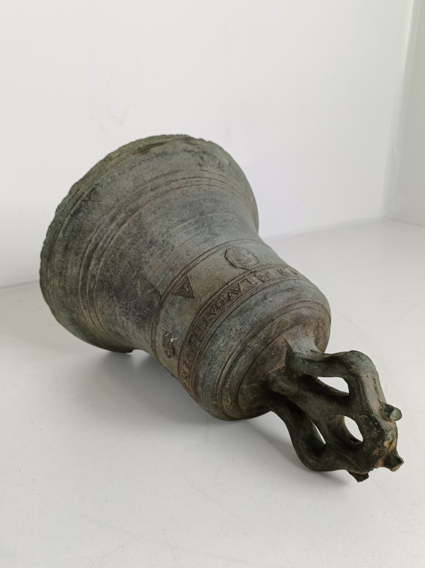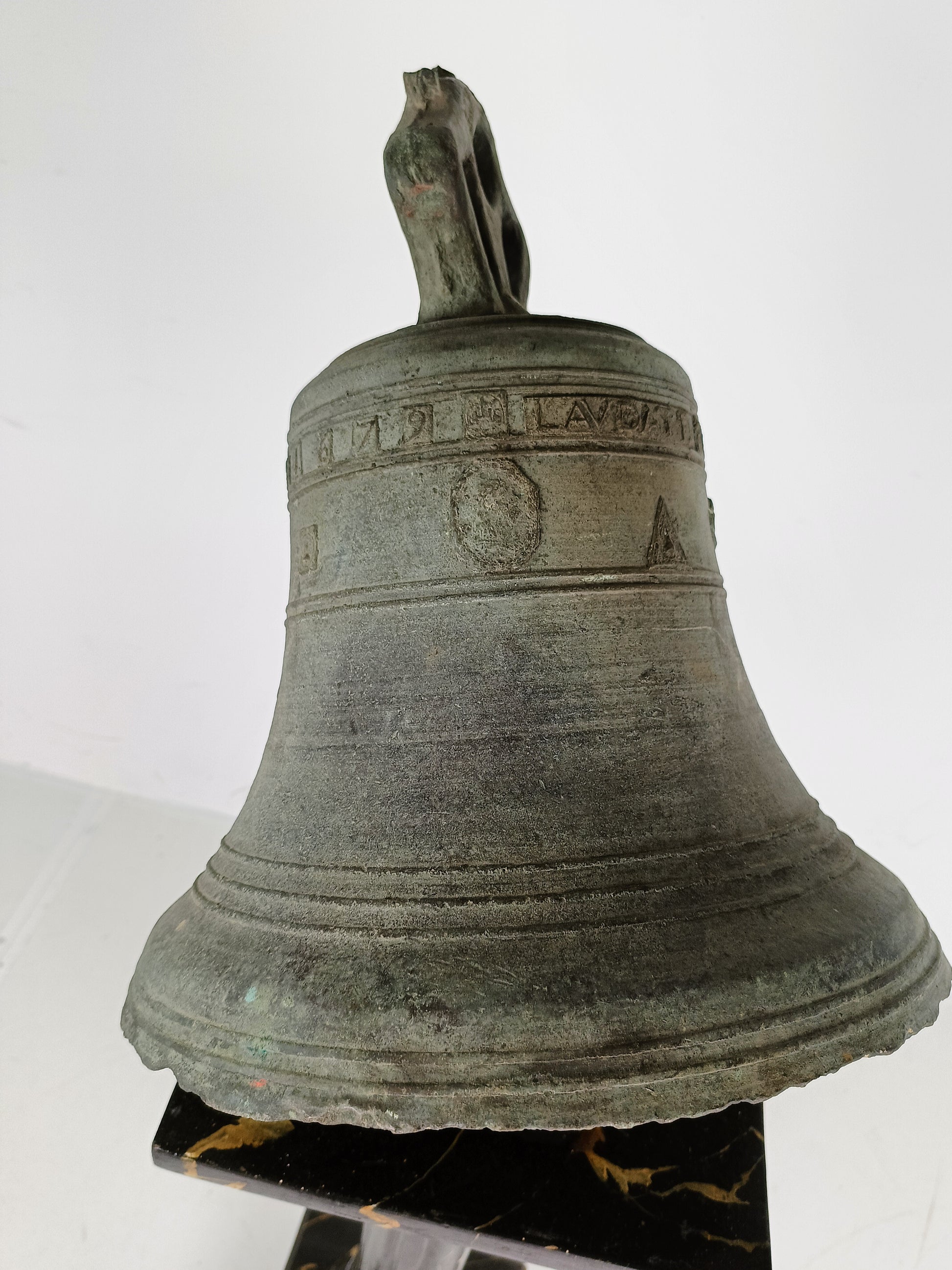 An antique church bell is a historical piece often made of bronze and cast in various sizes. These bells date back centuries and typically feature unique inscriptions, often in Latin, that reflect religious sentiments, the names of benefactors, or dedications to saints. These bells were usually cast by skilled craftsmen, and their age, craftsmanship, and inscriptions make them valuable artifacts that provide insights into the religious and cultural history of the period. Has signs of wear shown on pictures. Wonderful decorative object.