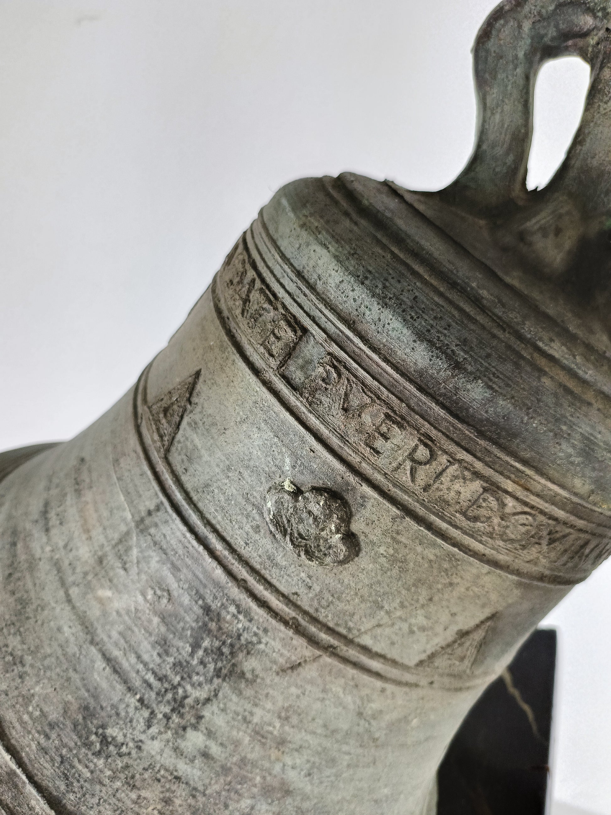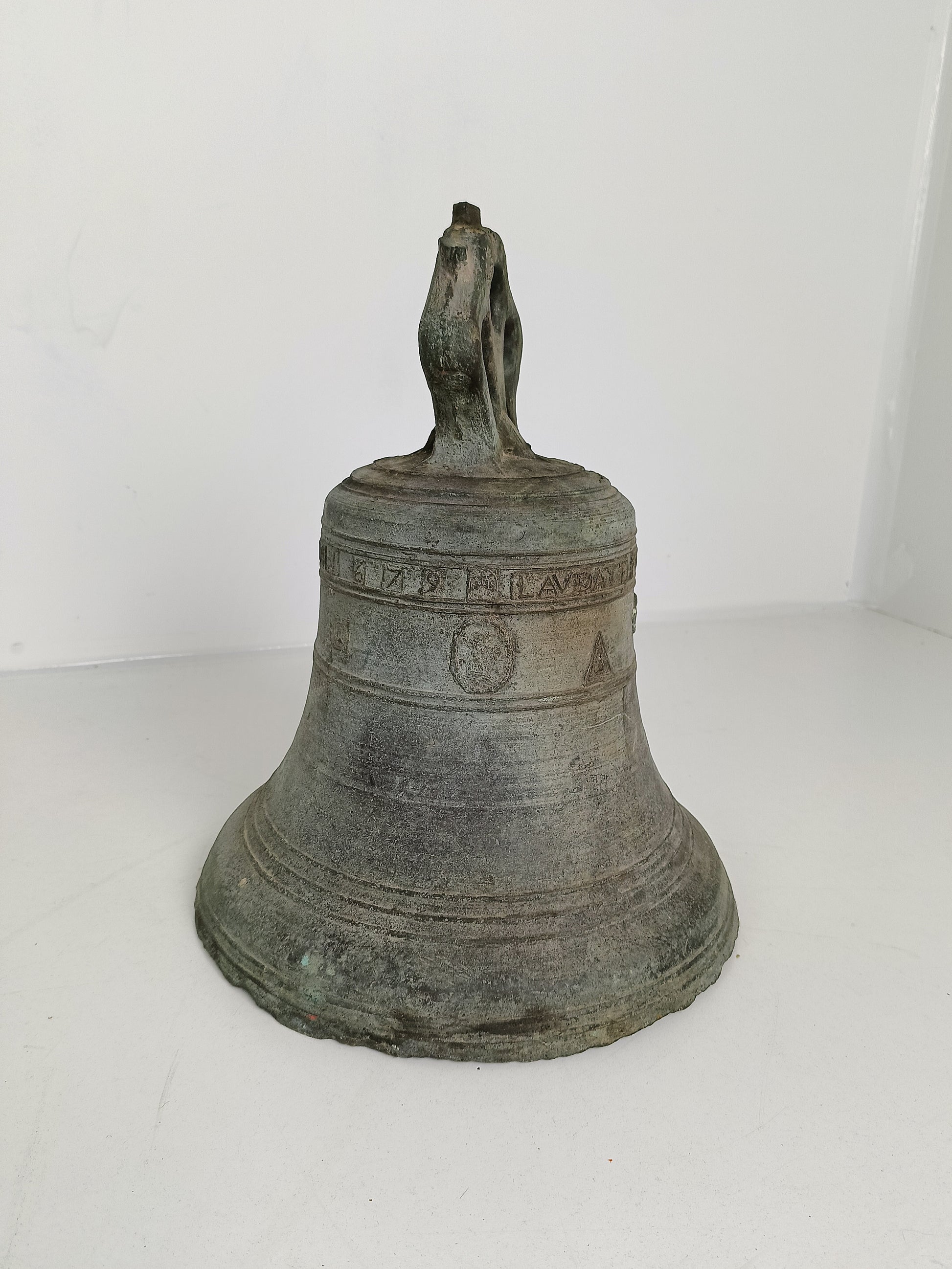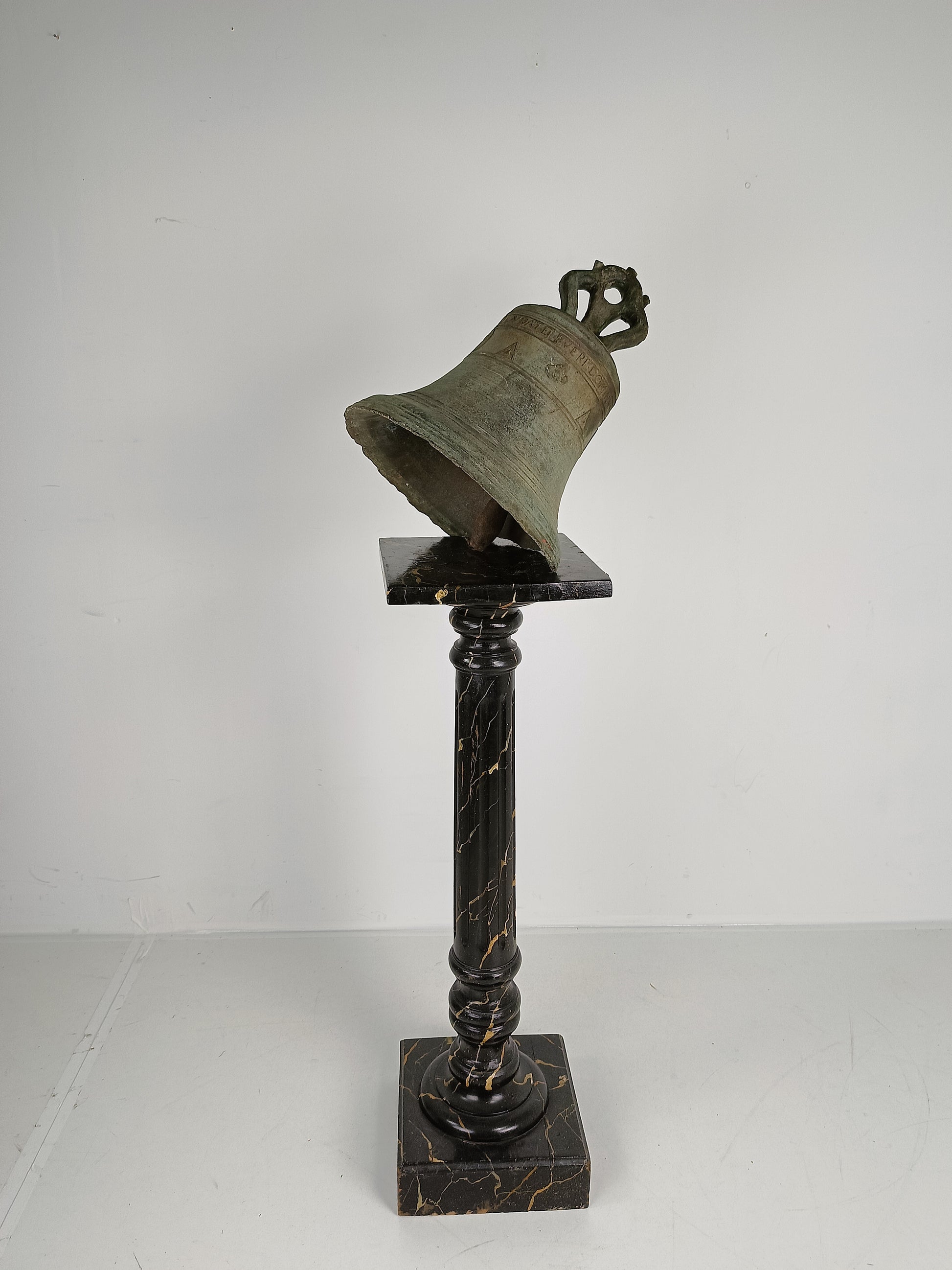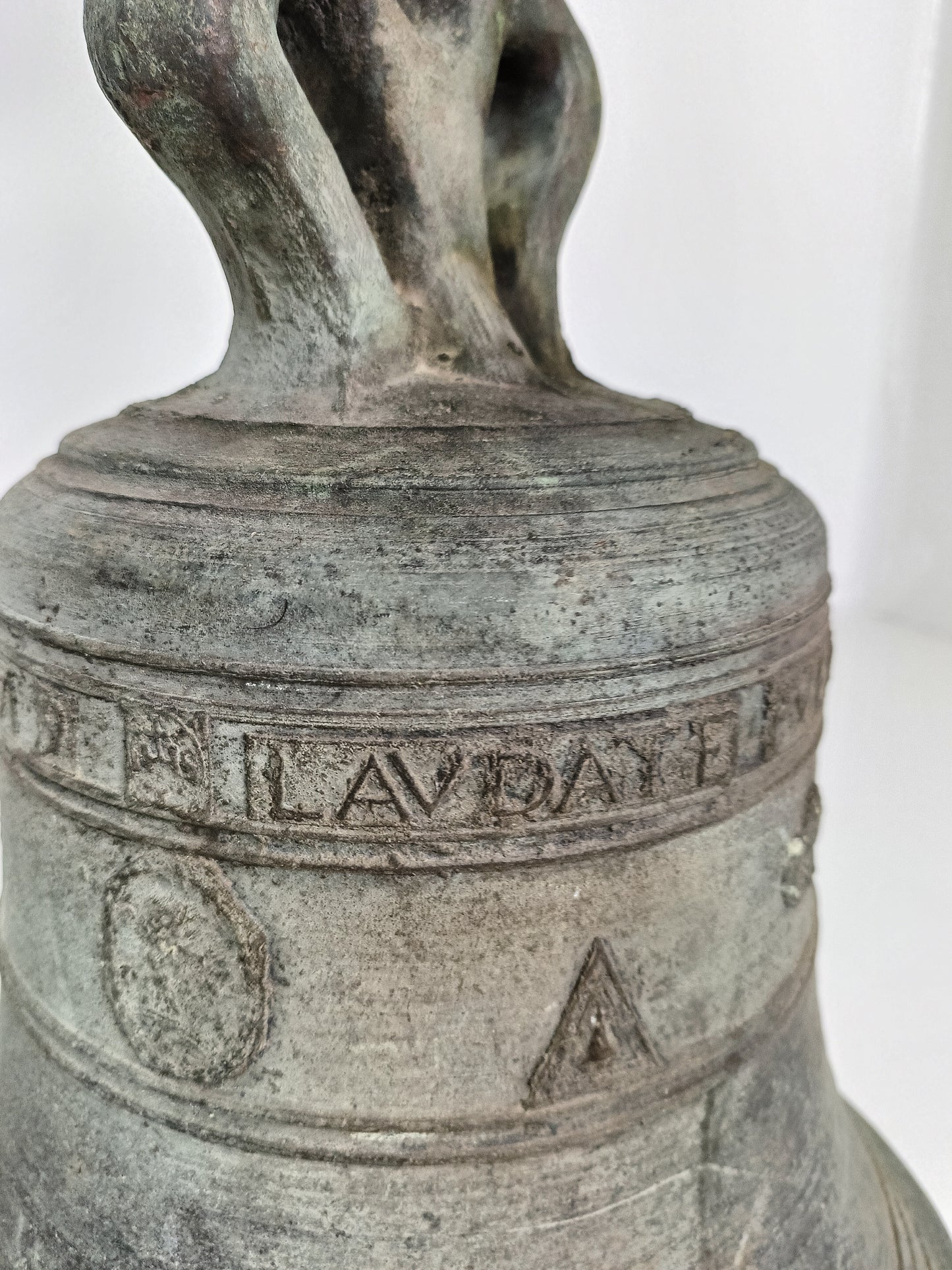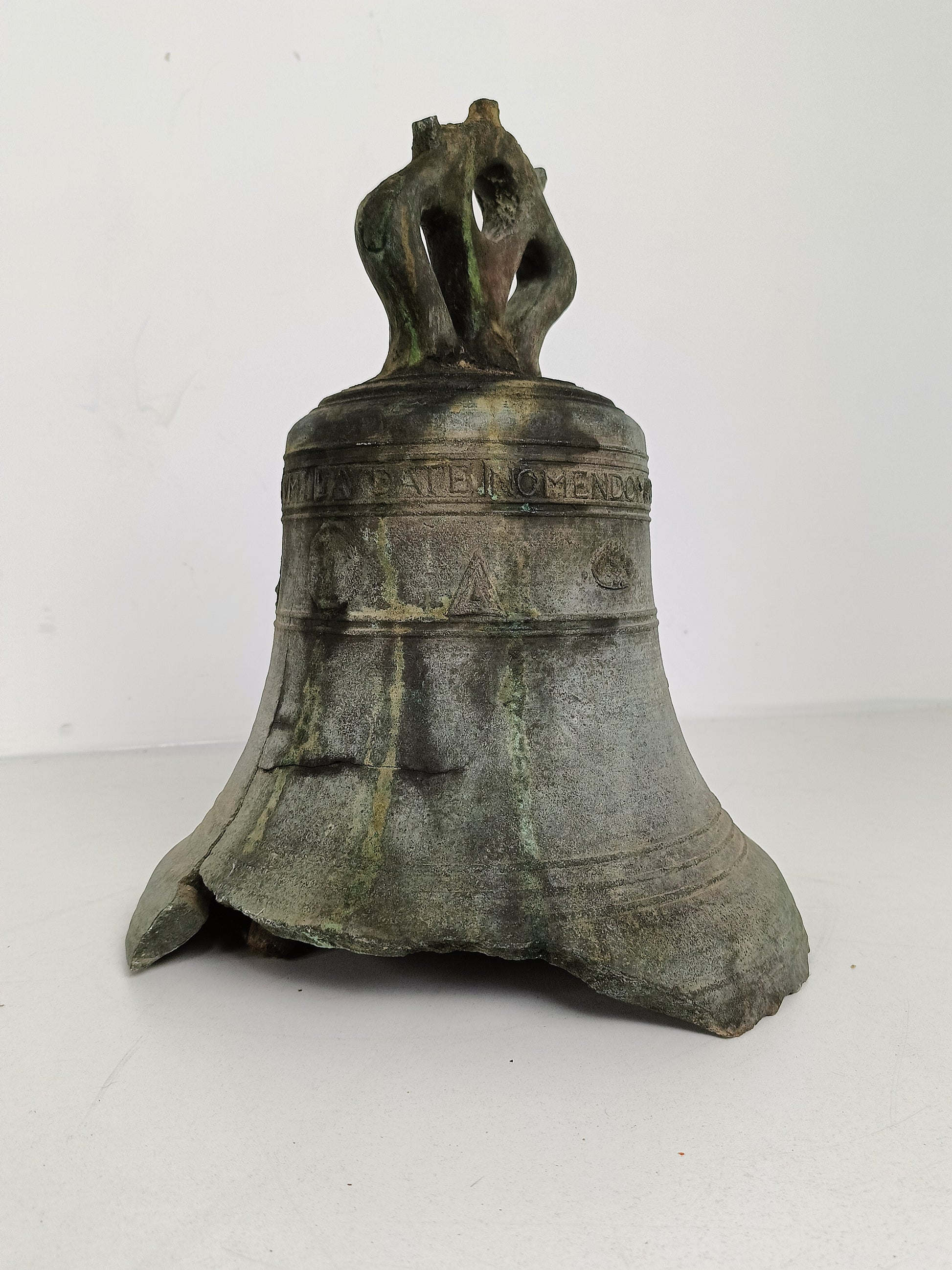 An antique church bell is a historical piece often made of bronze and cast in various sizes. These bells date back centuries and typically feature unique inscriptions, often in Latin, that reflect religious sentiments, the names of benefactors, or dedications to saints. These bells were usually cast by skilled craftsmen, and their age, craftsmanship, and inscriptions make them valuable artifacts that provide insights into the religious and cultural history of the period. Has signs of wear shown on pictures. Wonderful decorative object.