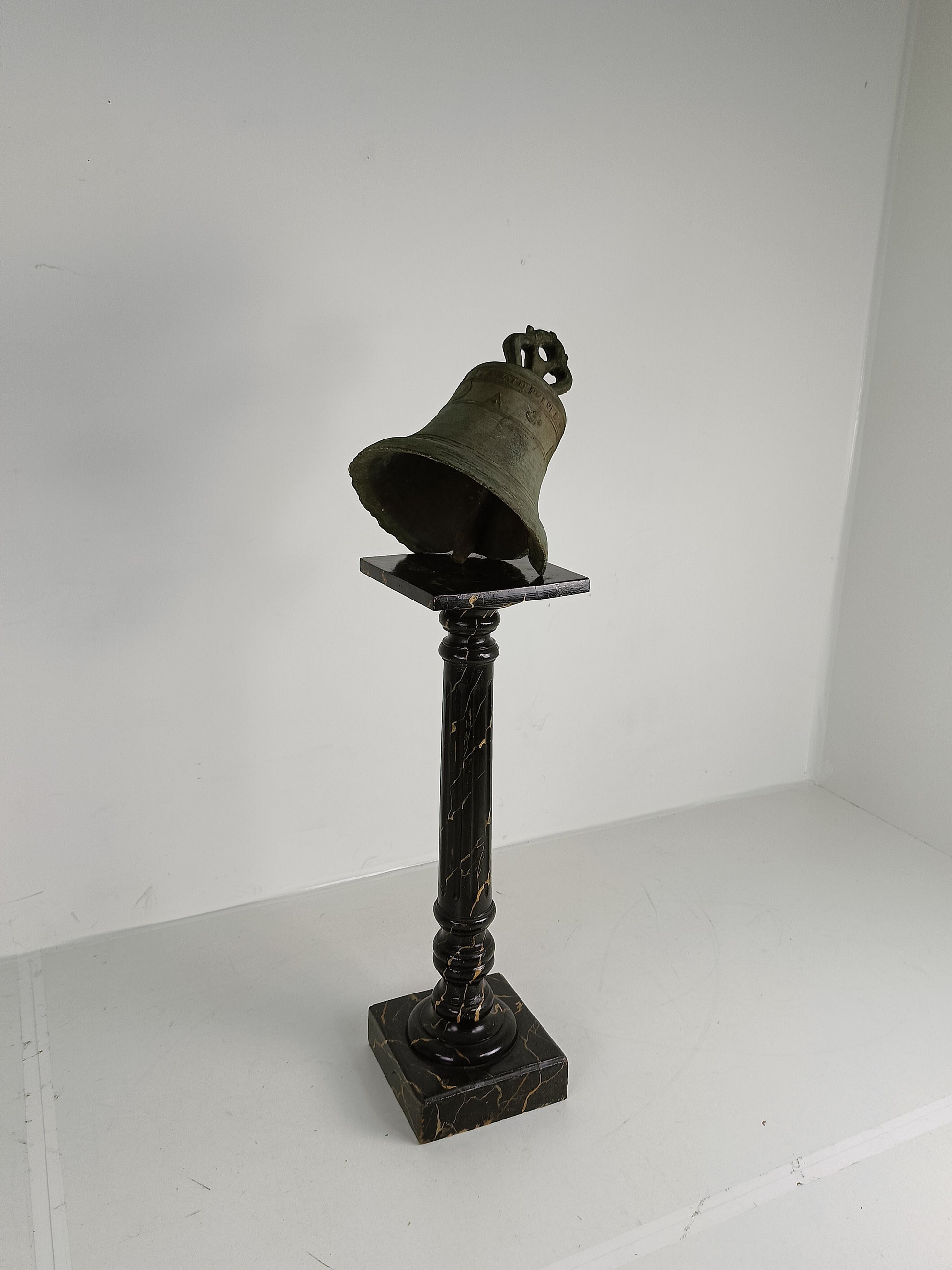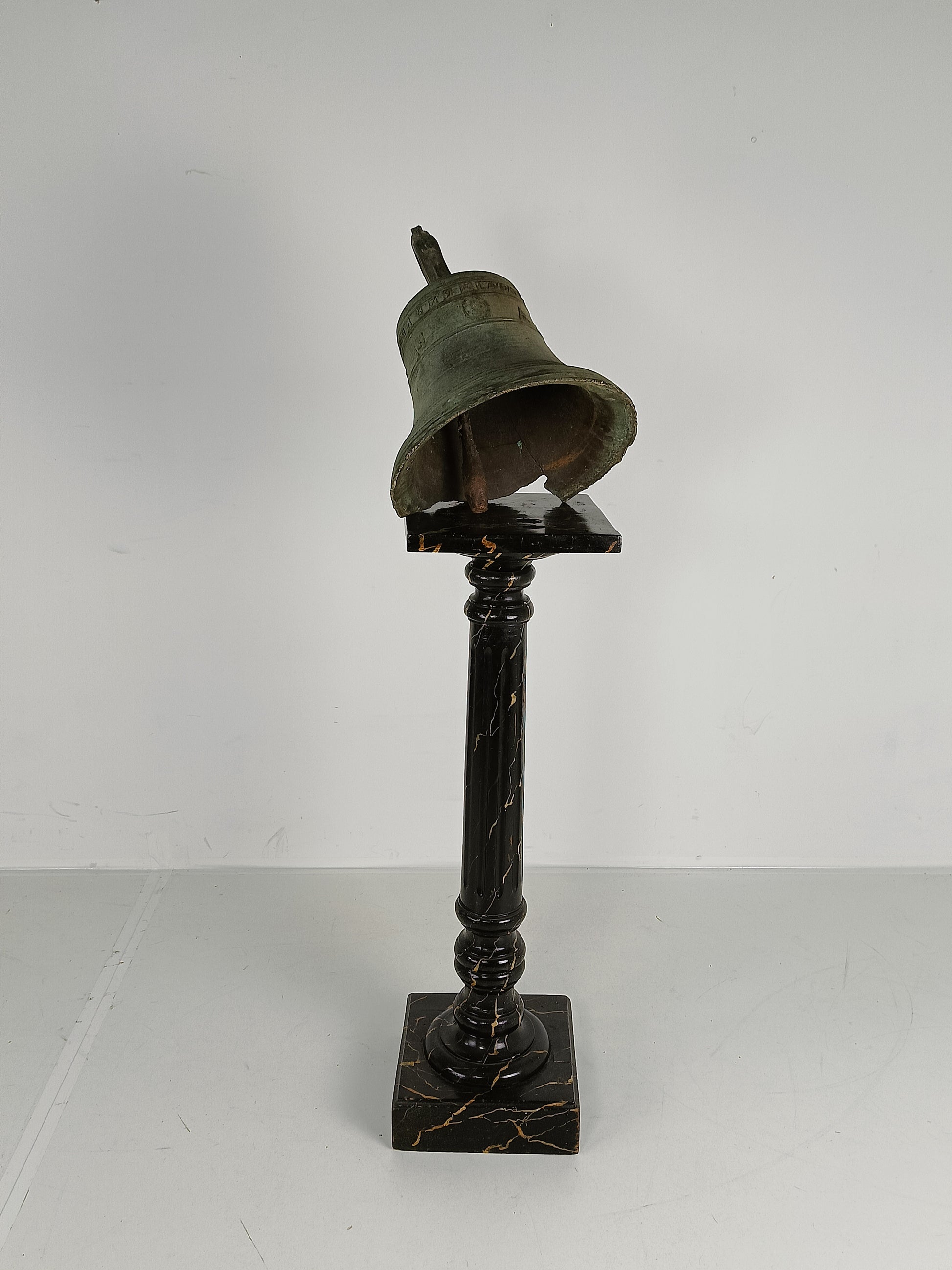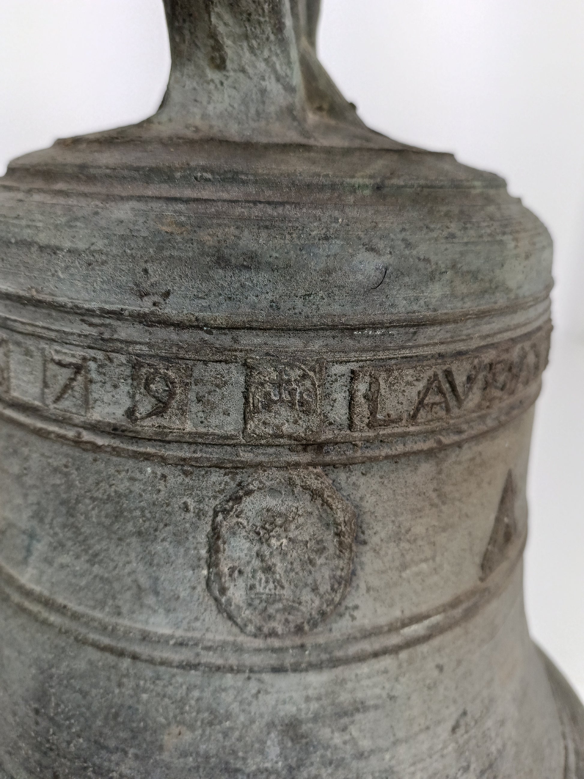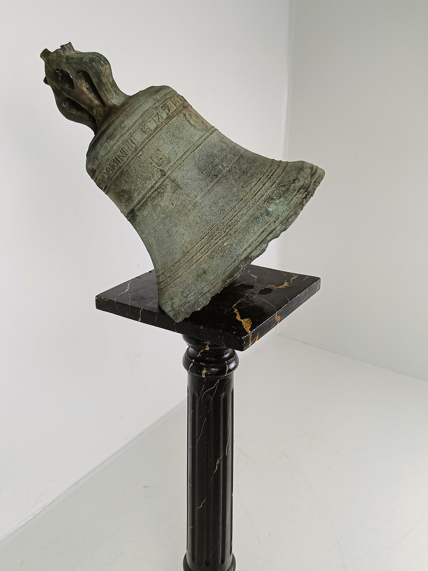 An antique church bell is a historical piece often made of bronze and cast in various sizes. These bells date back centuries and typically feature unique inscriptions, often in Latin, that reflect religious sentiments, the names of benefactors, or dedications to saints. These bells were usually cast by skilled craftsmen, and their age, craftsmanship, and inscriptions make them valuable artifacts that provide insights into the religious and cultural history of the period. Has signs of wear shown on pictures. Wonderful decorative object.