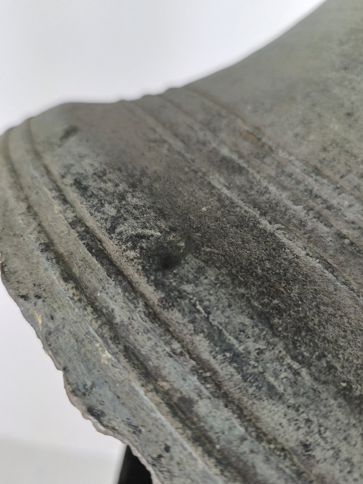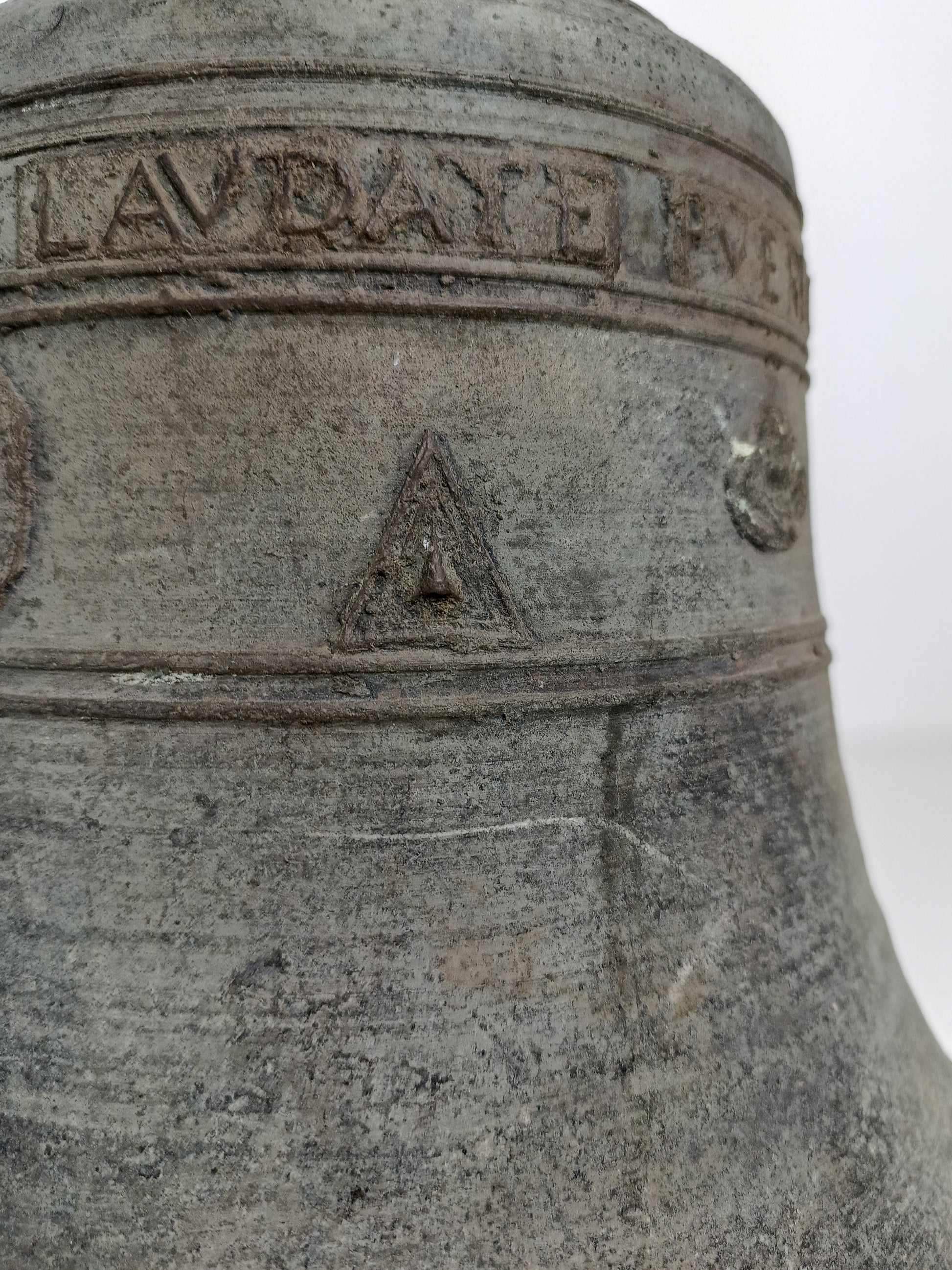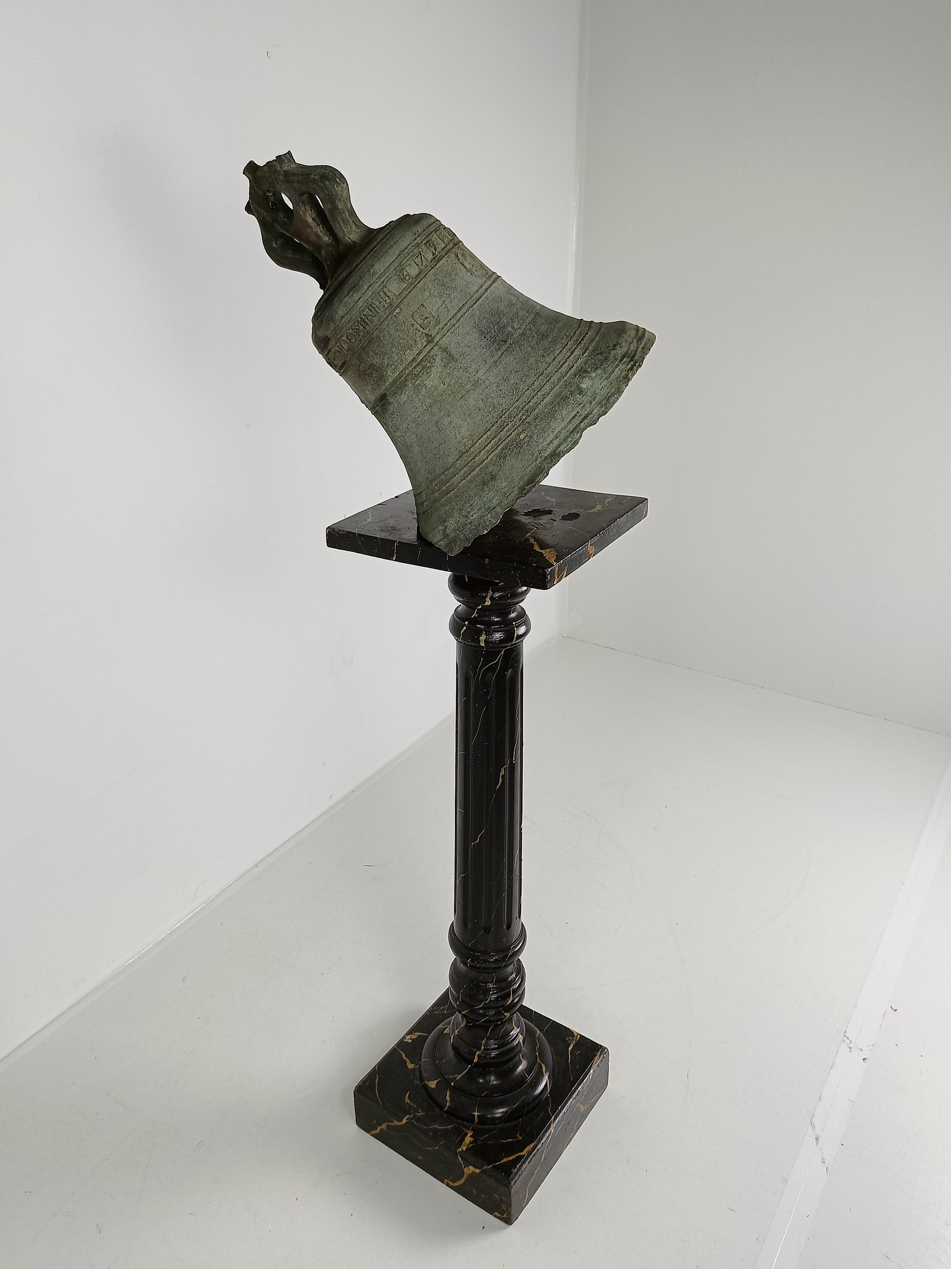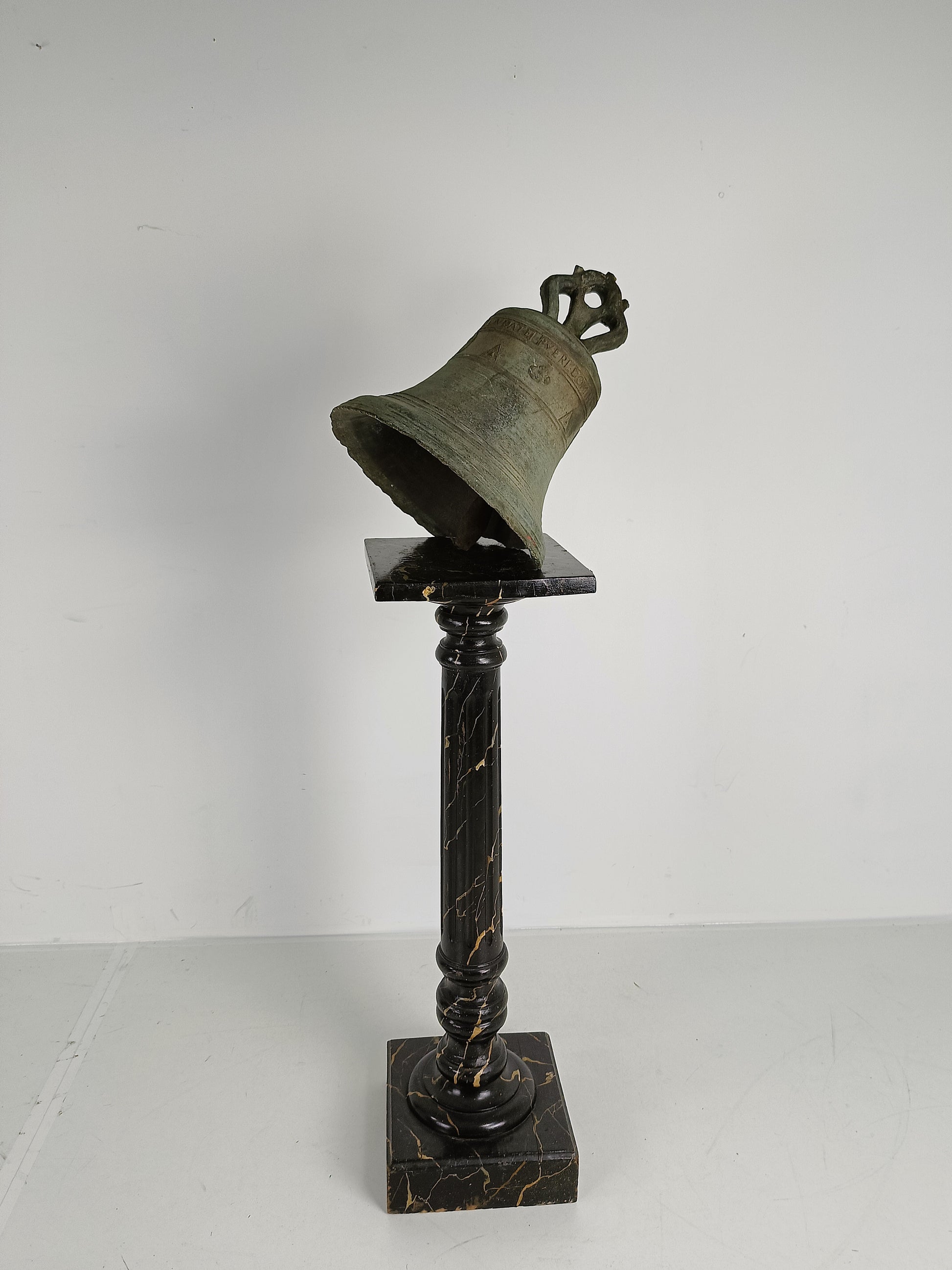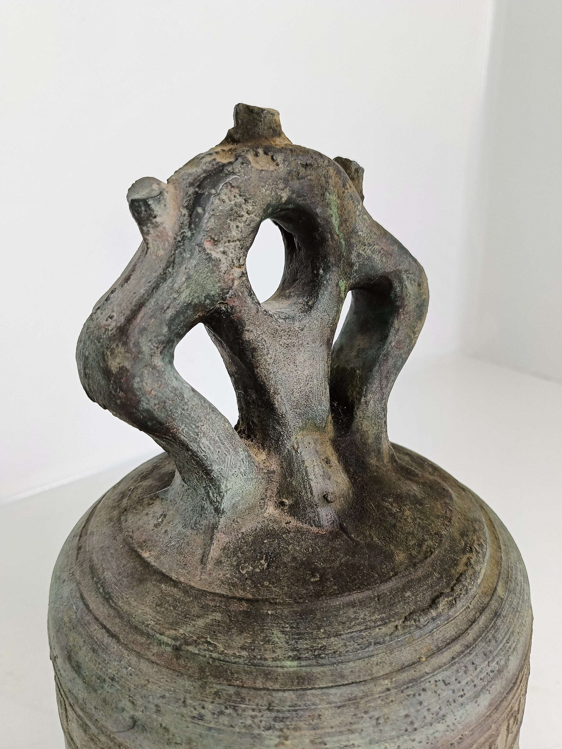 An antique church bell is a historical piece often made of bronze and cast in various sizes. These bells date back centuries and typically feature unique inscriptions, often in Latin, that reflect religious sentiments, the names of benefactors, or dedications to saints. These bells were usually cast by skilled craftsmen, and their age, craftsmanship, and inscriptions make them valuable artifacts that provide insights into the religious and cultural history of the period. Has signs of wear shown on pictures. Wonderful decorative object.