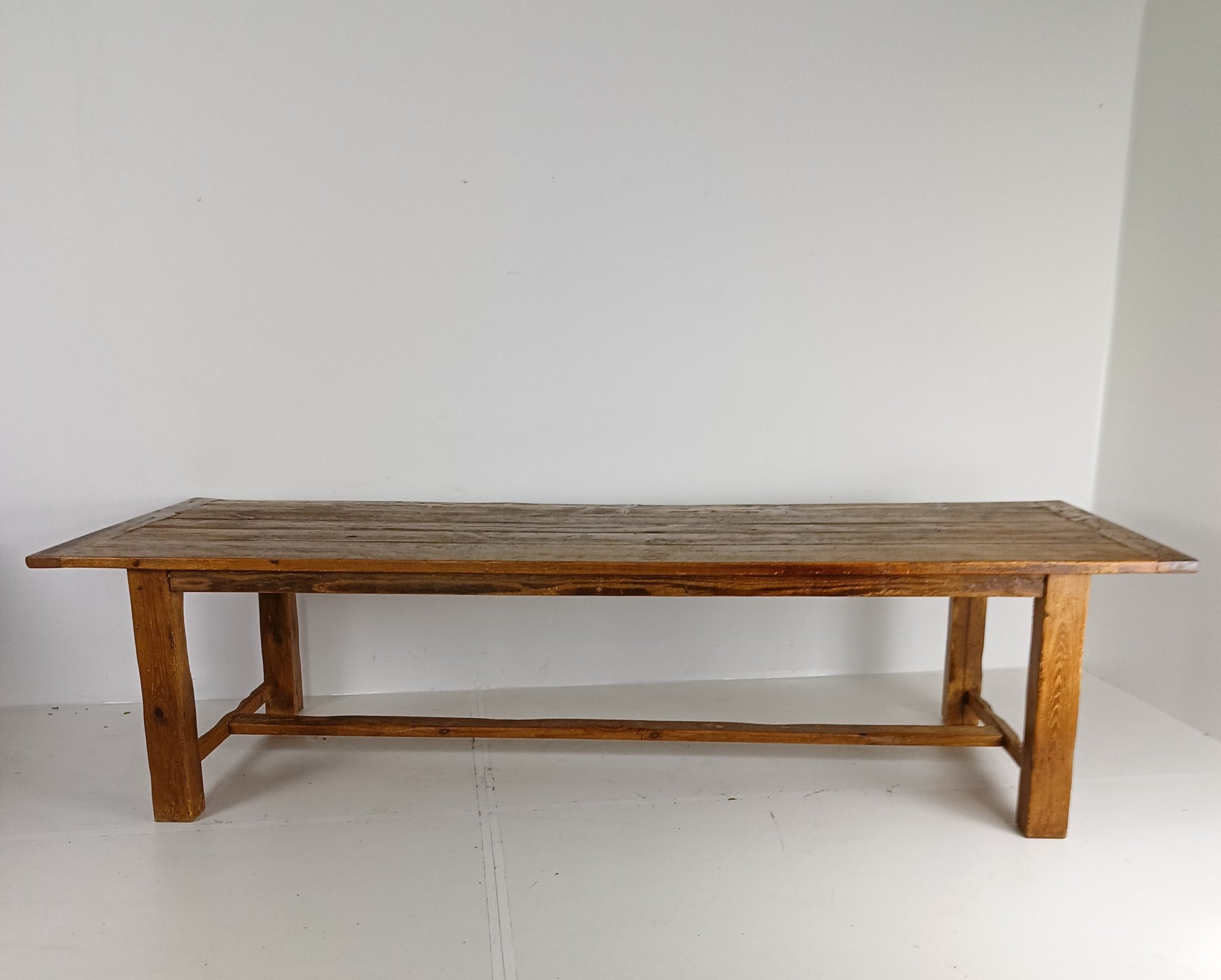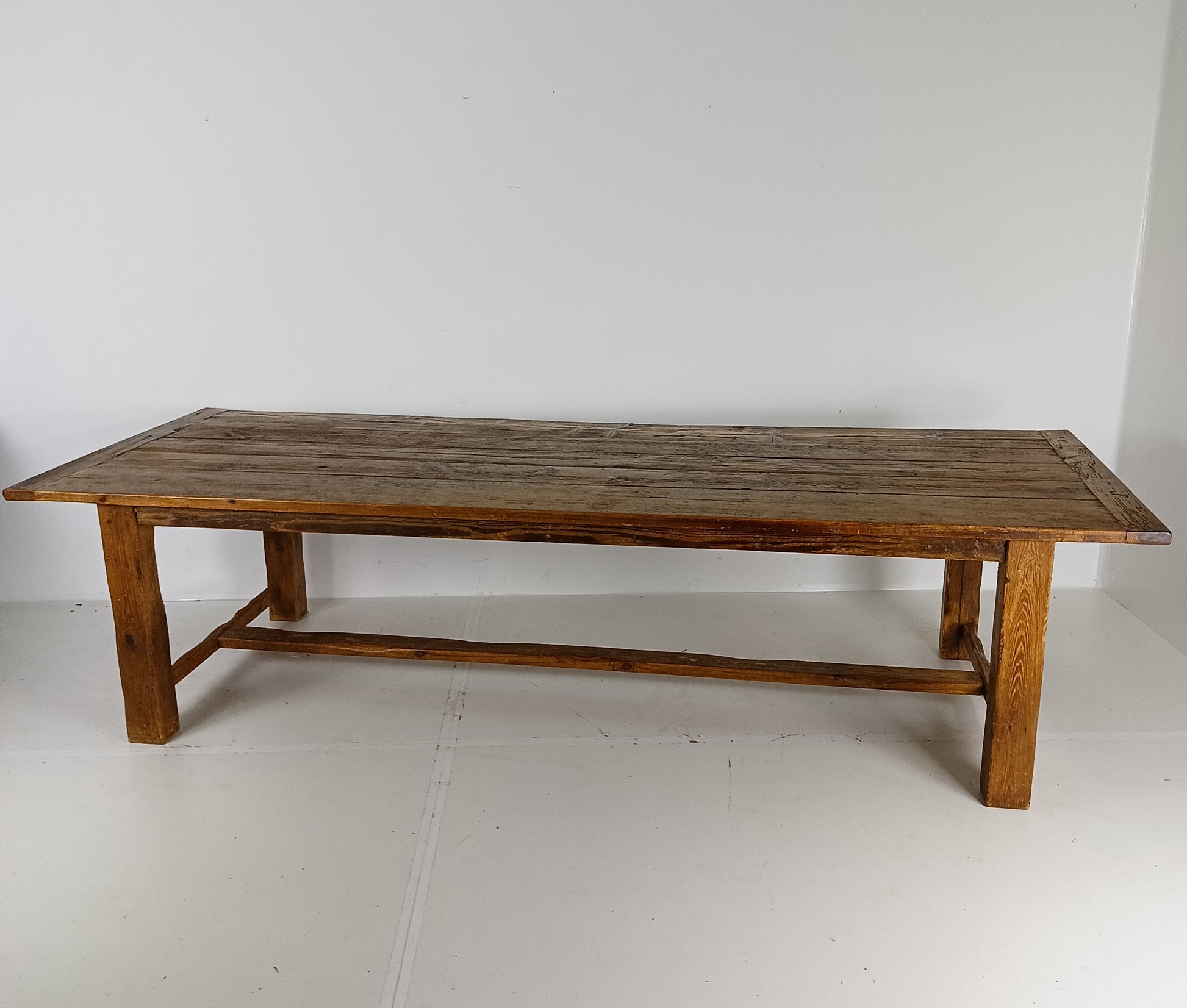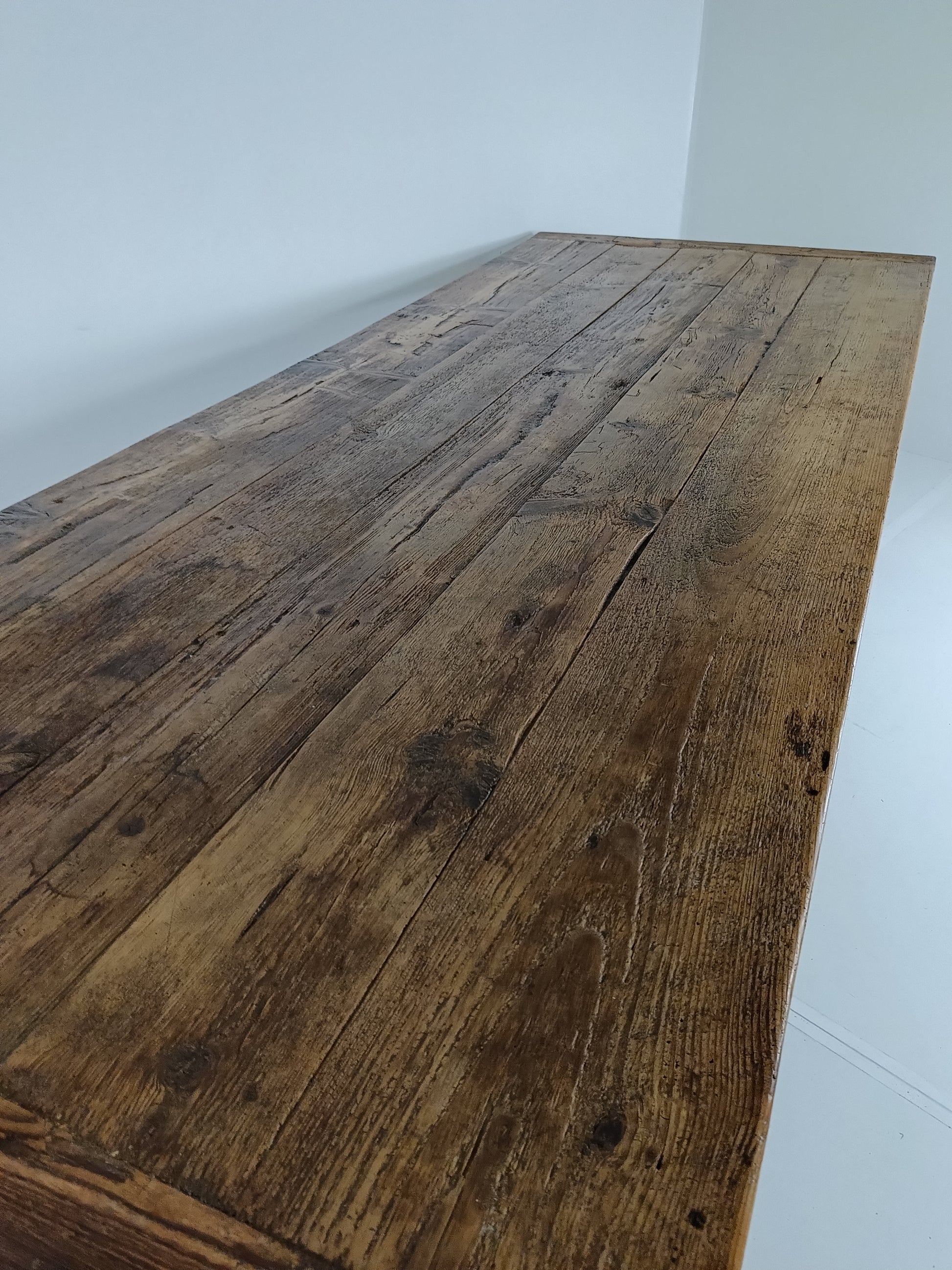 This amazing large wooden dining table would make a stunning piece in the dining room. Its weathered patina, a testament to years of dedicated service. Though worn by age and usage, its enduring charm captivates, adding an authentic touch of history to any space. Embrace the allure of the past with this storied piece, a testament to craftsmanship and industrial heritage.