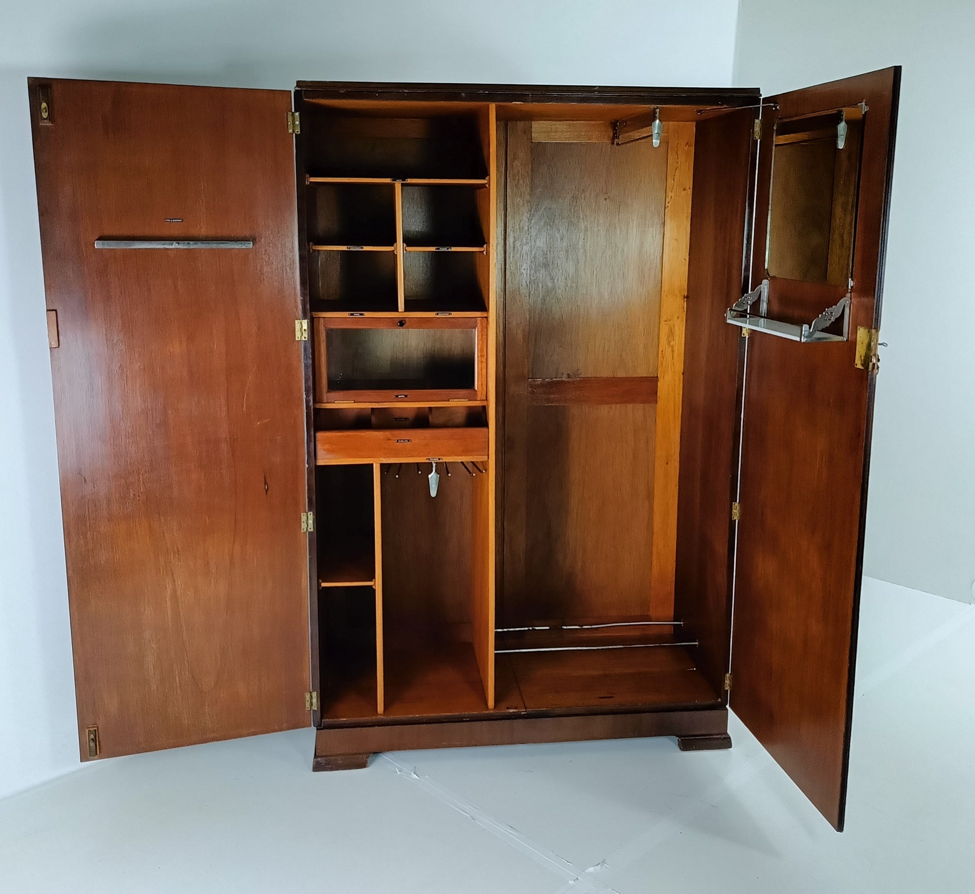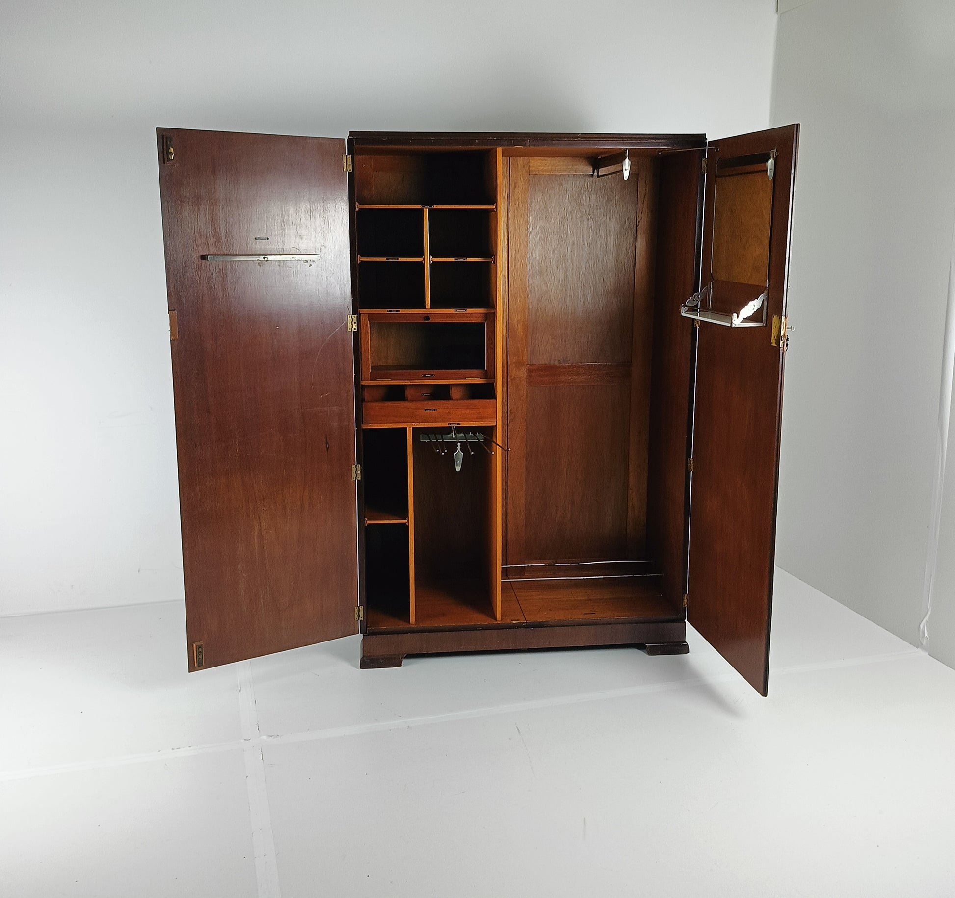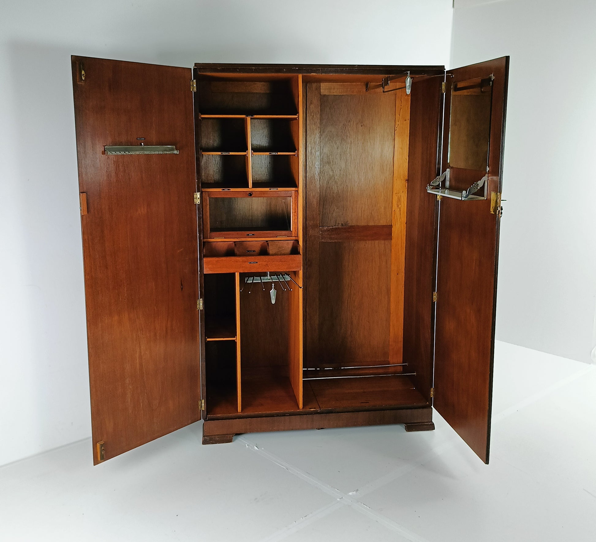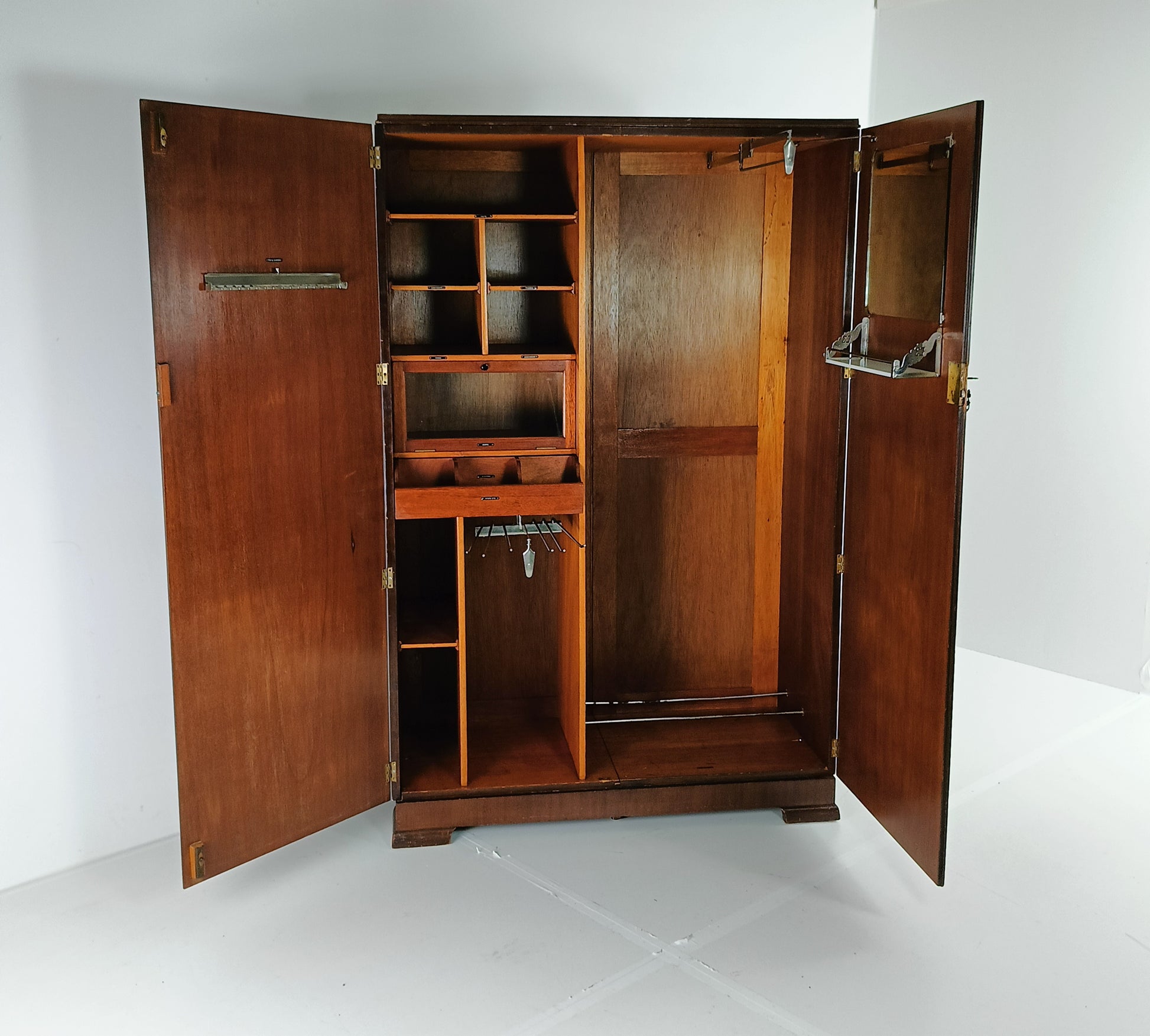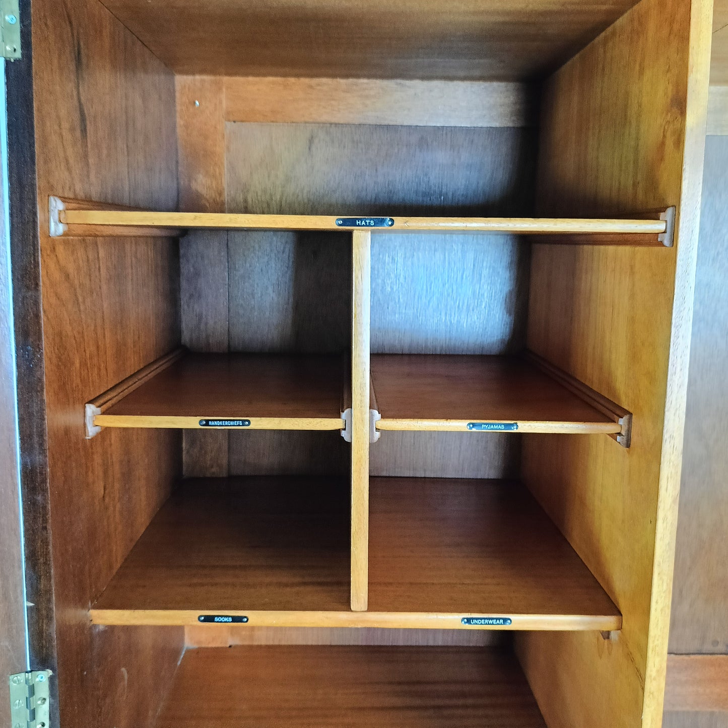 The cabinet has a sleek design but is at the same time elegantly finished with burl walnut veneer. With a handy, compact interior layout with compartments on the right side and an extendable rod on the left. With labels including hats, hankerchiefs, socks, underwear, shirts, studs, ties/scarves, shoes etc.