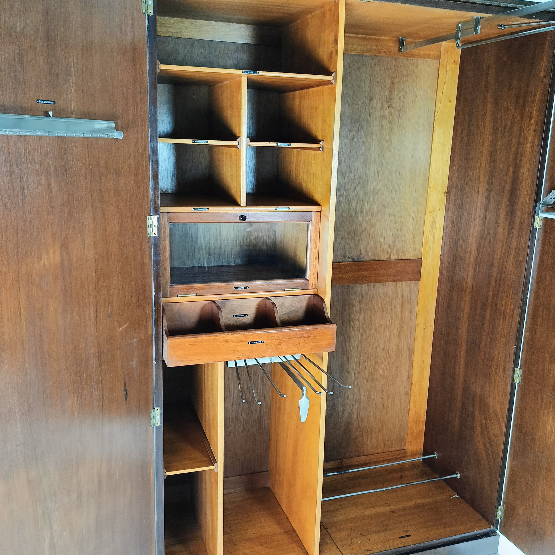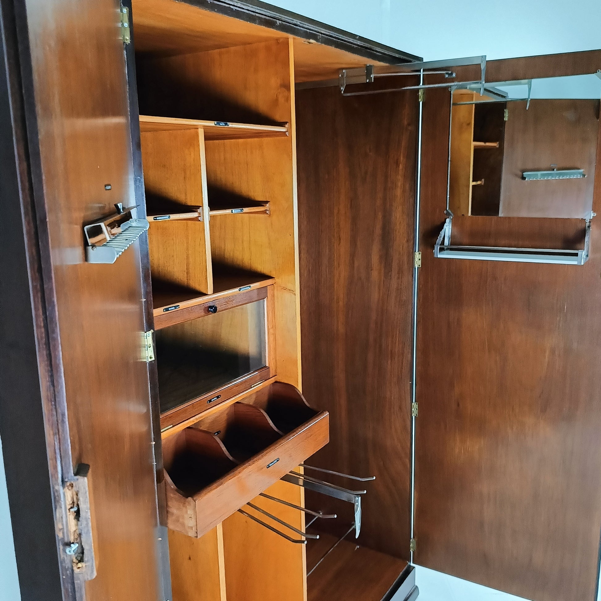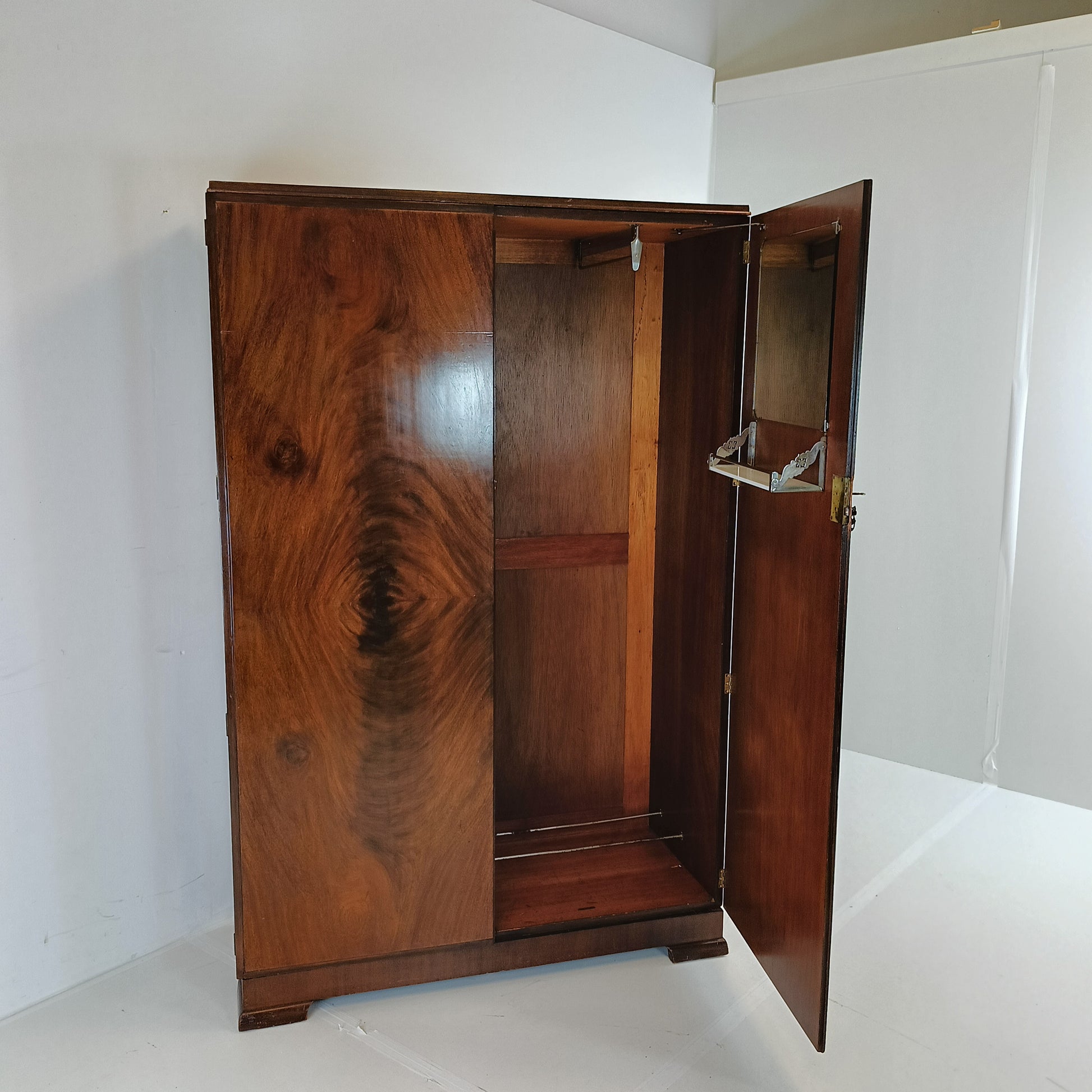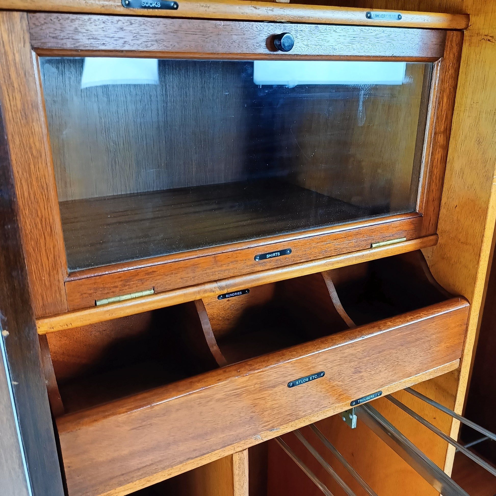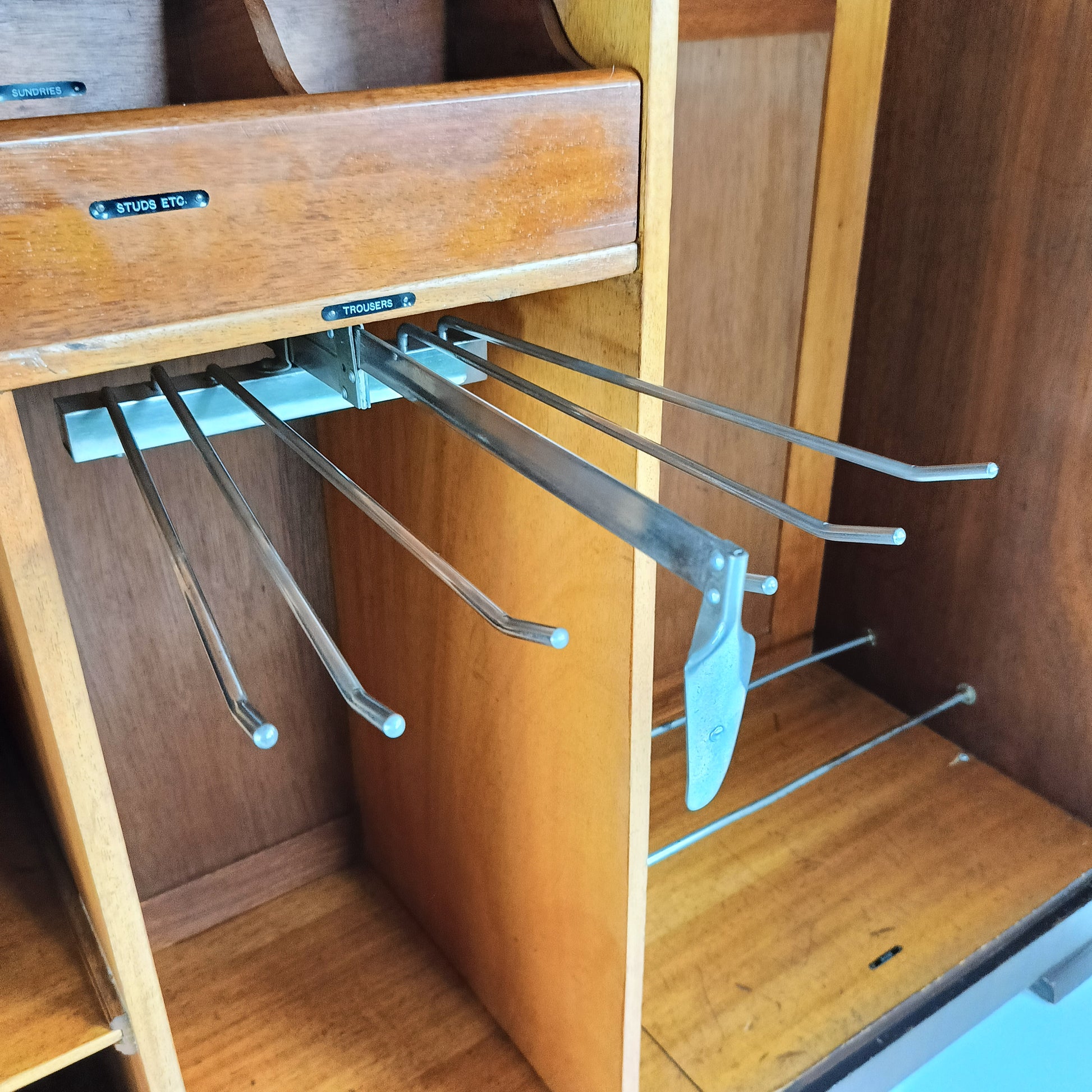 The cabinet has a sleek design but is at the same time elegantly finished with burl walnut veneer. With a handy, compact interior layout with compartments on the right side and an extendable rod on the left. With labels including hats, hankerchiefs, socks, underwear, shirts, studs, ties/scarves, shoes etc.