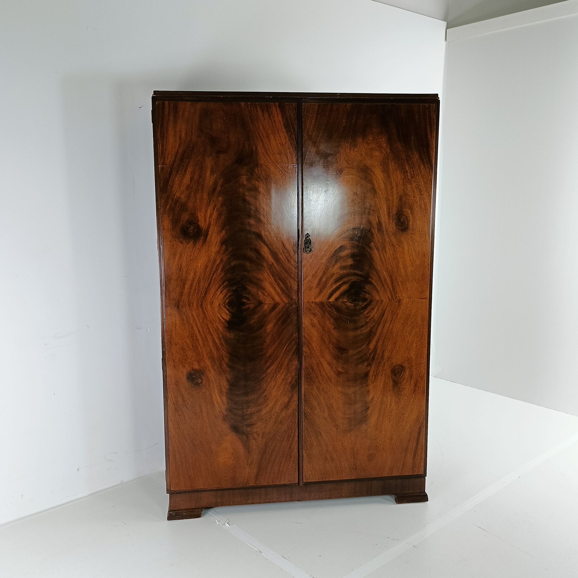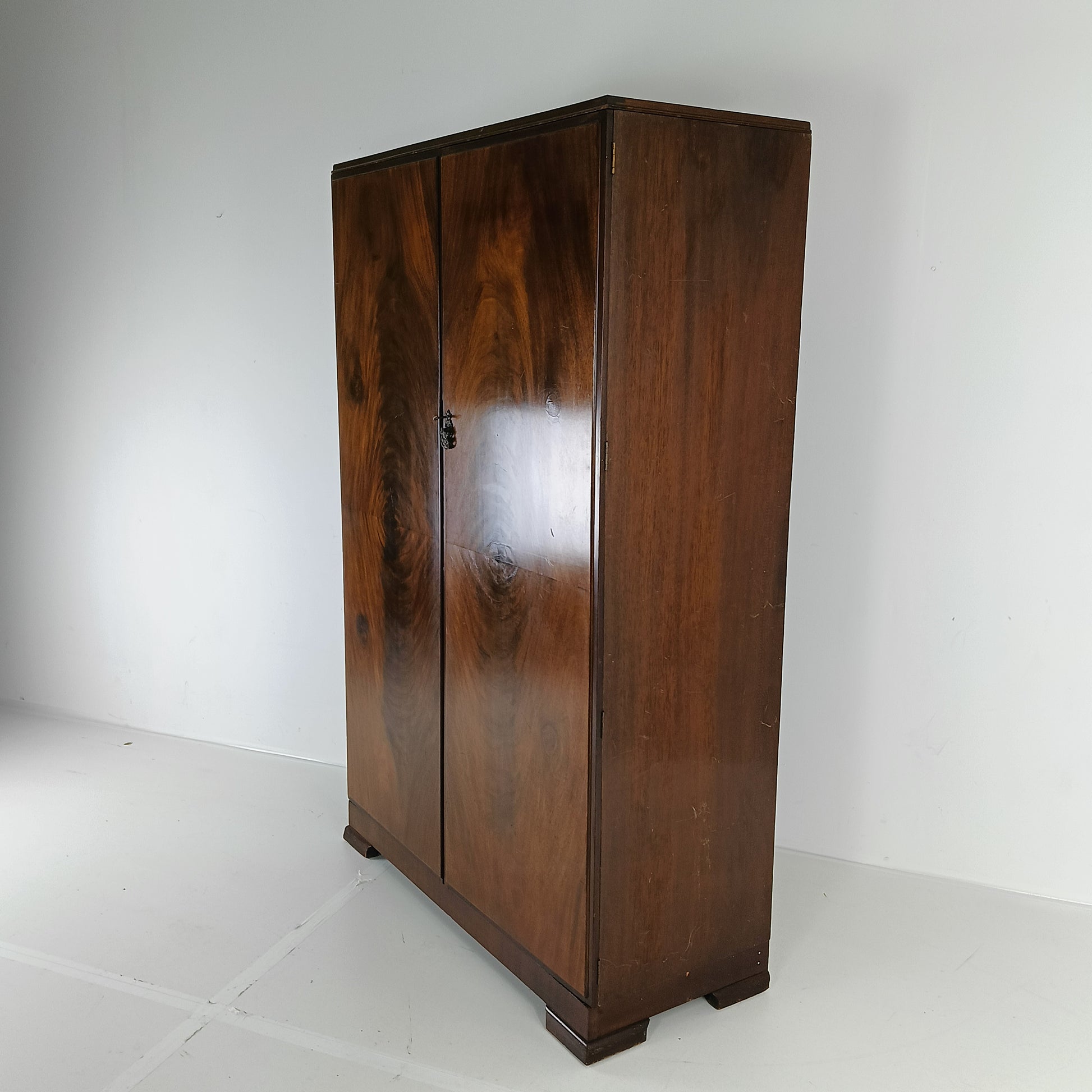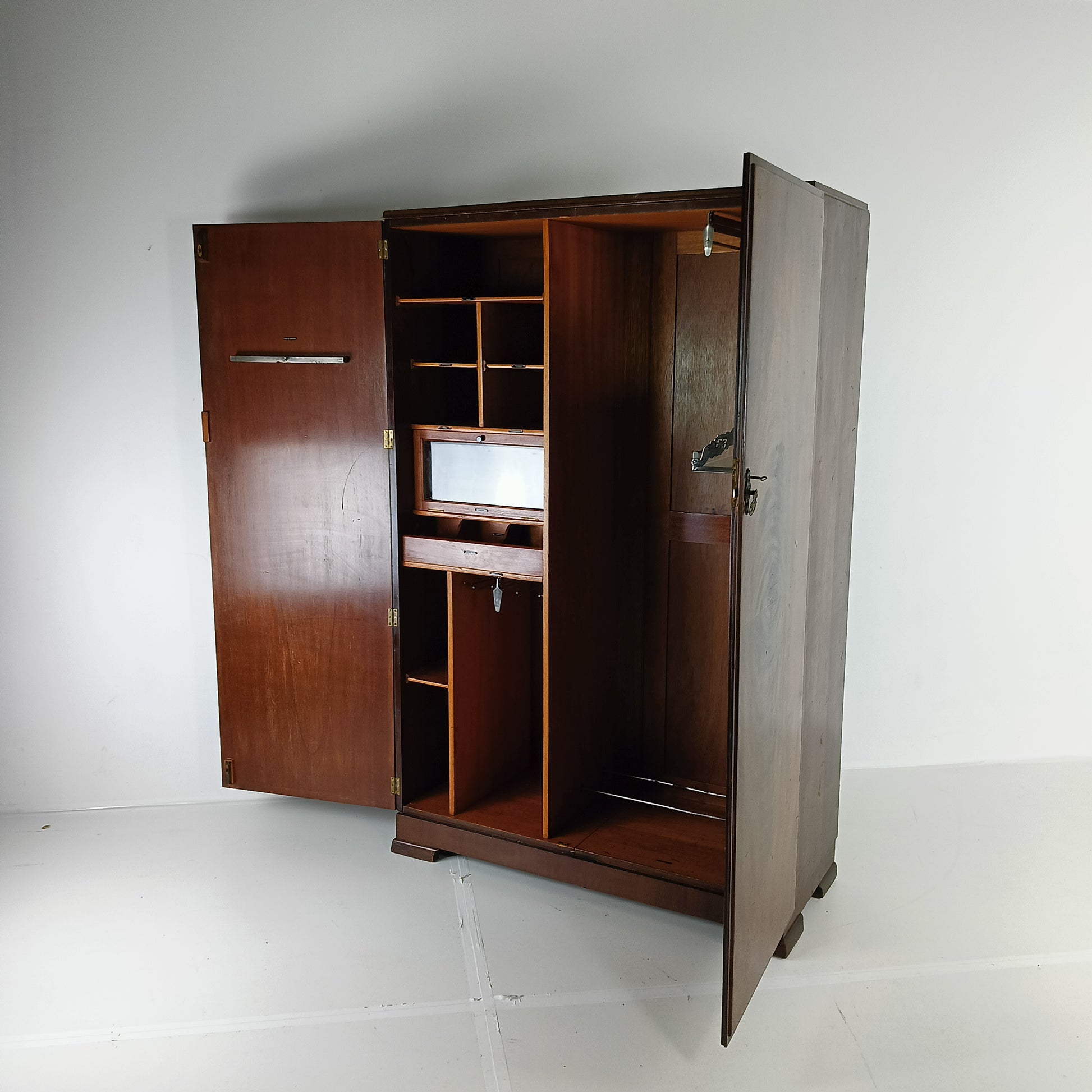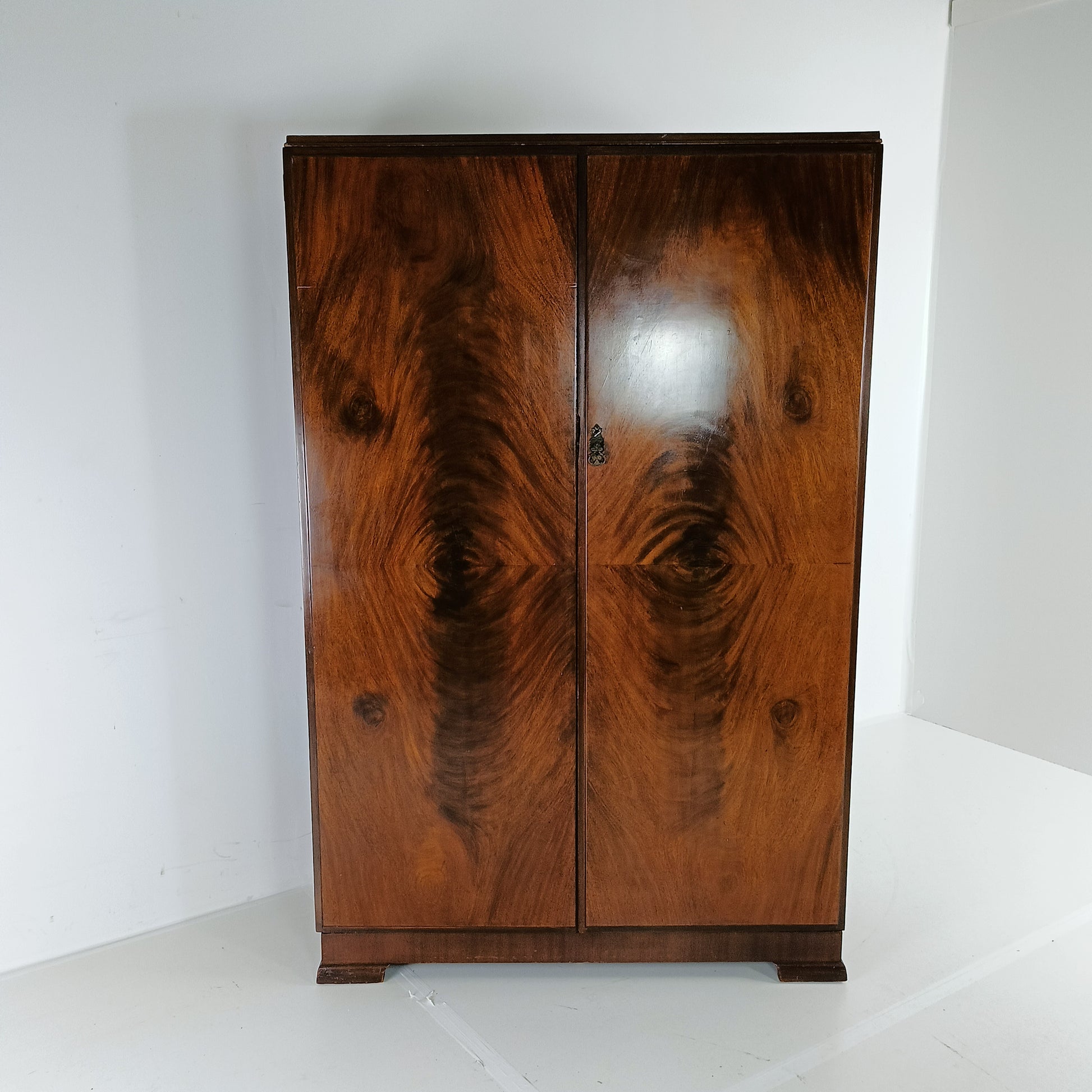 The cabinet has a sleek design but is at the same time elegantly finished with burl walnut veneer. With a handy, compact interior layout with compartments on the right side and an extendable rod on the left. With labels including hats, hankerchiefs, socks, underwear, shirts, studs, ties/scarves, shoes etc.