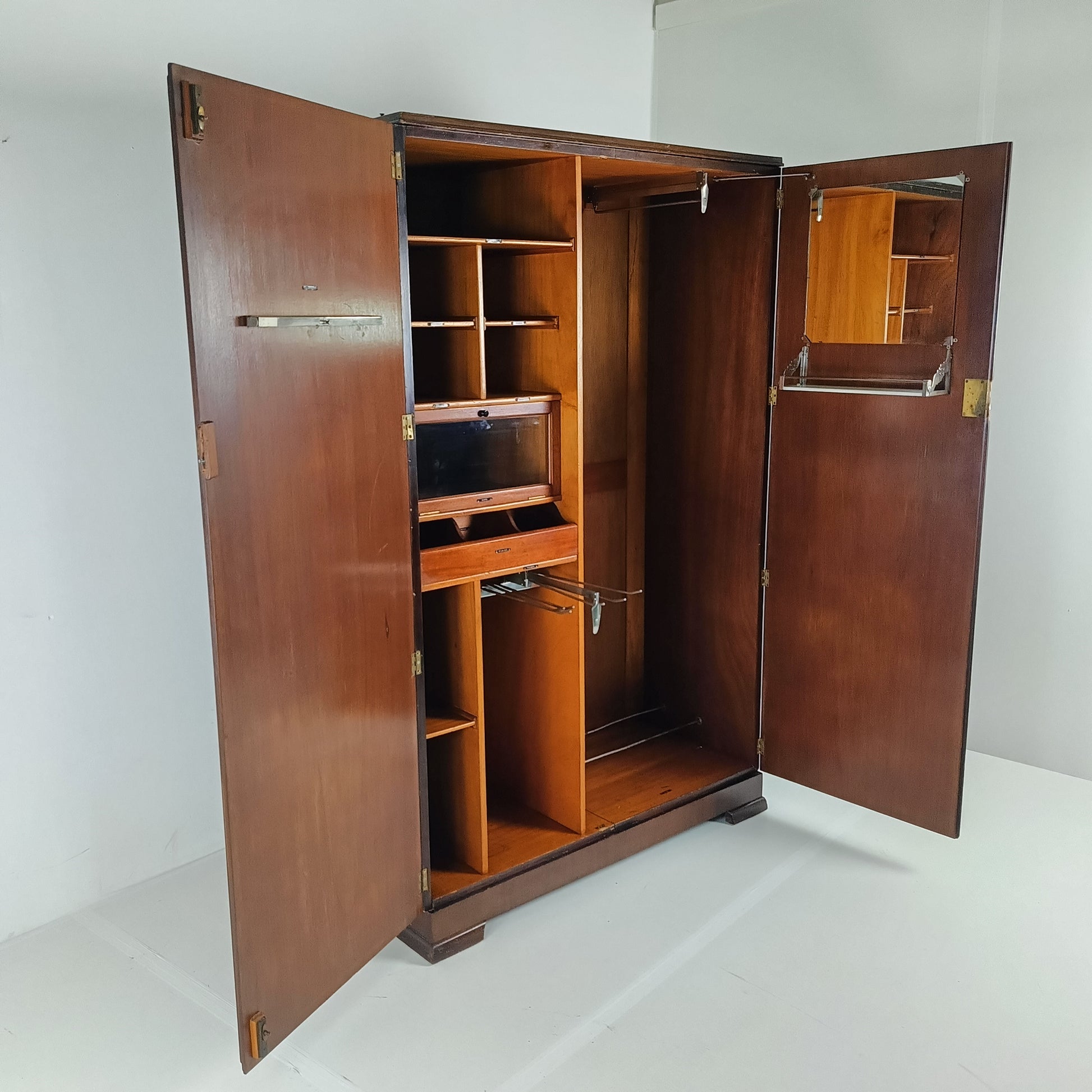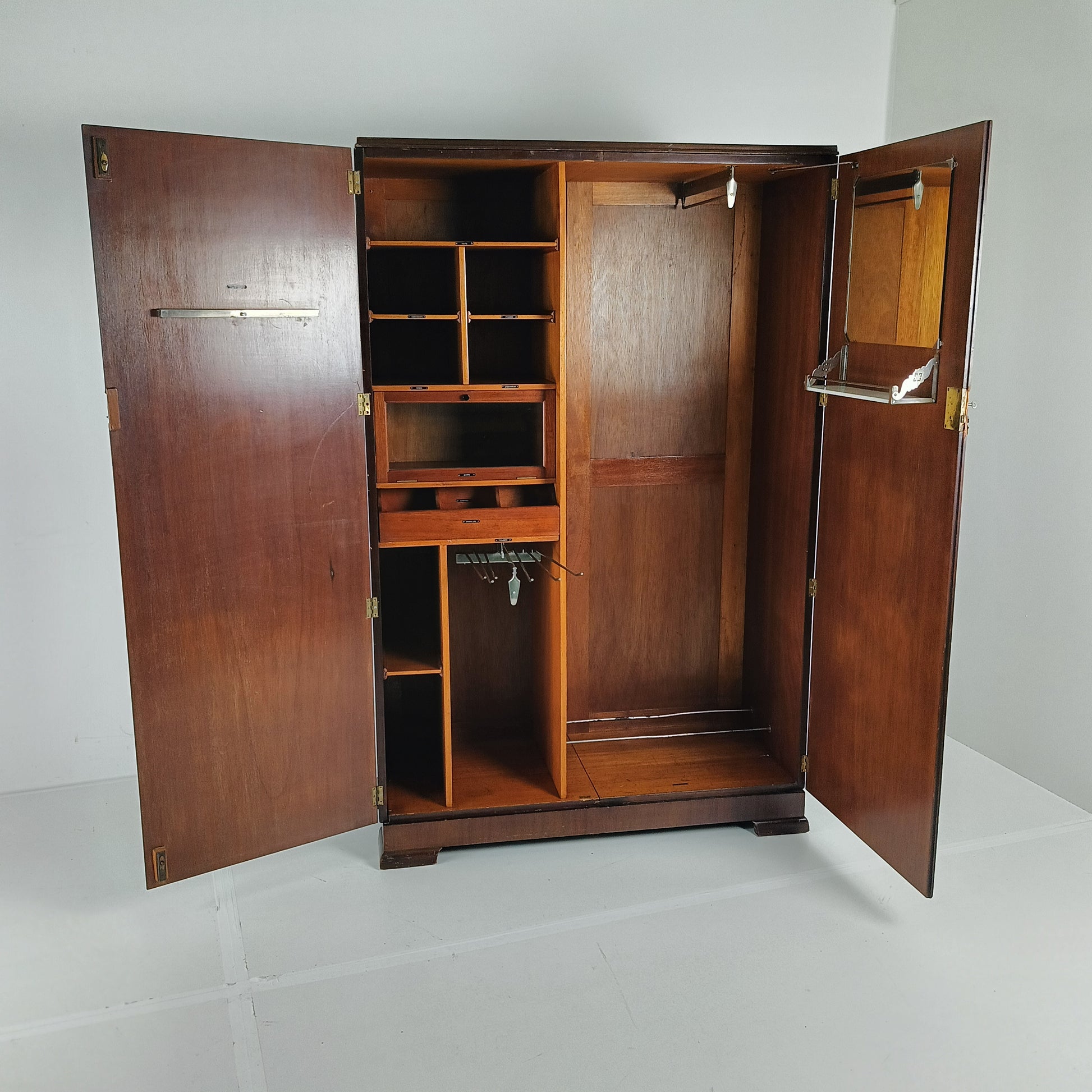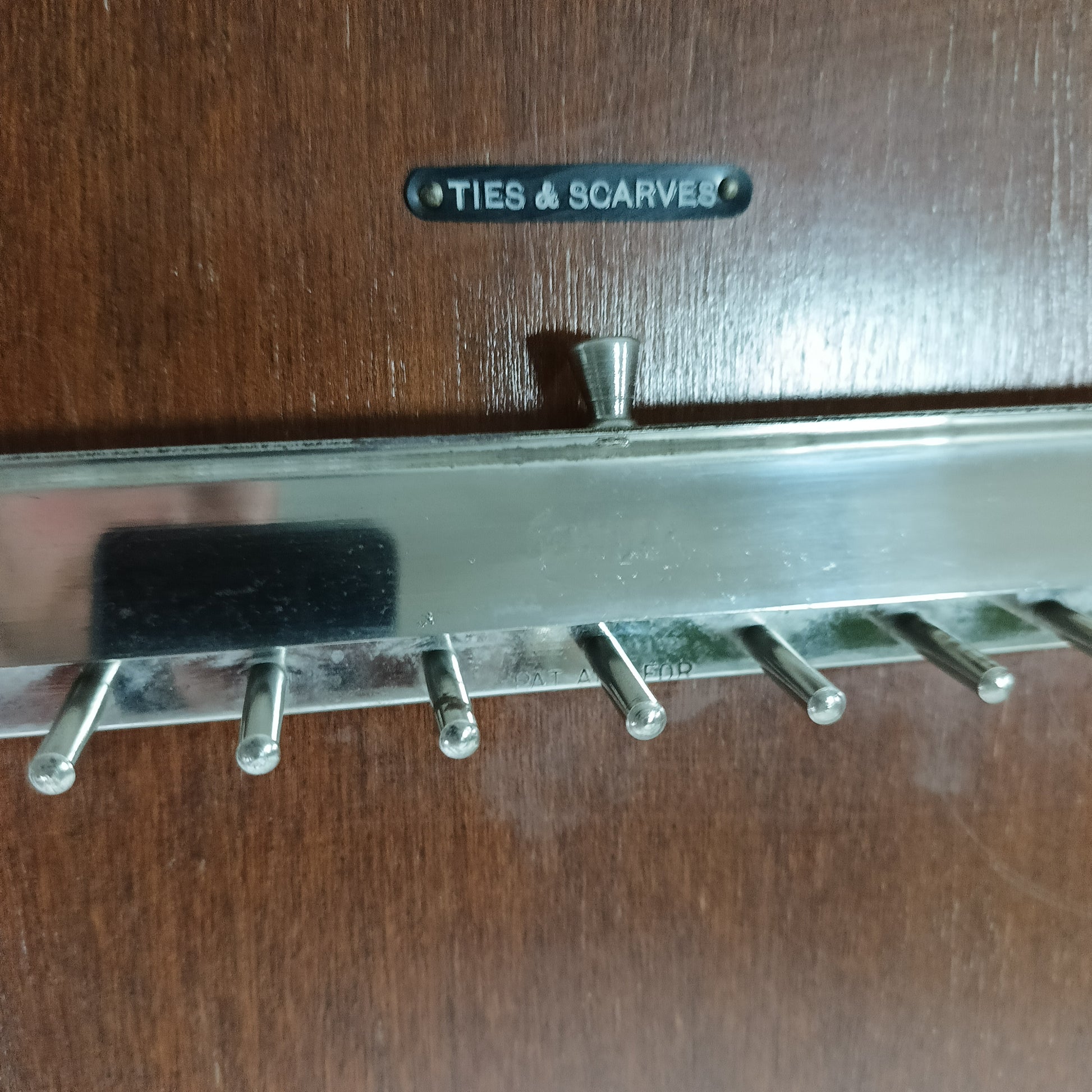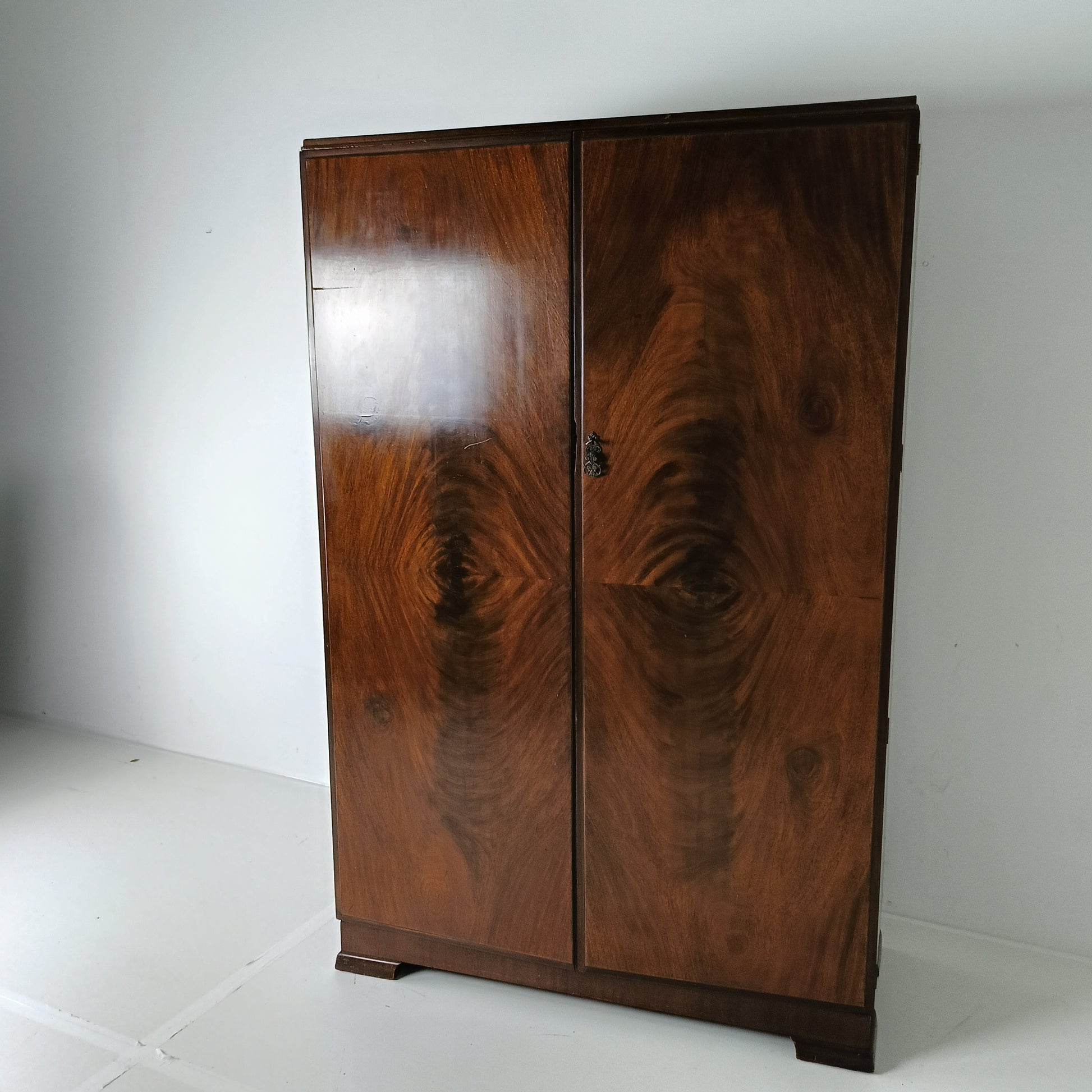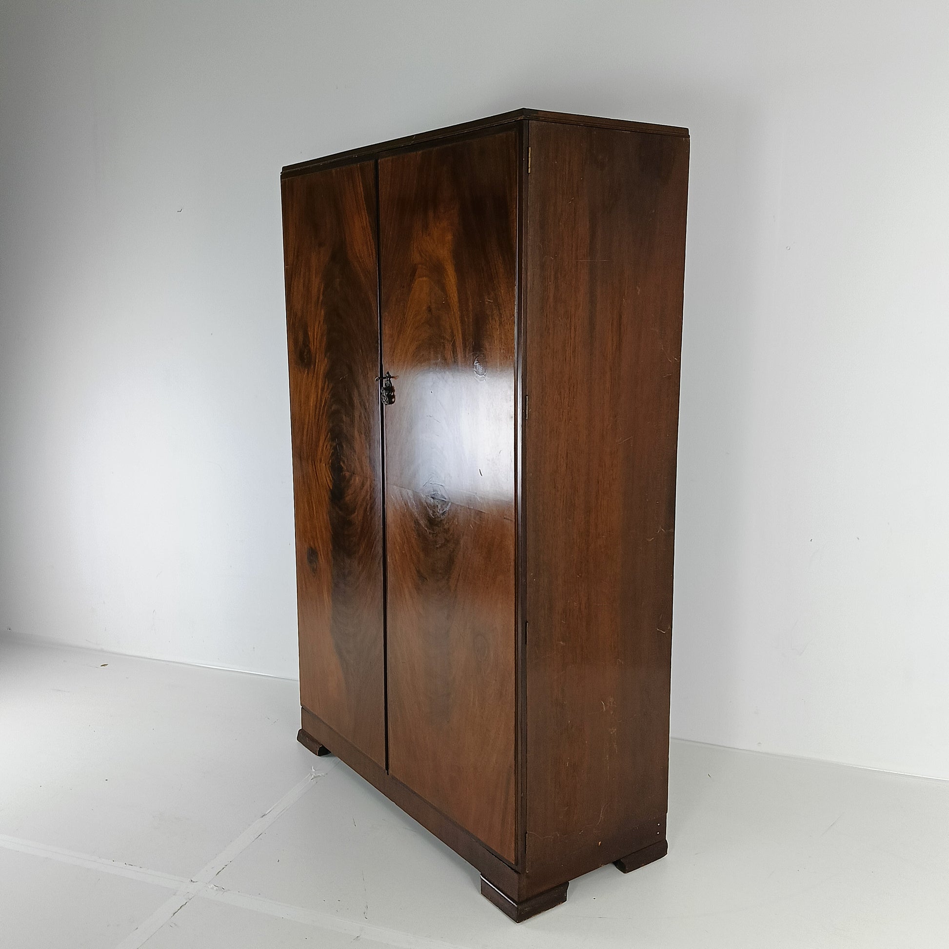 The cabinet has a sleek design but is at the same time elegantly finished with burl walnut veneer. With a handy, compact interior layout with compartments on the right side and an extendable rod on the left. With labels including hats, hankerchiefs, socks, underwear, shirts, studs, ties/scarves, shoes etc.