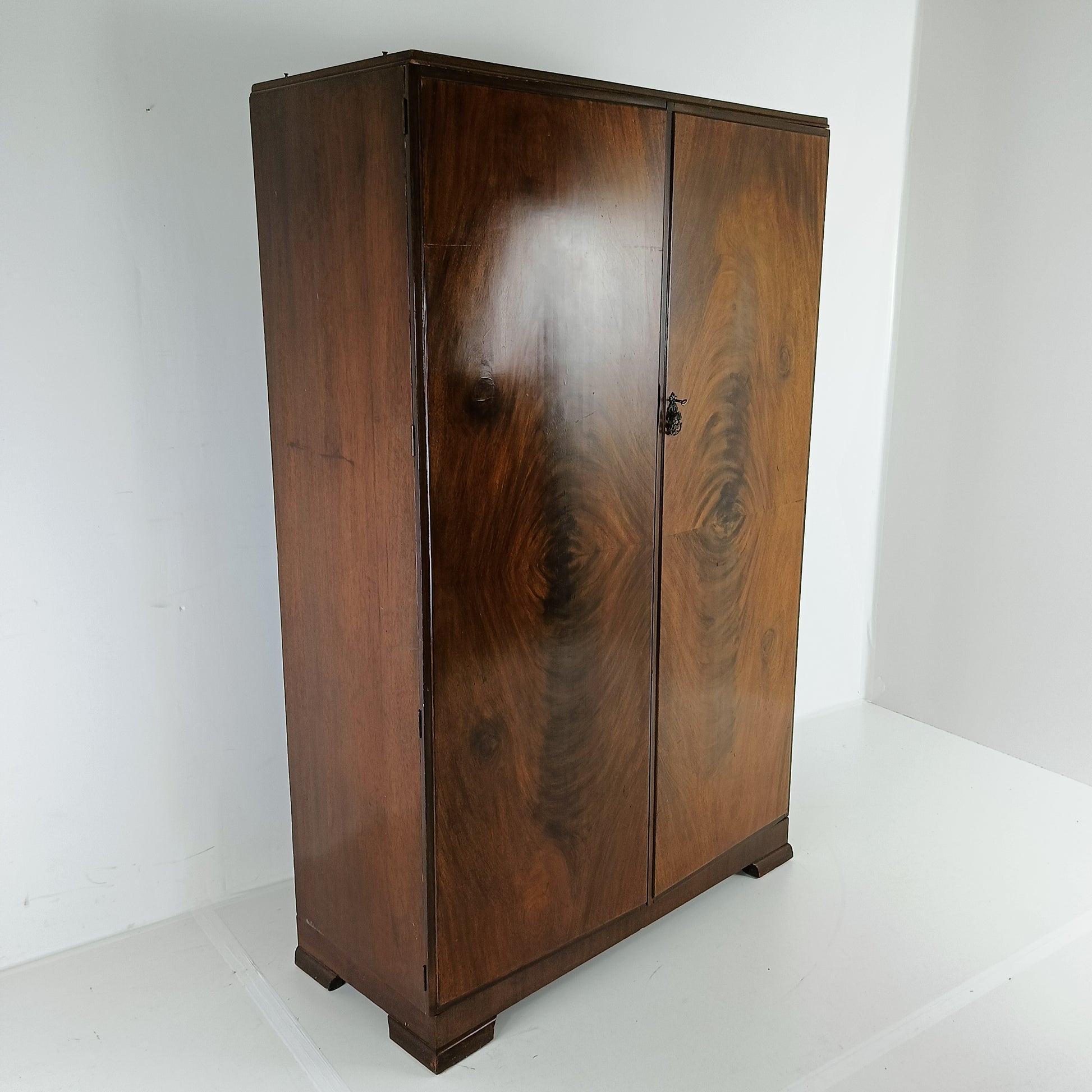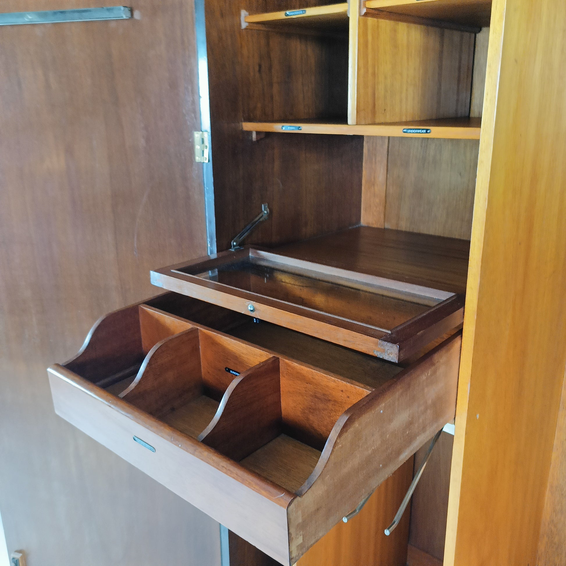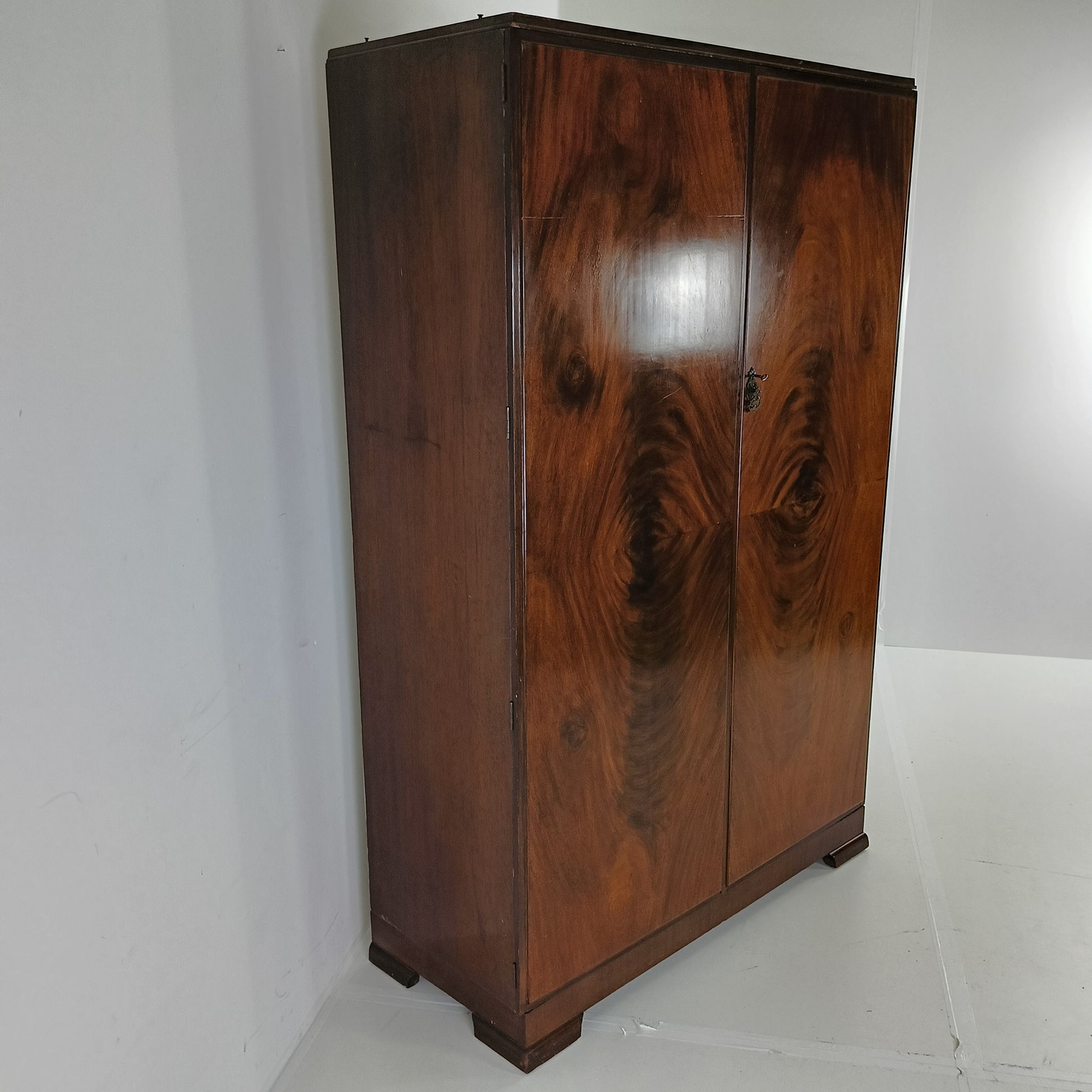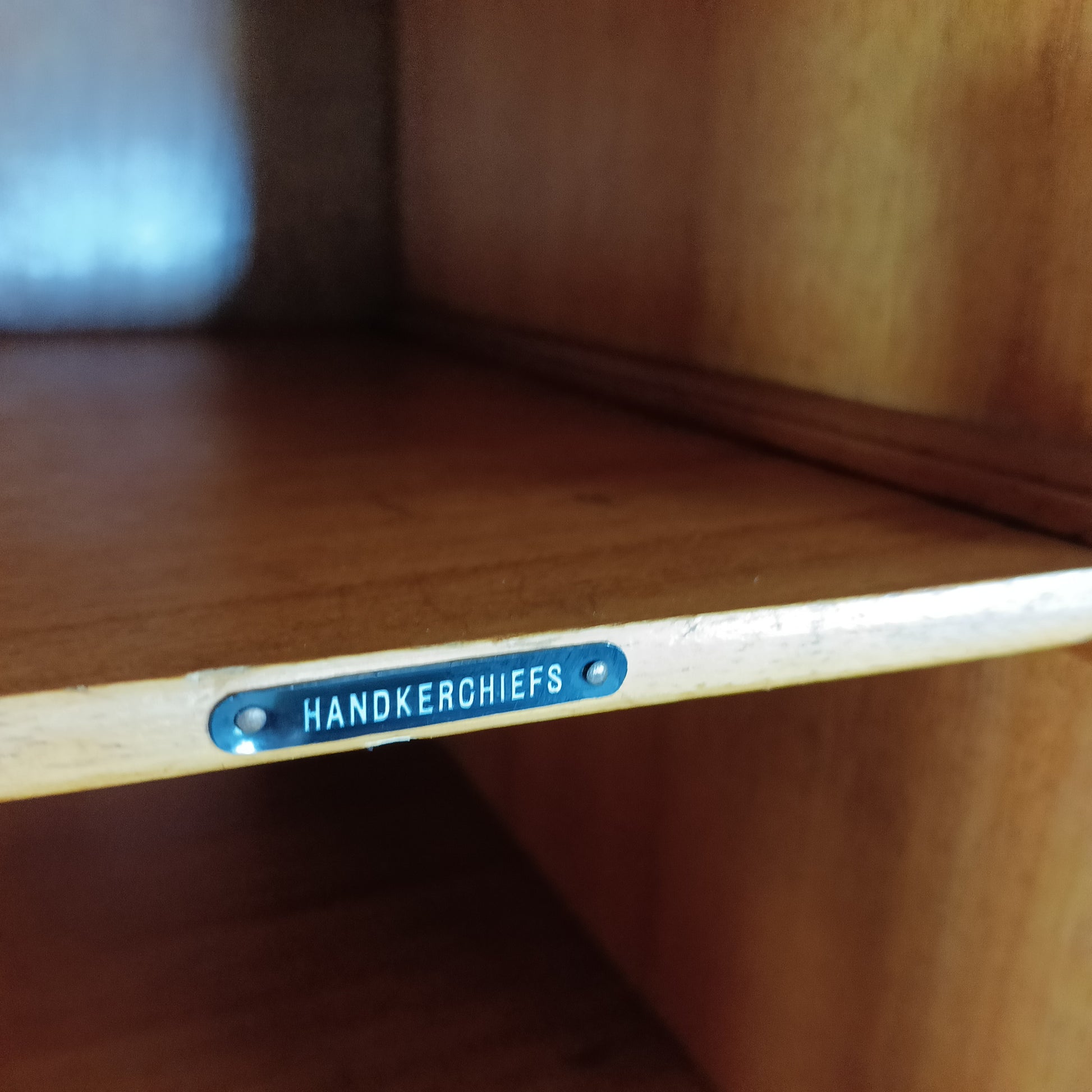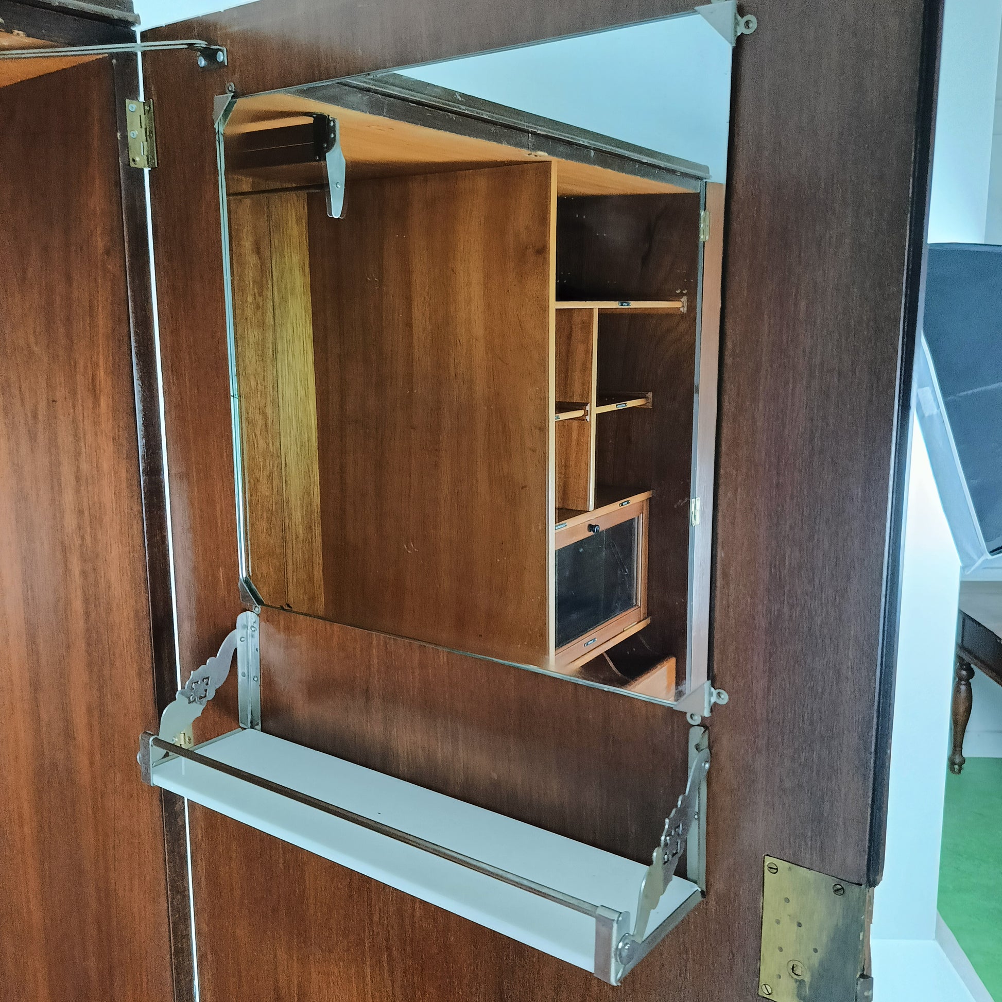 The cabinet has a sleek design but is at the same time elegantly finished with burl walnut veneer. With a handy, compact interior layout with compartments on the right side and an extendable rod on the left. With labels including hats, hankerchiefs, socks, underwear, shirts, studs, ties/scarves, shoes etc.