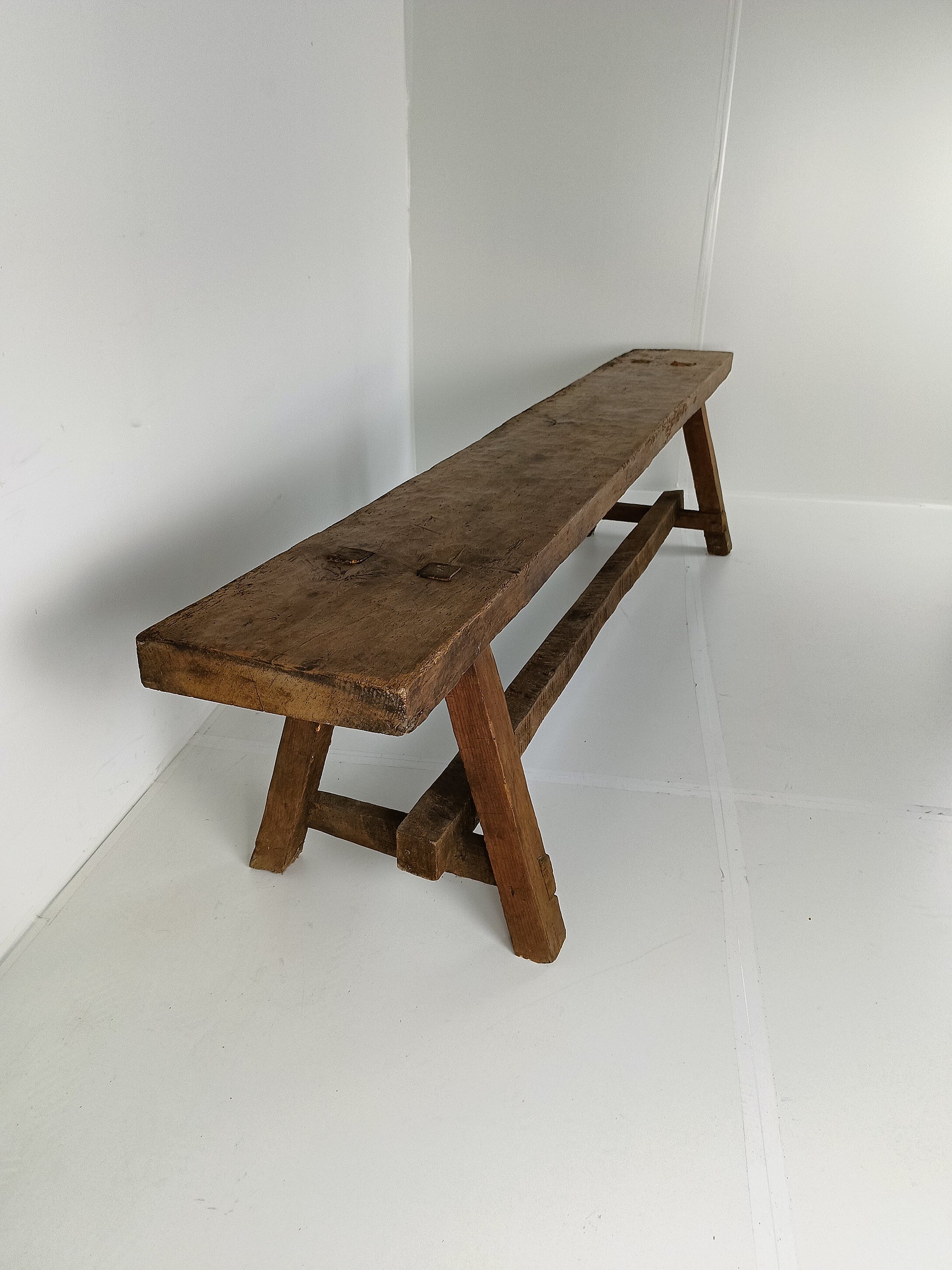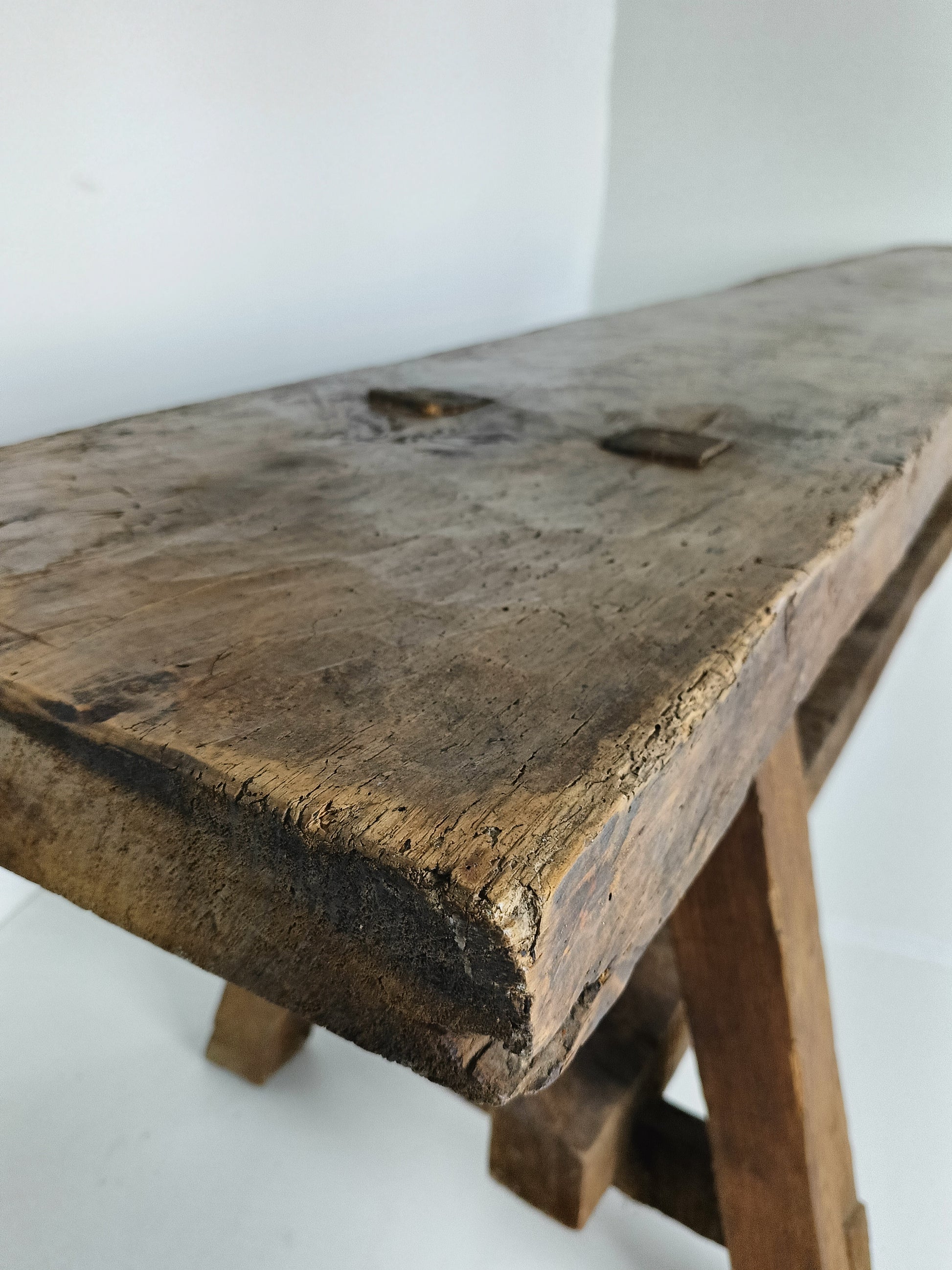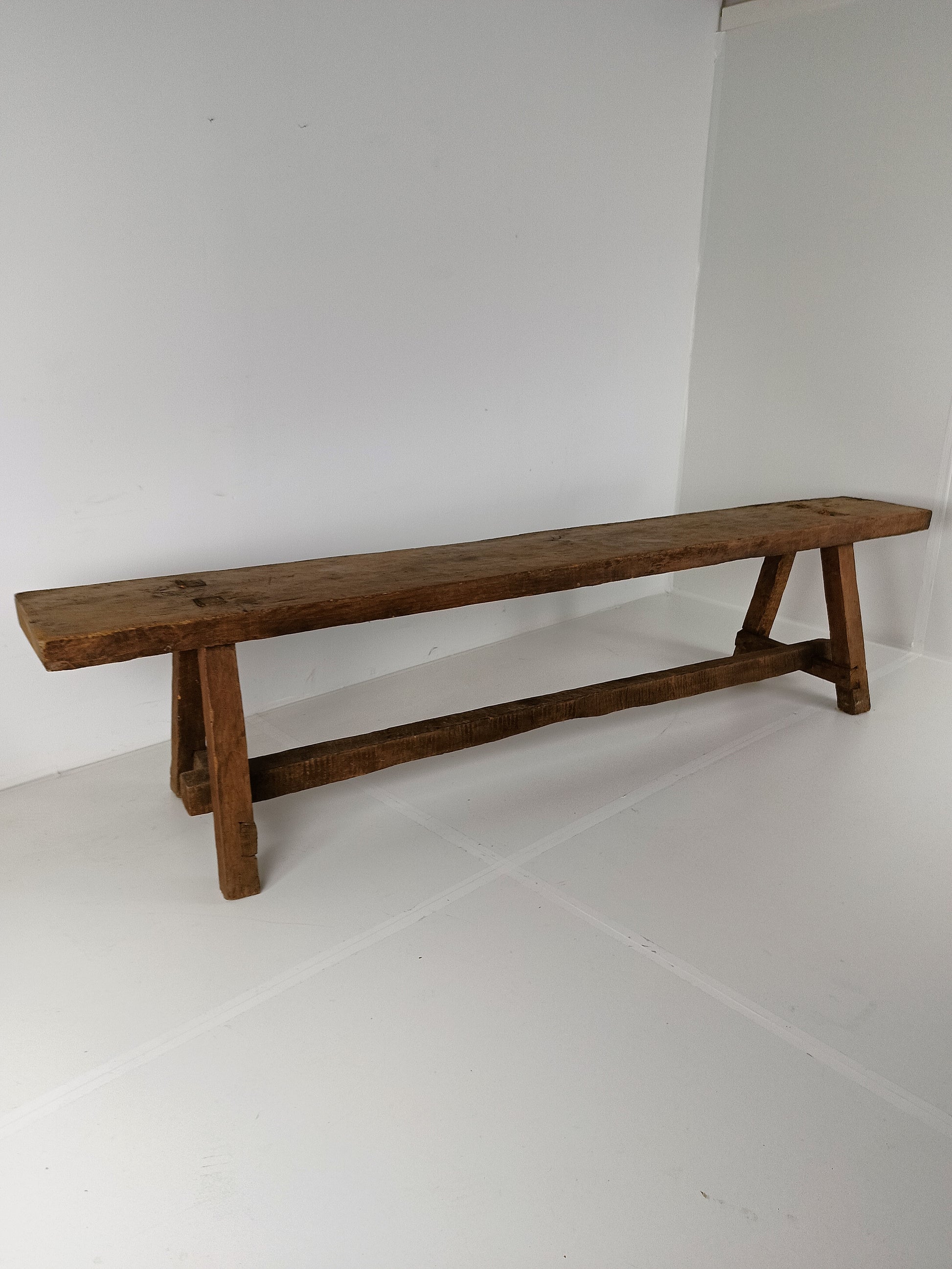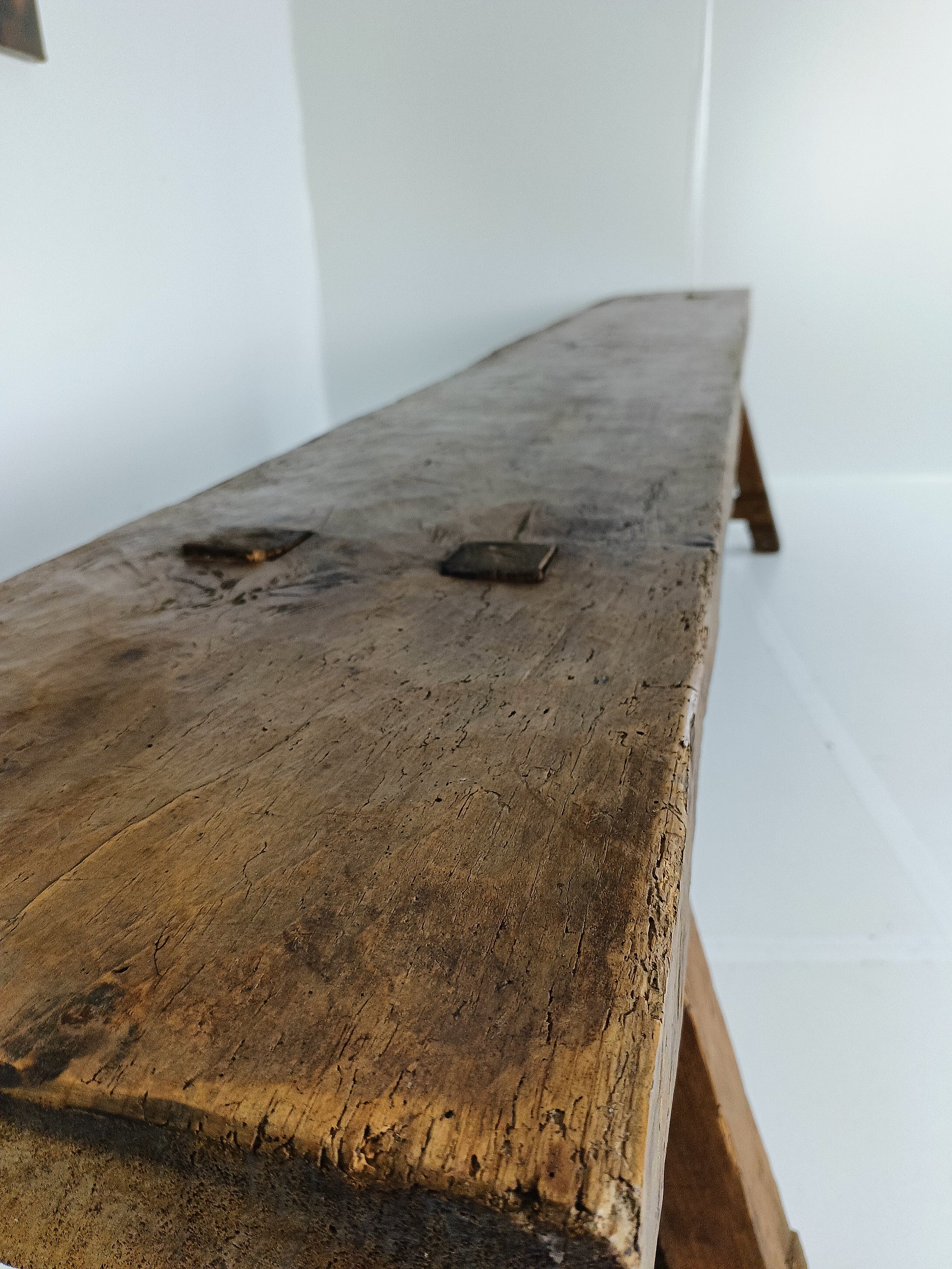 An antique long bench from Guatemala is a captivating piece of furniture that embodies the rich cultural heritage and craftsmanship of the region. Typically made from sturdy hardwoods. . With its aged patina and timeless design, an antique Guatemalan bench serves as both a functional seating solution and a decorative statement, adding a touch of history and elegance to any space. Has signs of wear and patina consistant with age and use.