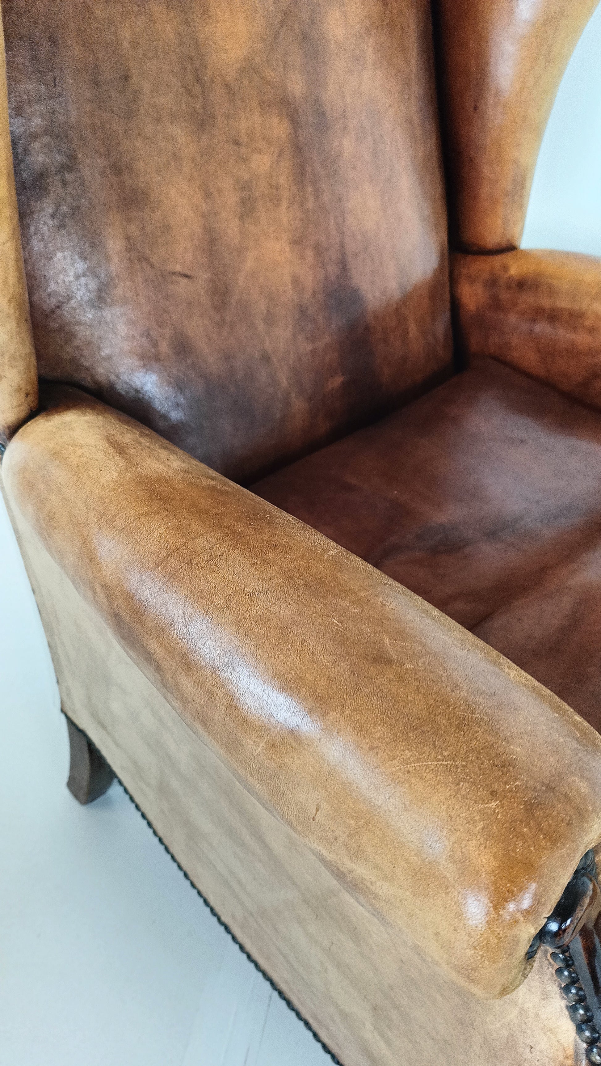 This sheepskin leather chair is in excellent maintained condition. The leather is perfectly preserved and barely shows signs of wear. With its luxurious and soft seating comfort, this chair provides a delightful spot to relax and unwind. Perfect for any space that needs a touch of elegance and comfort.
