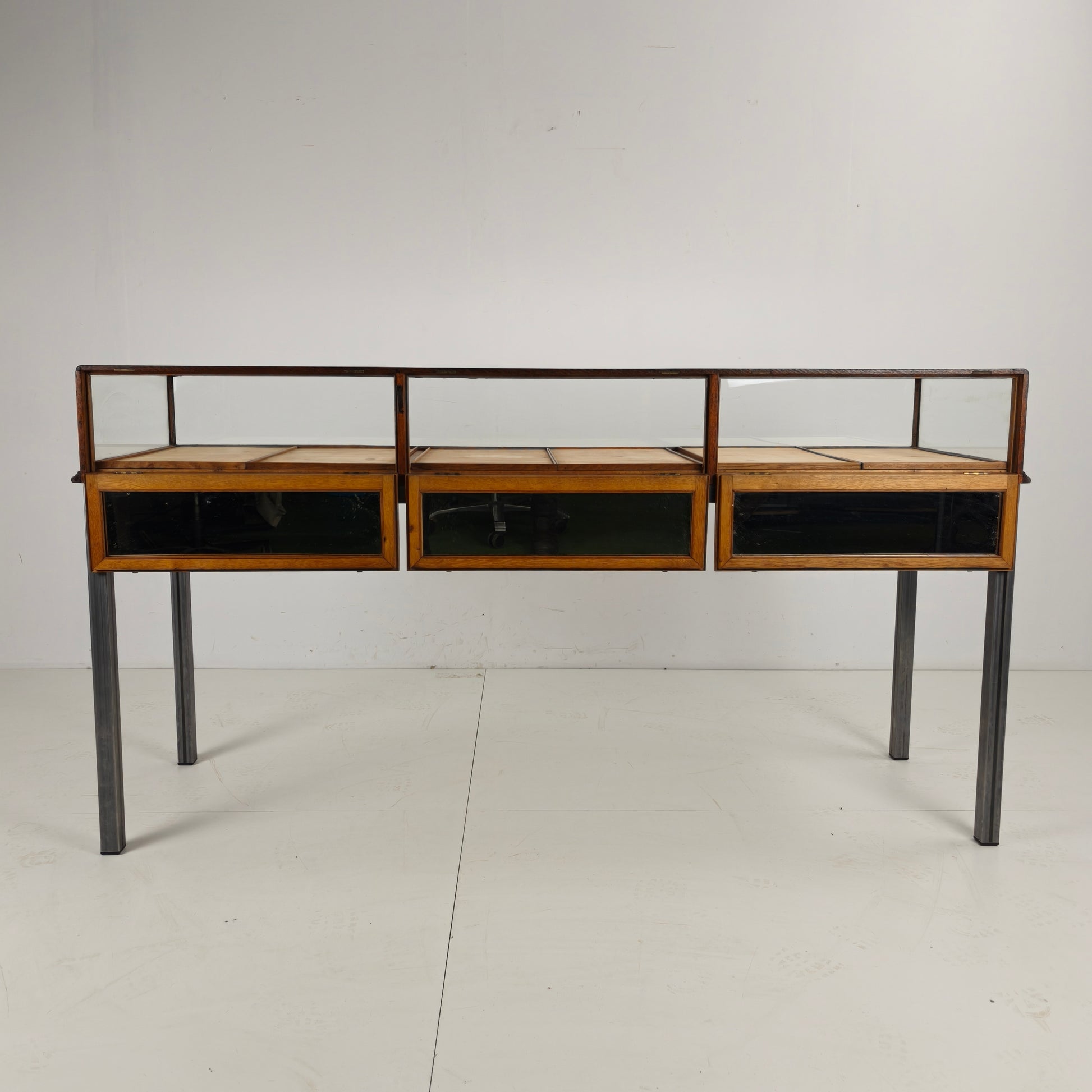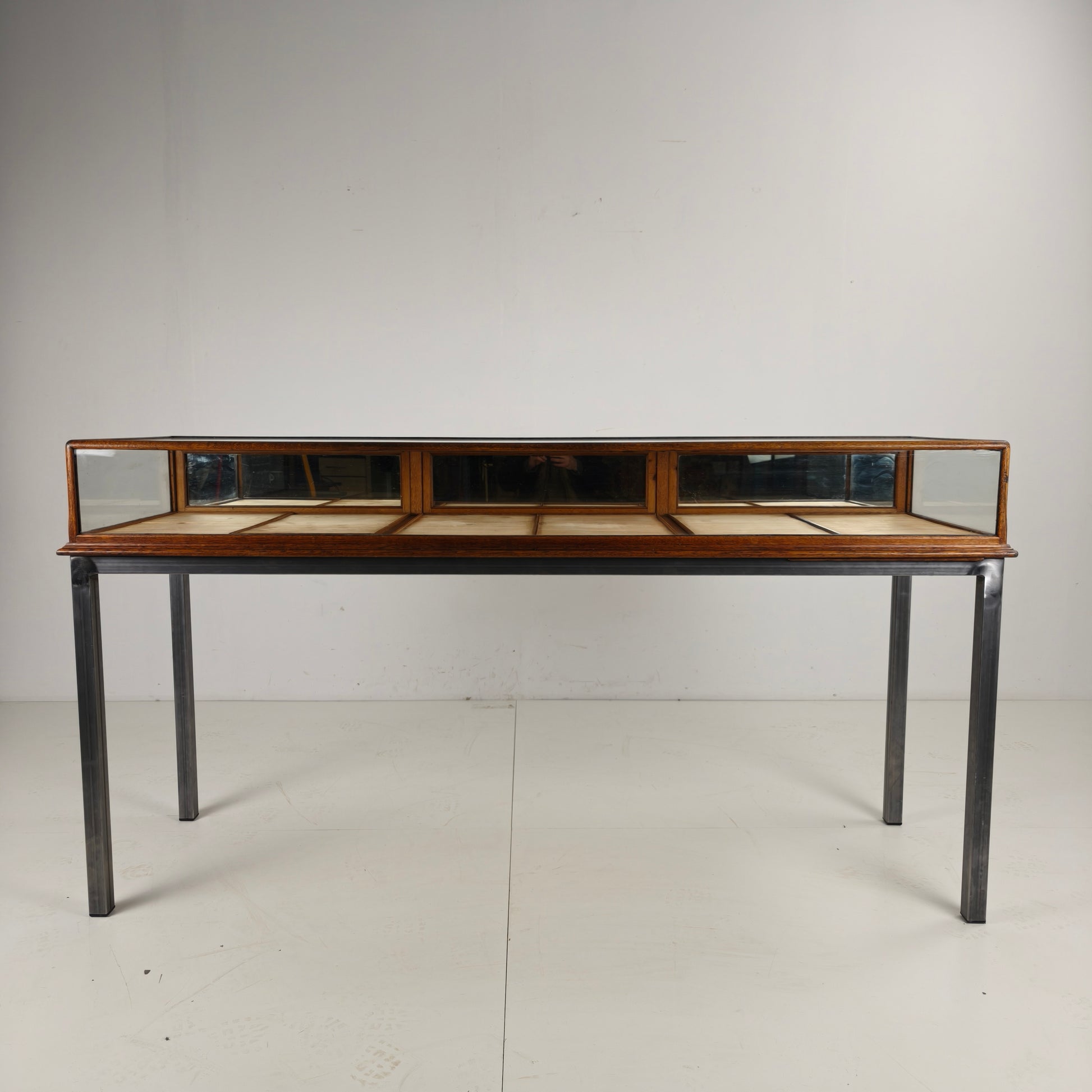Antique 1920s–1930s jeweler’s display counter, crafted in oak and glass, featuring a mirrored interior for elegant presentation. The piece has been professionally fitted with a later stainless steel frame, adding stability while preserving its original character.