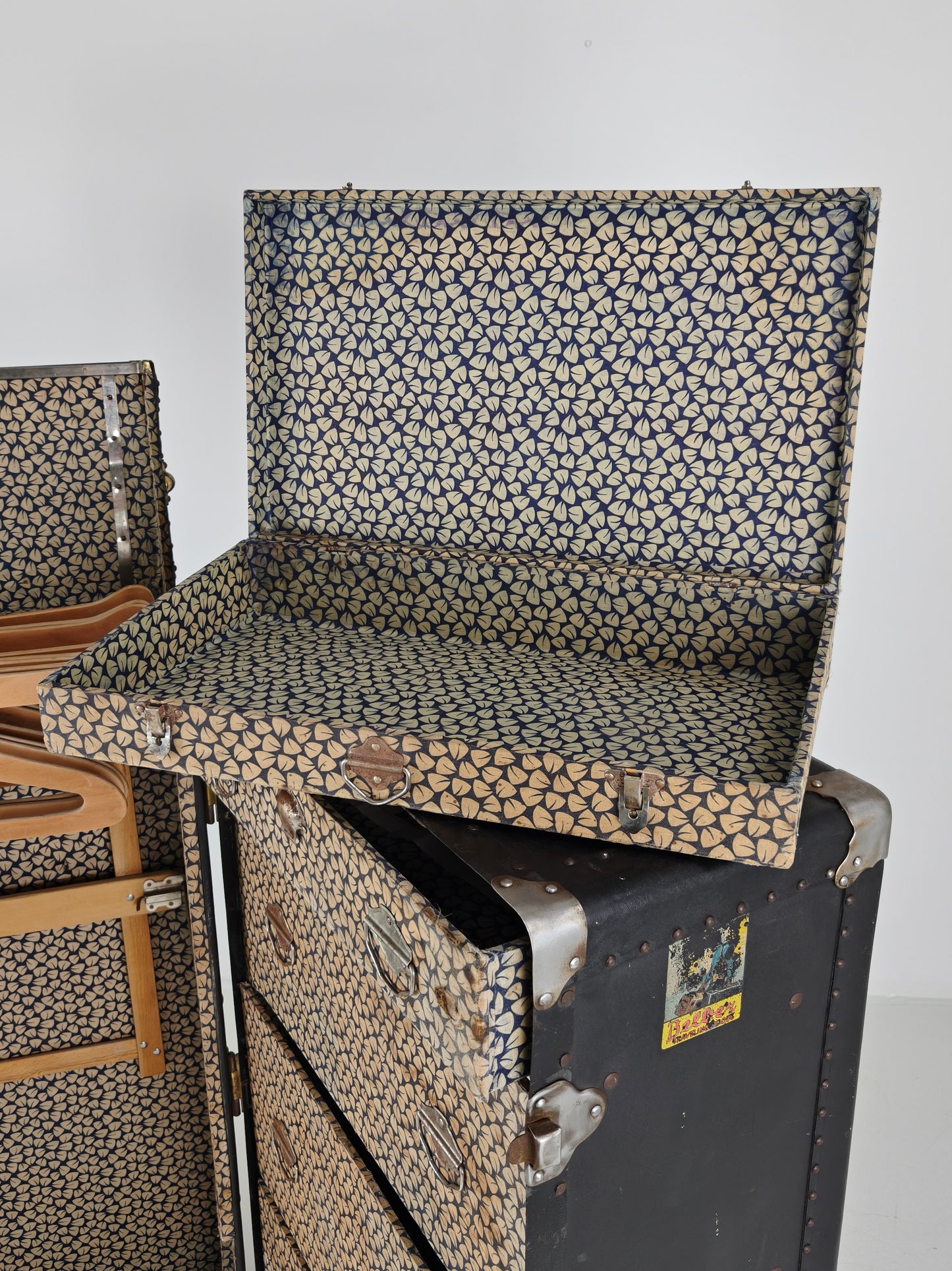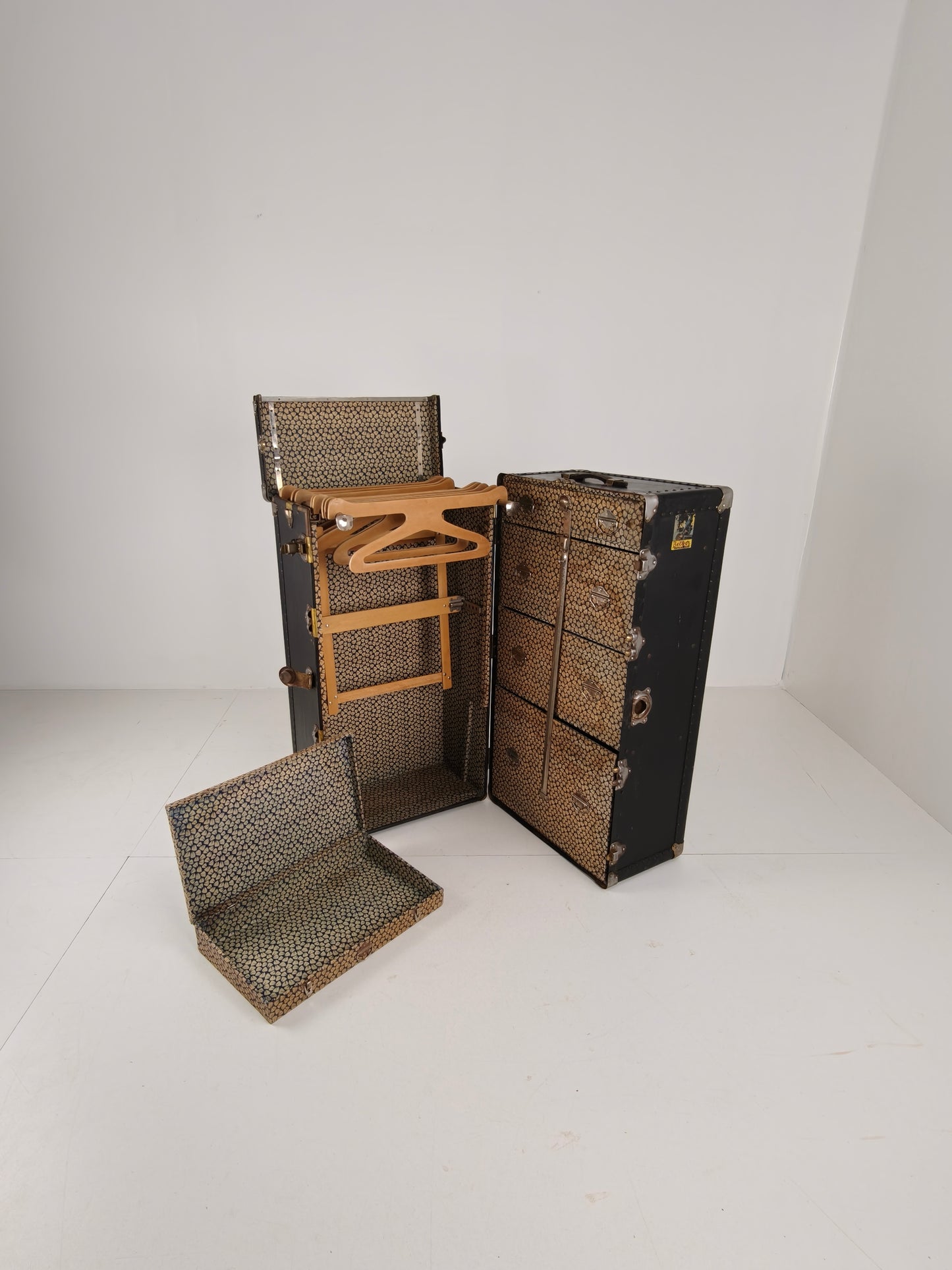 This is a beautiful and original 1924 Belber steam trunk, designed as a large travel wardrobe in elegant black leather A true /antique vintage piece, it comes with 6 original wooden hangers and a clothing press to keep garments securely in place during travel. The trunk includes 5 compartments, one of which is specifically designed for storing shoes.