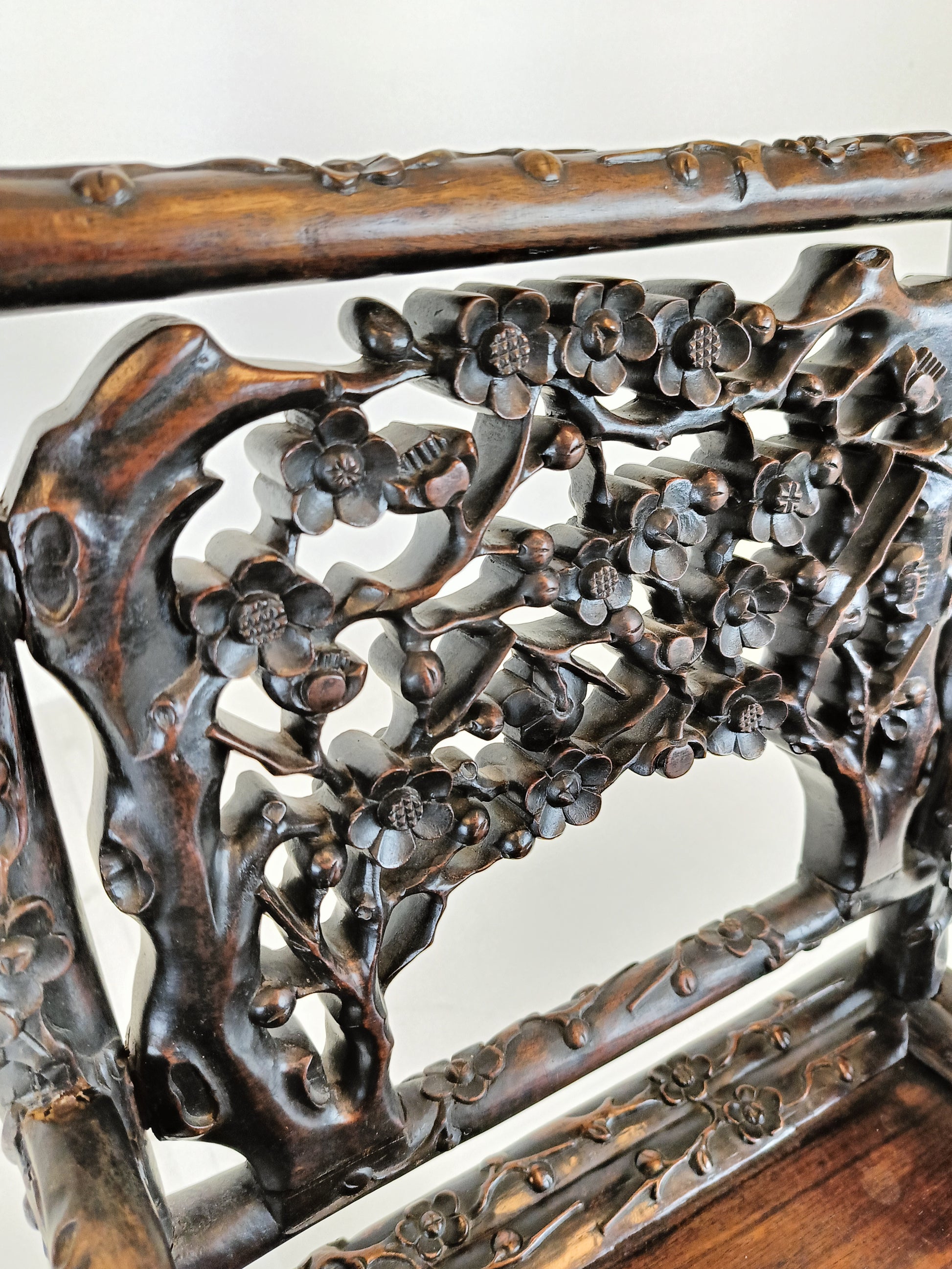 An antique Chinese Padouk wood chair is a beautifully crafted piece of furniture, typically made from the richly hued, durable Padouk wood, which has been highly prized in Chinese woodworking for centuries. Known for its deep reddish-brown color and fine grain. Has signs of wear consistant with age and use. Has been restored before, shown in pictures.