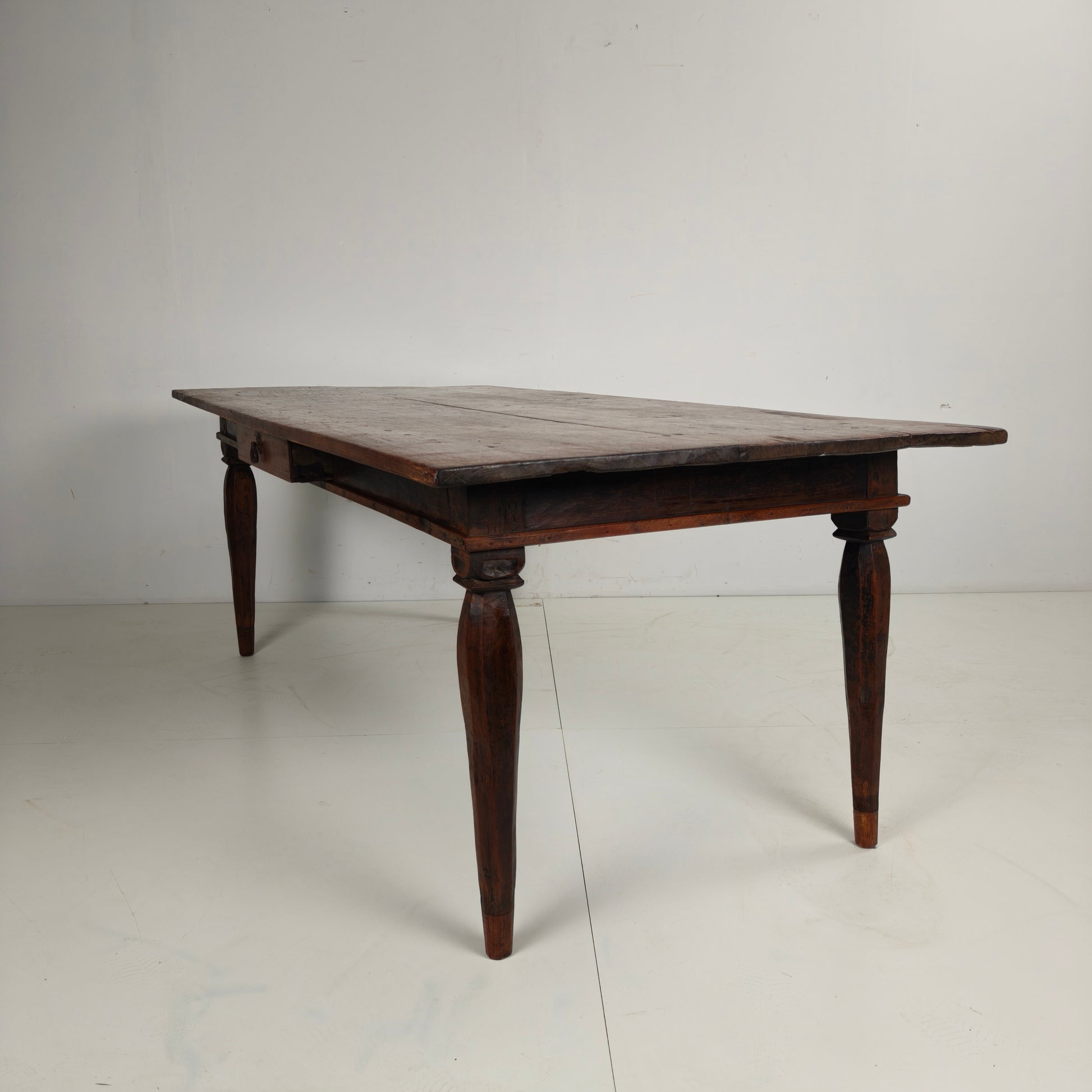 Antique colonial dining table featuring a warm original patina and traditional mortise-and-tenon construction, reflecting fine craftsmanship. The table is fitted with one drawer and shows attractive signs of age and use consistent with its history.