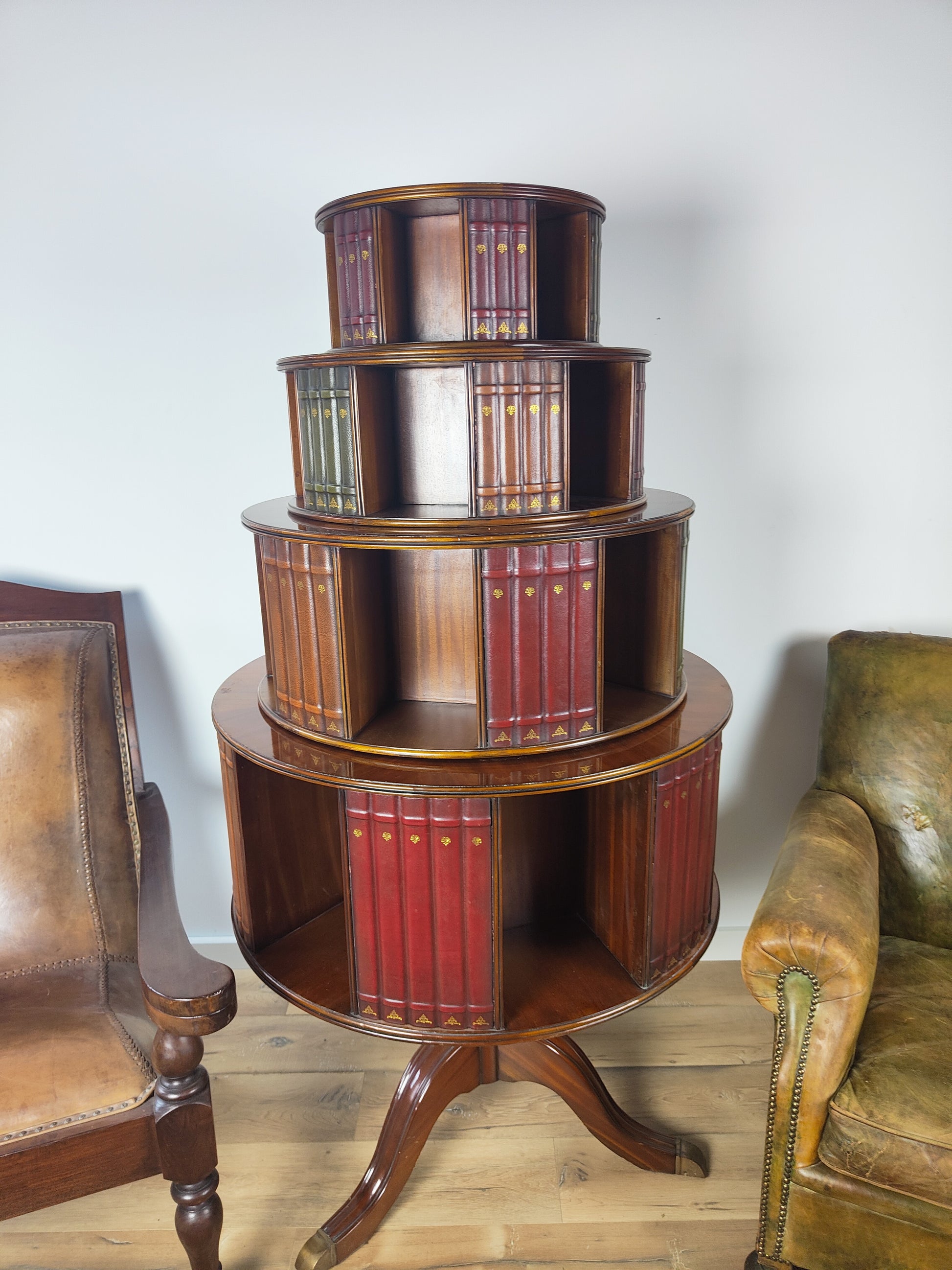 A beautiful spinning book mill in English style is in very good condition. unique chesterfield style bookcase.