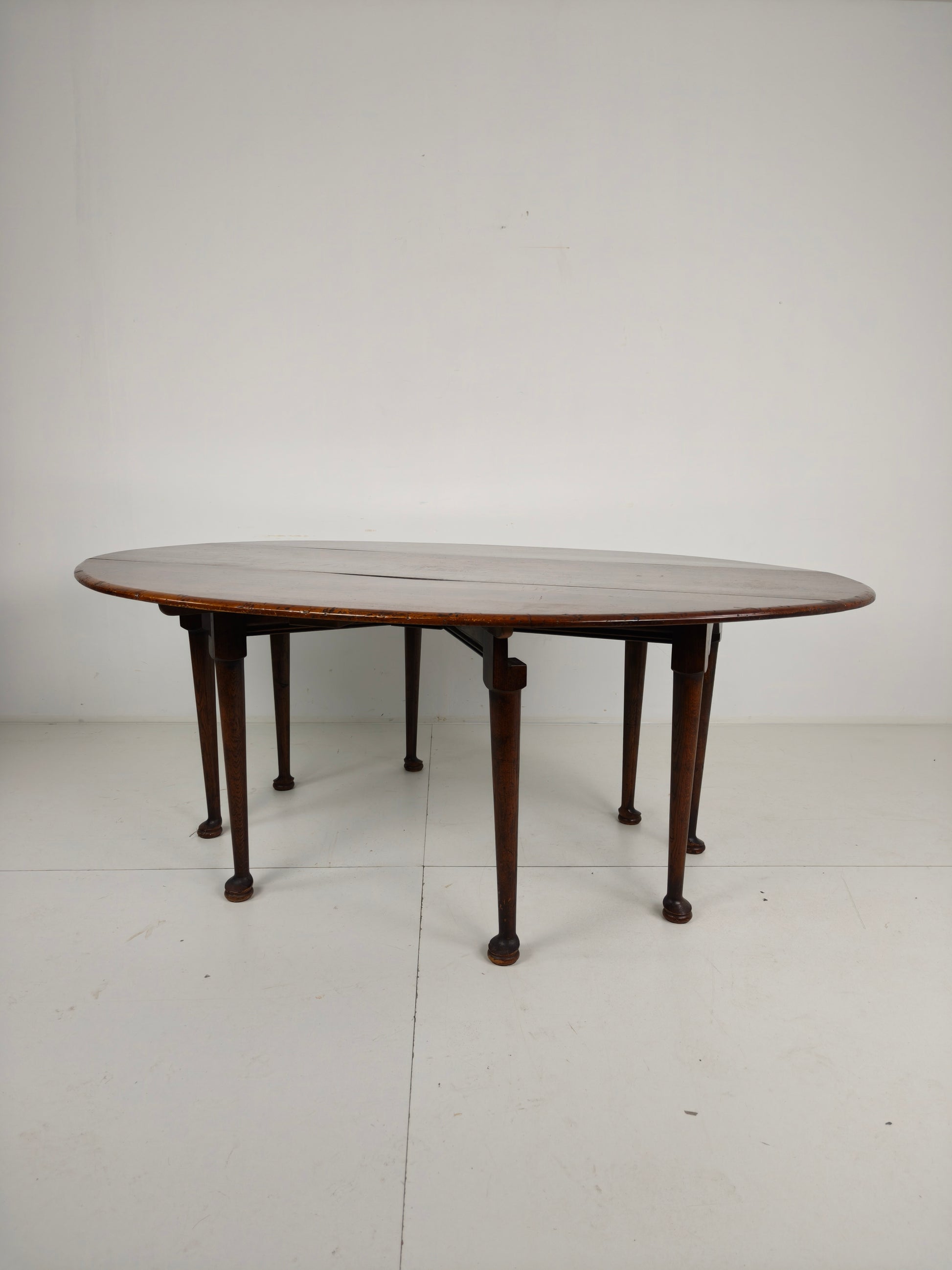 Beautiful Victorian drop-leaf dining table with classic pad feet and eight elegantly turned legs, offering excellent stability and timeless style.