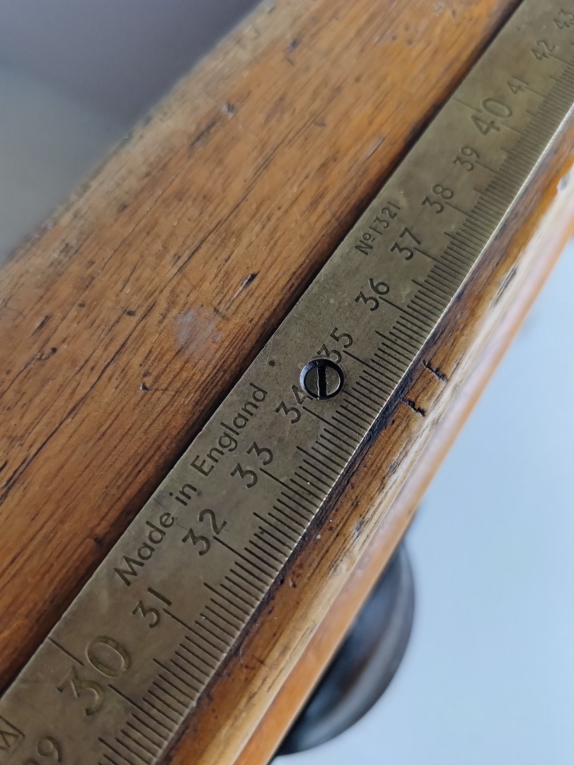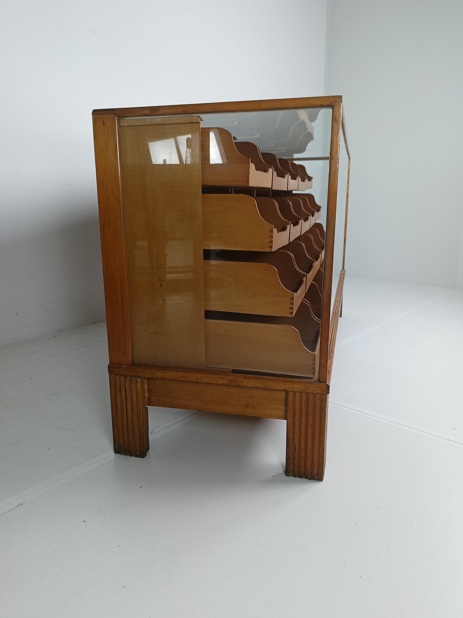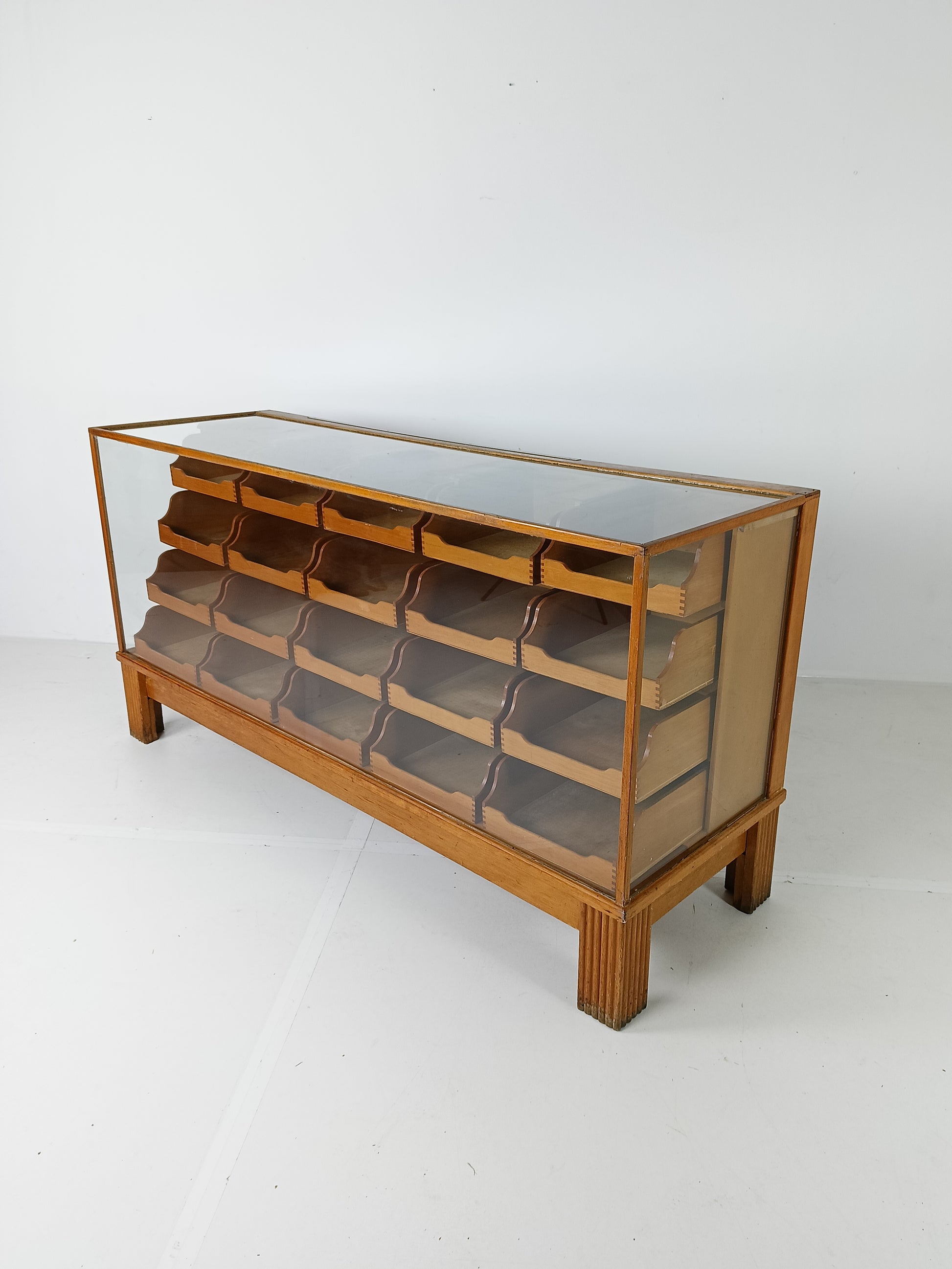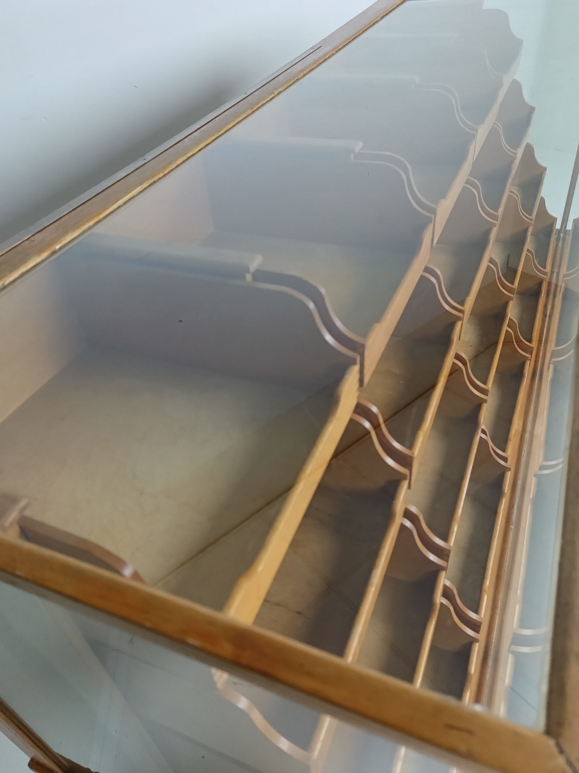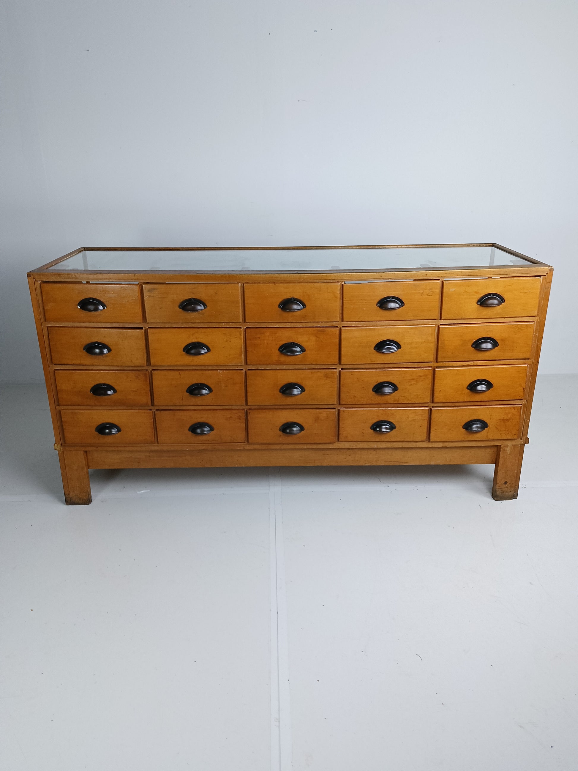 This antique English shop counter is a beautiful and functional piece with a rich history. It features a glass top, front, and sides, allowing for excellent display, with the front glass having been carefully restored. The counter is fitted with twenty wooden drawers, providing ample storage. Adding to its charm, an original Rabone Chesterman measuring ruler is embedded on the top. It shows signs of wear consistent with age and use, enhancing its authentic character. A timeless addition to any space, blending history with practicality.