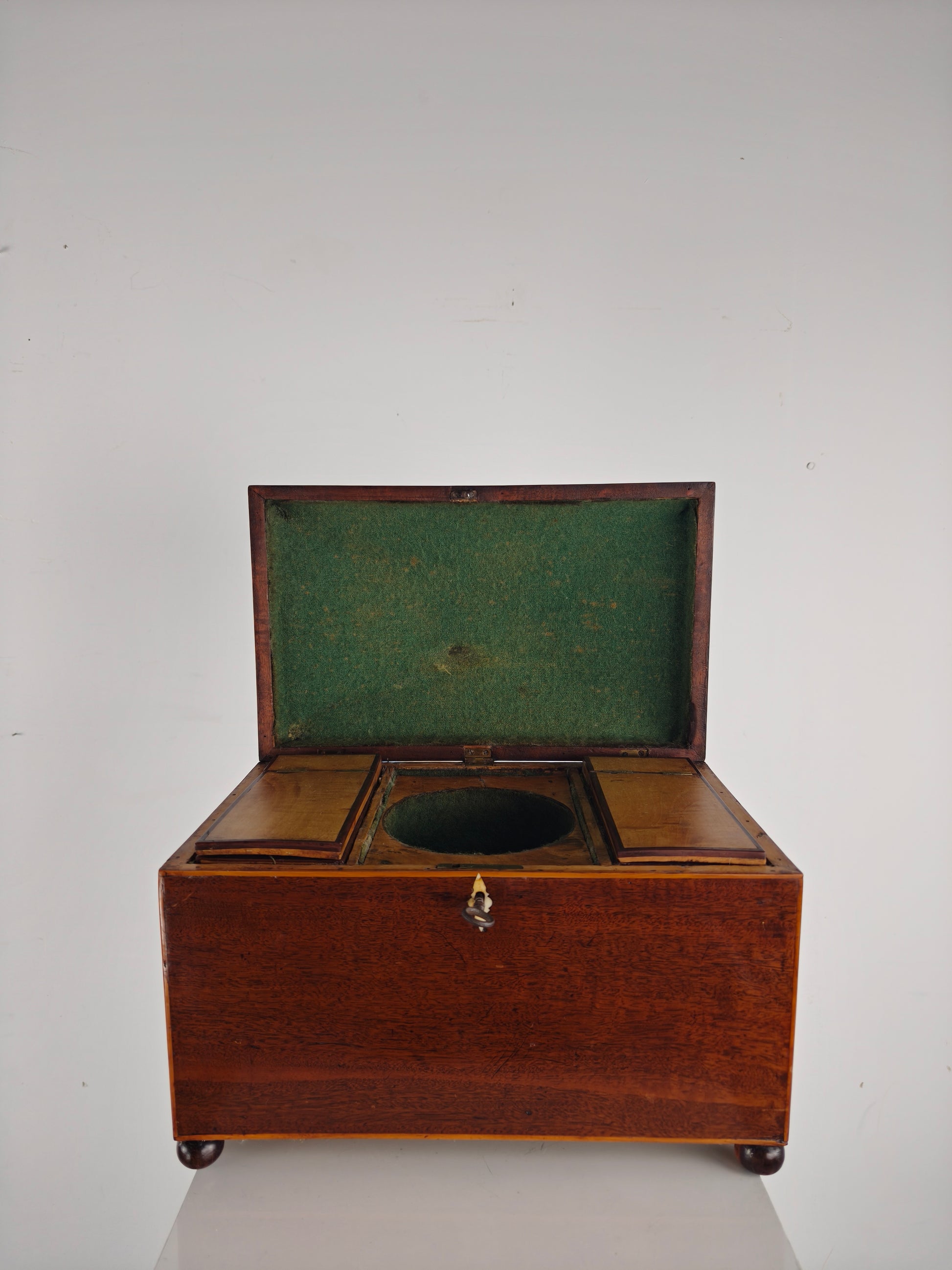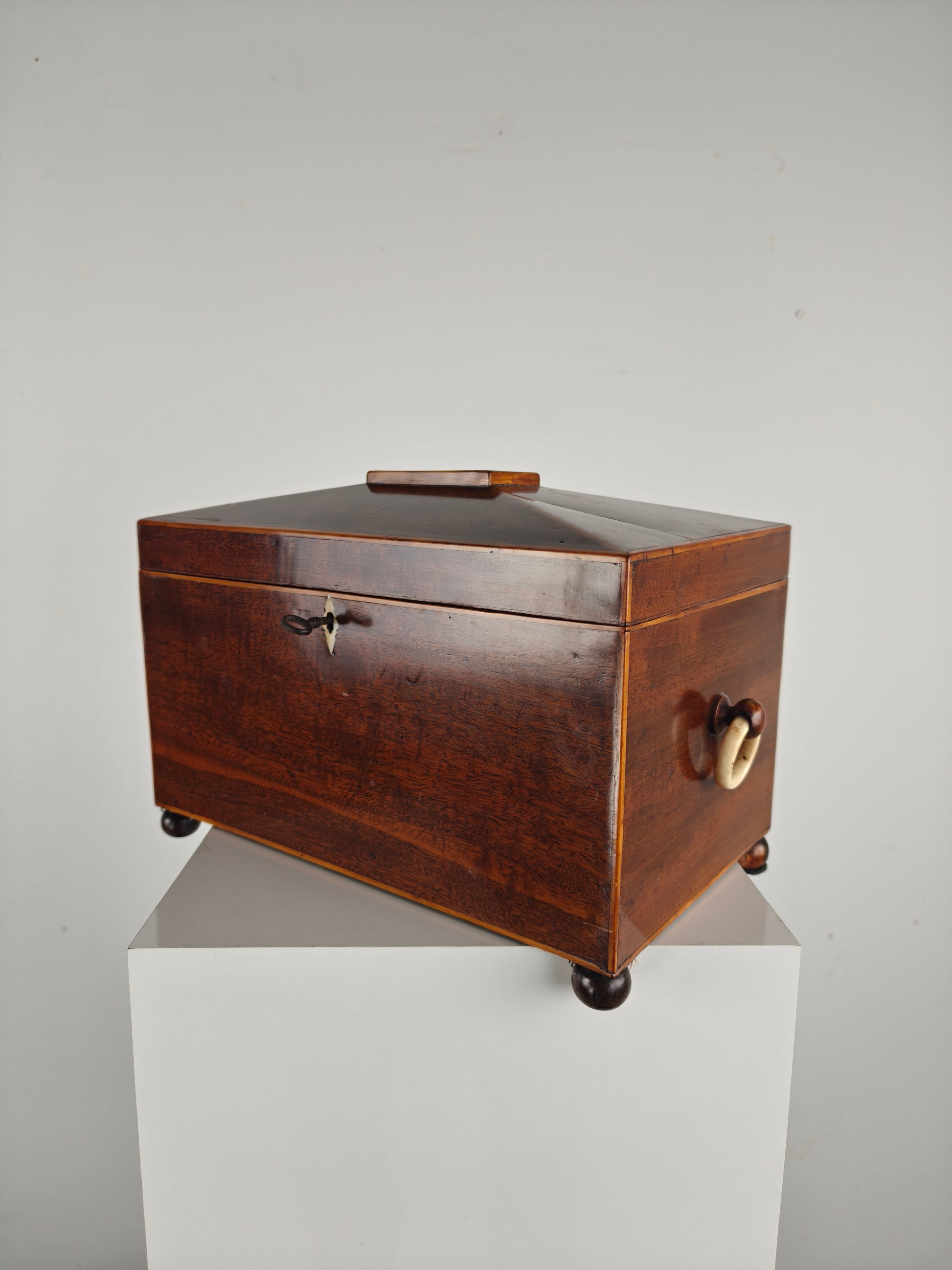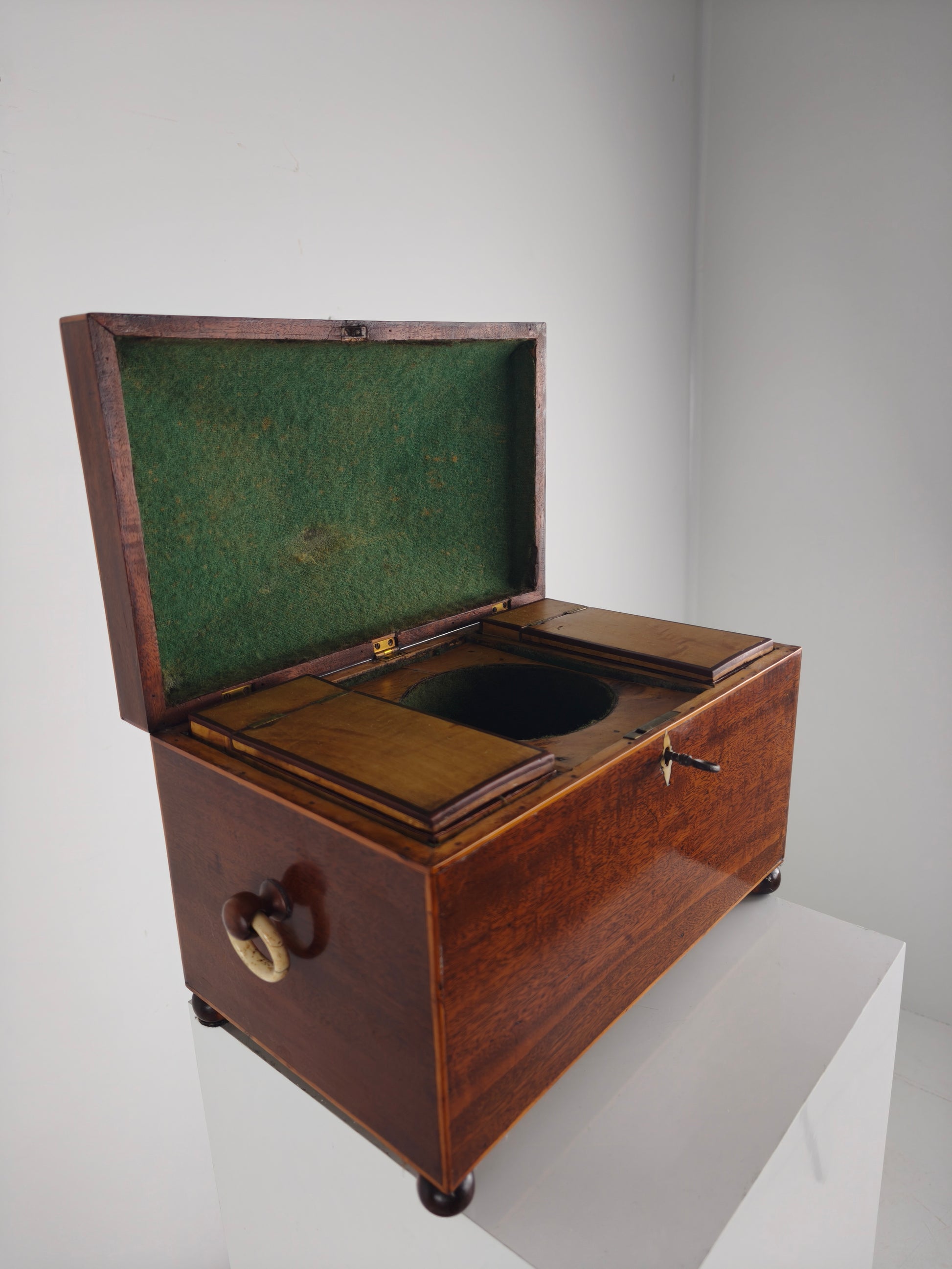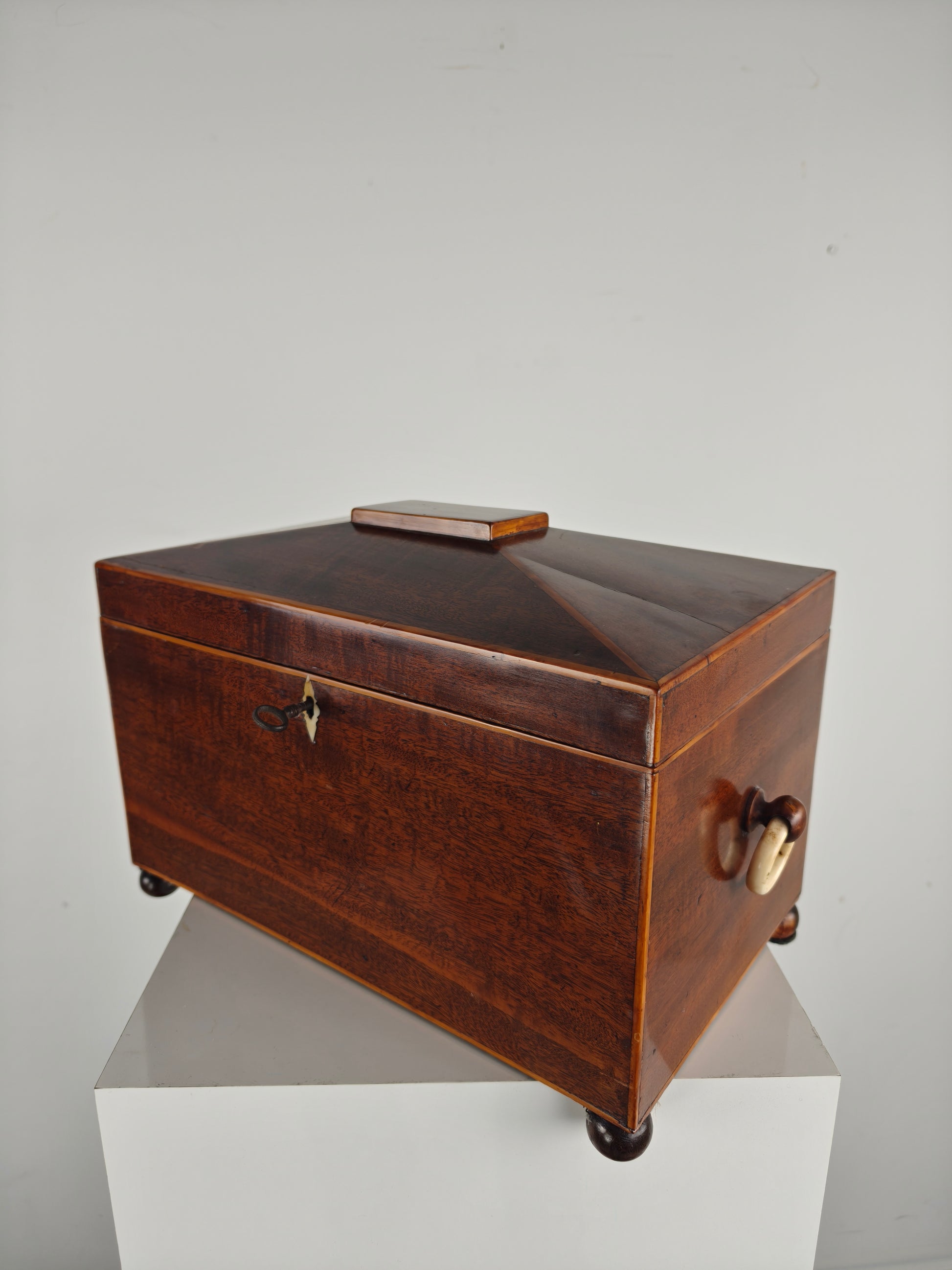 This beautiful early 19th-century English tea caddy is made from rich rosewood and comes with its original key. The caddy shows signs of use, as visible in the photos