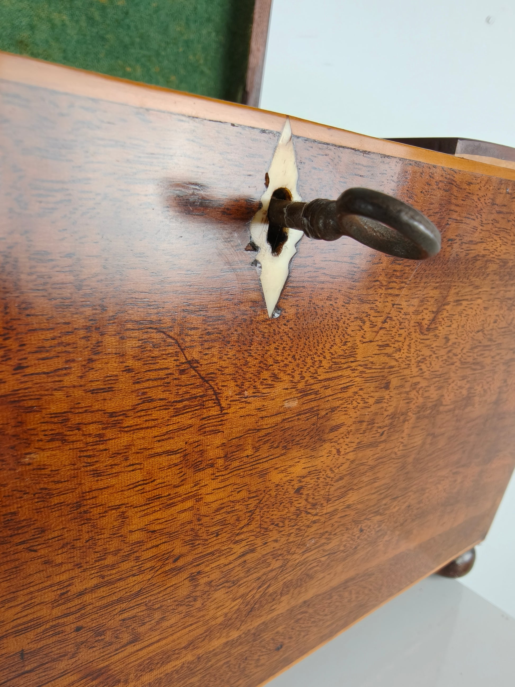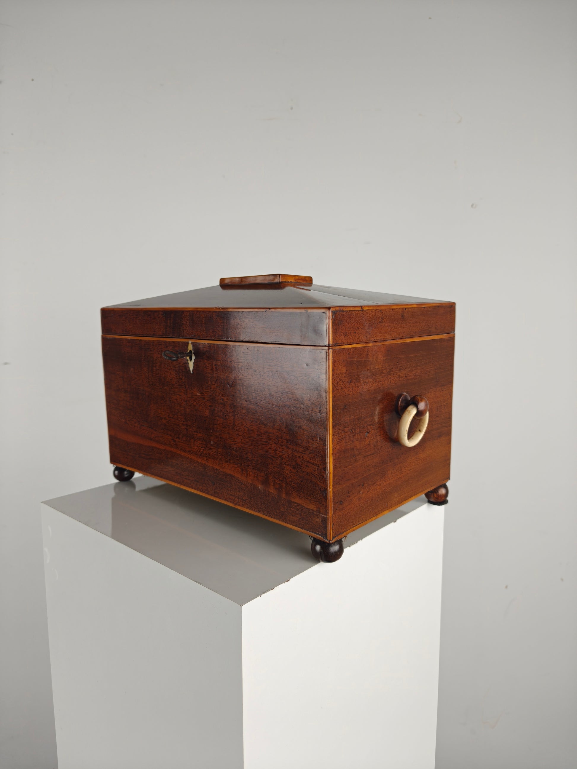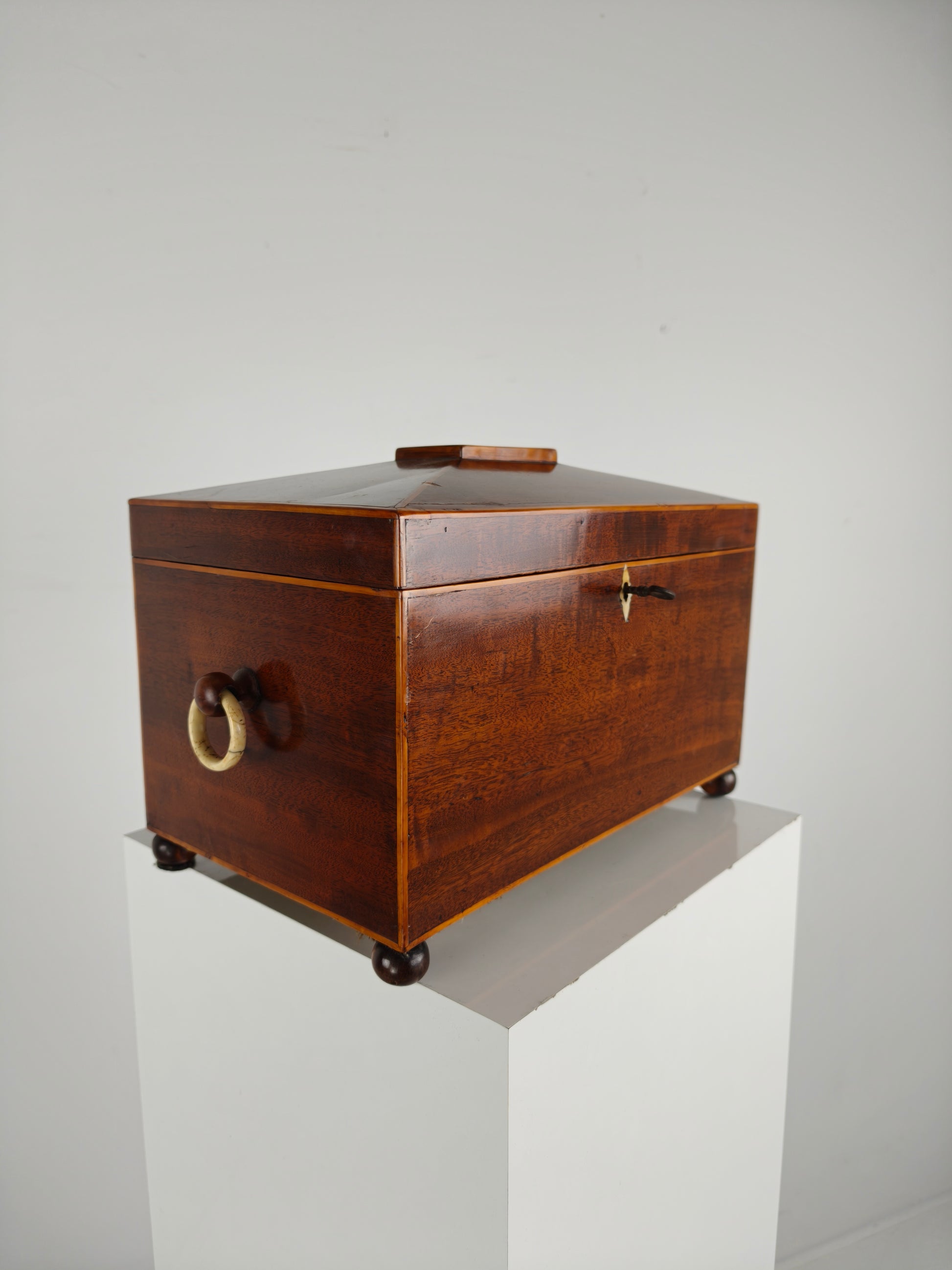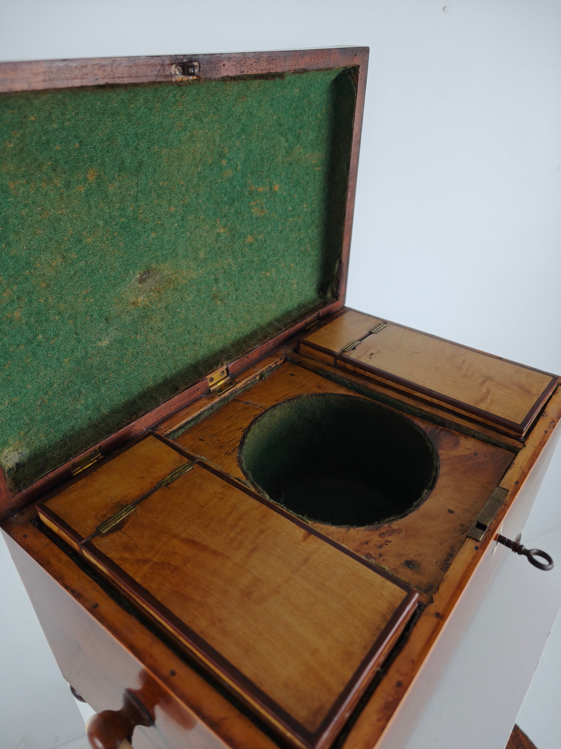 This beautiful early 19th-century English tea caddy is made from rich rosewood and comes with its original key. The caddy shows signs of use, as visible in the photos