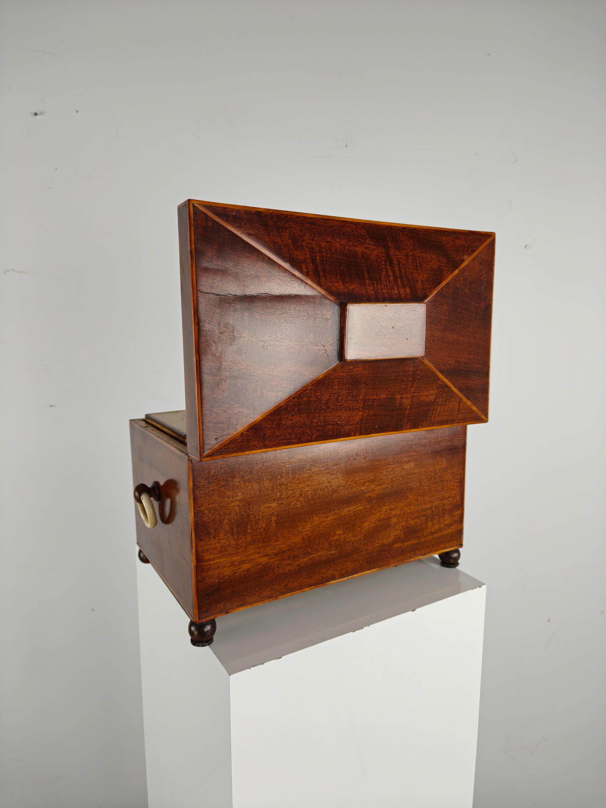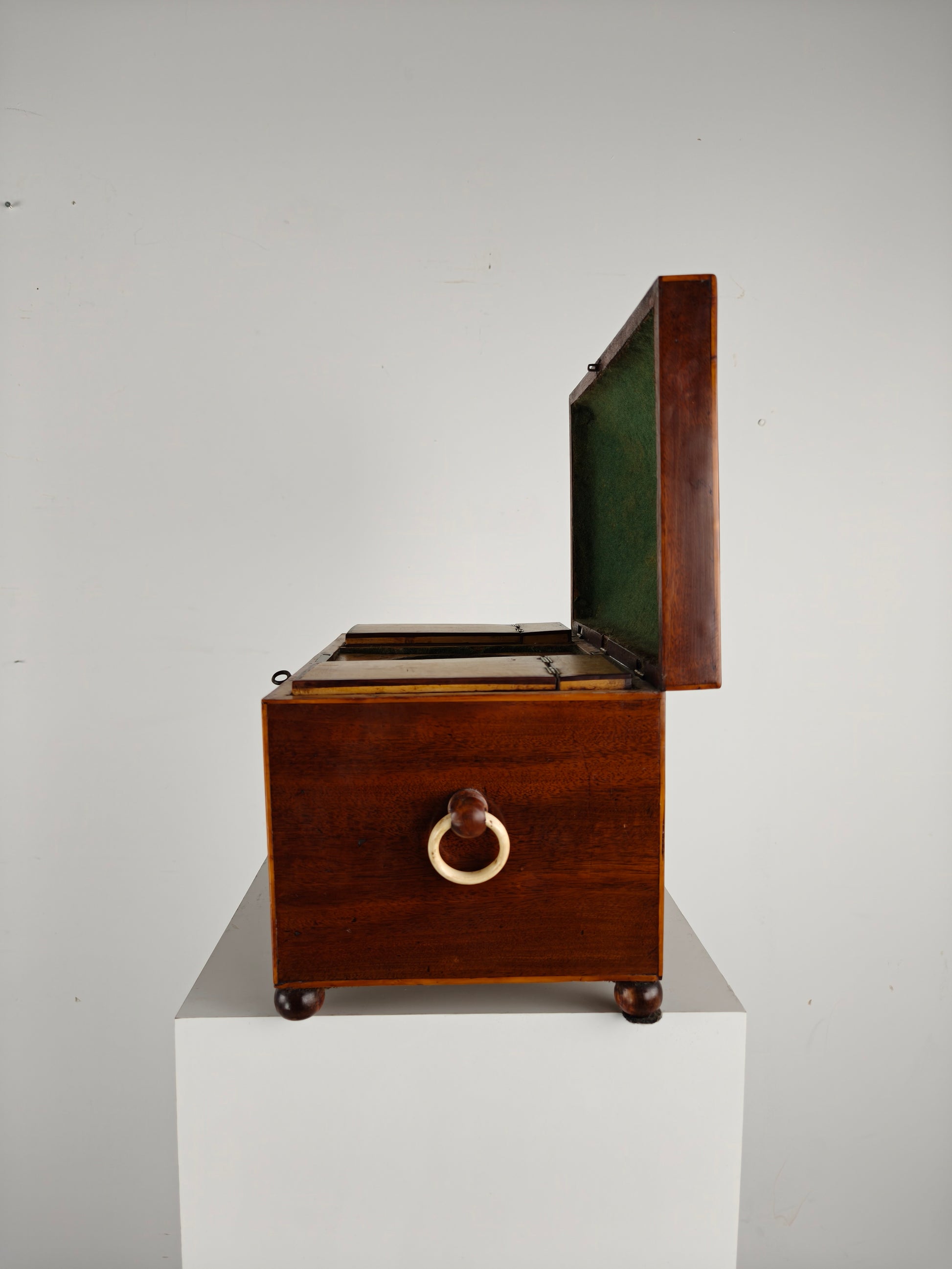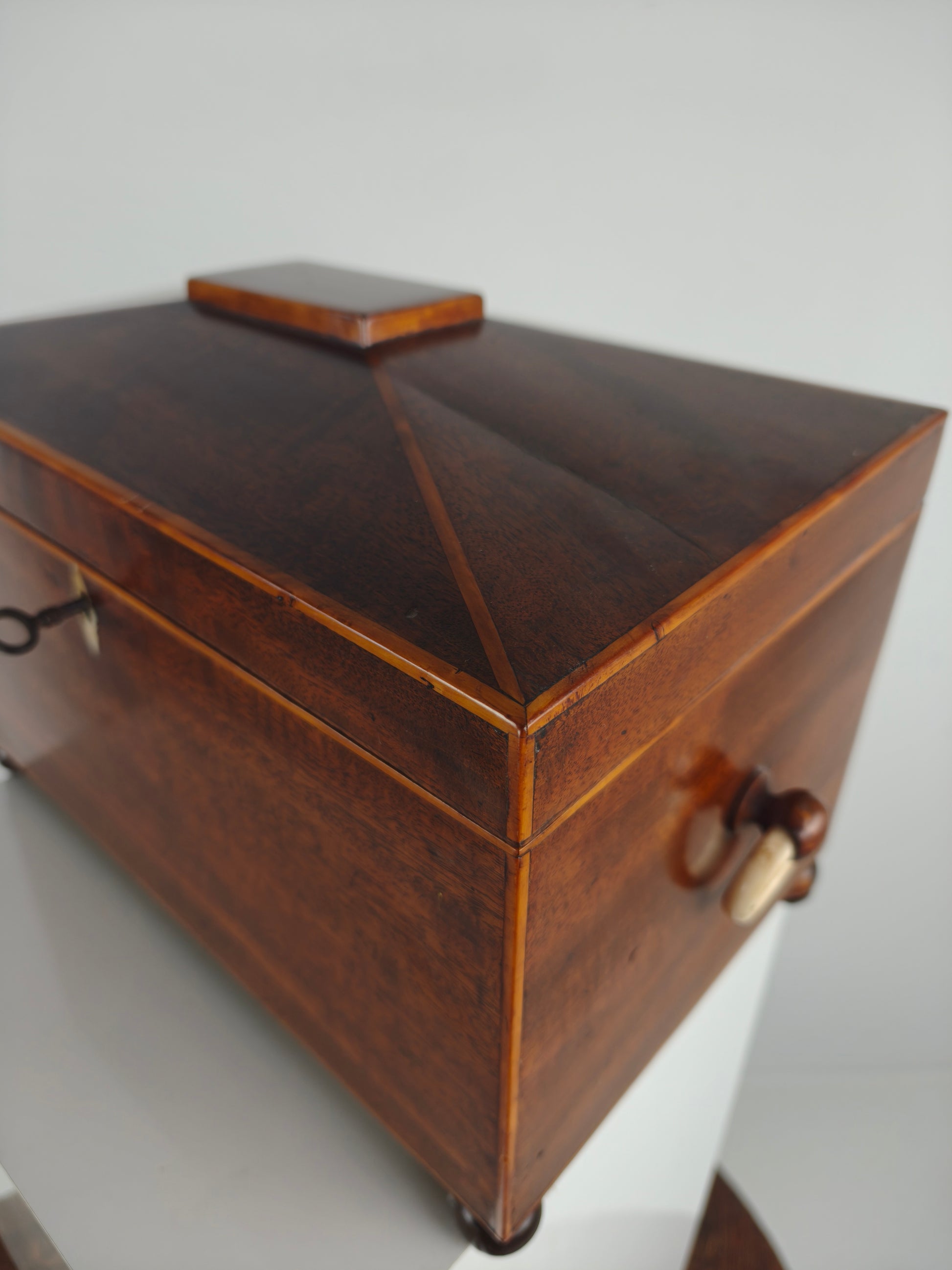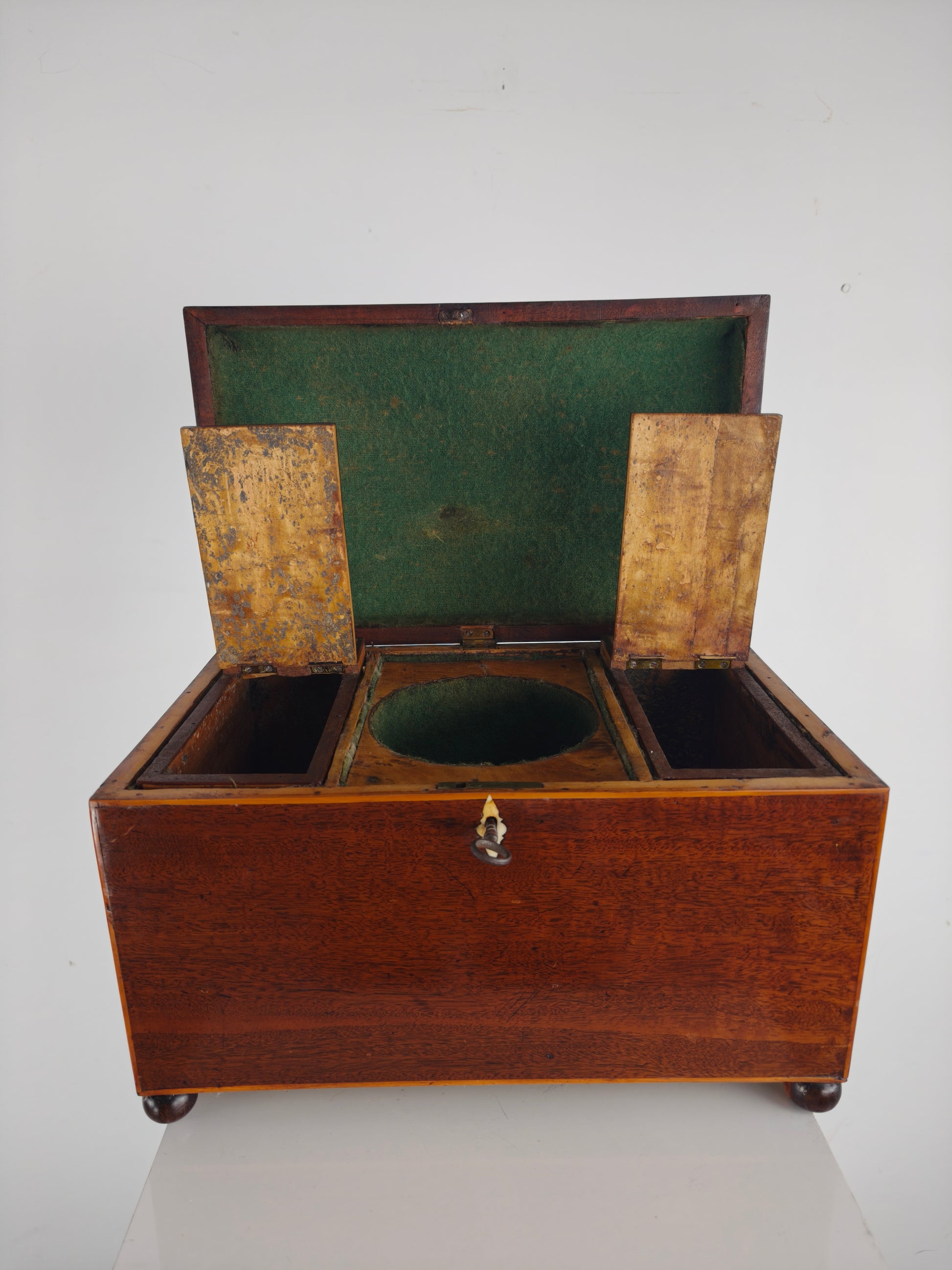 This beautiful early 19th-century English tea caddy is made from rich rosewood and comes with its original key. The caddy shows signs of use, as visible in the photos