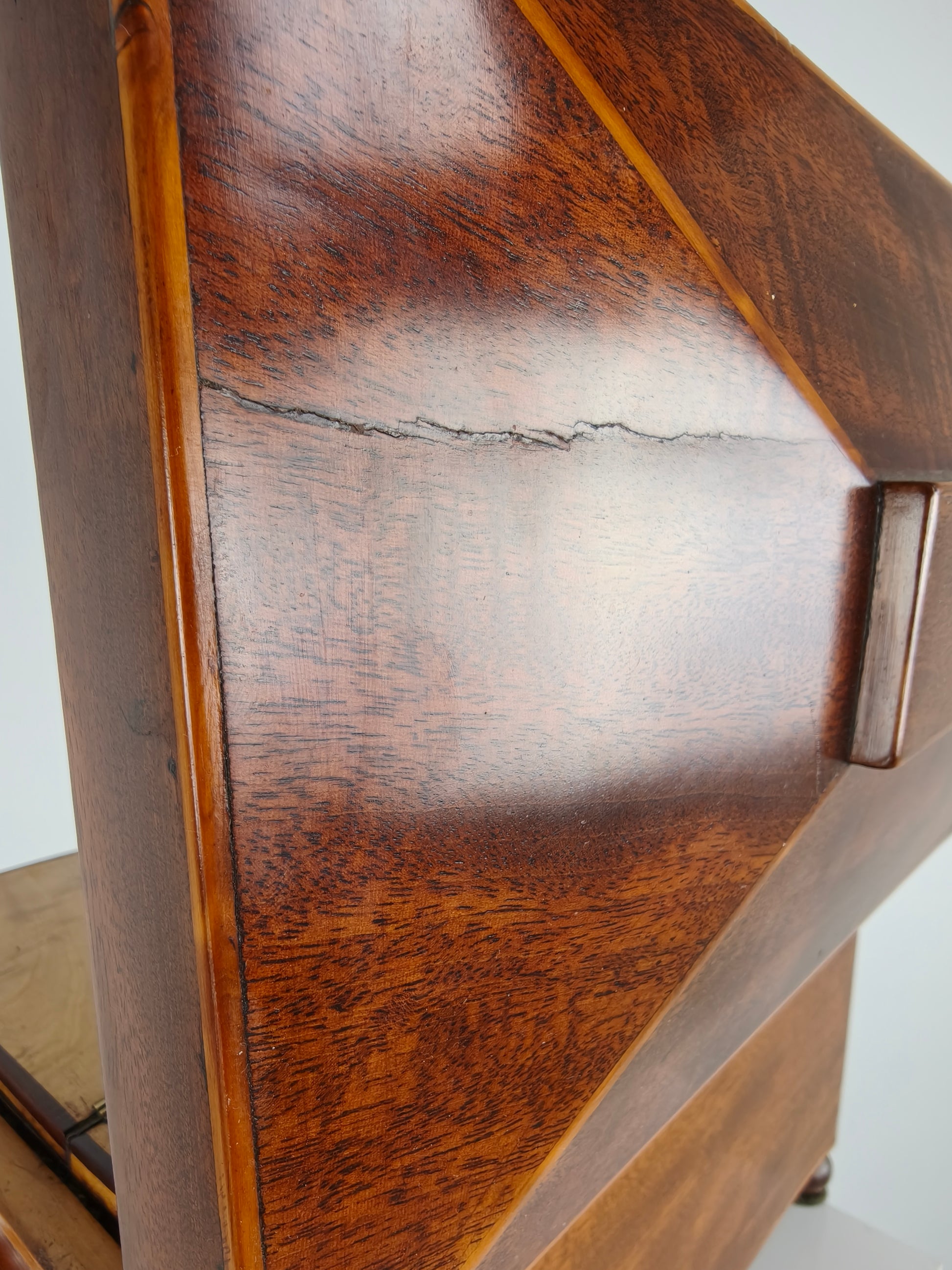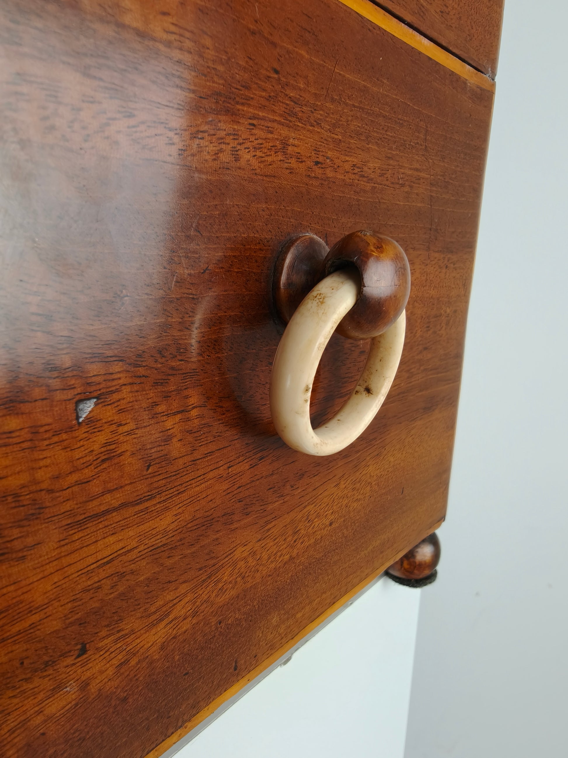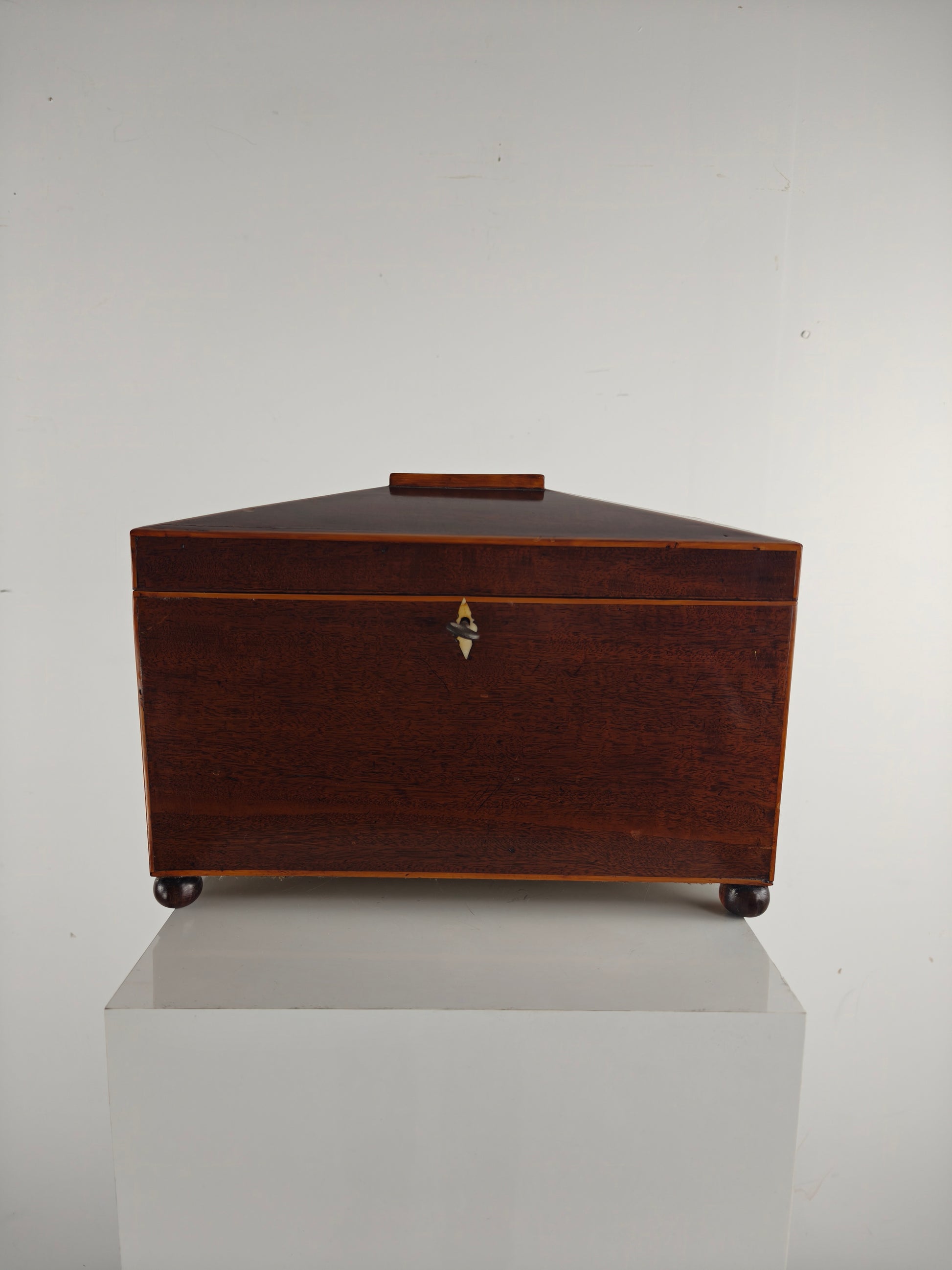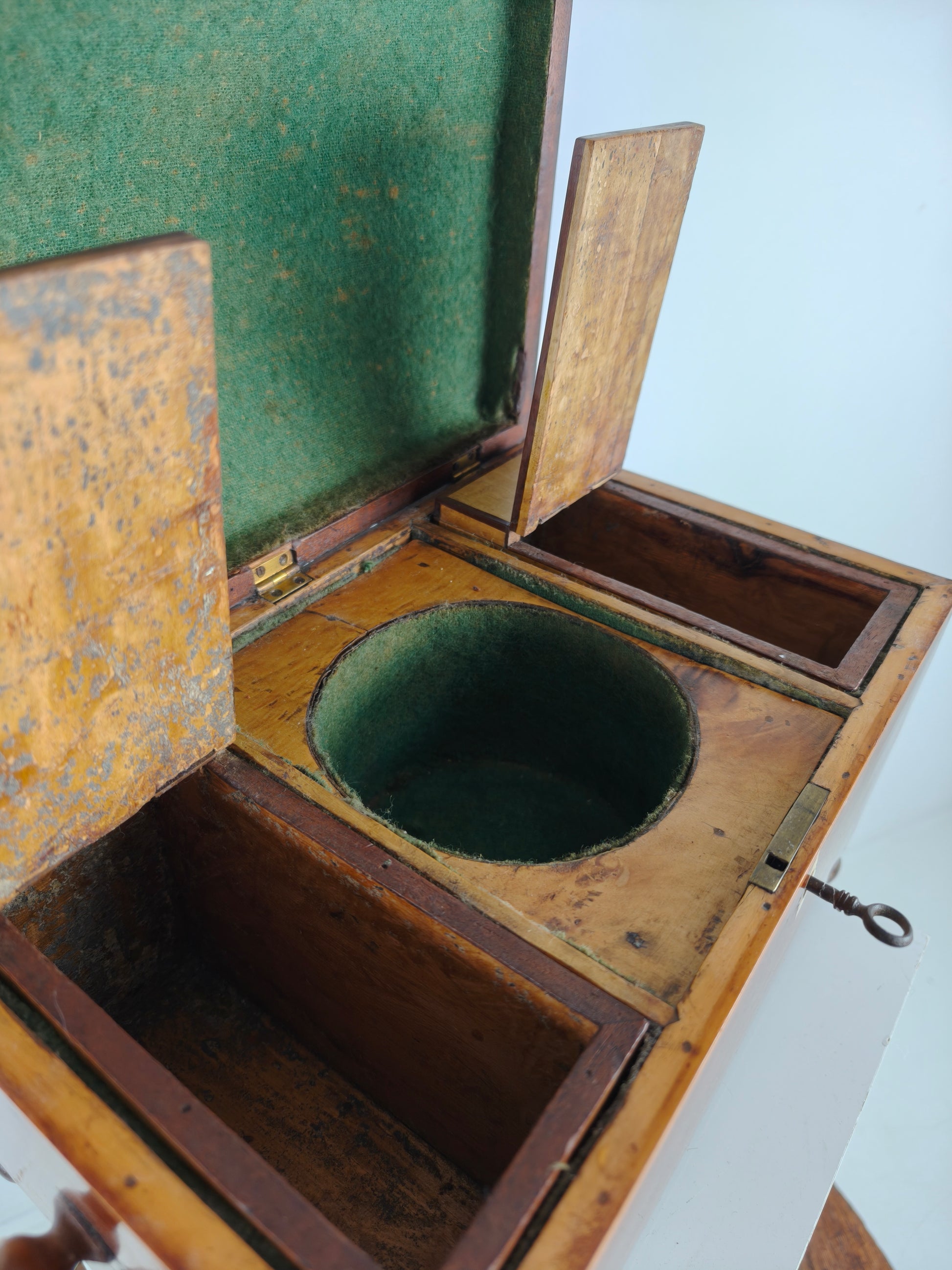 This beautiful early 19th-century English tea caddy is made from rich rosewood and comes with its original key. The caddy shows signs of use, as visible in the photos