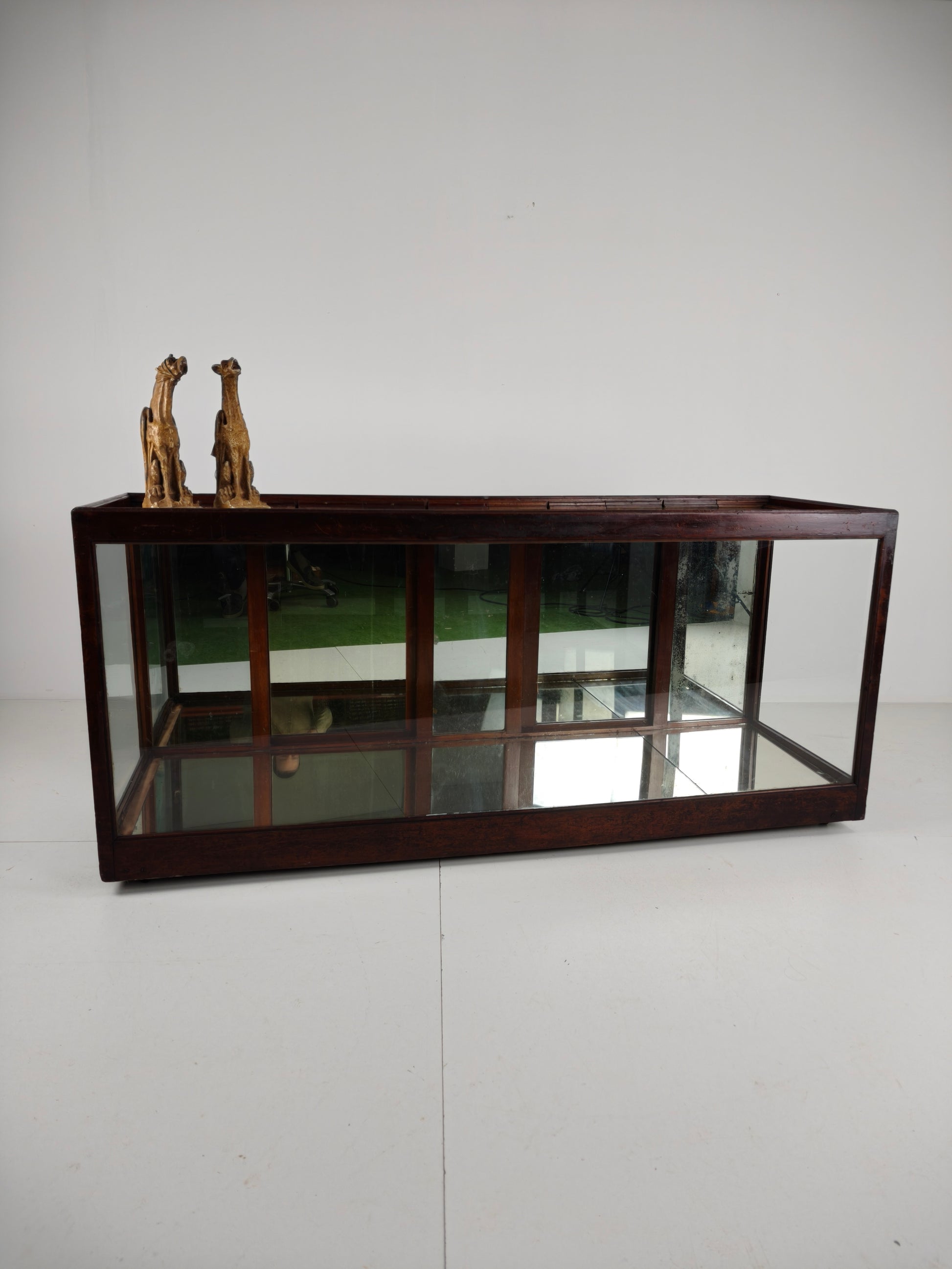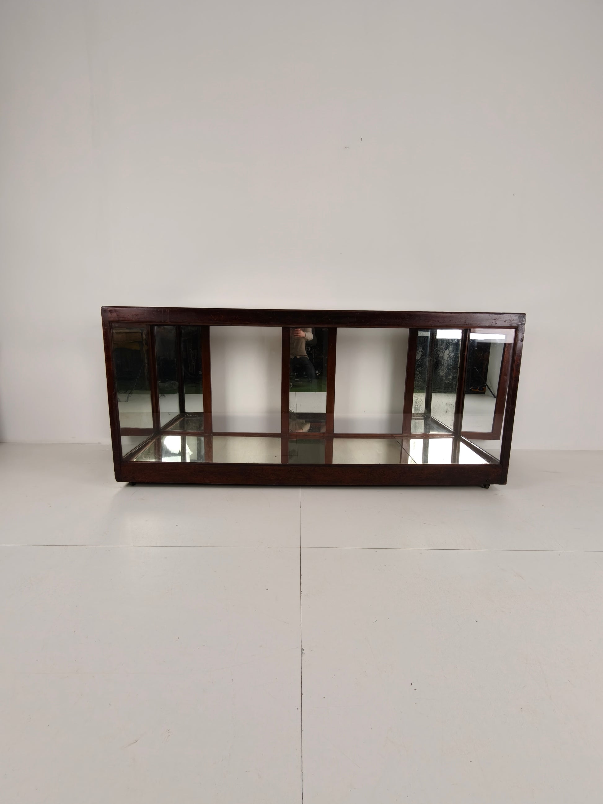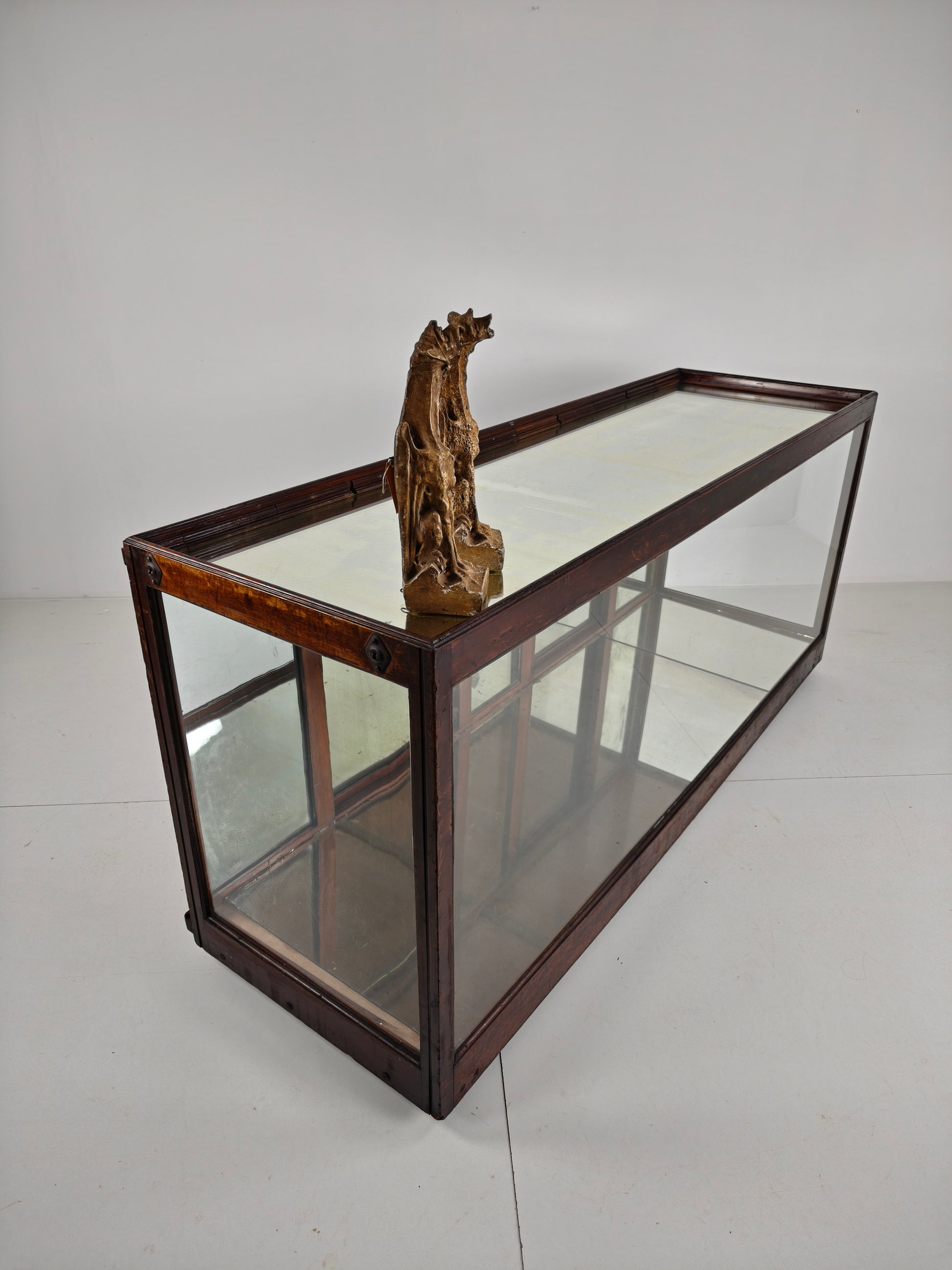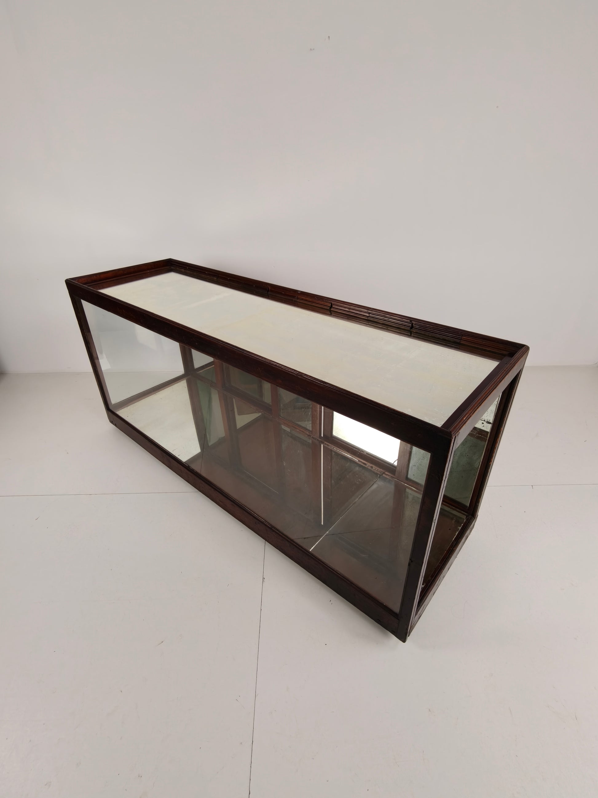 This beautiful antique English shop counter, dating from around 1920, offers a unique combination of elegance and authenticity. It features original antique mirror glass on the top section, and the back and base show lovely natural wear from age.