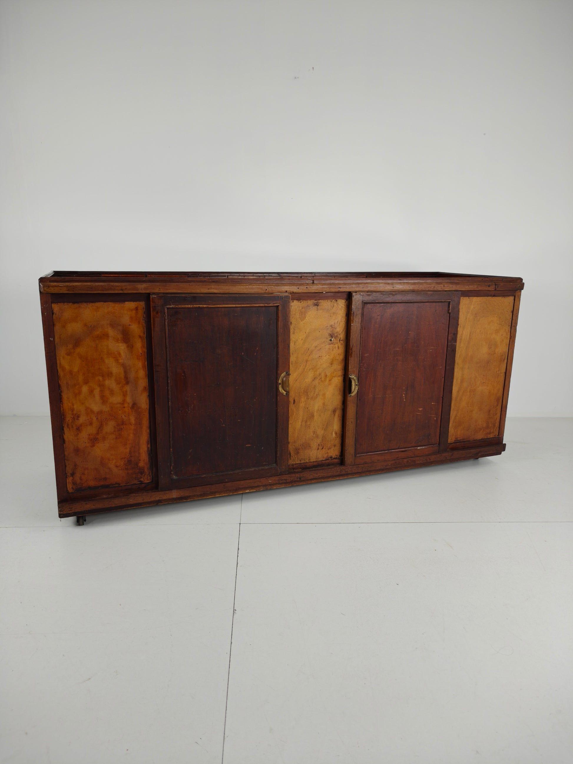 The counter has two sliding doors and sits on its original cast iron wheels. It is in good condition overall, with signs of wear consistent with age and use. These marks of time give it extra charm and character.