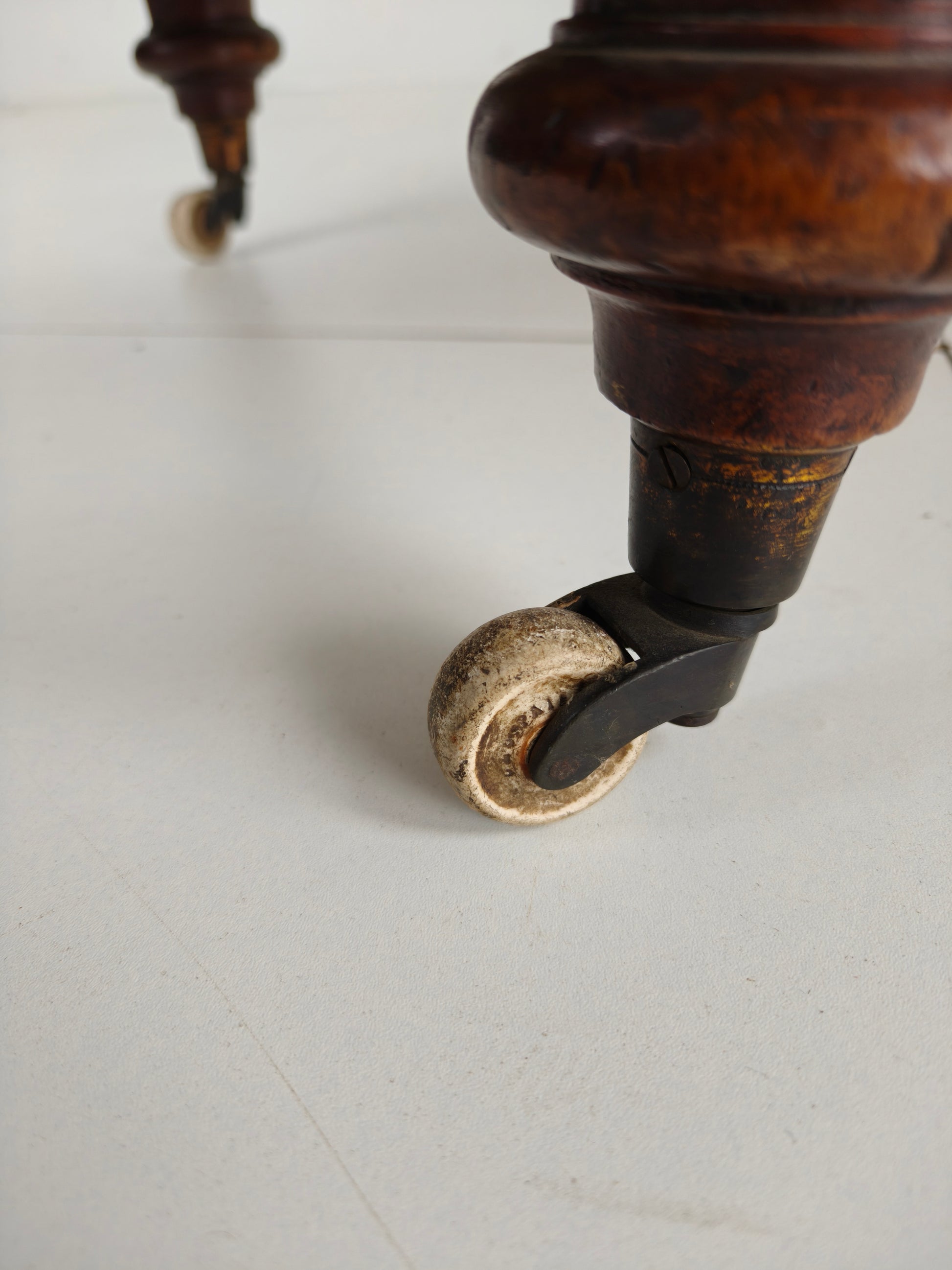 This stunning antique English Victorian chaise lounge is crafted from rich mahogany, showcasing intricate craftsmanship and timeless elegance. The piece is beautifully upholstered in luxurious moss green fabric, offering both comfort and style. It is fitted with ornate brass and ceramic castors, which add a touch of antique sophistication and ensure easy mobility.