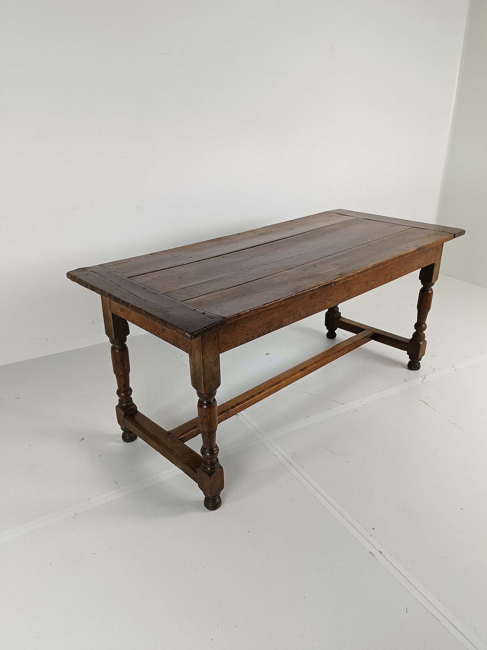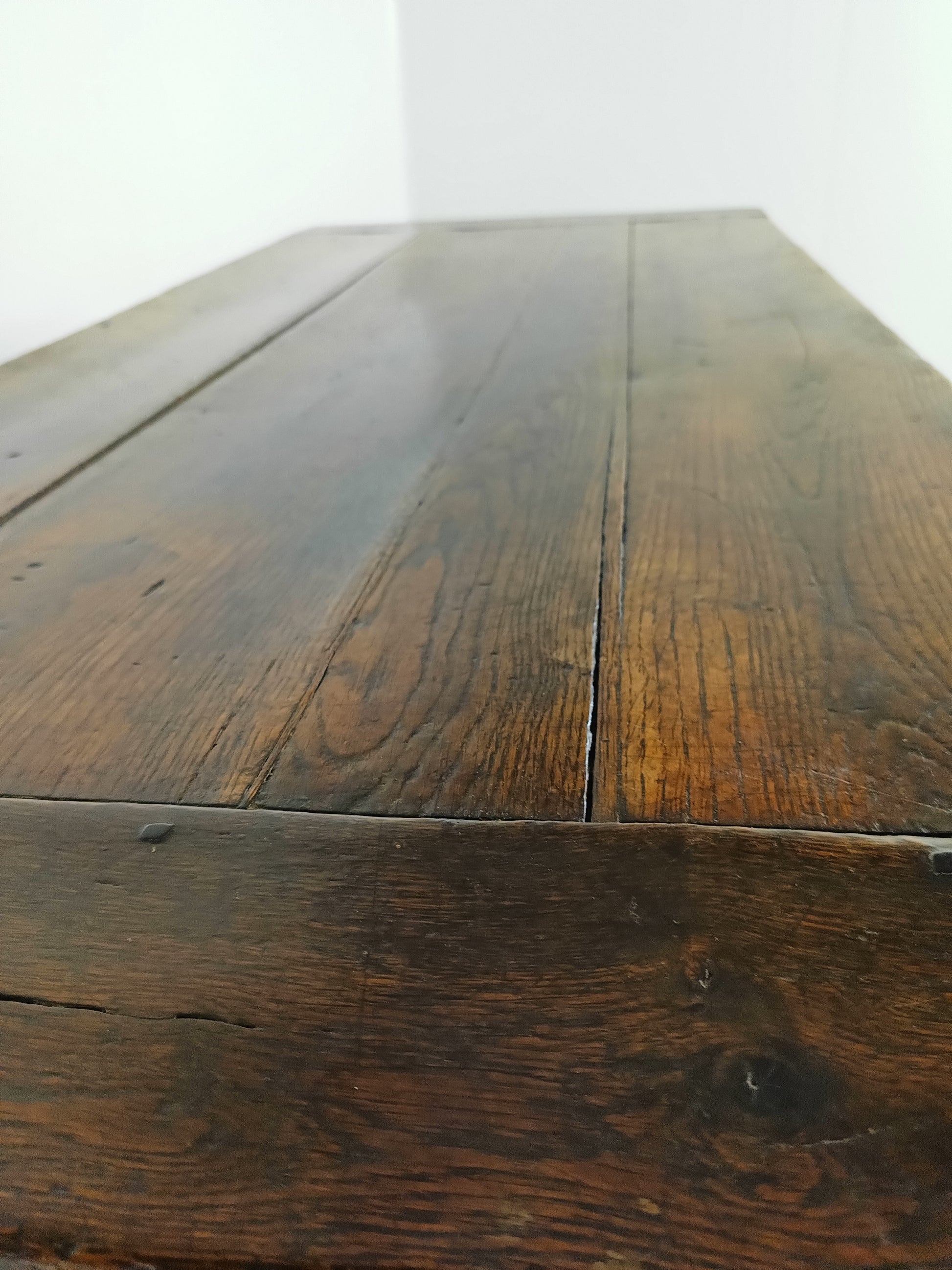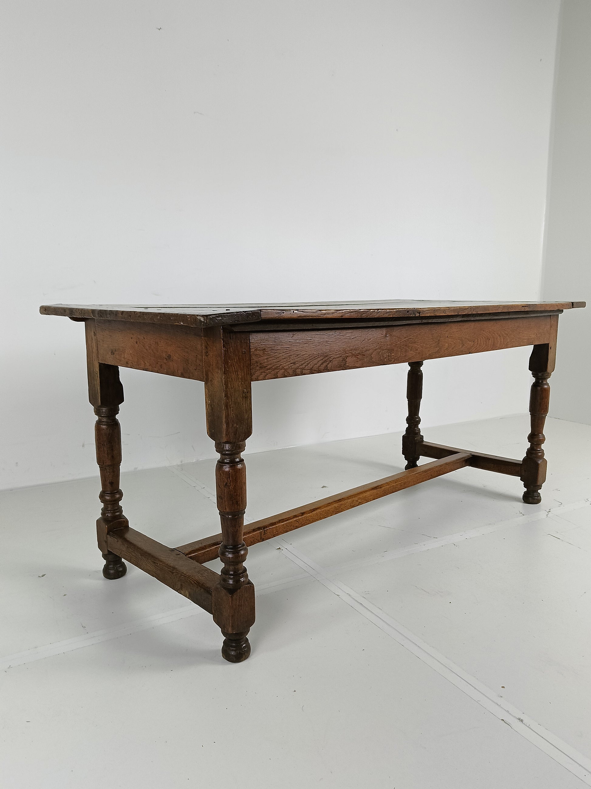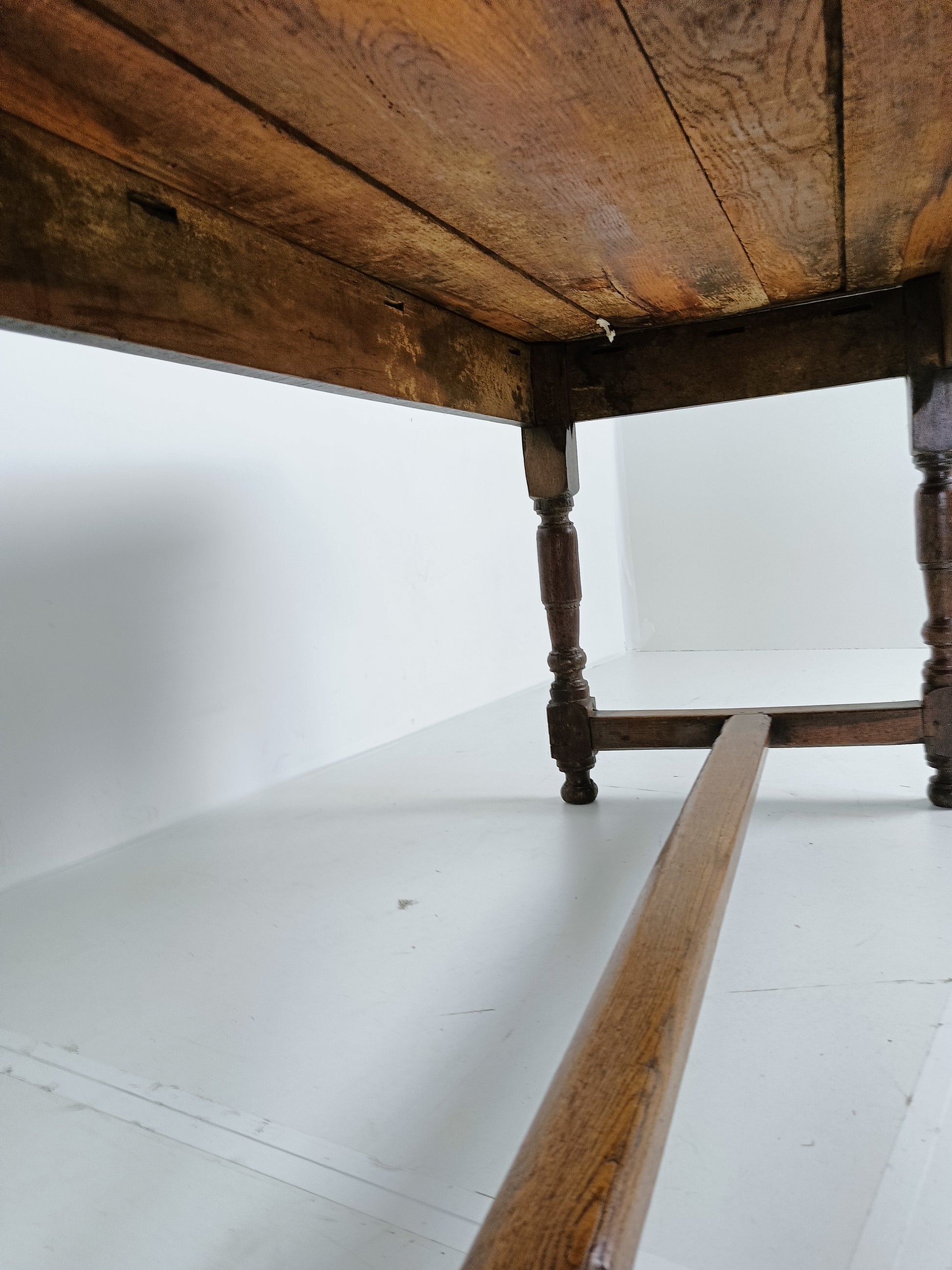 A early 19th century antique French dining table is a beautiful example of craftsmanship. Made from durable oak, Stand on barley legs aesthetic appeal, and connection to the past. Has signs of wear consistant with age and use.