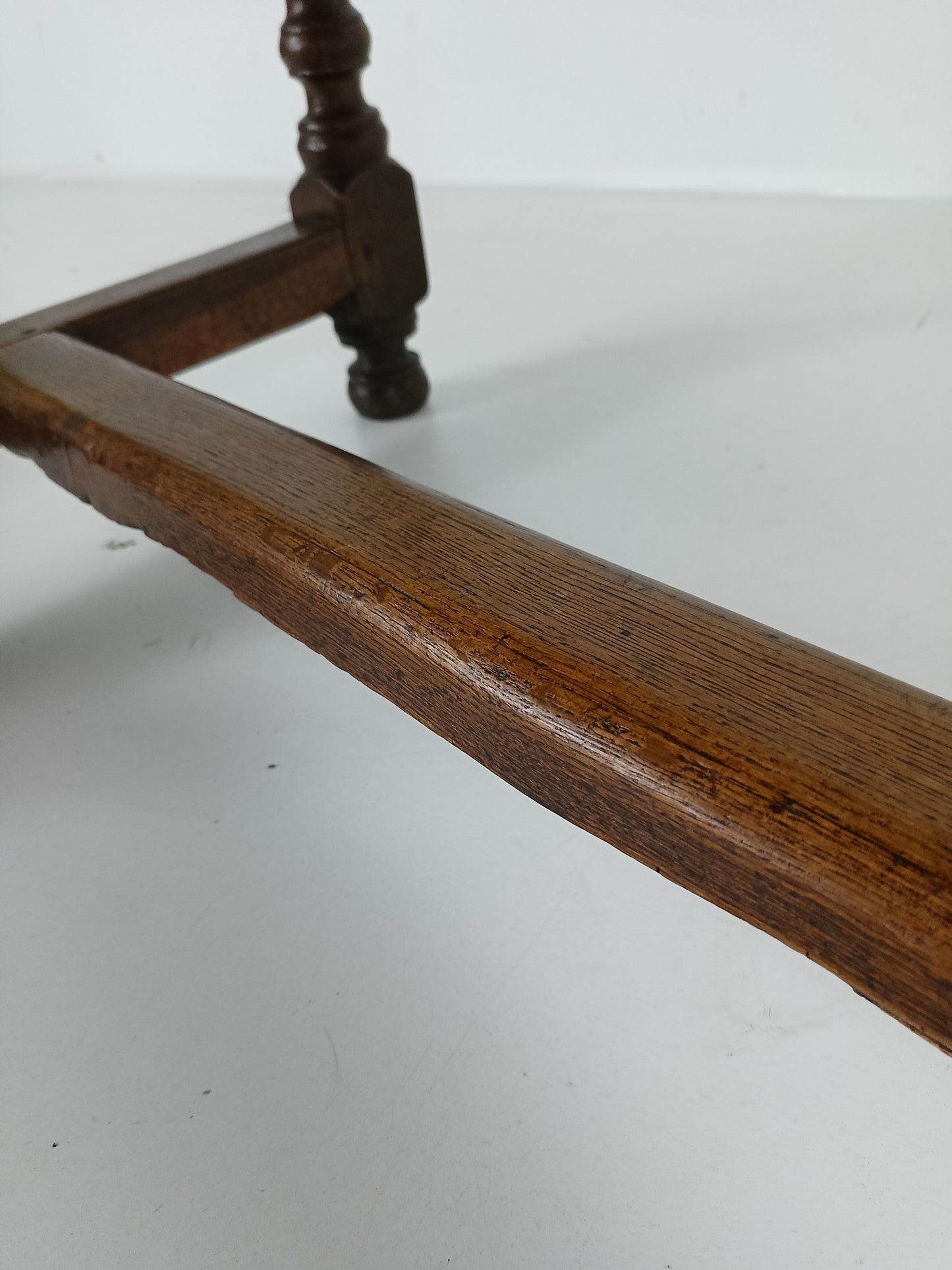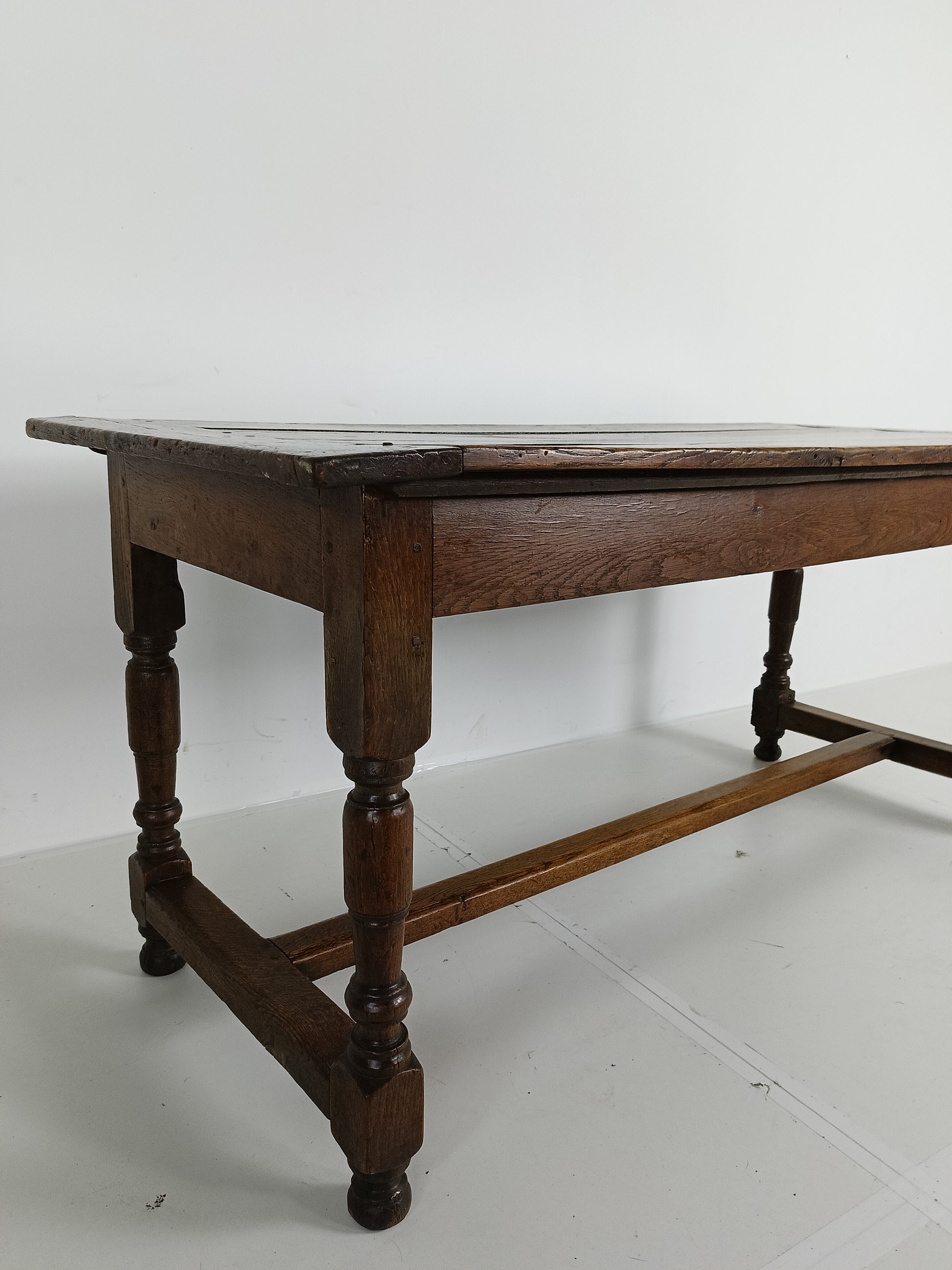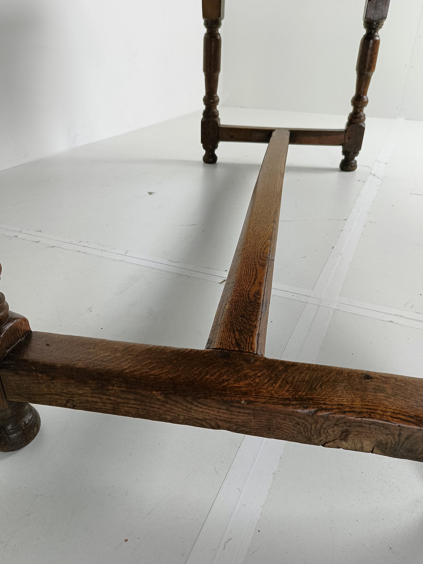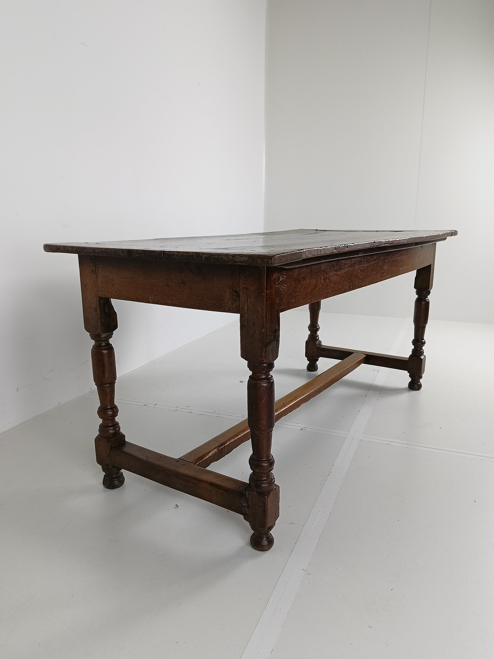 A early 19th century antique French dining table is a beautiful example of craftsmanship. Made from durable oak, Stand on barley legs aesthetic appeal, and connection to the past. Has signs of wear consistant with age and use.