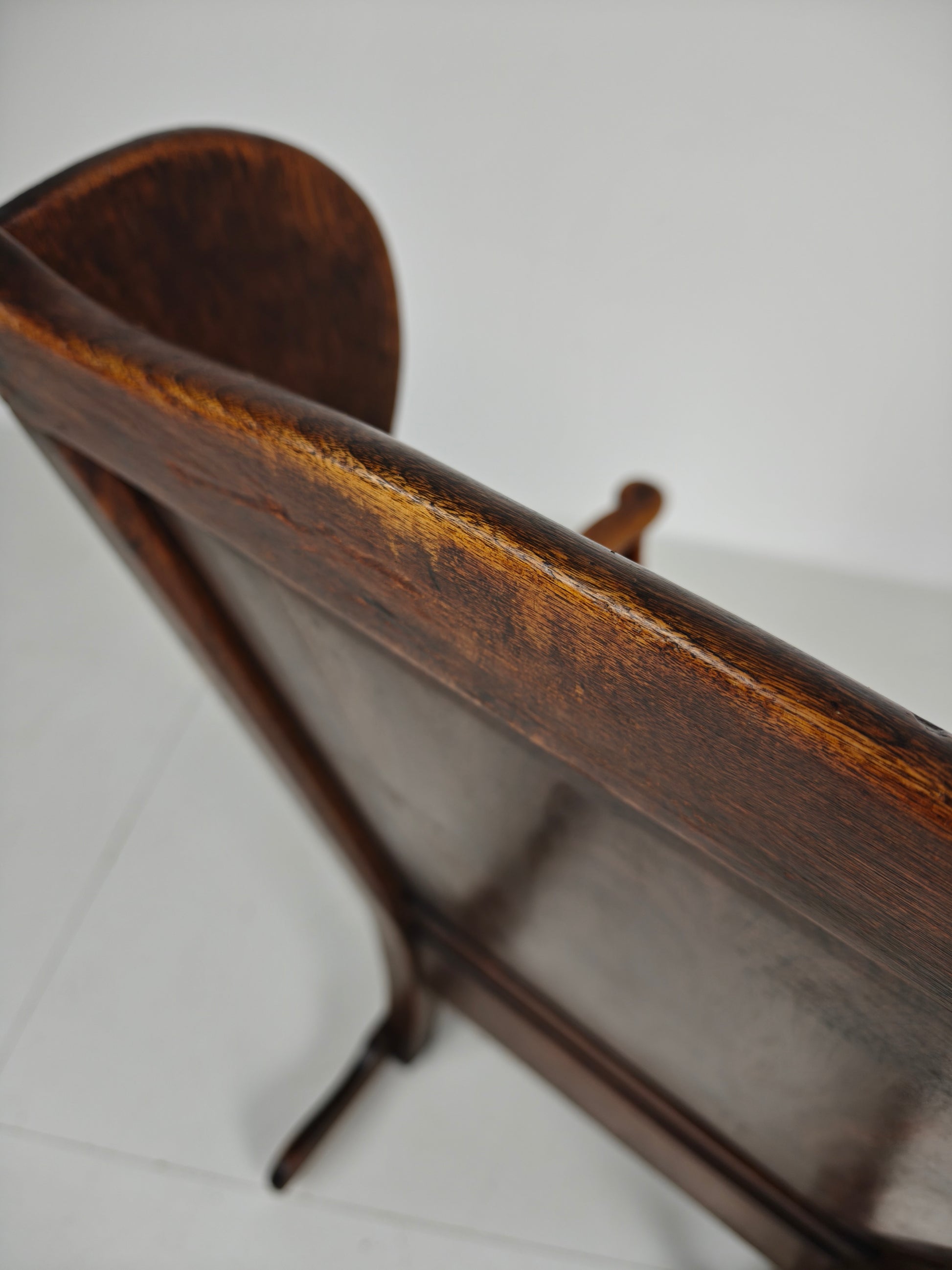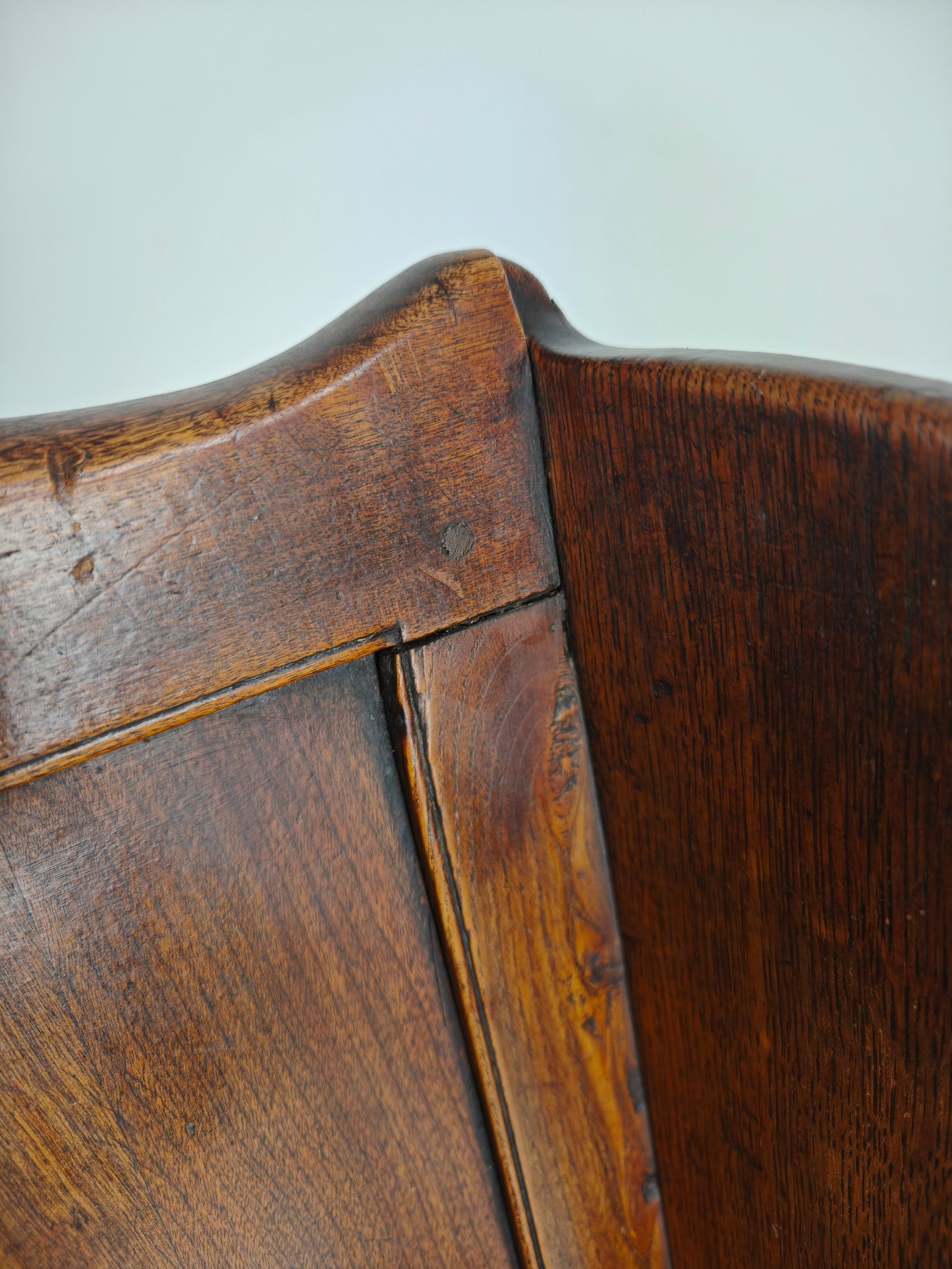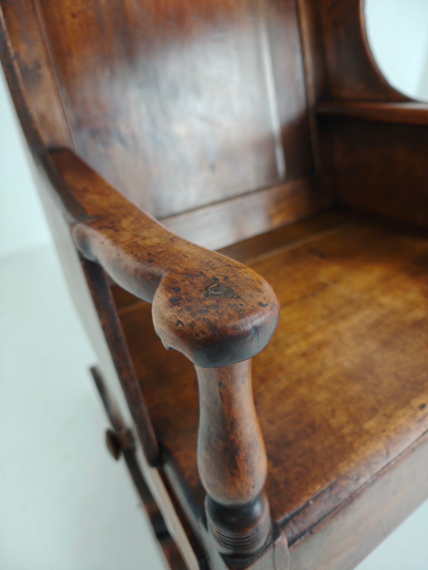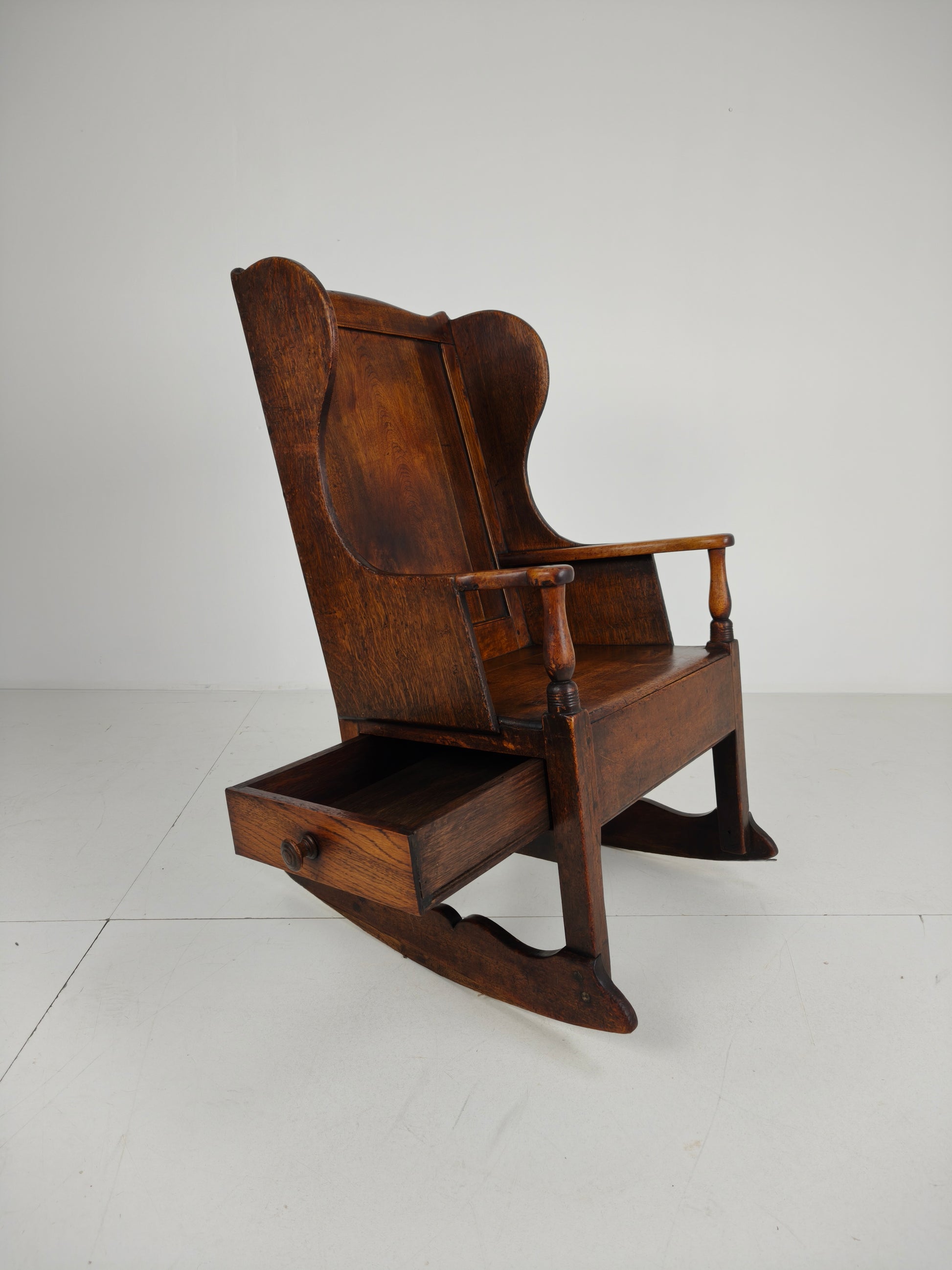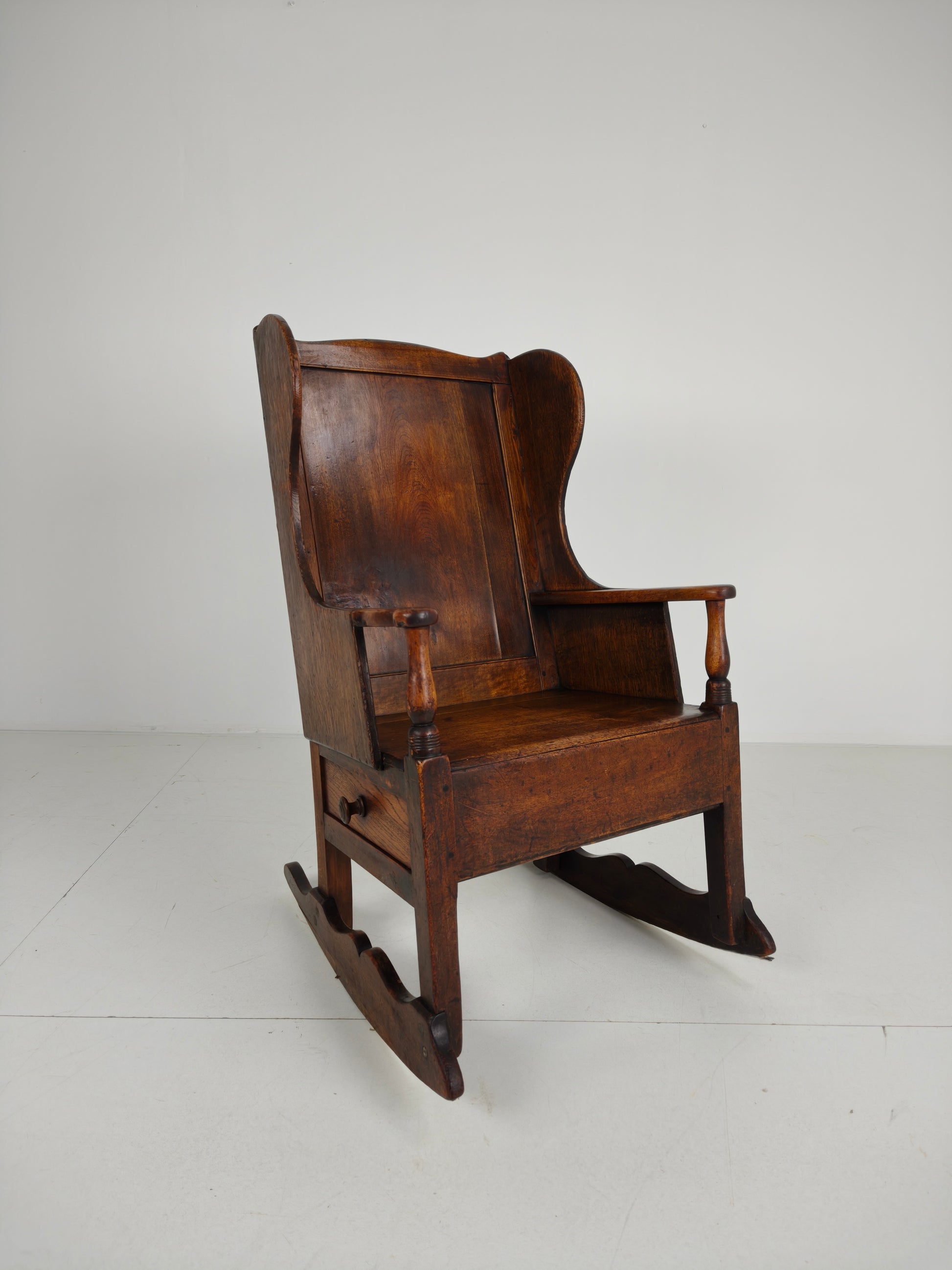 Beautiful 19th-century oak lambing chair, also known as a "baking chair" or traditional rocking chair, dating from around 1800. This timeless piece features classic craftsmanship and is made of solid oak, offering both character and comfort.
