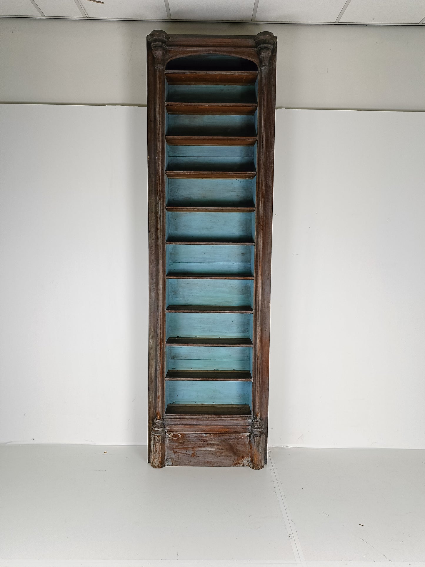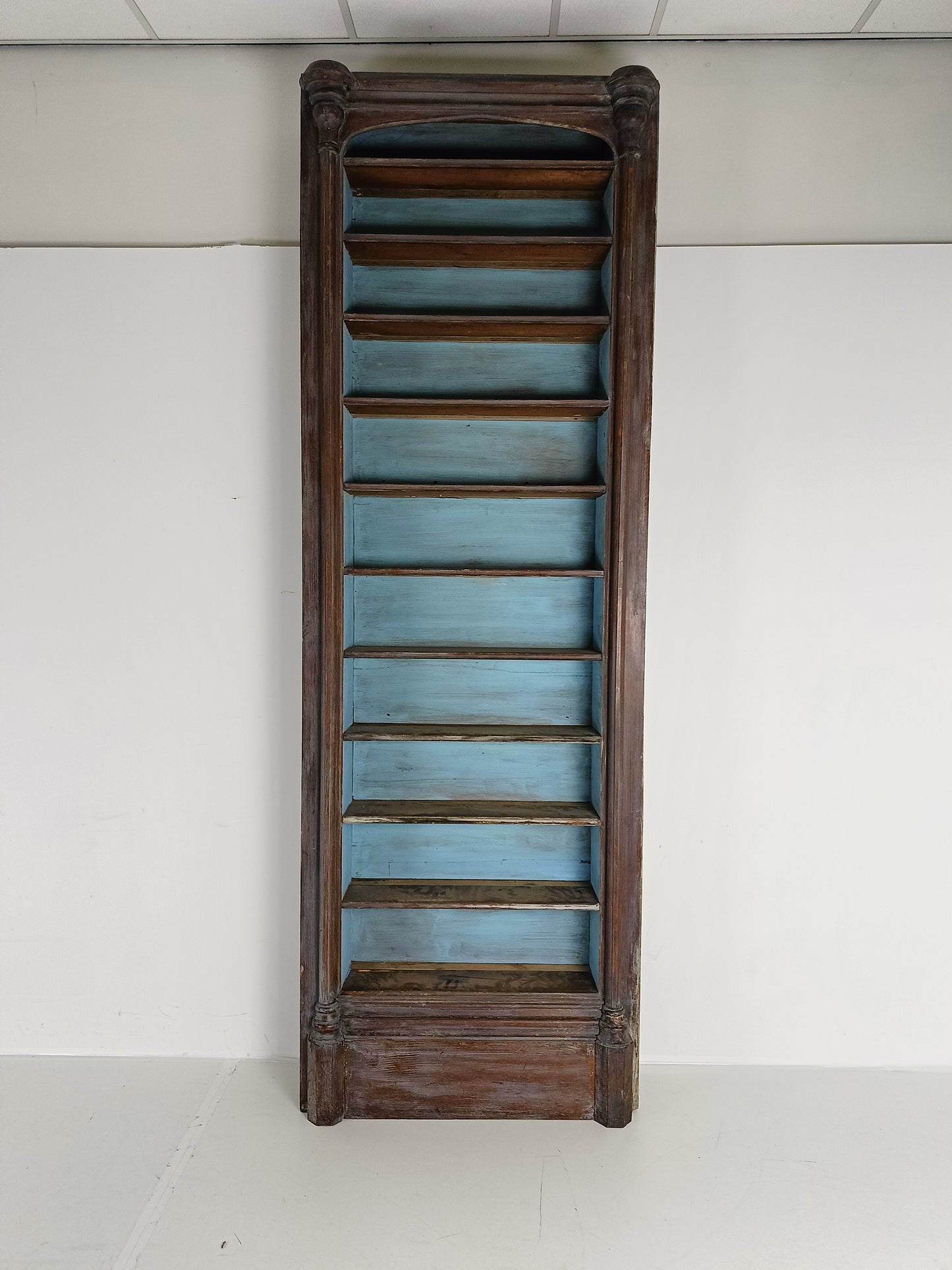 This large antique bookcase from the United Kingdom, showcasing a beautiful, aged patina that enhances their timeless appeal. Crafted from sturdy, durable materials, they have been built to last and provide ample storage space for books or display items. Wooden bookcase from an ols English country house. Original back boards and crackling old paint with a sof blue paint inside the shelves. Has signs of wear consistant with age and use.