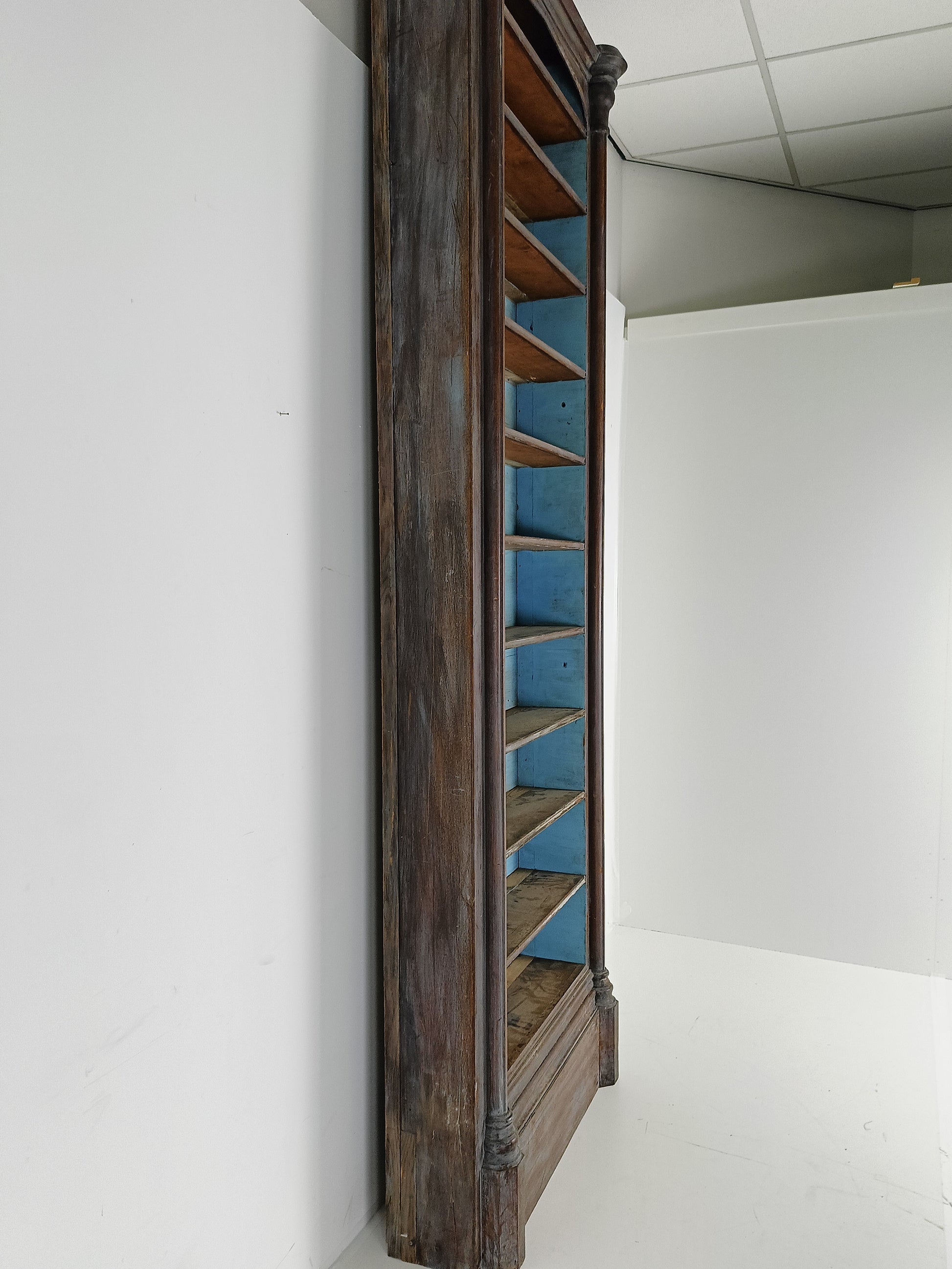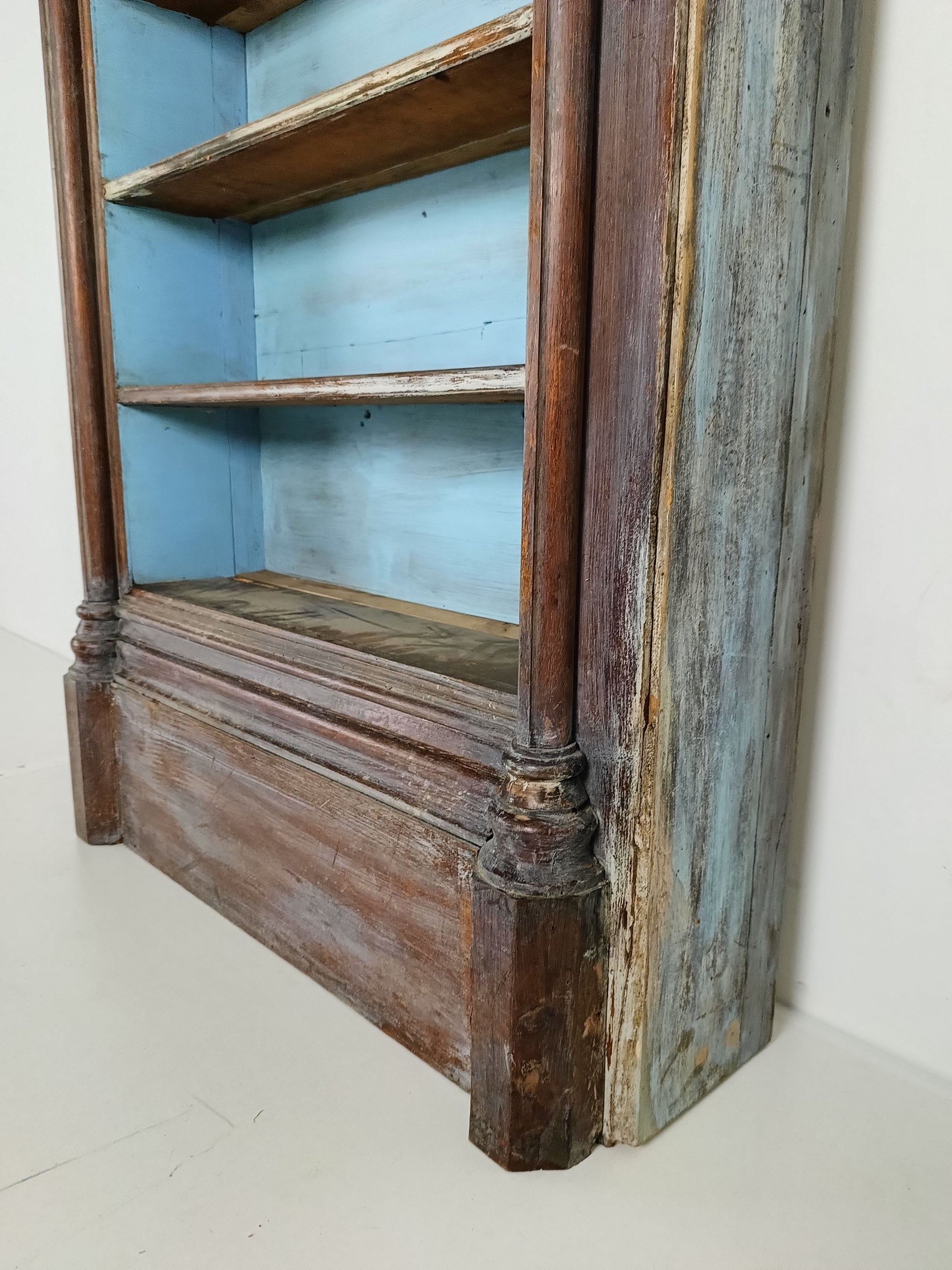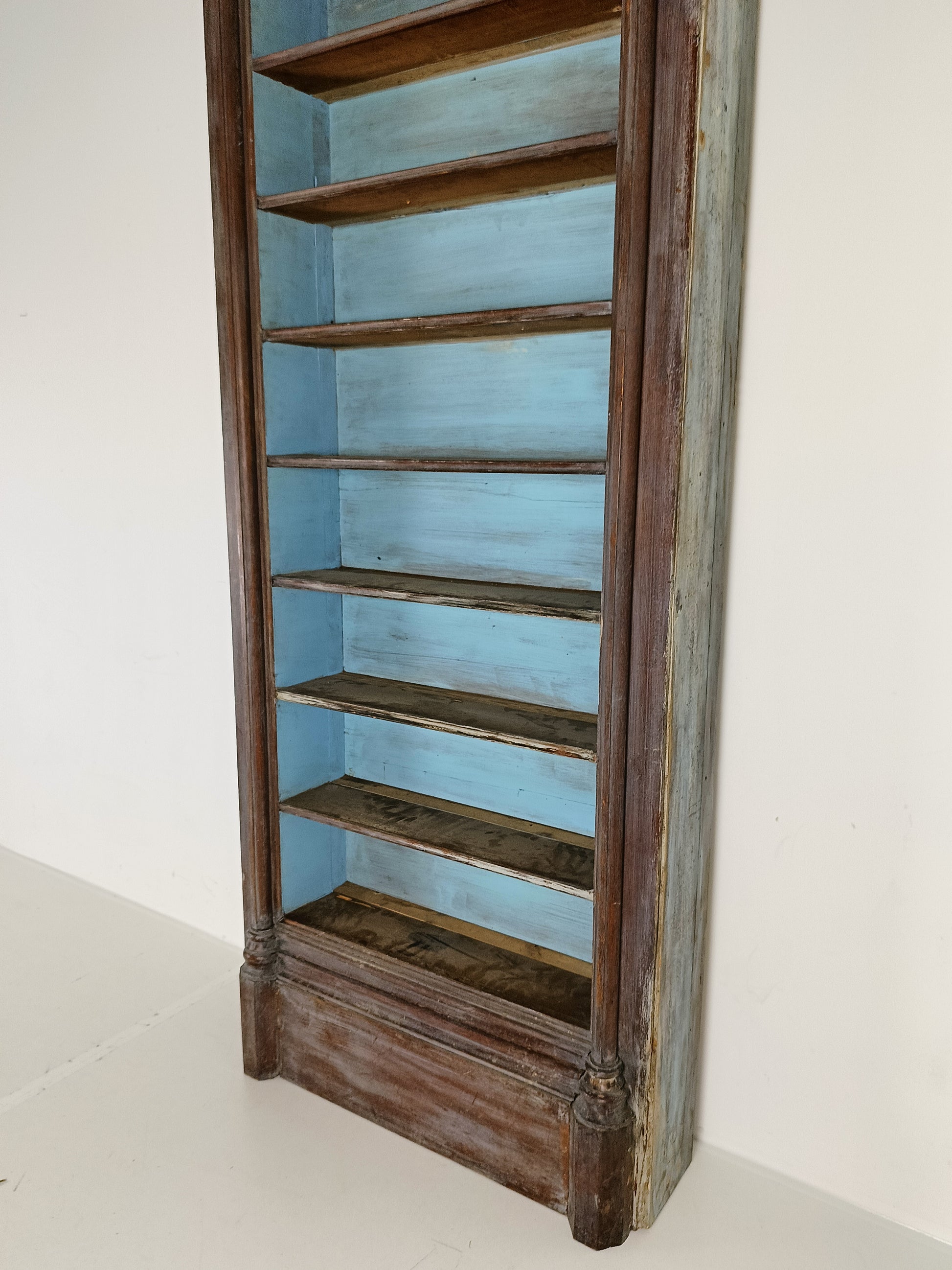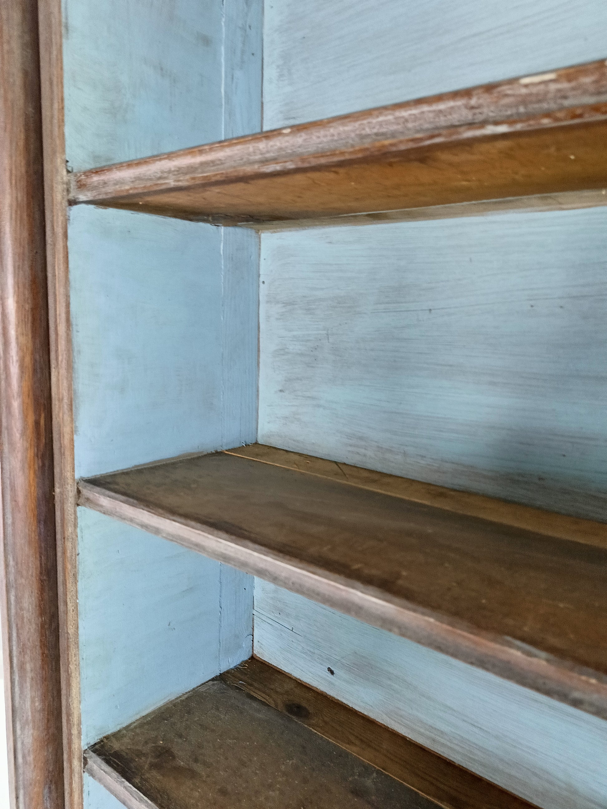 This large antique bookcase from the United Kingdom, showcasing a beautiful, aged patina that enhances their timeless appeal. Crafted from sturdy, durable materials, they have been built to last and provide ample storage space for books or display items. Wooden bookcase from an ols English country house. Original back boards and crackling old paint with a sof blue paint inside the shelves. Has signs of wear consistant with age and use.