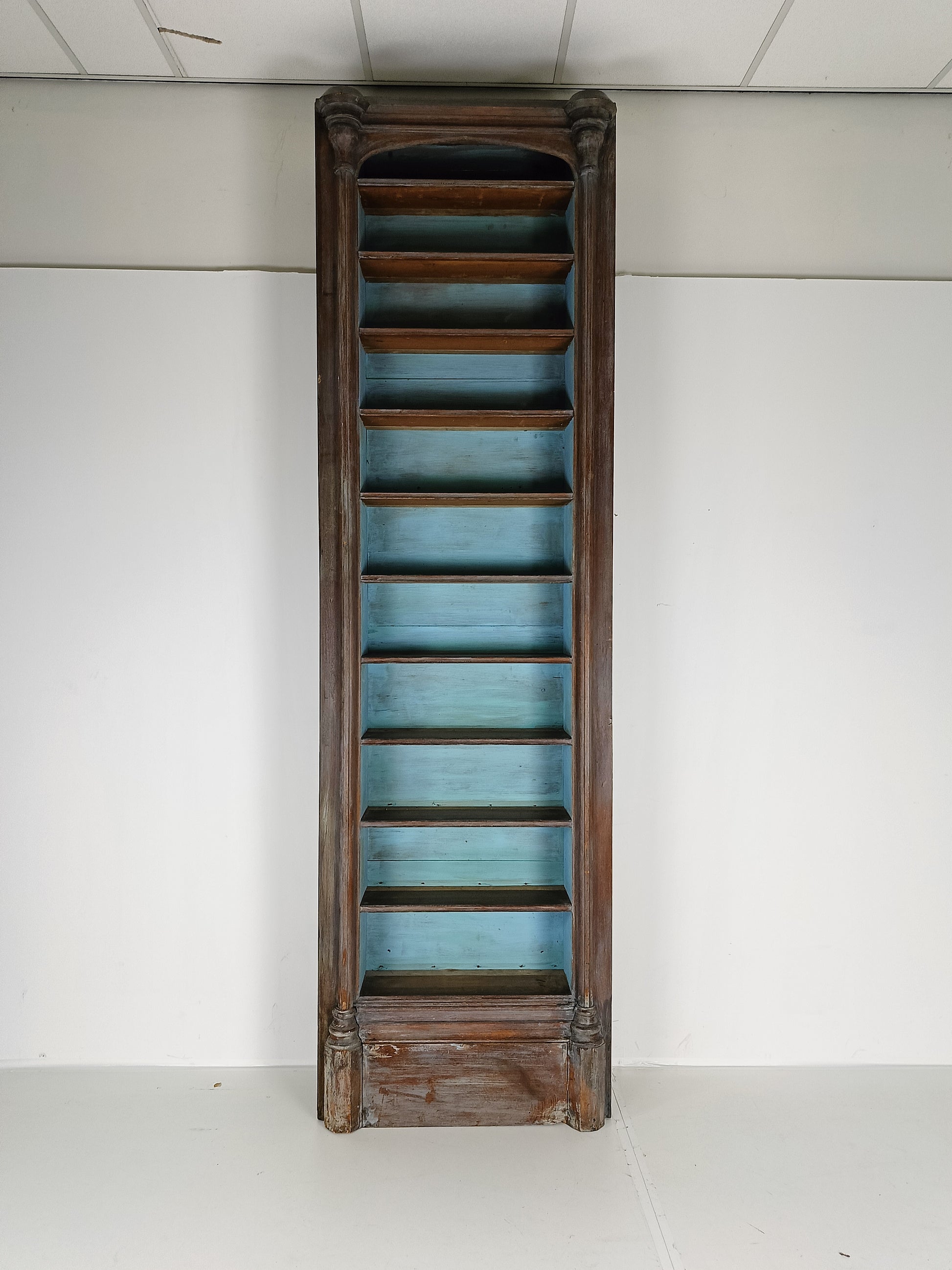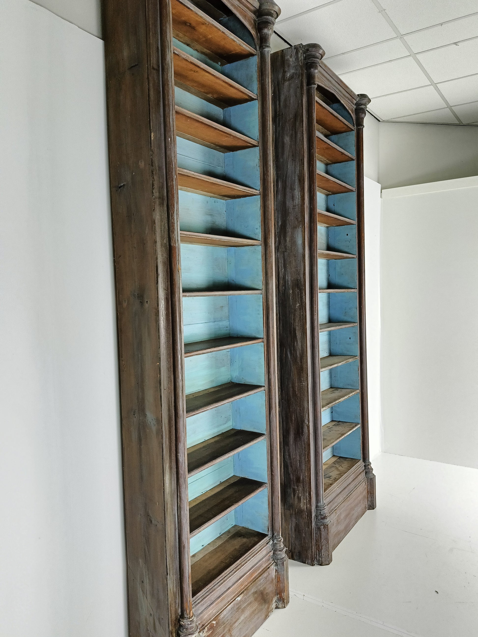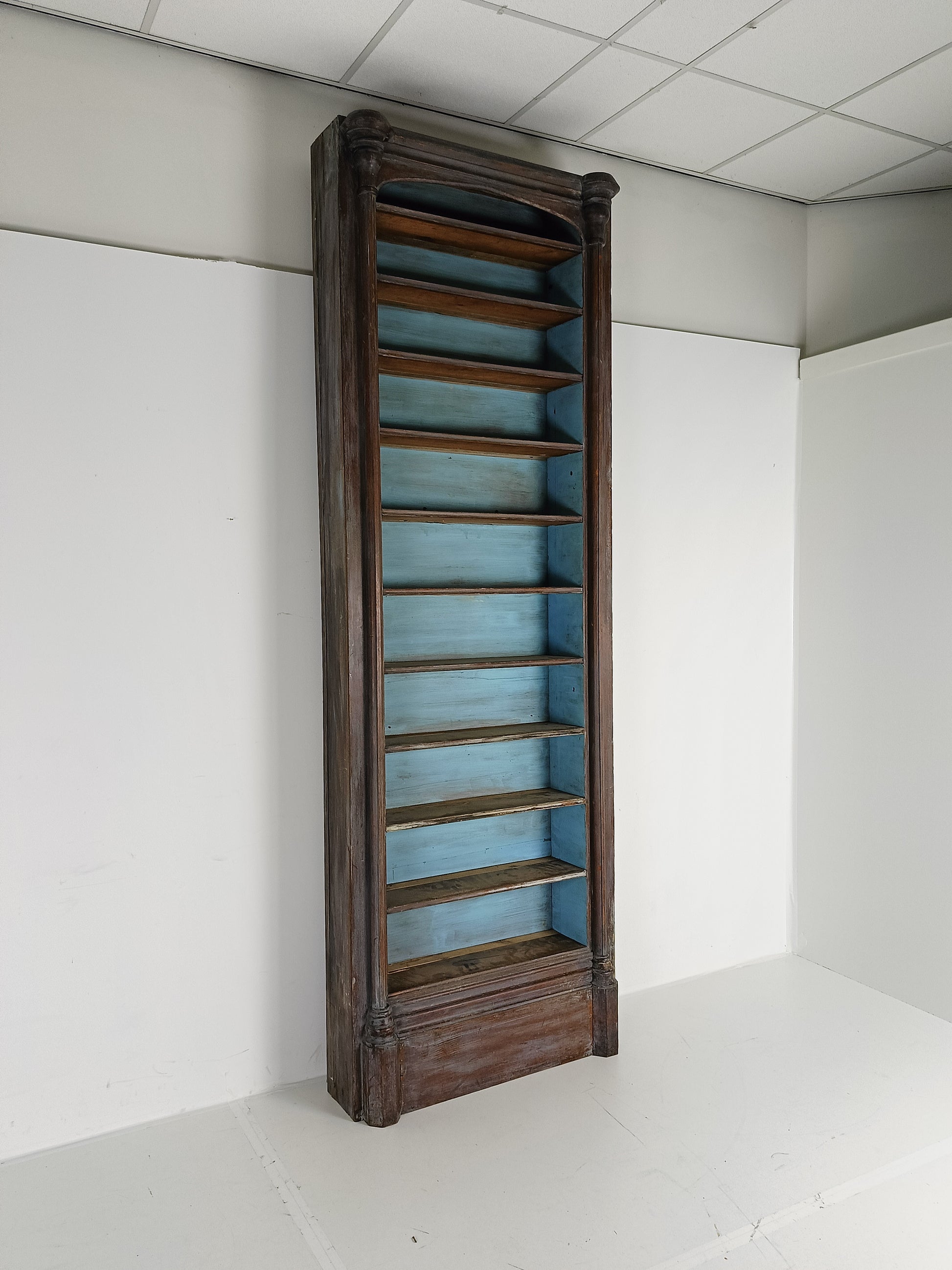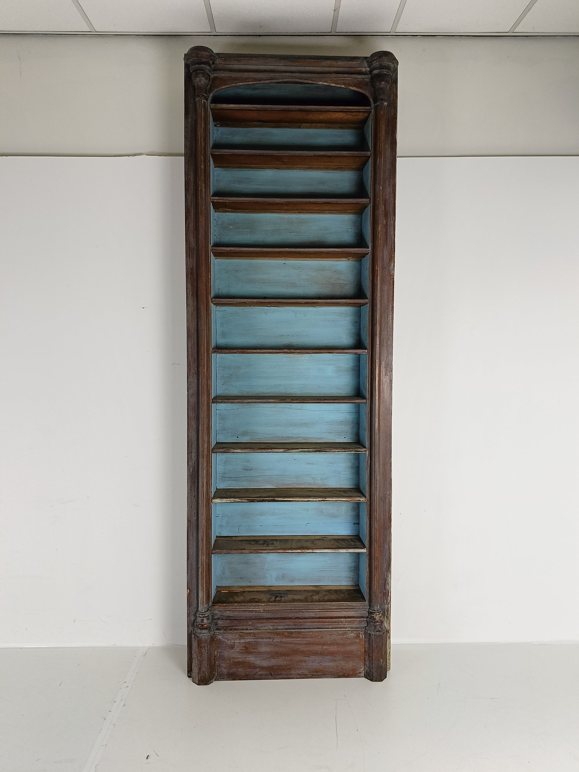 This large antique bookcase from the United Kingdom, showcasing a beautiful, aged patina that enhances their timeless appeal. Crafted from sturdy, durable materials, they have been built to last and provide ample storage space for books or display items. Wooden bookcase from an ols English country house. Original back boards and crackling old paint with a sof blue paint inside the shelves. Has signs of wear consistant with age and use.