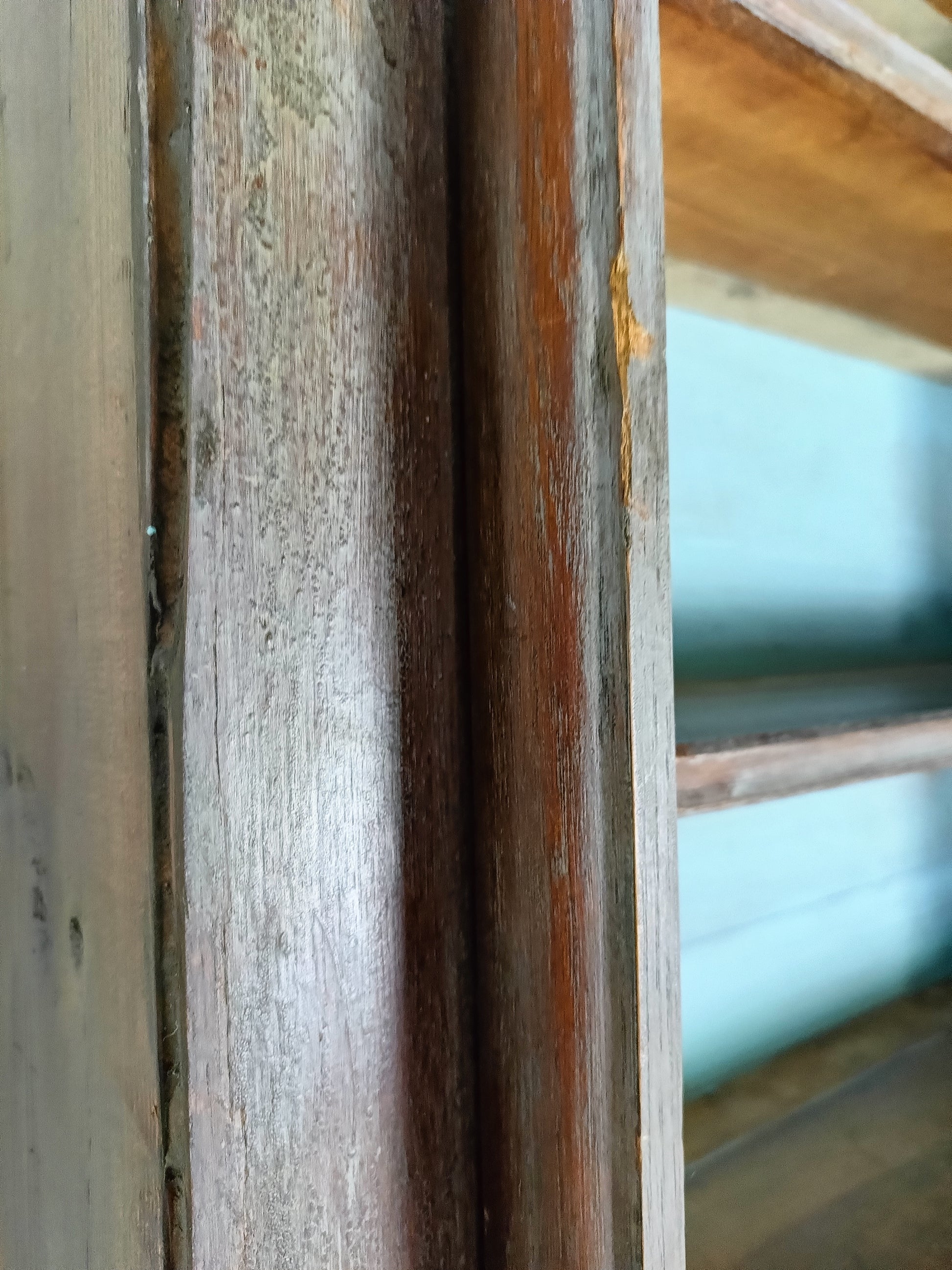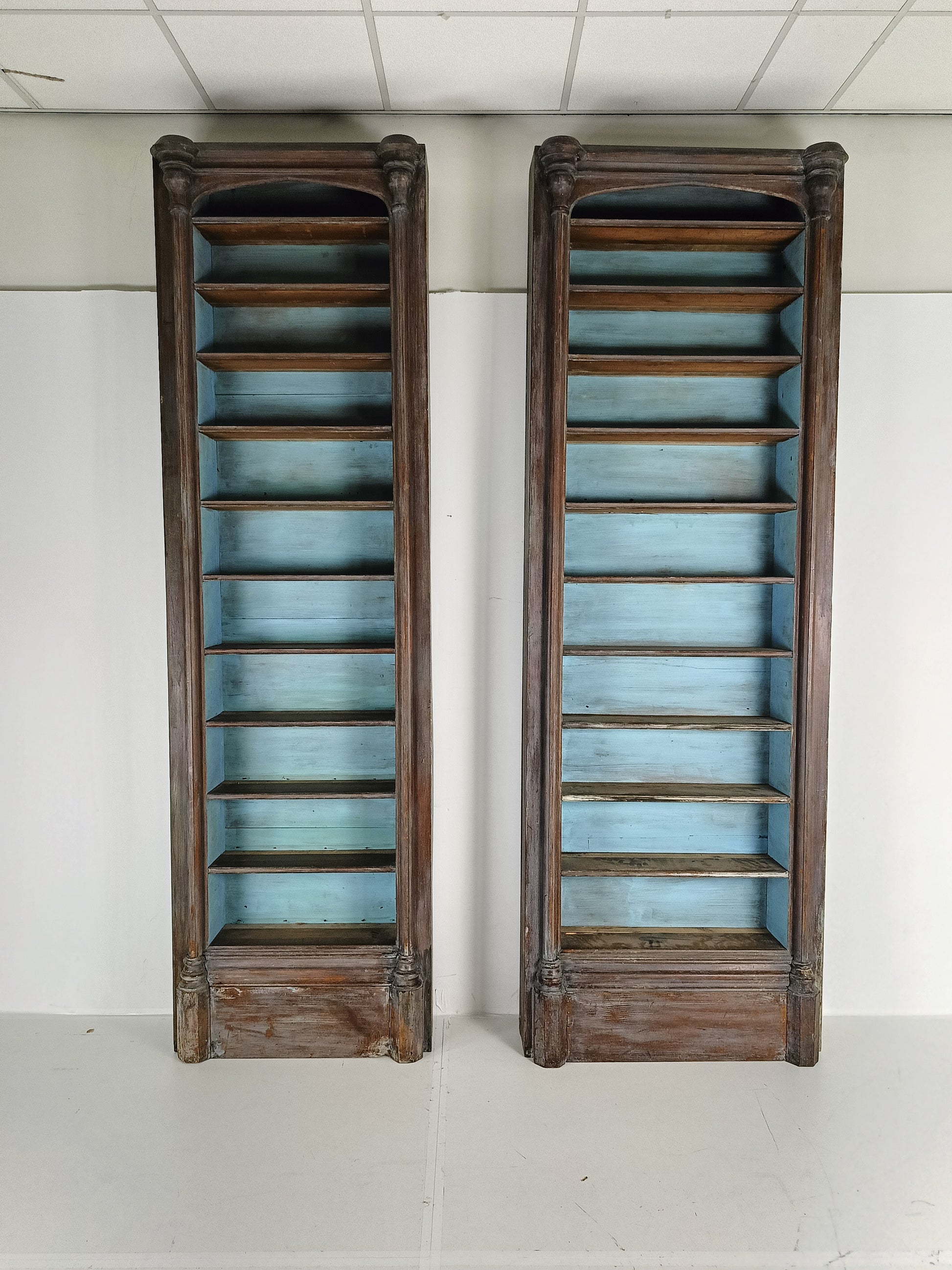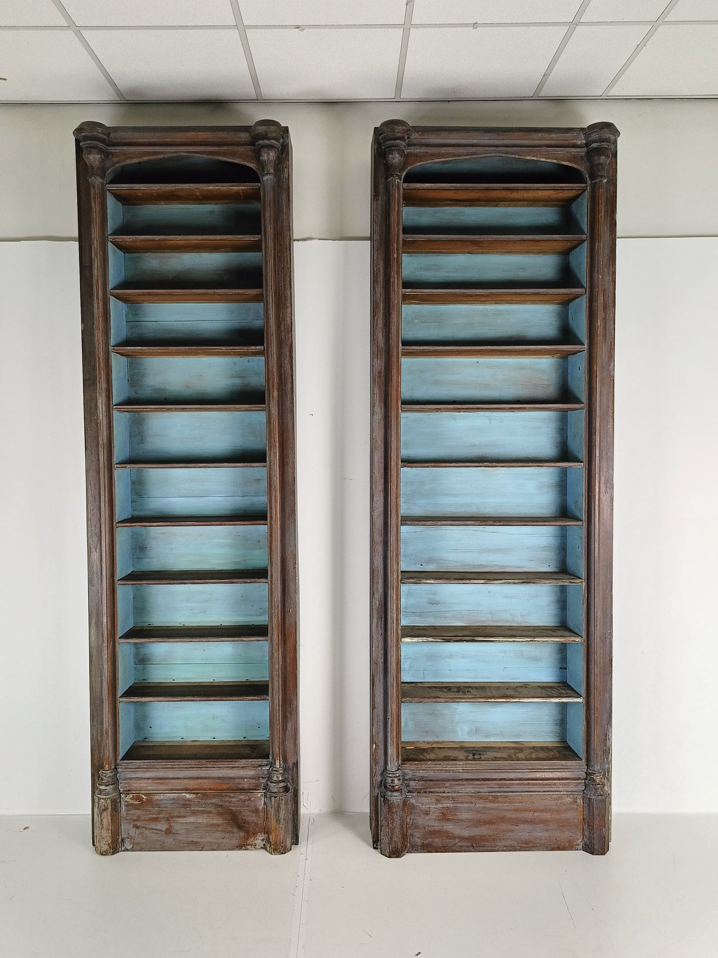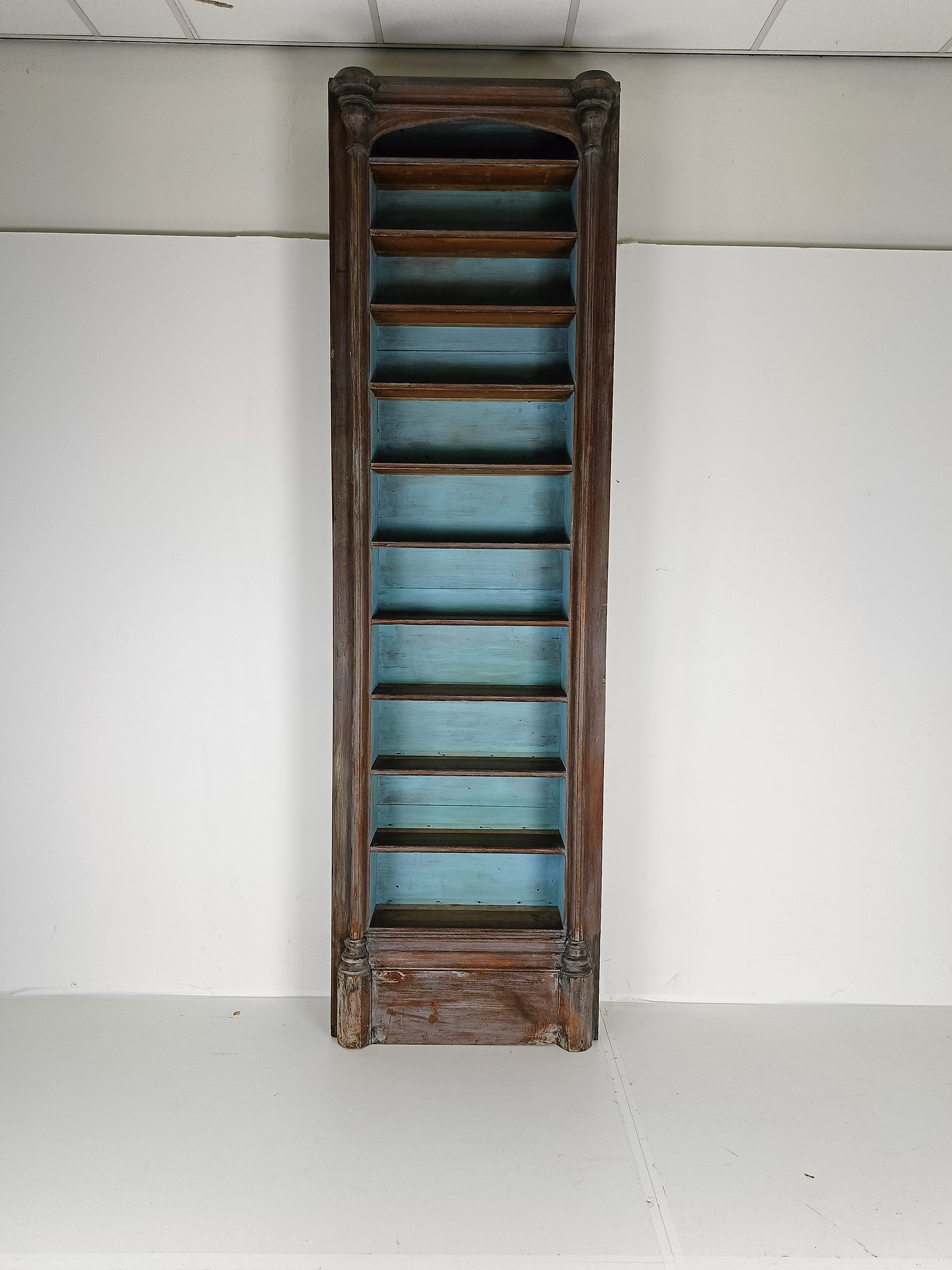 This large antique bookcase from the United Kingdom, showcasing a beautiful, aged patina that enhances their timeless appeal. Crafted from sturdy, durable materials, they have been built to last and provide ample storage space for books or display items. Wooden bookcase from an ols English country house. Original back boards and crackling old paint with a sof blue paint inside the shelves. Has signs of wear consistant with age and use.