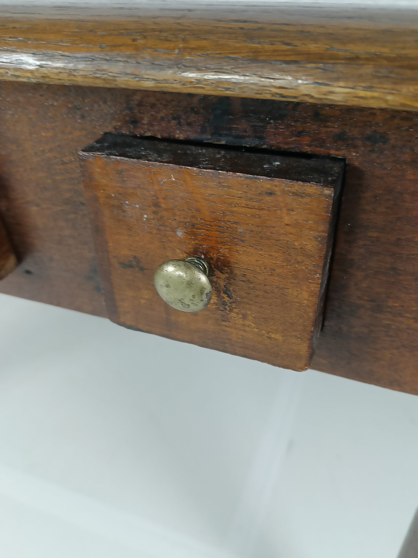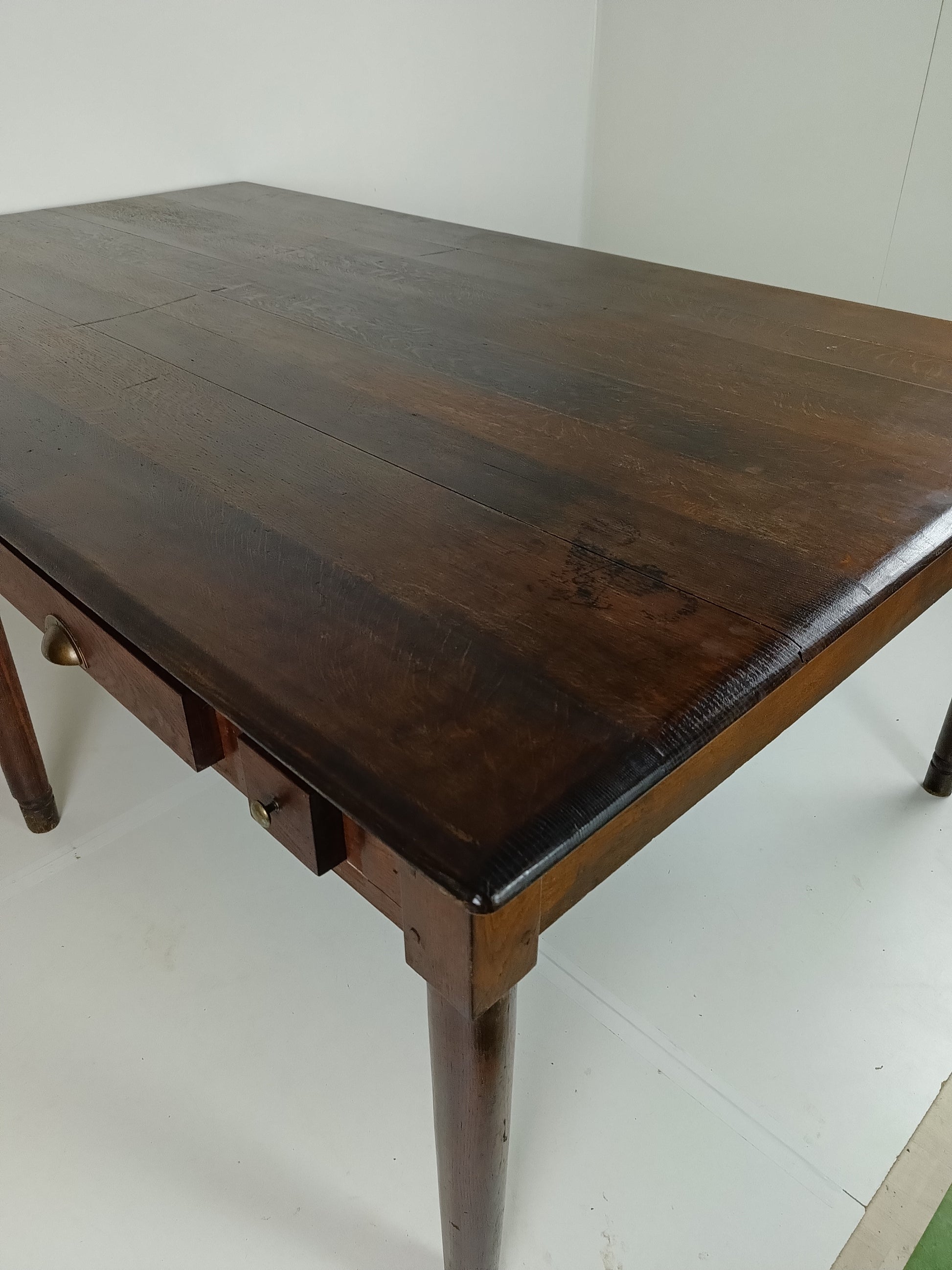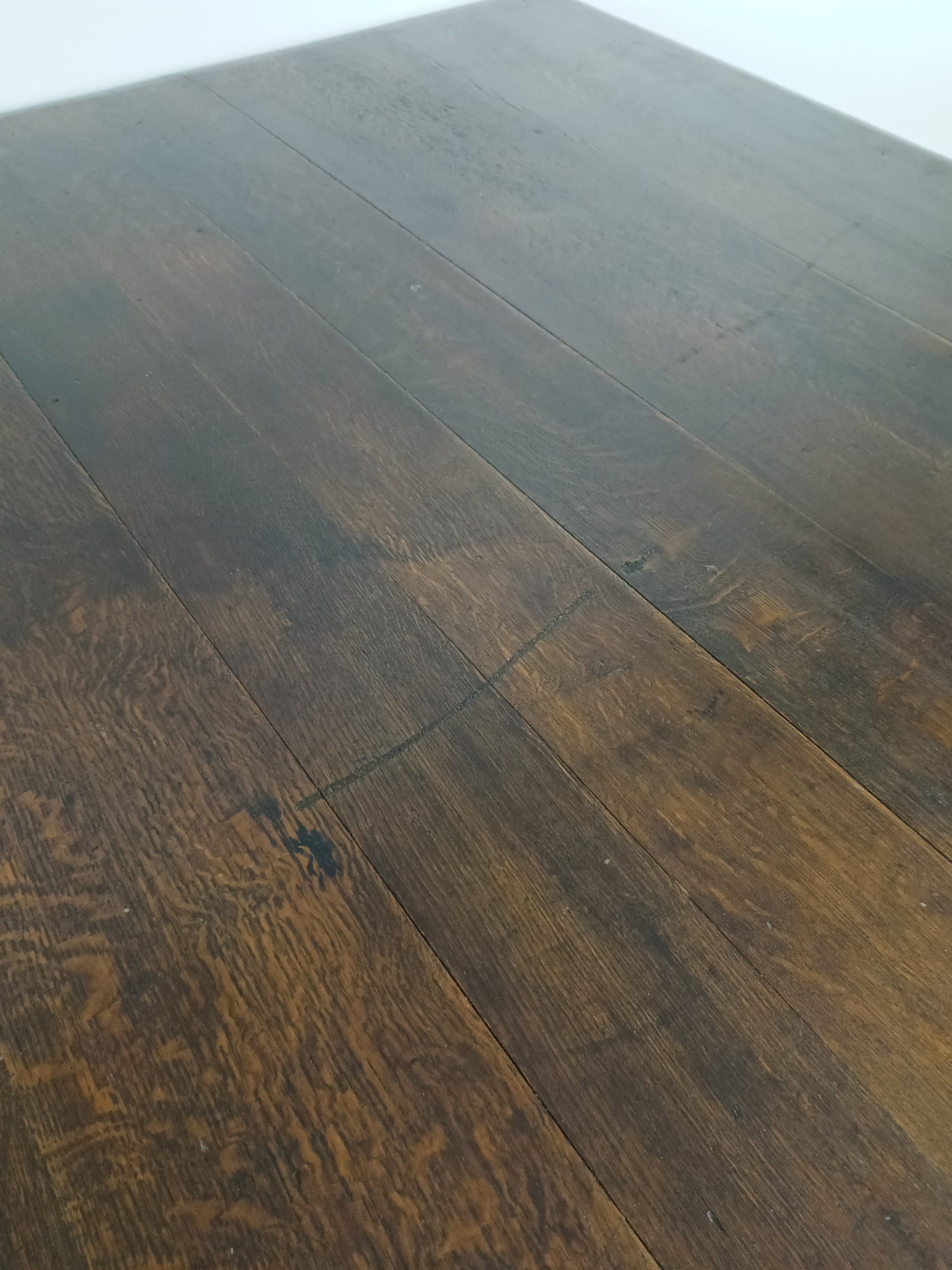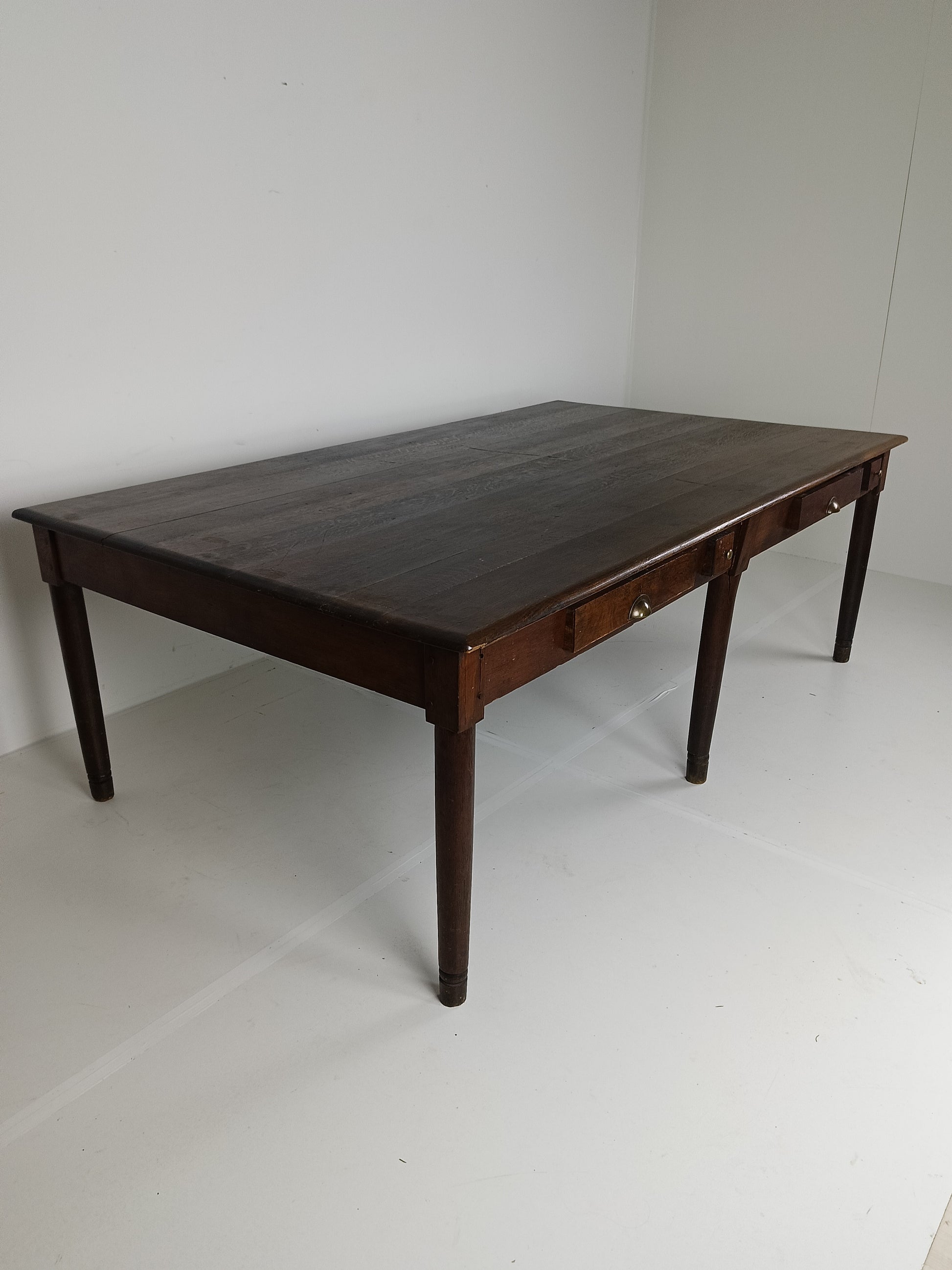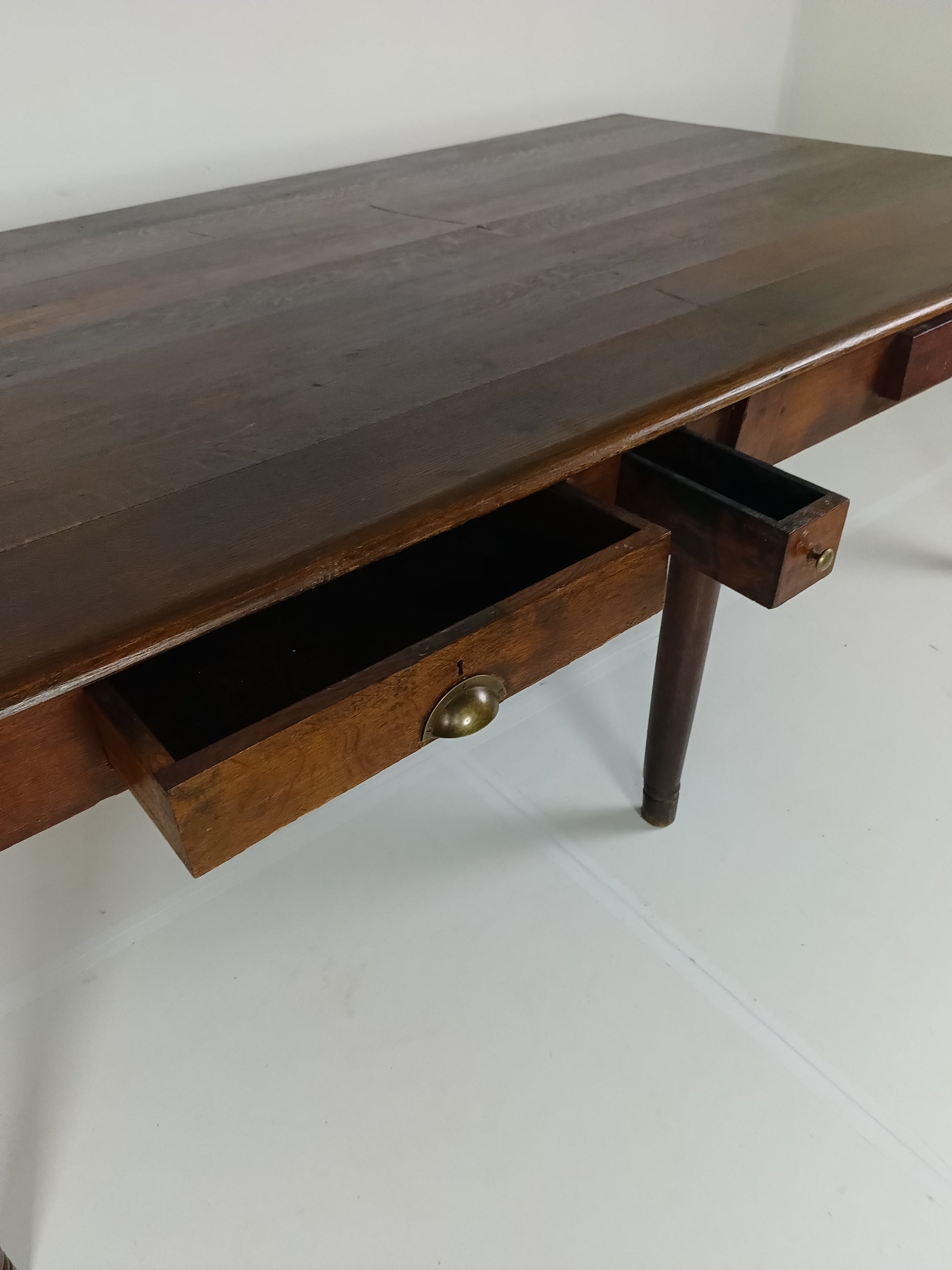 A stunning antique oak monastery table from late 19th-century Belgium, rich in history and character. This exceptional piece was originally used by monks for writing, as evidenced by the small drawers designed to store writing utensils—with traces of ink still visible.
