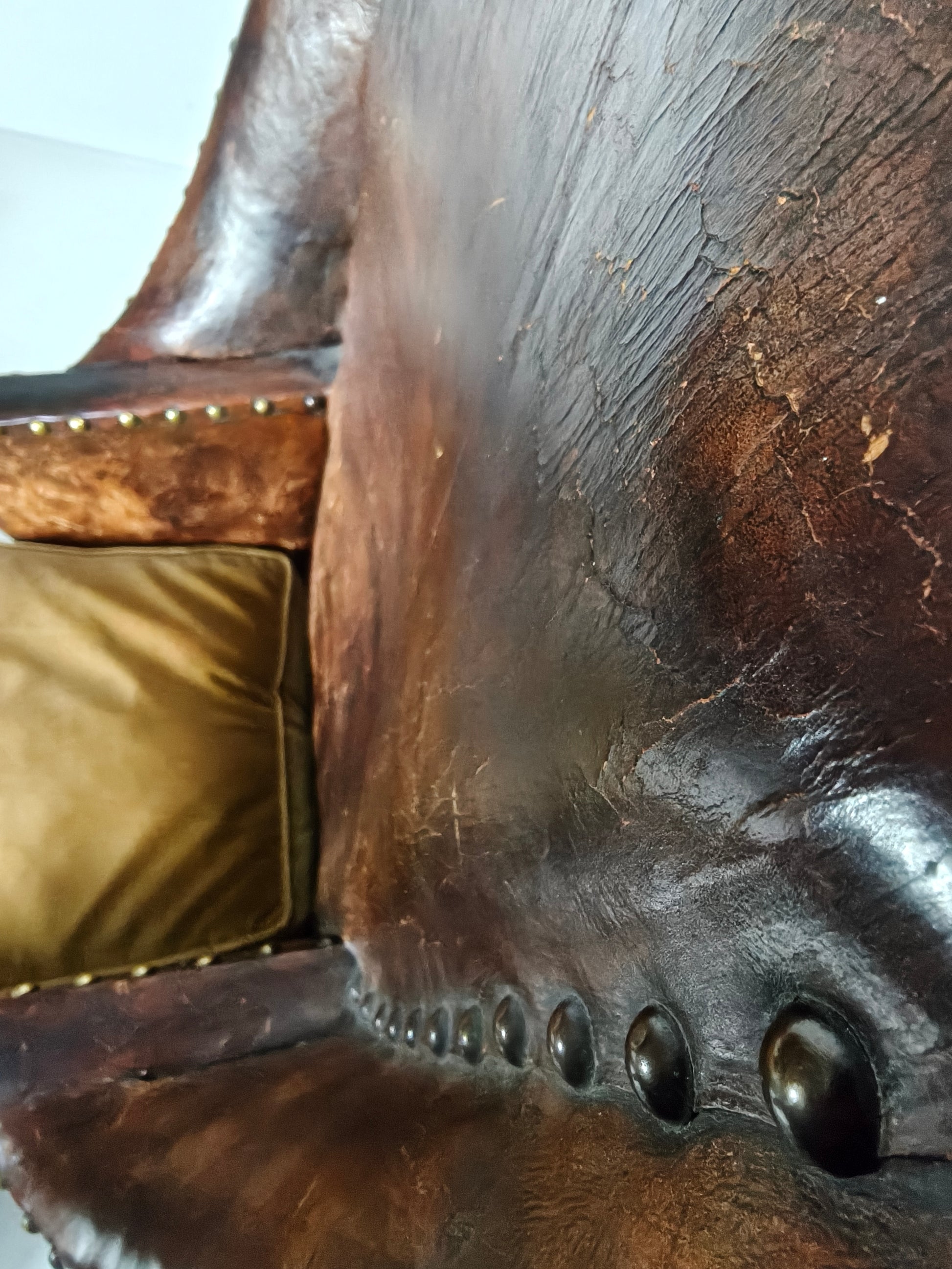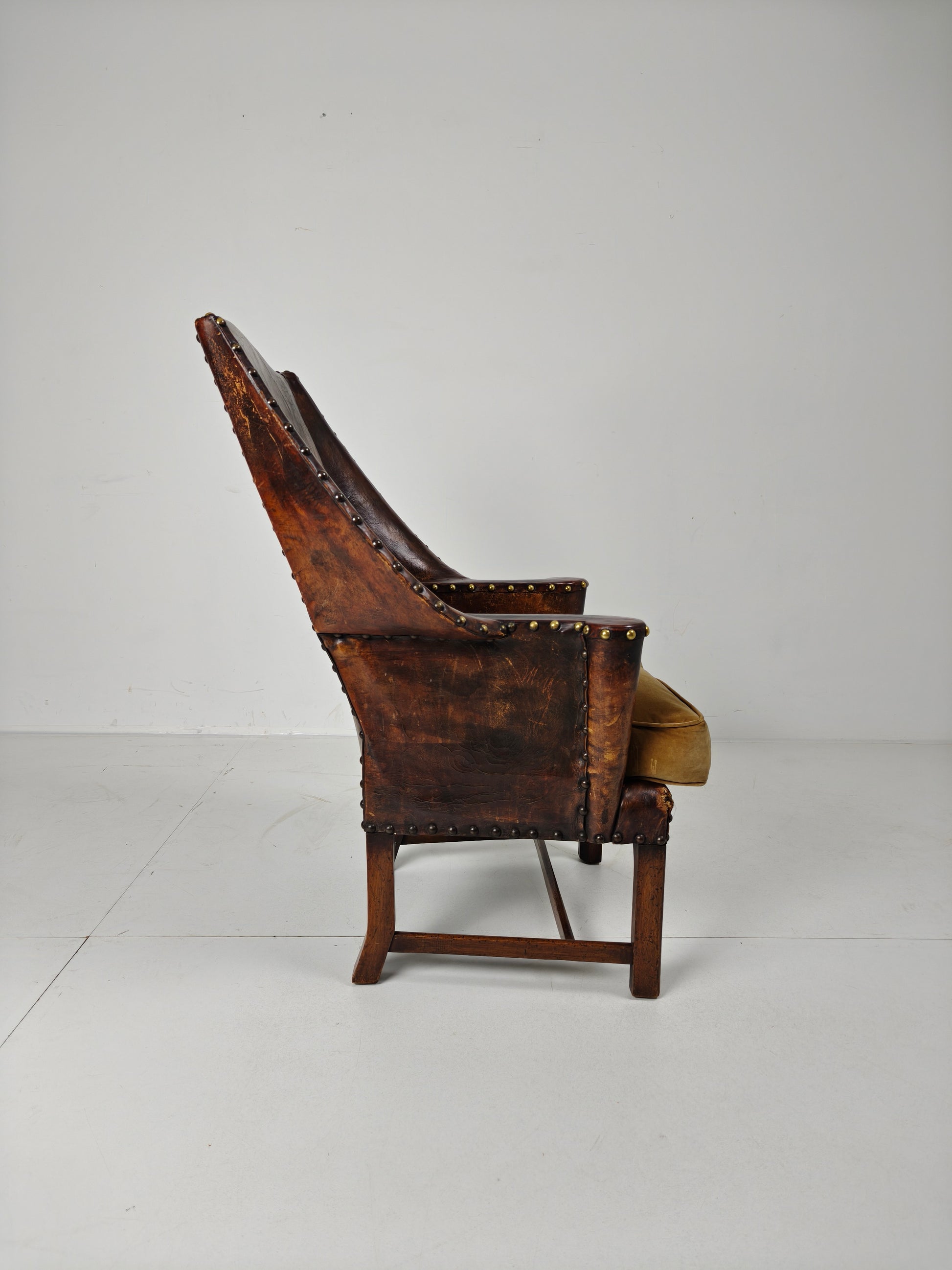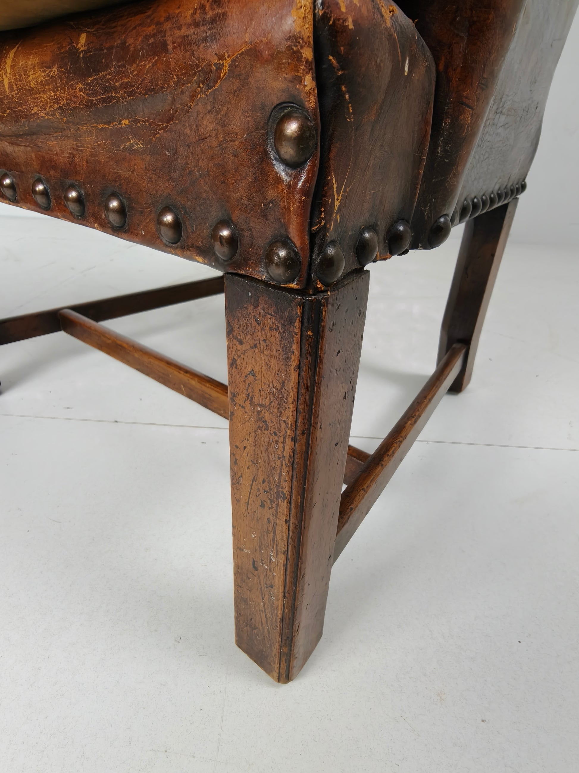 Rare weathered armchair with decorative nailhead trim along the frame and a upholstered cushion. Made in England, around 1800. Has signs of wear consistant with age and use, shown in pictures.