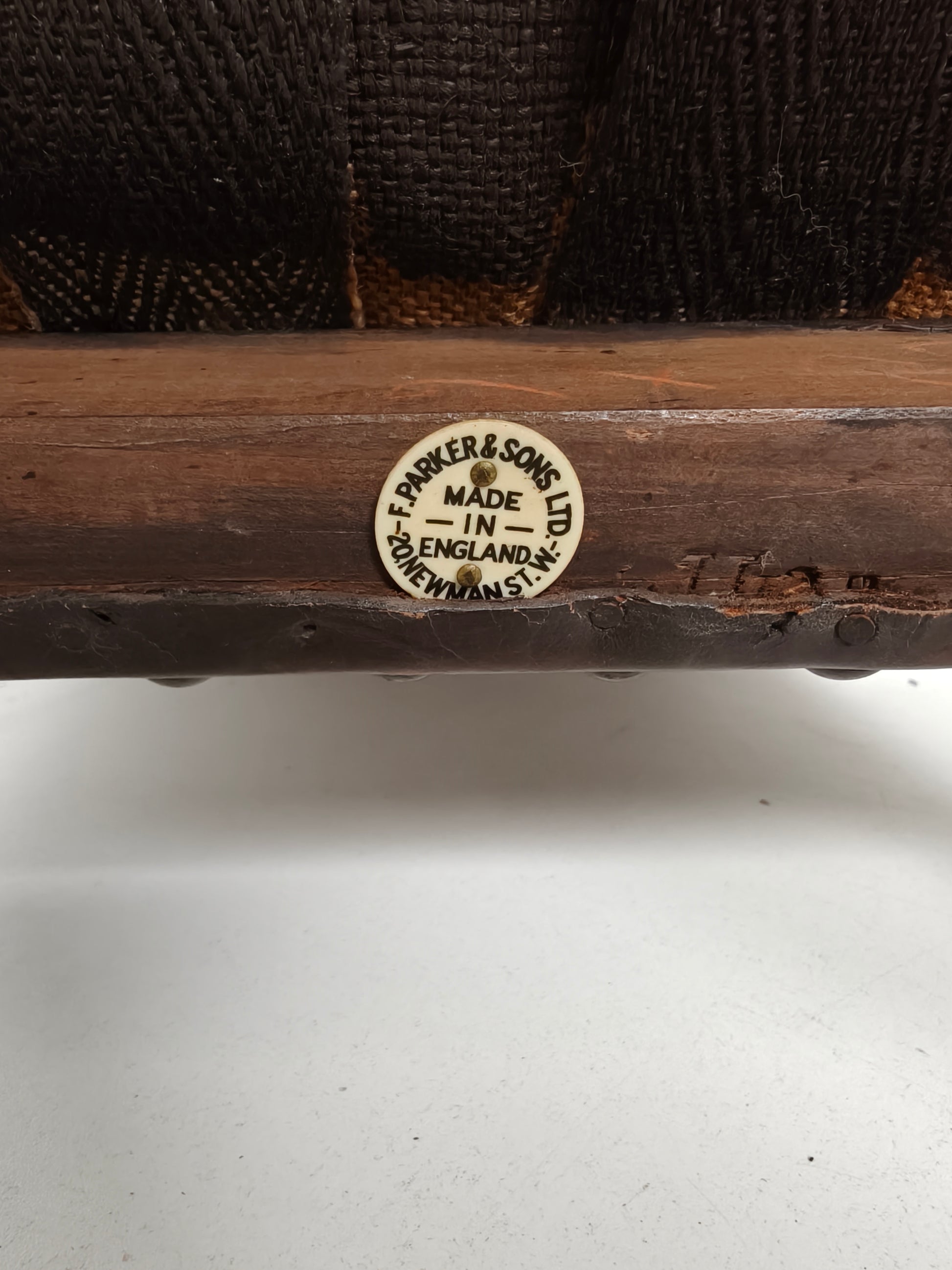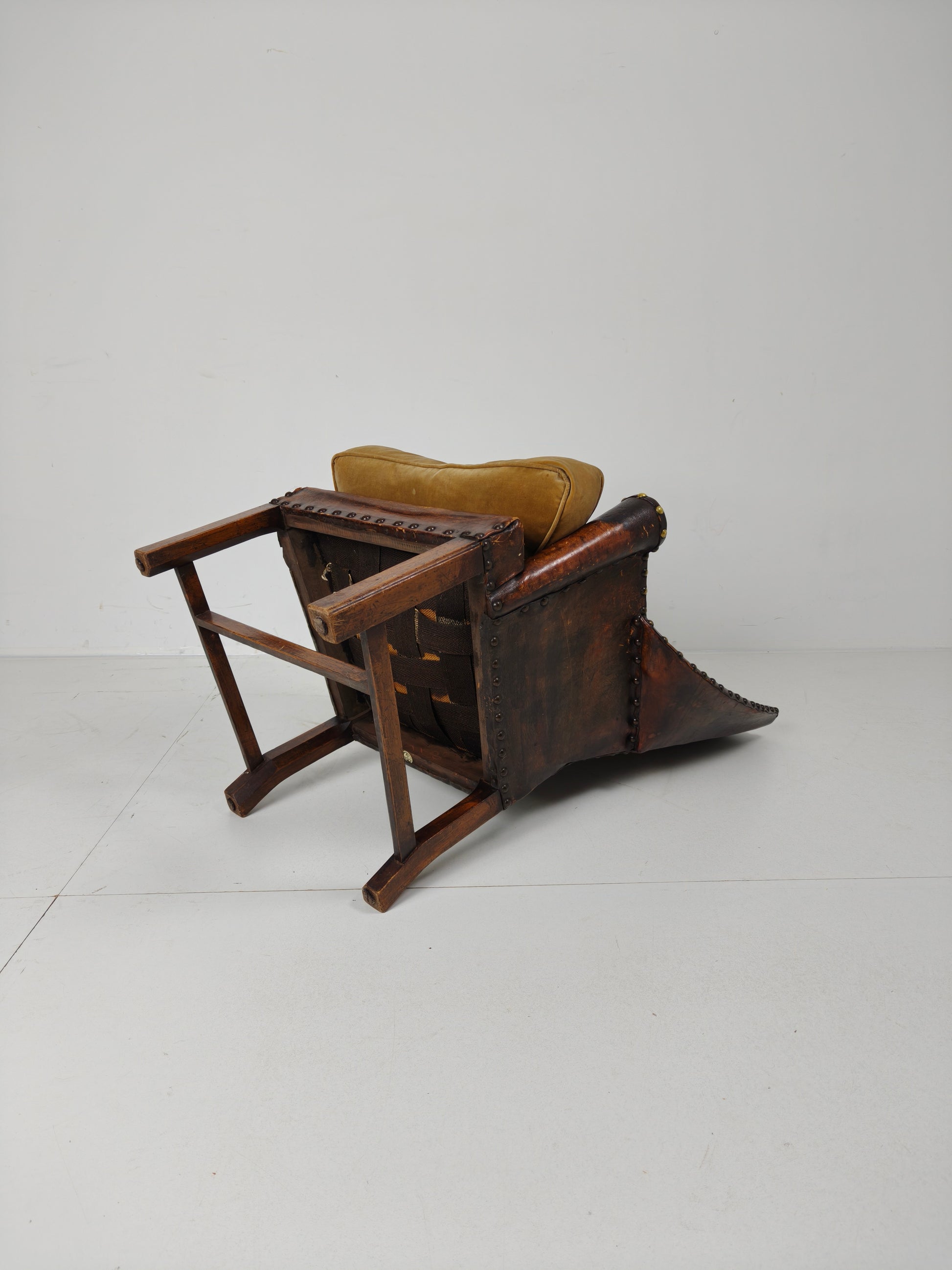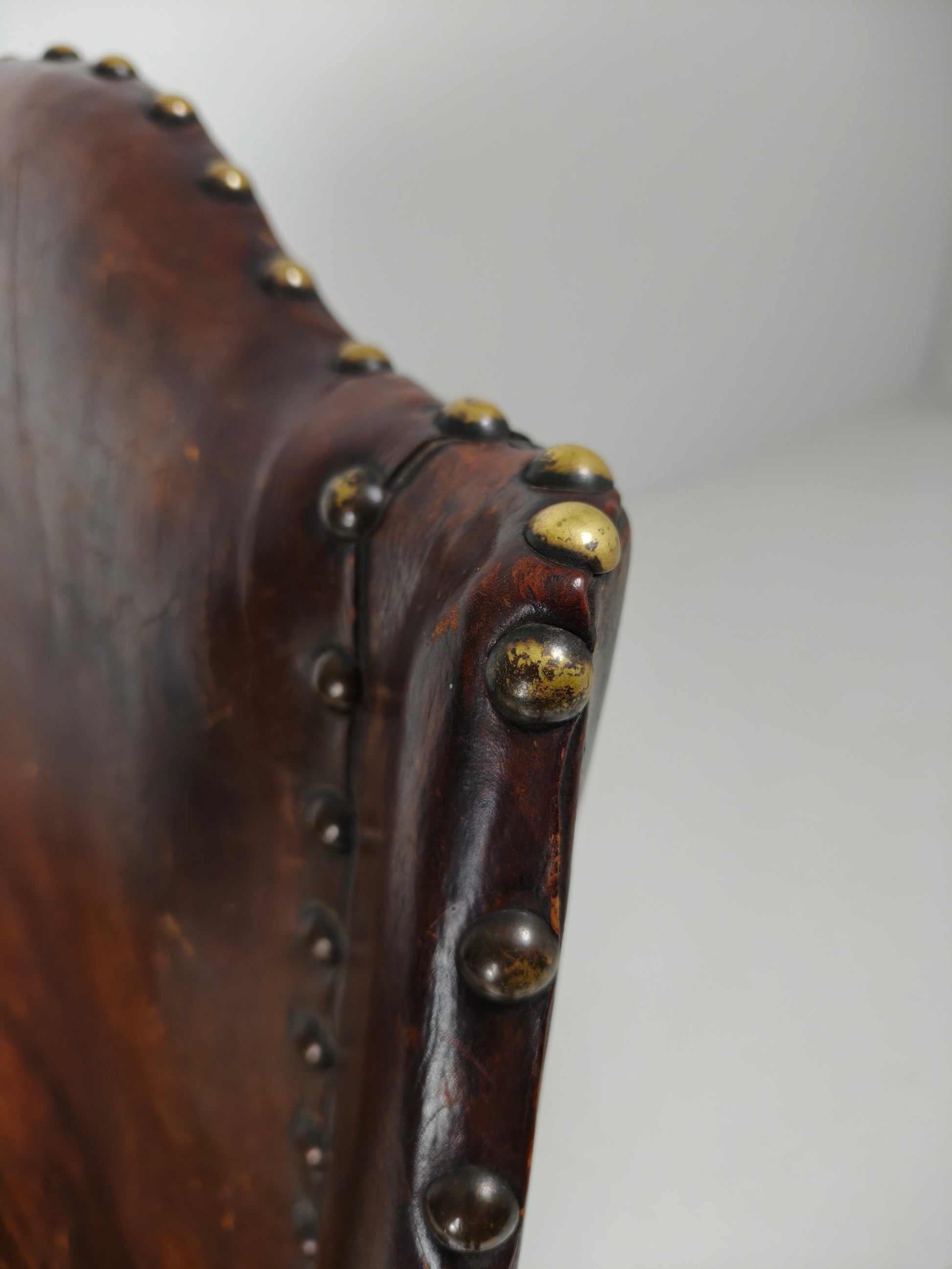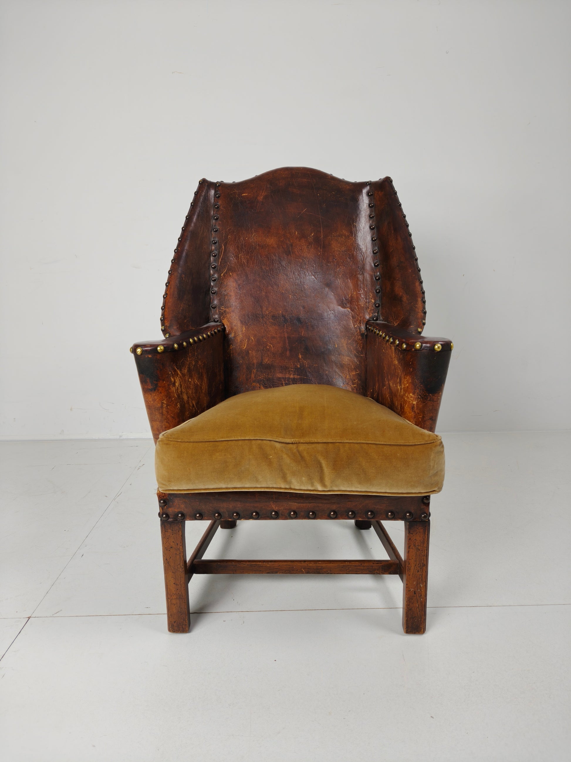 Rare weathered armchair with decorative nailhead trim along the frame and a upholstered cushion. Made in England, around 1800. Has signs of wear consistant with age and use, shown in pictures.
