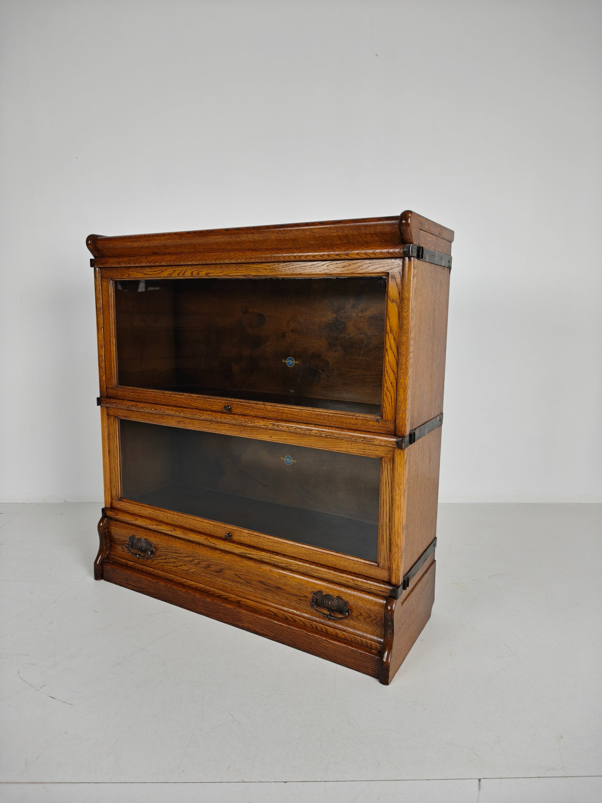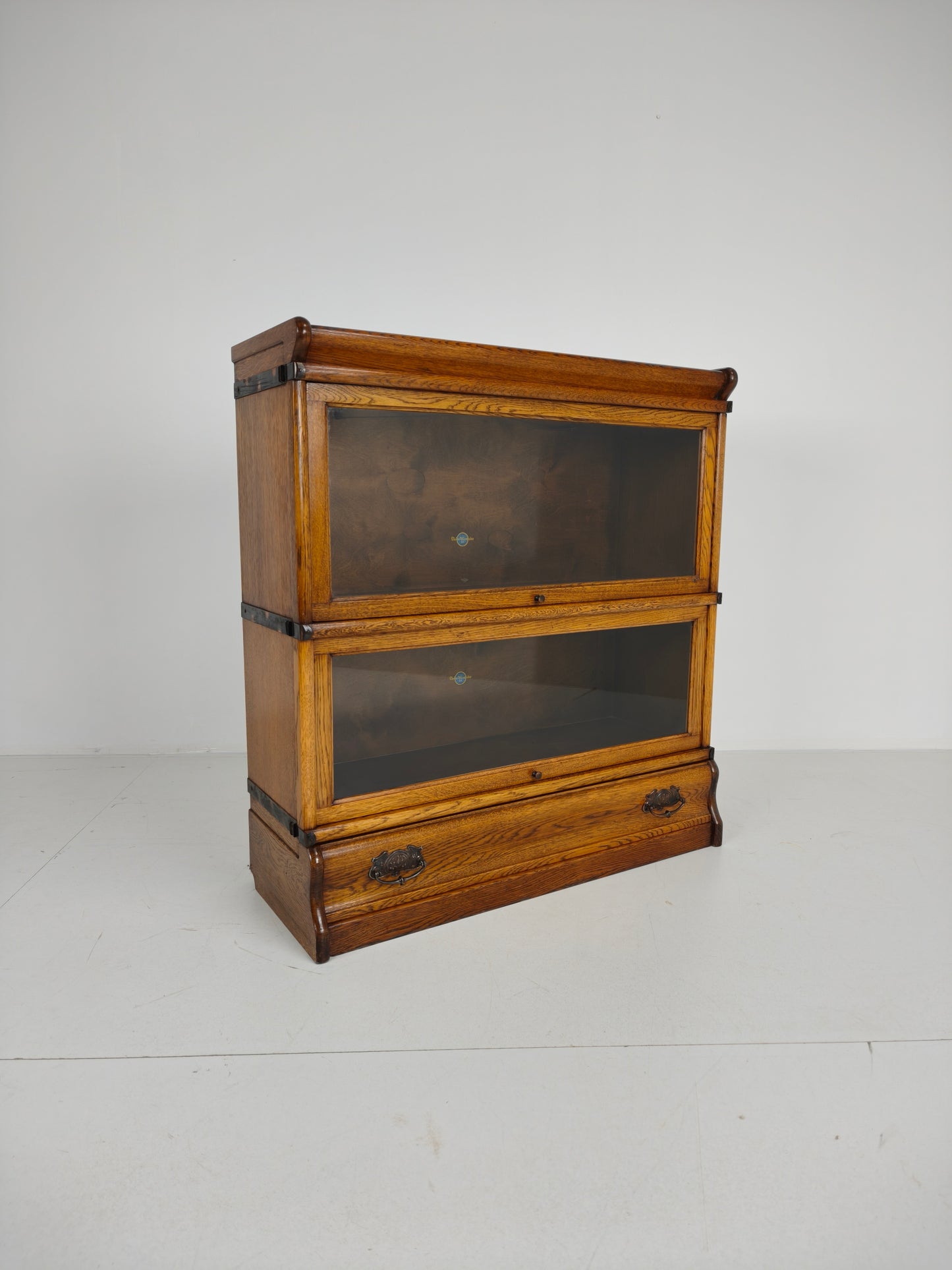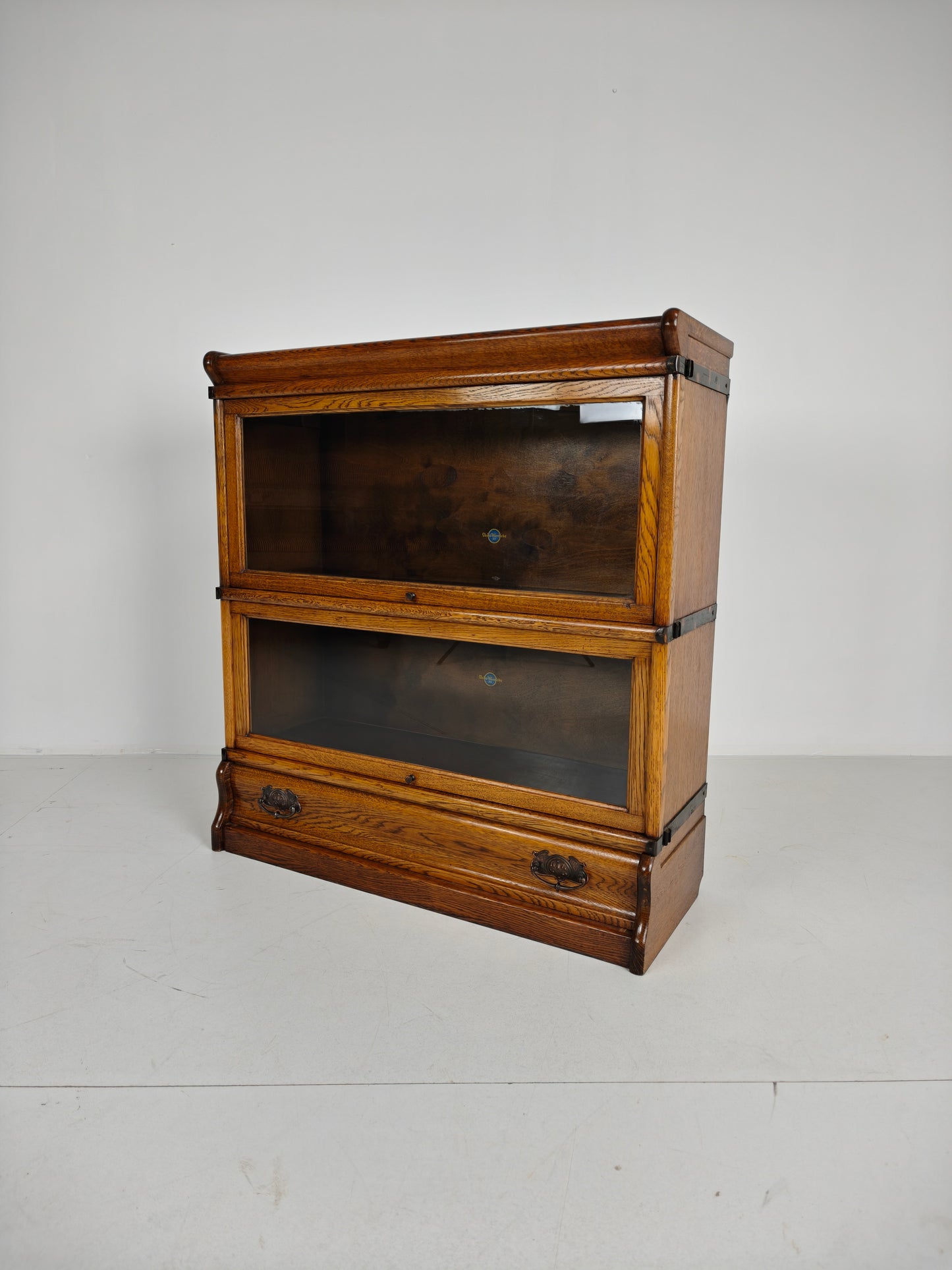 Beautiful and original Globe-Wernicke mahogany bookcase, dating from circa 1910–1920, made in England. This sectional bookcase features the original "Globe-Wernicke" stamp, a refined leather-inlaid top, and a lower drawer with elegant brass handles. The piece is in excellent and well-preserved condition, showcasing its classic craftsmanship and timeless appeal. Has signs of wear consistant with age and use.