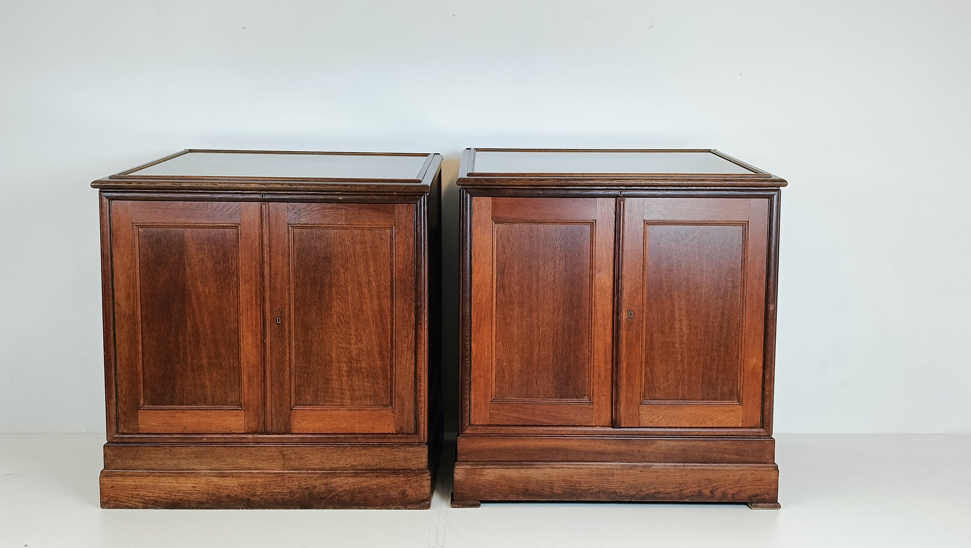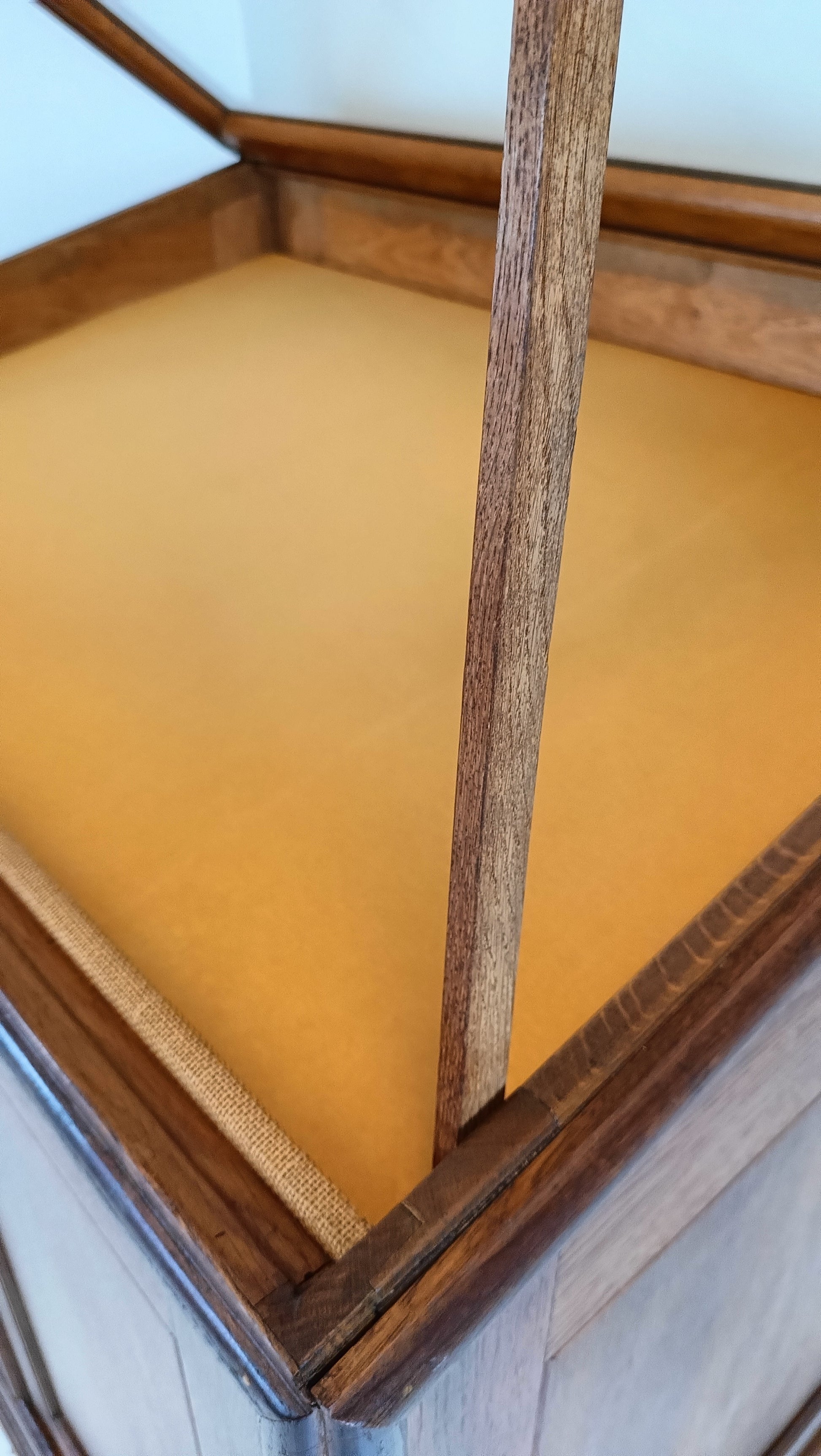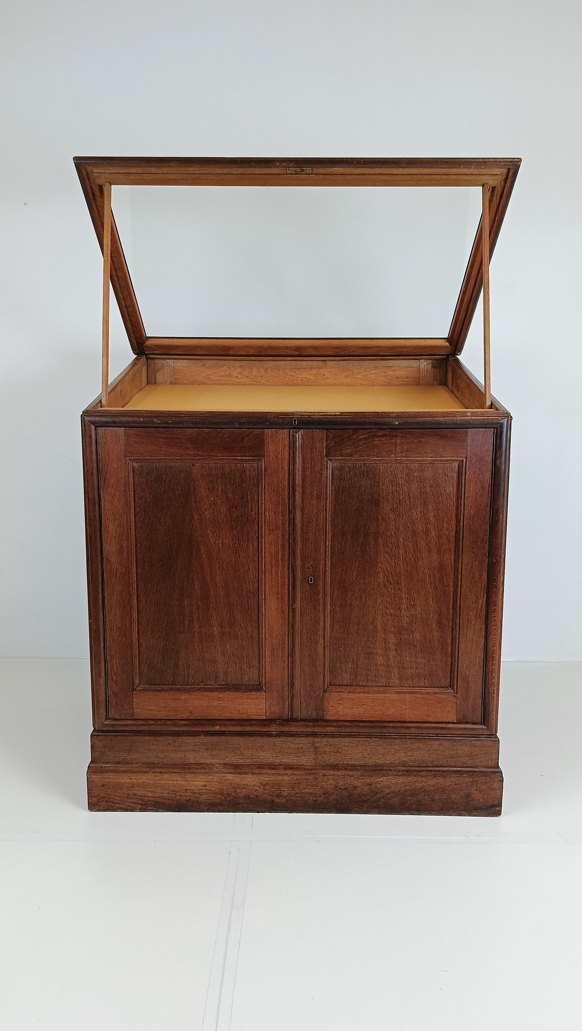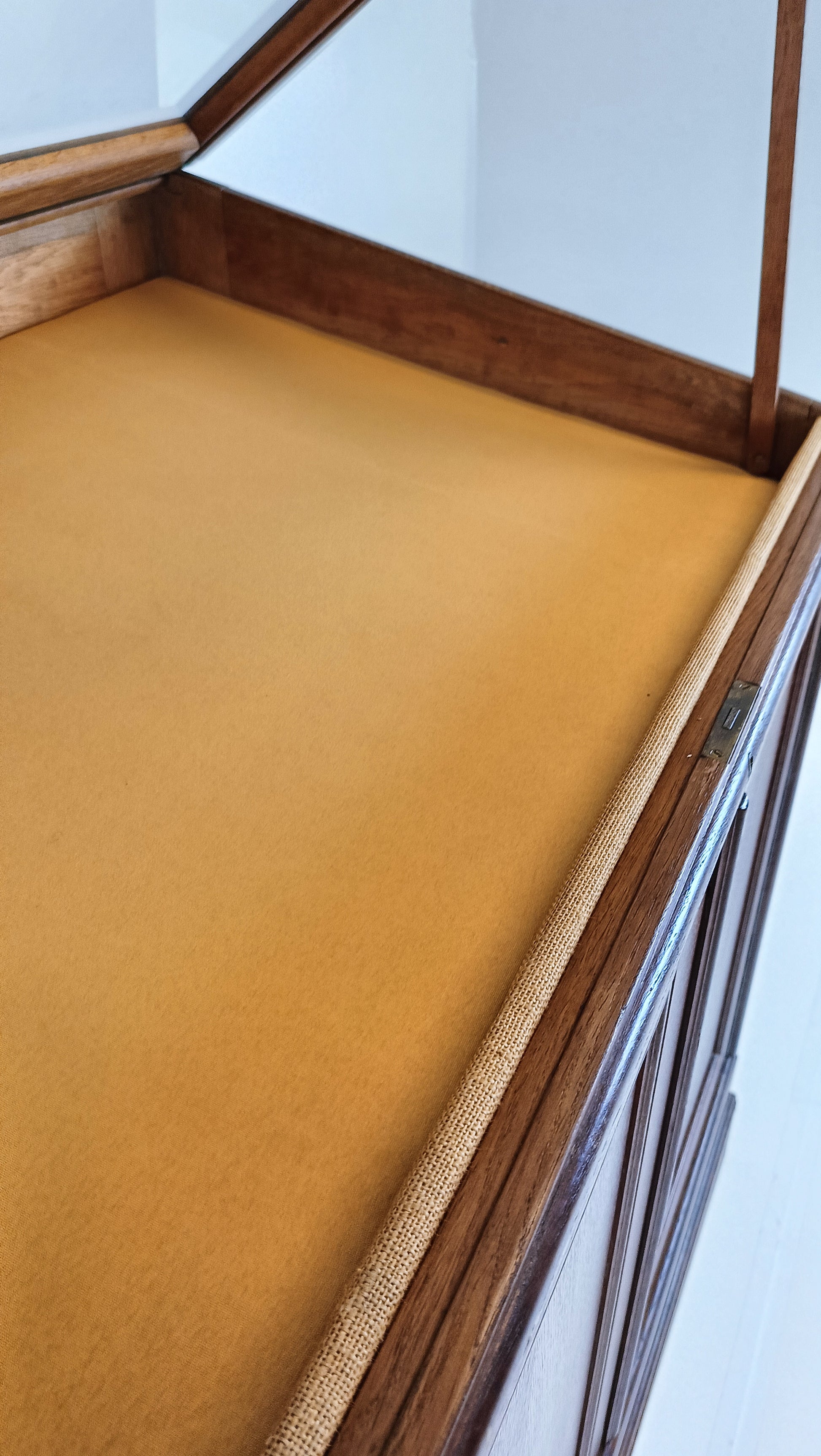 These two antique museum display cabinets are a striking blend of beauty and functionality. Featuring display areas at the top for showcasing artifacts, and ample storage space underneath, they offer both aesthetic appeal and practicality. The cabinets boast a beautiful patina, a testament to their age and history, which has been lovingly preserved and enhanced through repolishing with oil. Additionally, they have been tastefully reupholstered, breathing new life into their timeless design. With their exquisite craftsmanship and thoughtful restoration, these cabinets are sure to captivate admirers and serve as stunning focal points in any space.